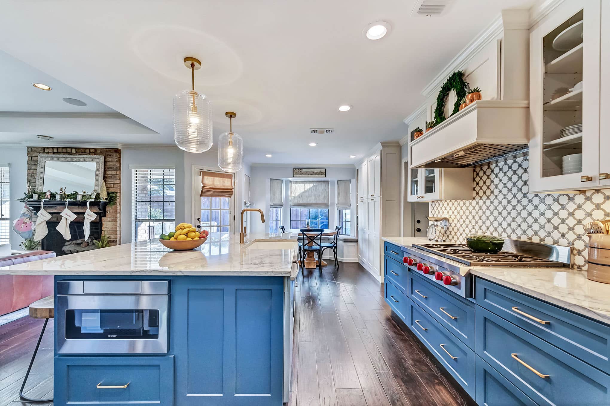 Curious about “How tall are kitchen cabinets?” For upper cabinets, standard kitchen cabinet height usually lands at 30”, 36”, or 42”—great options depending on your ceiling and storage needs. Base cabinets clock in at 34.5” tall, which, with a countertop, hits that ideal 36” working height. From an interior design angle, these heights strike a perfect balance—keeping your kitchen practical and visually appealing. We’ve tailored countless Frisco kitchens to these standards, and they always deliver!