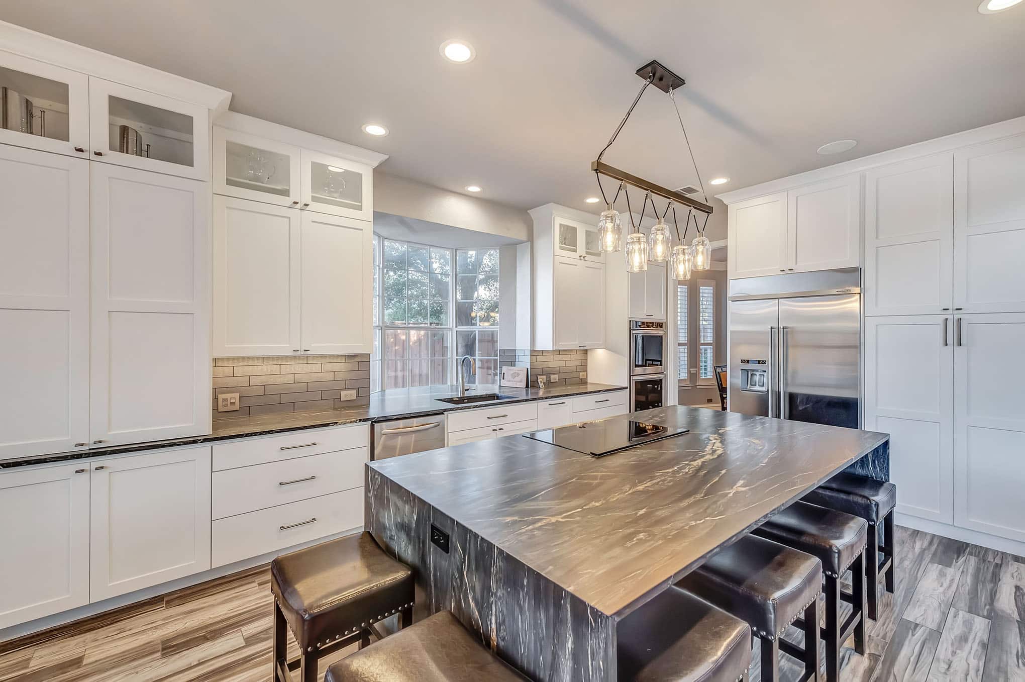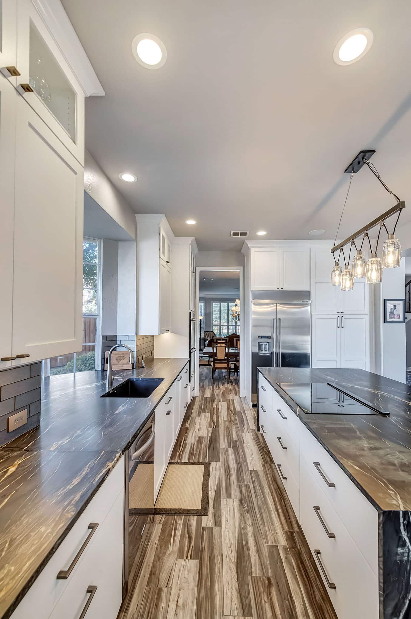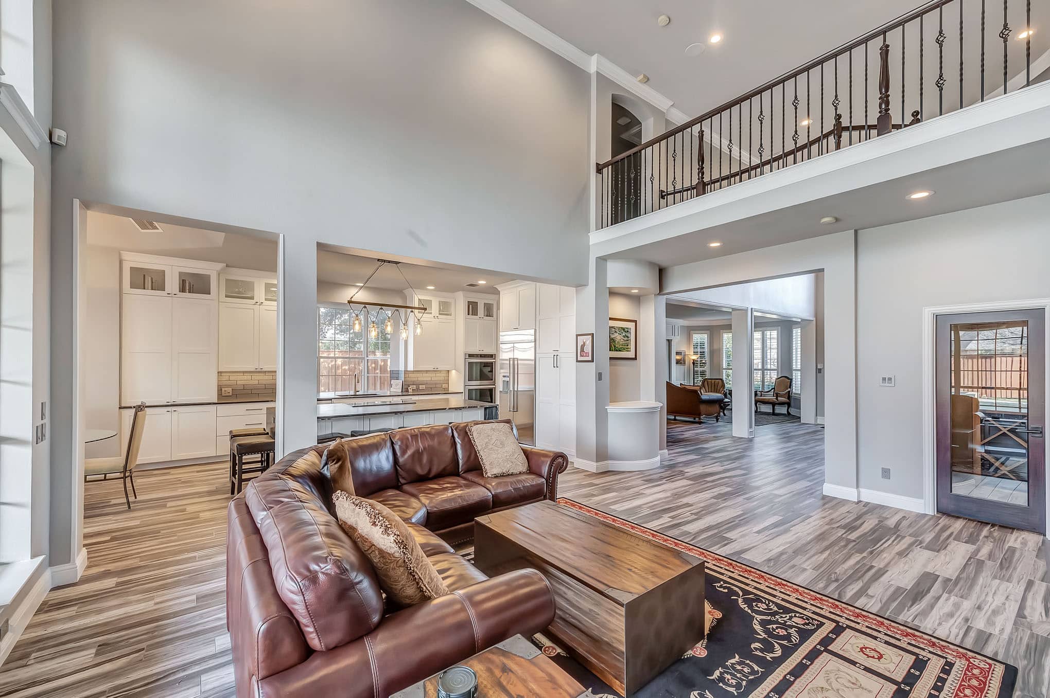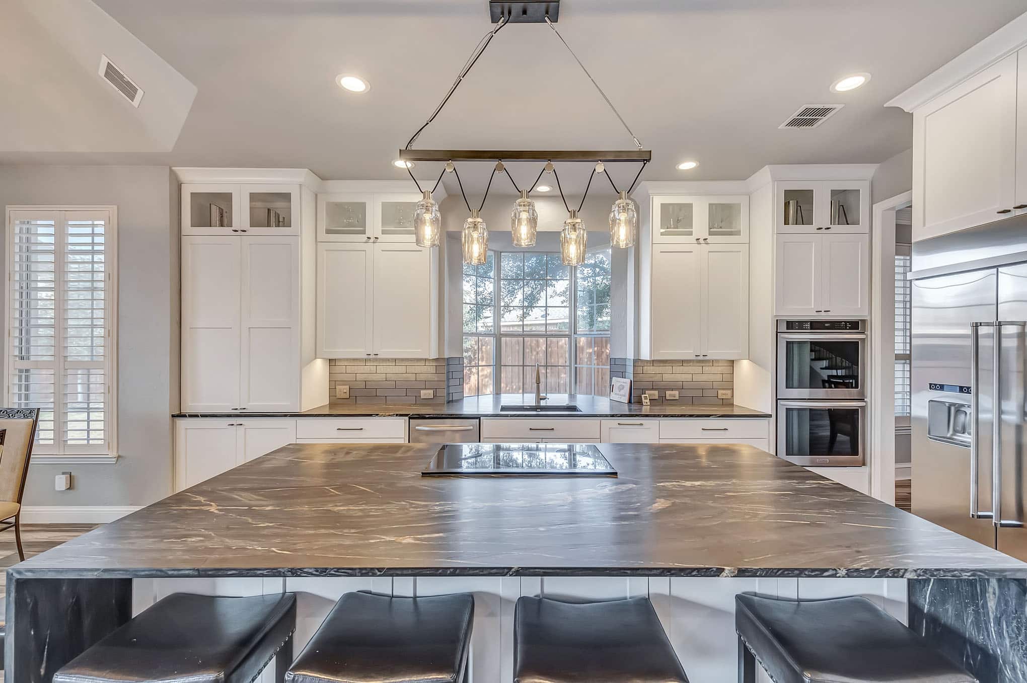 This comprehensive renovation in Allen exemplifies refined elegance and thoughtful design. The kitchen shines with crisp white cabinetry, premium granite countertops with dramatic veining, and professional-grade stainless appliances. Strategic ambient lighting, including sleek glass pendants and hidden LED strips, creates a warm glow throughout. The open-concept layout flows seamlessly into a living area featuring a contemporary linear fireplace and soaring ceilings. The spa-inspired master bathroom offers dual vanities with custom storage, while the expansive walk-in shower with dual rain showerheads and marble-look porcelain tile creates a resort-like retreat. The masterfully organized closet system demonstrates our commitment to both beauty and functionality, with dedicated shoe storage and a central island providing additional organization. Consistent design elements including warm wood flooring, a sophisticated neutral color palette, and high-end fixtures create a cohesive aesthetic throughout this 2018 transformation.