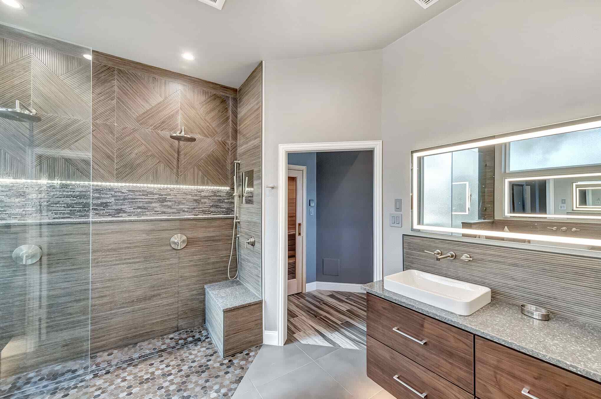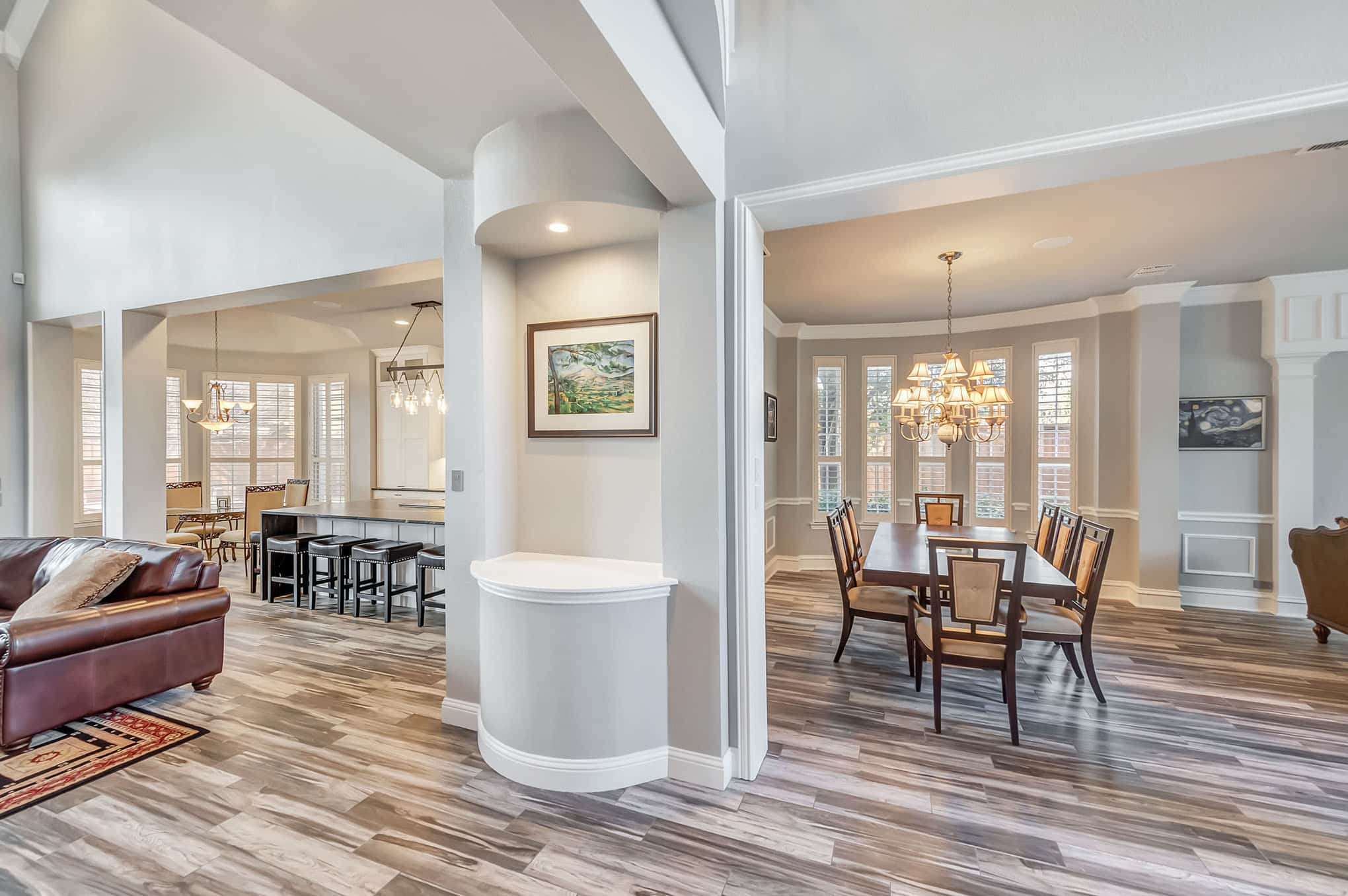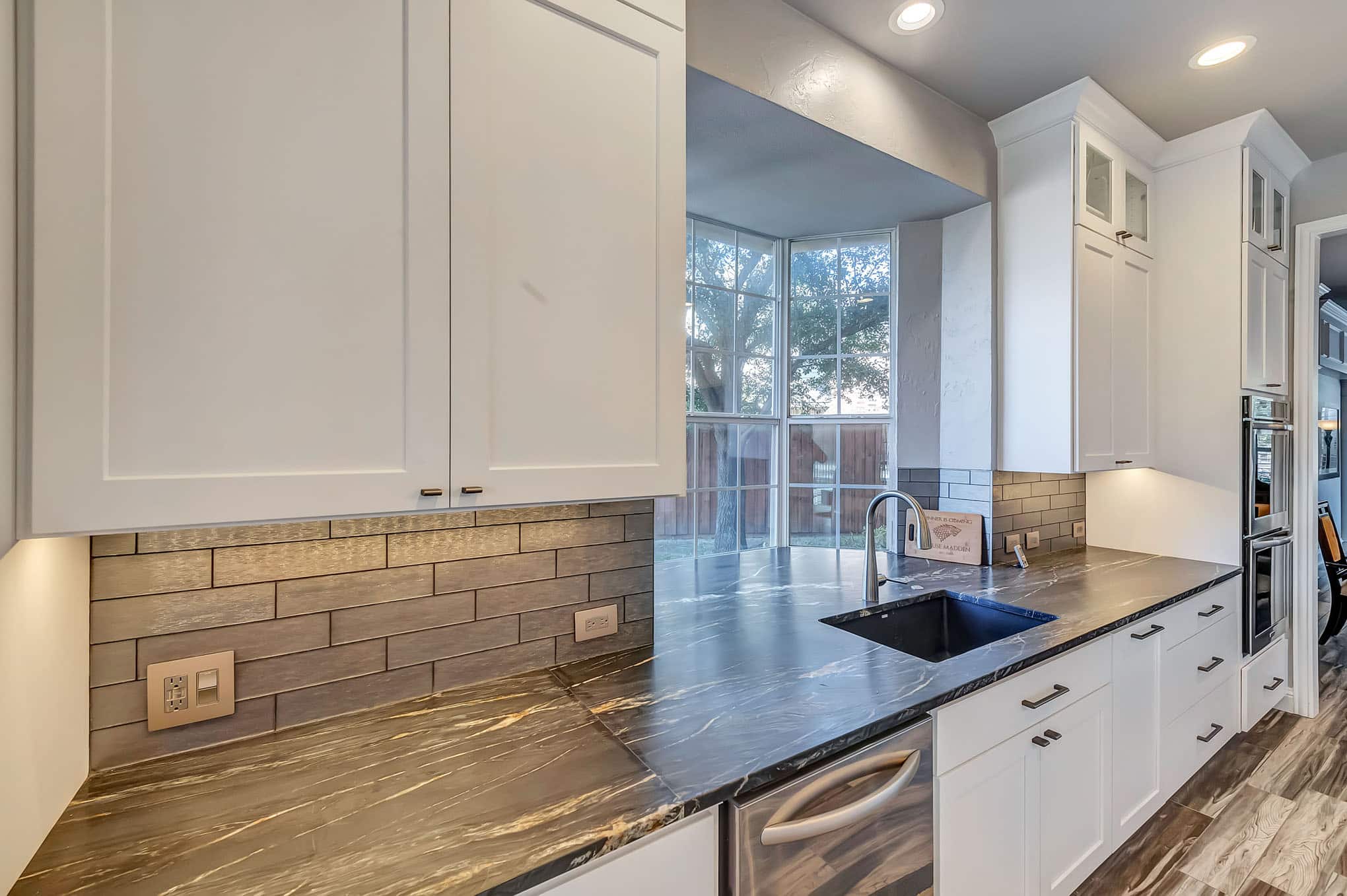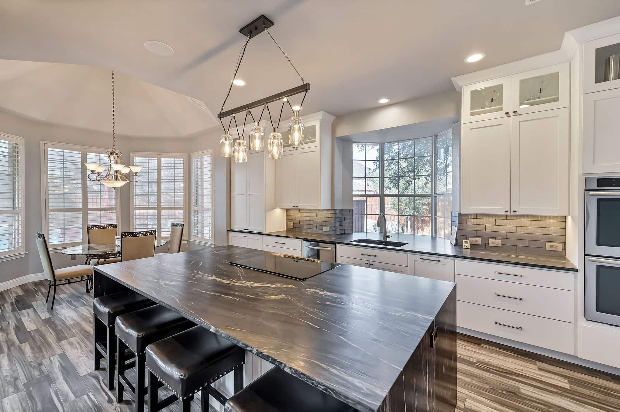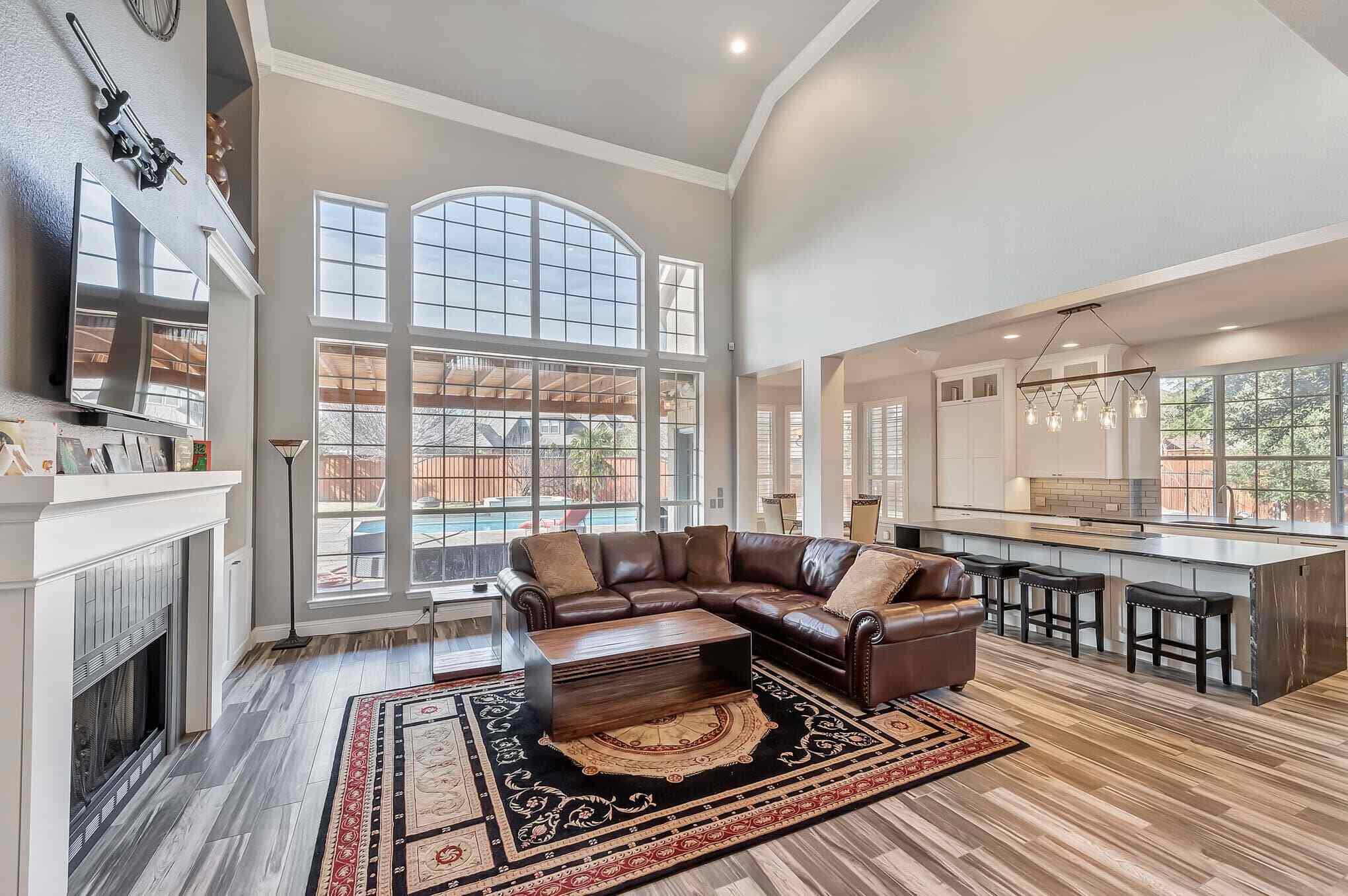 This comprehensive renovation in Allen exemplifies refined elegance and thoughtful design. The kitchen shines with crisp white cabinetry, premium granite countertops with dramatic veining, and professional-grade stainless appliances. Strategic ambient lighting, including sleek glass pendants and hidden LED strips, creates a warm glow throughout. The open-concept layout flows seamlessly into a living area featuring a contemporary linear fireplace and soaring ceilings. The spa-inspired master bathroom offers dual vanities with custom storage, while the expansive walk-in shower with dual rain showerheads and marble-look porcelain tile creates a resort-like retreat. The masterfully organized closet system demonstrates our commitment to both beauty and functionality, with dedicated shoe storage and a central island providing additional organization. Consistent design elements including warm wood flooring, a sophisticated neutral color palette, and high-end fixtures create a cohesive aesthetic throughout this 2018 transformation.
