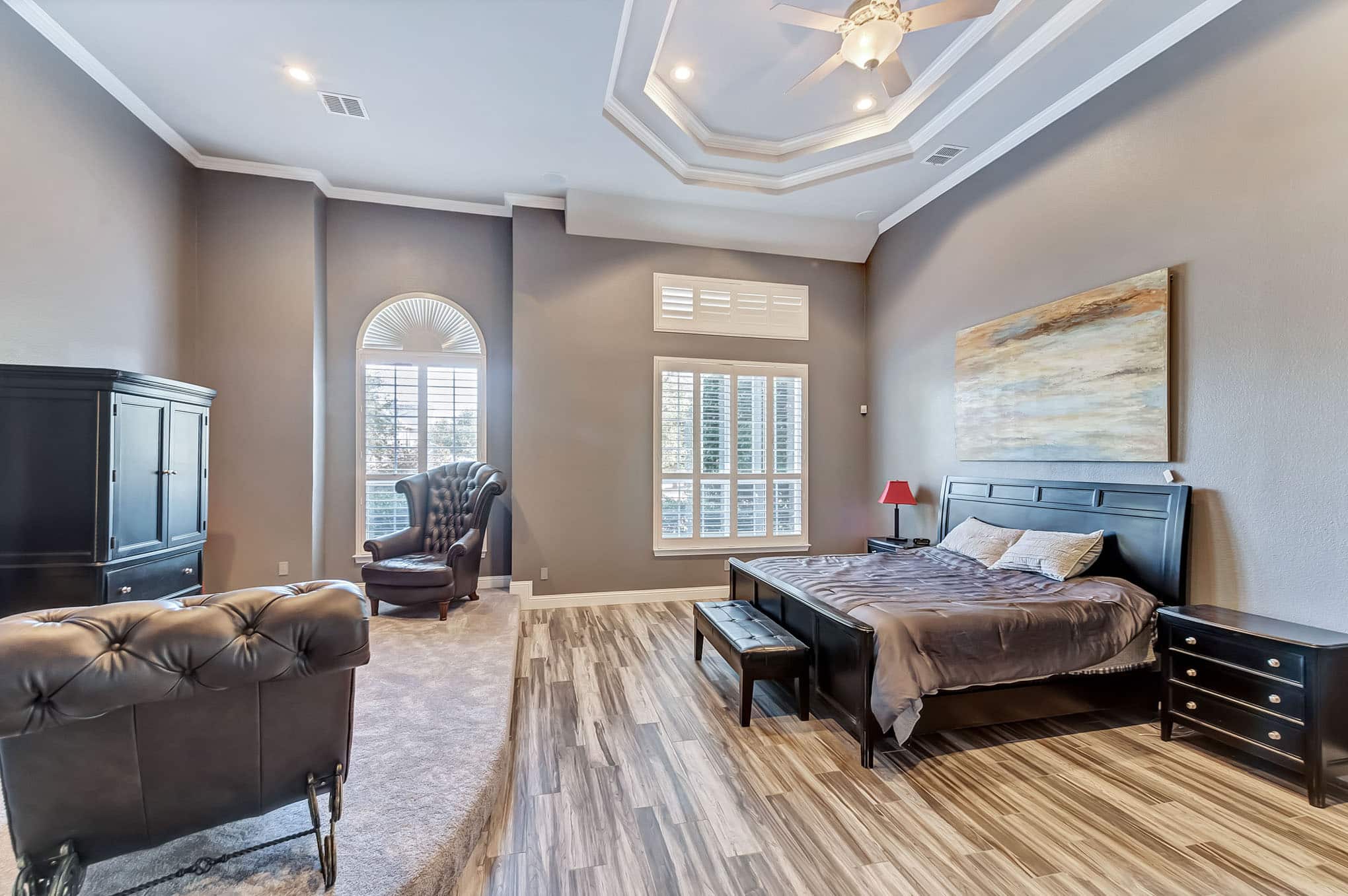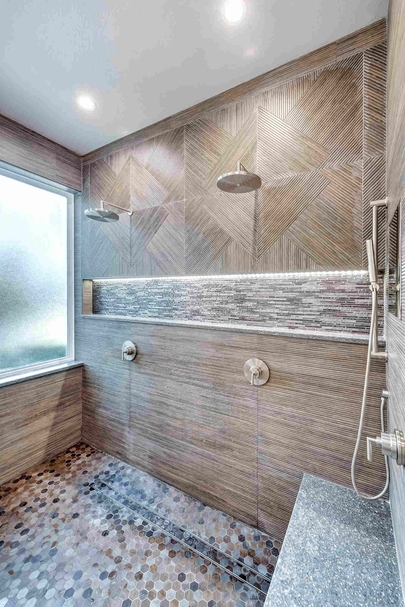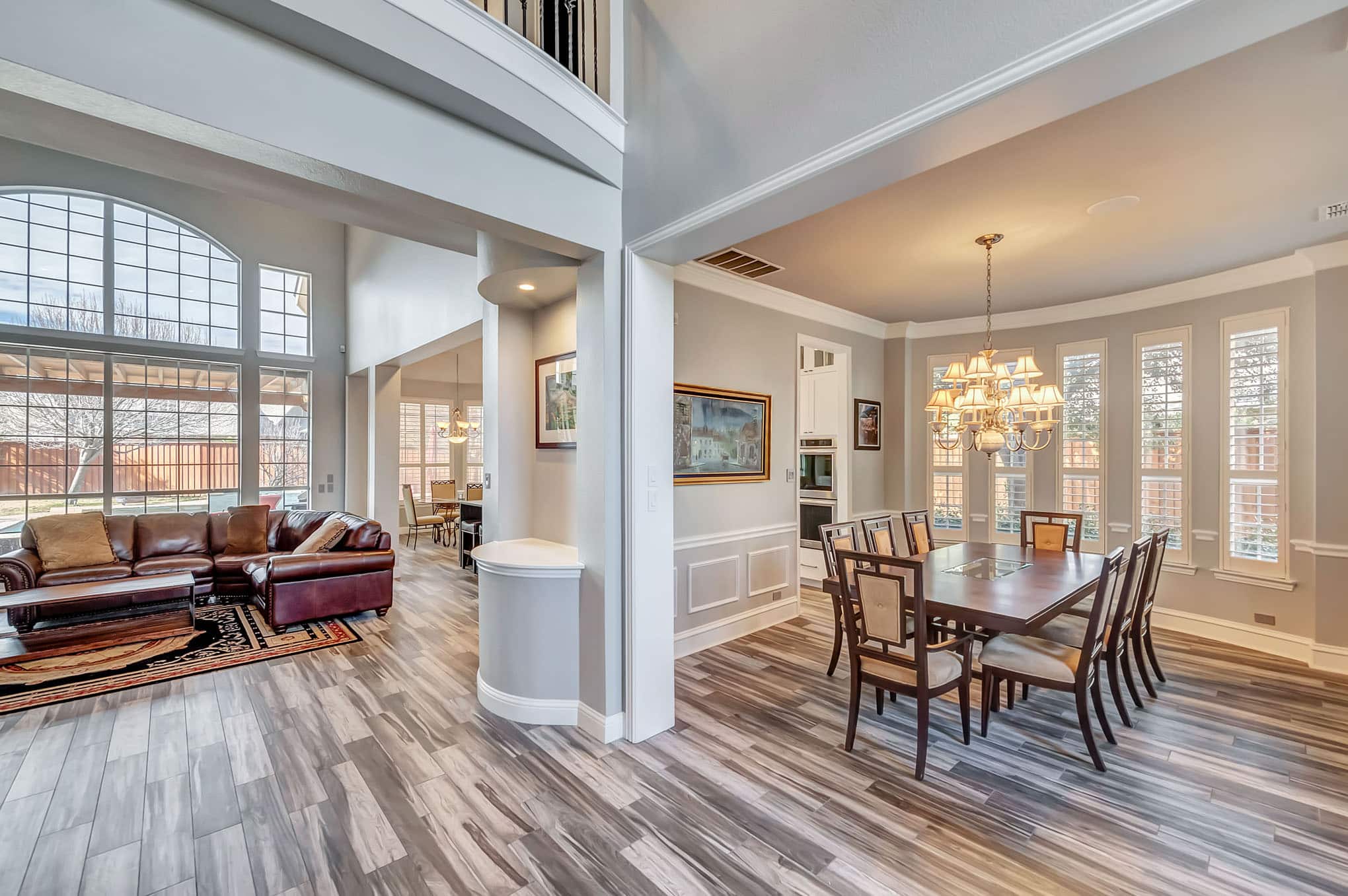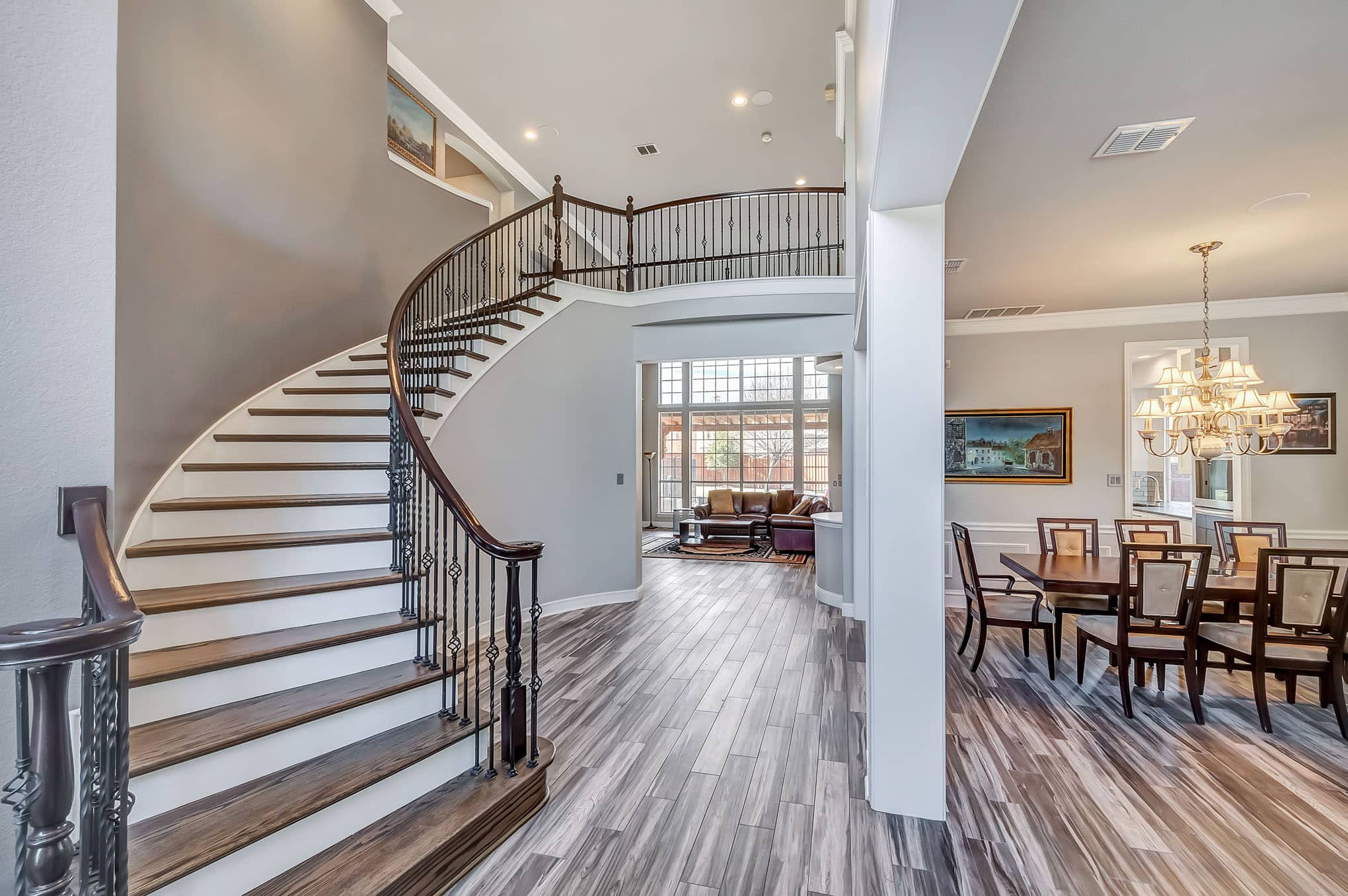 This comprehensive renovation in Allen exemplifies refined elegance and thoughtful design. The kitchen shines with crisp white cabinetry, premium granite countertops with dramatic veining, and professional-grade stainless appliances. Strategic ambient lighting, including sleek glass pendants and hidden LED strips, creates a warm glow throughout. The open-concept layout flows seamlessly into a living area featuring a contemporary linear fireplace and soaring ceilings. The spa-inspired master bathroom offers dual vanities with custom storage, while the expansive walk-in shower with dual rain showerheads and marble-look porcelain tile creates a resort-like retreat. The masterfully organized closet system demonstrates our commitment to both beauty and functionality, with dedicated shoe storage and a central island providing additional organization. Consistent design elements including warm wood flooring, a sophisticated neutral color palette, and high-end fixtures create a cohesive aesthetic throughout this 2018 transformation.