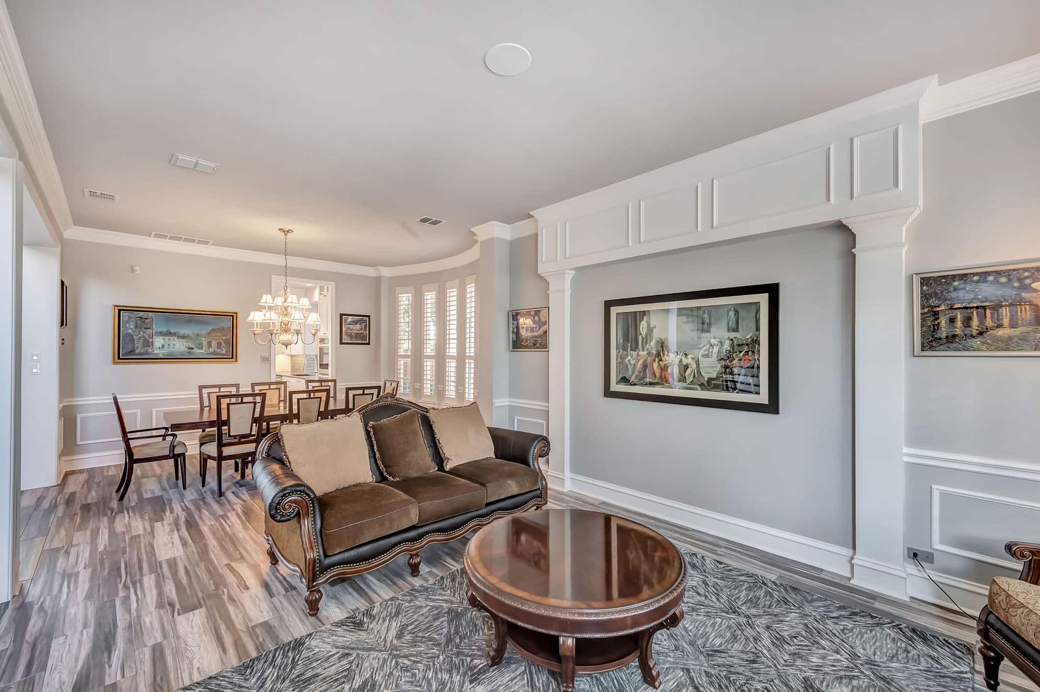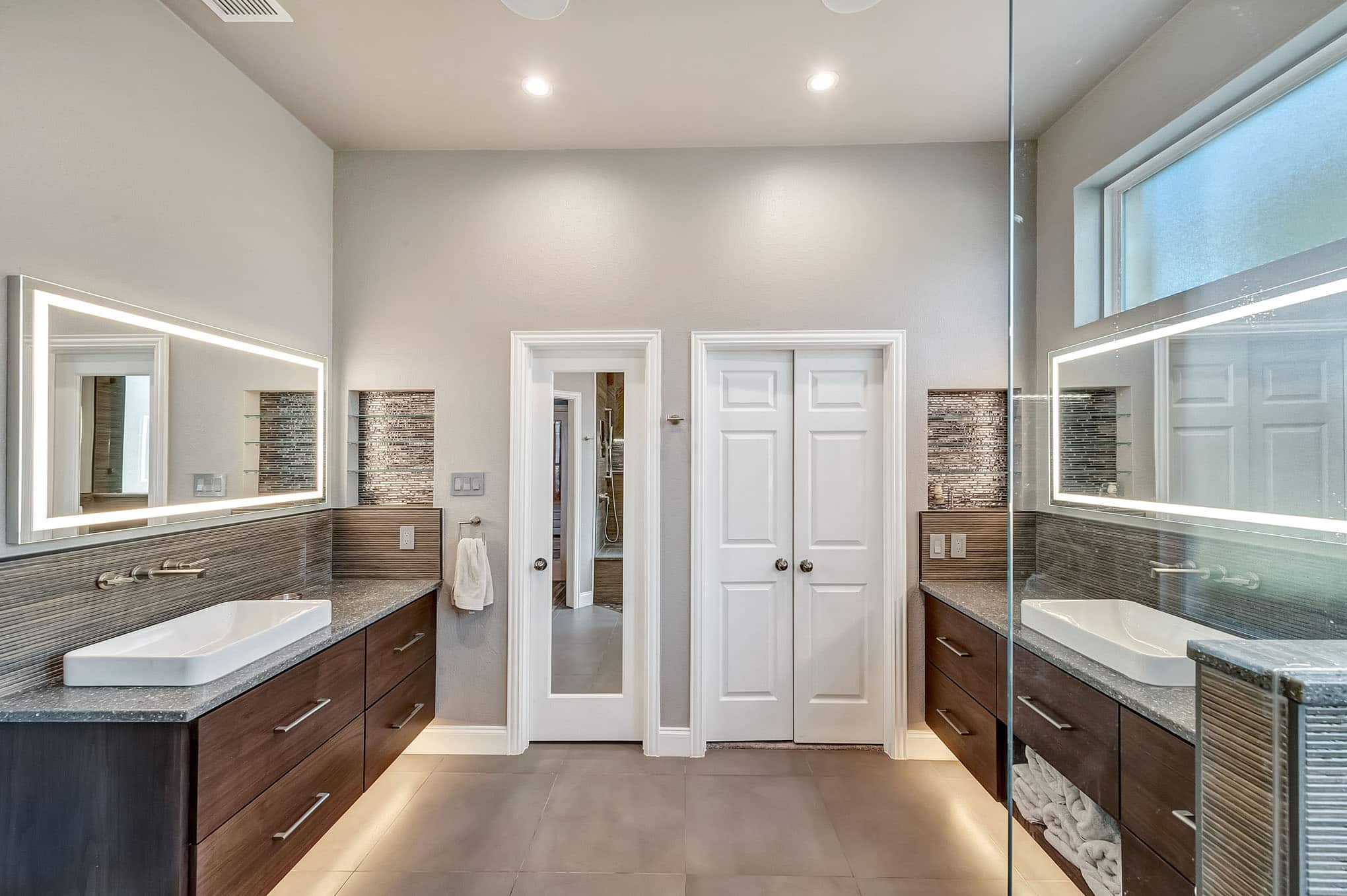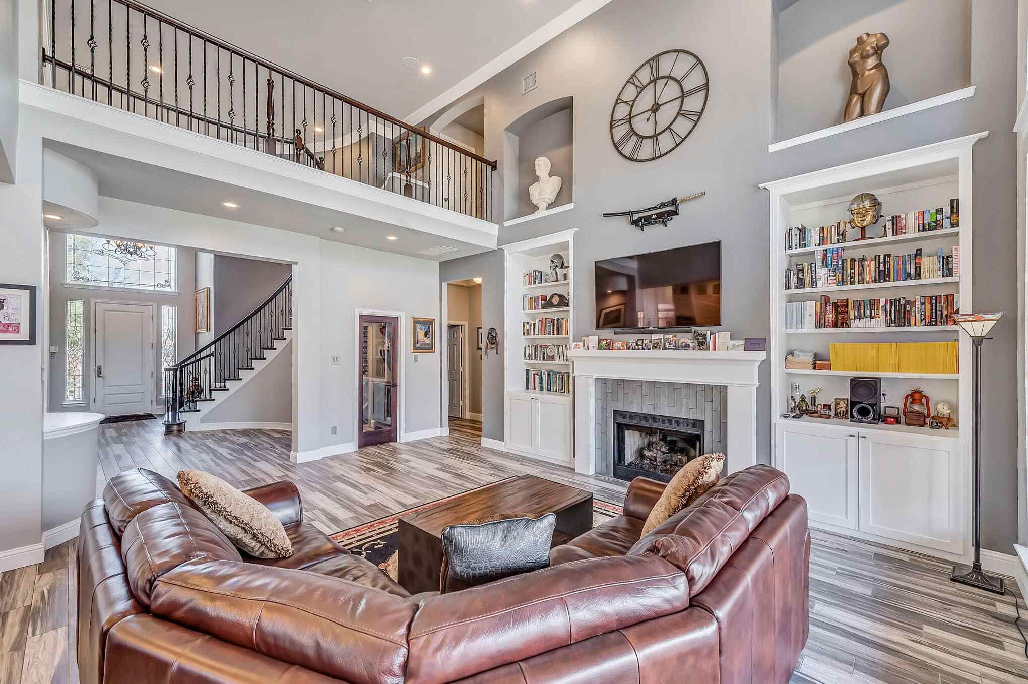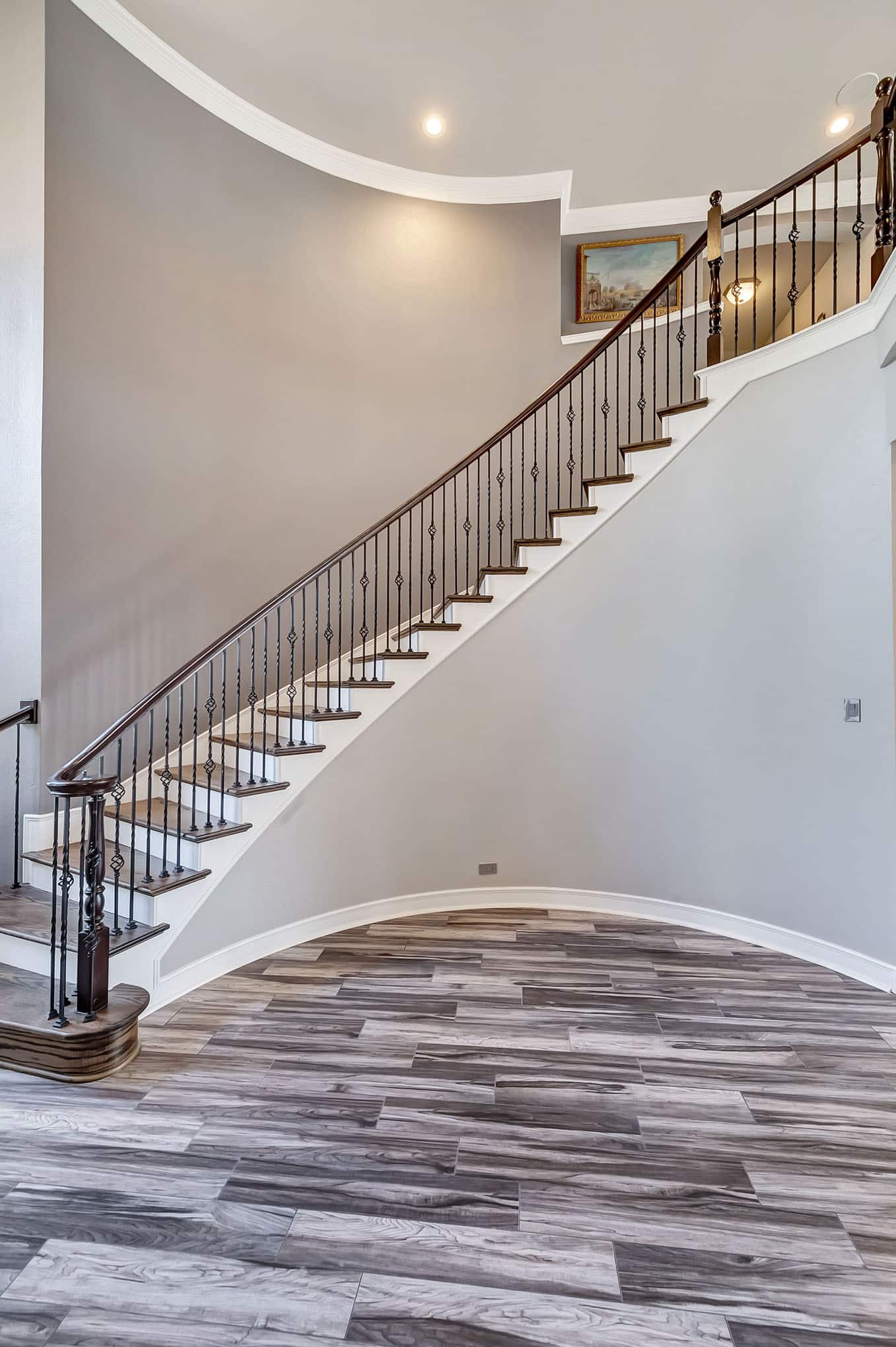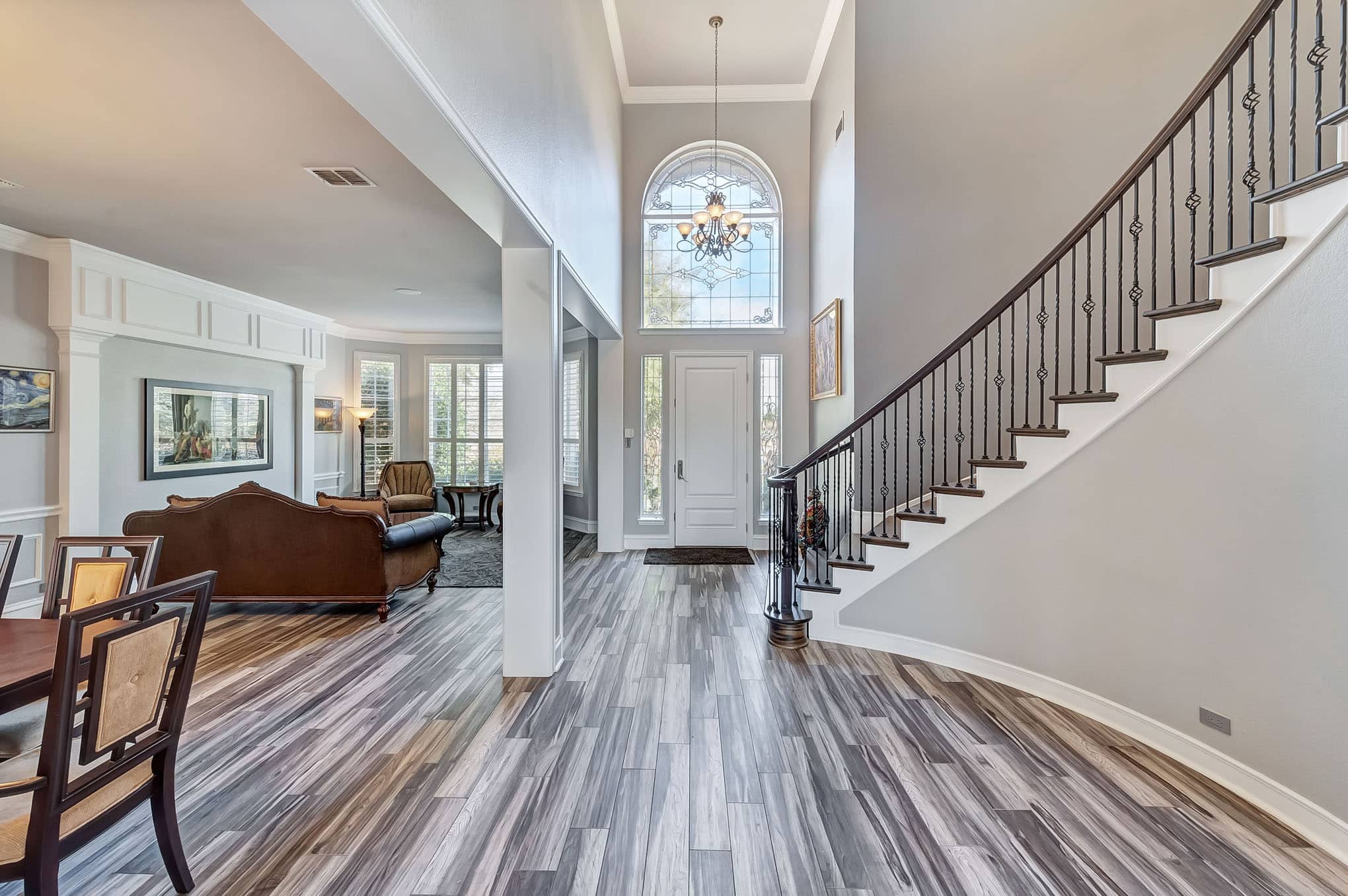 This comprehensive renovation in Allen exemplifies refined elegance and thoughtful design. The kitchen shines with crisp white cabinetry, premium granite countertops with dramatic veining, and professional-grade stainless appliances. Strategic ambient lighting, including sleek glass pendants and hidden LED strips, creates a warm glow throughout. The open-concept layout flows seamlessly into a living area featuring a contemporary linear fireplace and soaring ceilings. The spa-inspired master bathroom offers dual vanities with custom storage, while the expansive walk-in shower with dual rain showerheads and marble-look porcelain tile creates a resort-like retreat. The masterfully organized closet system demonstrates our commitment to both beauty and functionality, with dedicated shoe storage and a central island providing additional organization. Consistent design elements including warm wood flooring, a sophisticated neutral color palette, and high-end fixtures create a cohesive aesthetic throughout this 2018 transformation.