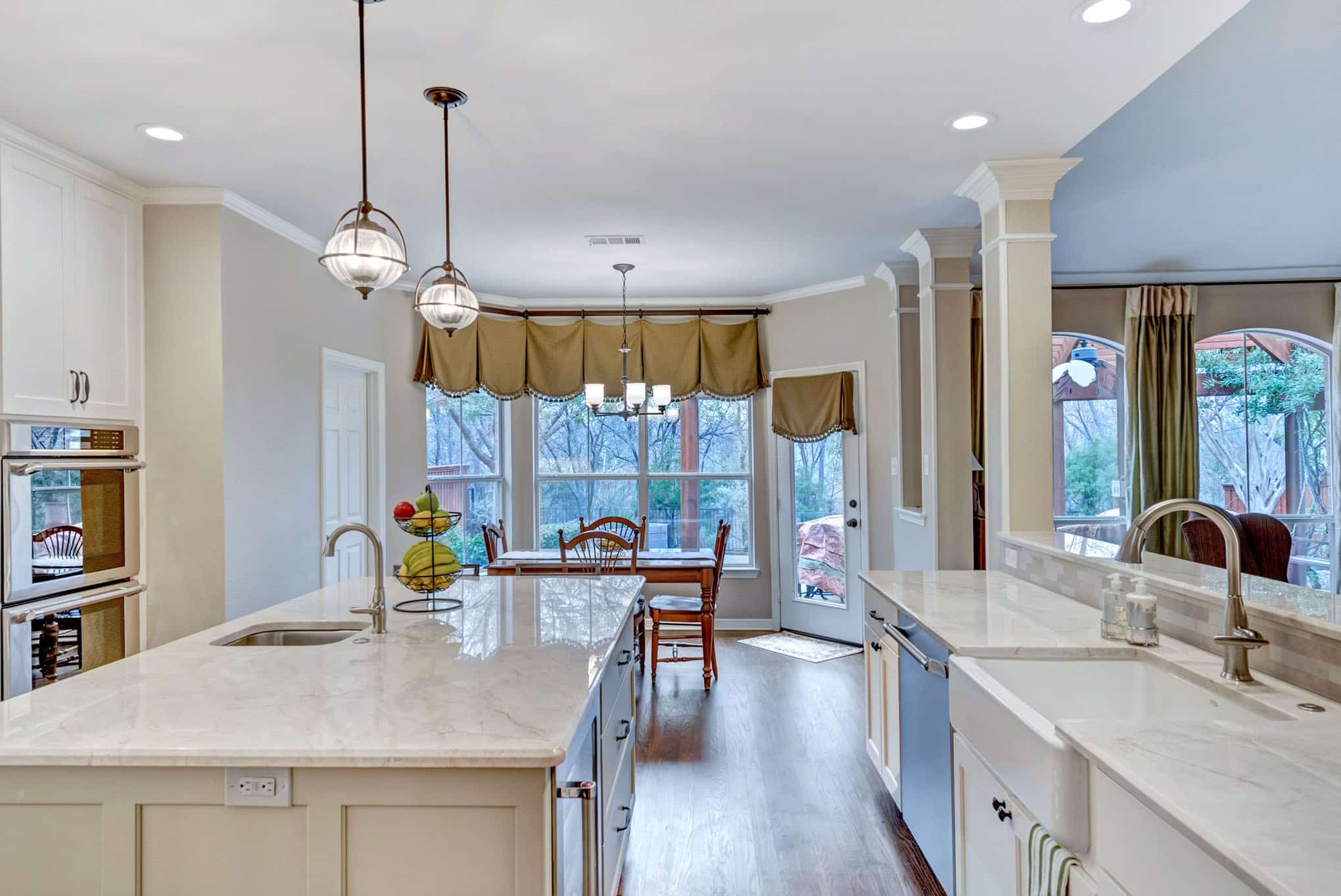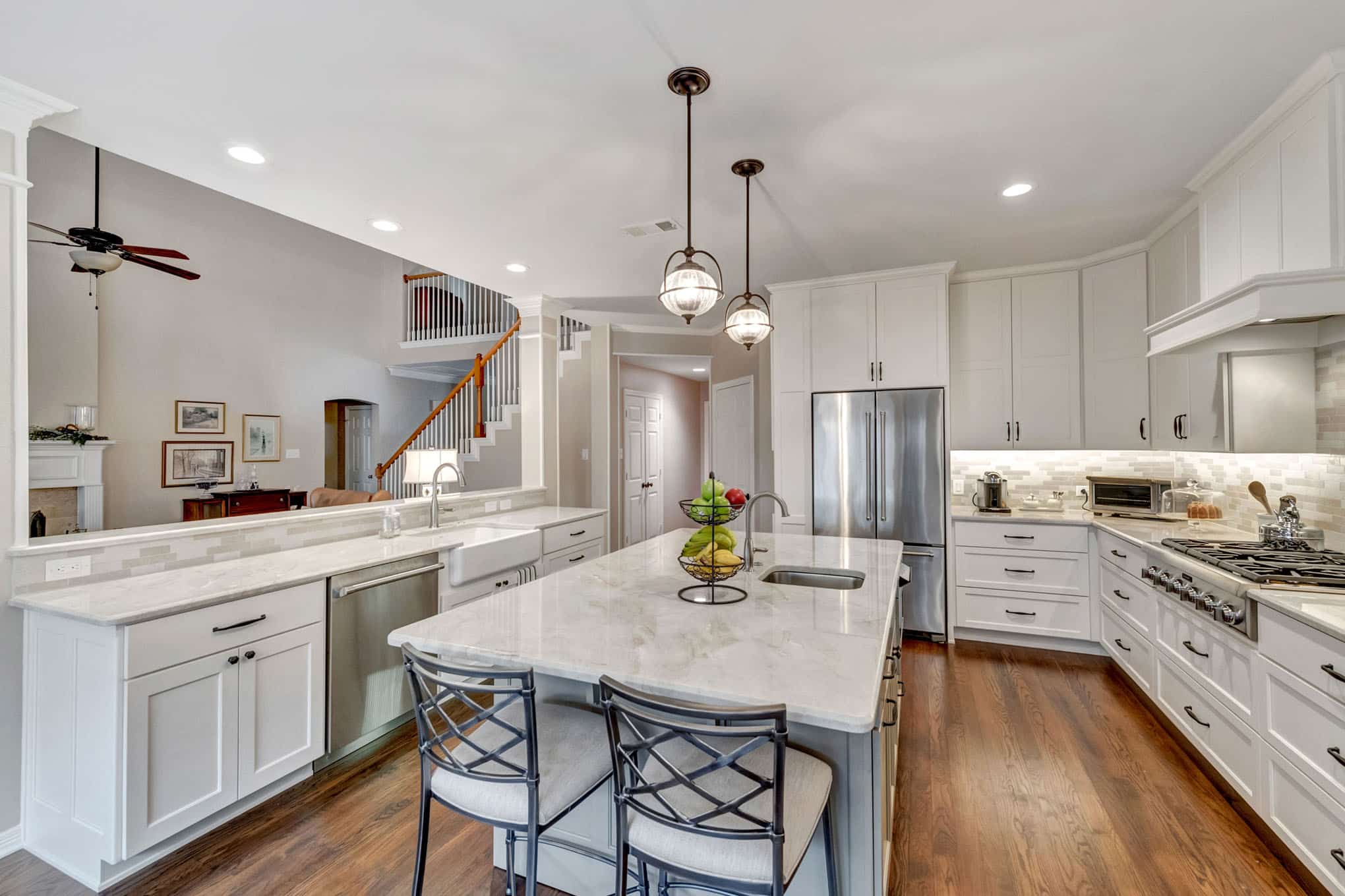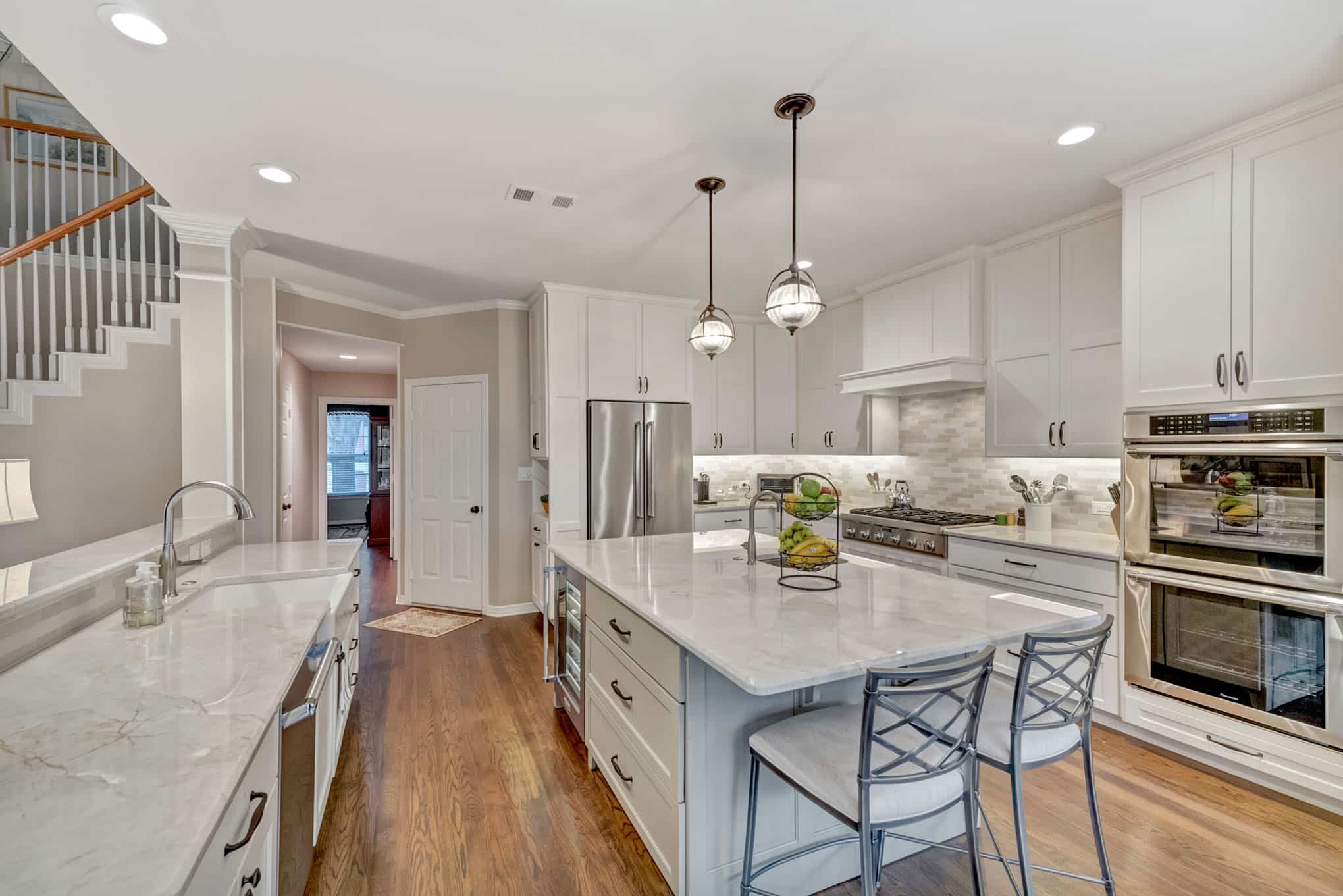 The neutral stone backsplash adds texture without competing with the clean lines of the design, complemented by strategic under-cabinet lighting that enhances functionality and ambiance. Professional-grade stainless steel appliances, including a six-burner gas range and double wall ovens, elevate the cooking experience. The farmhouse sink and designer globe pendant lighting with bronze fixtures add character while maintaining the kitchen’s elegant aesthetic. This bright, open concept layout connects seamlessly to the breakfast area and offers views to the living space, creating the perfect gathering spot for family and entertaining.