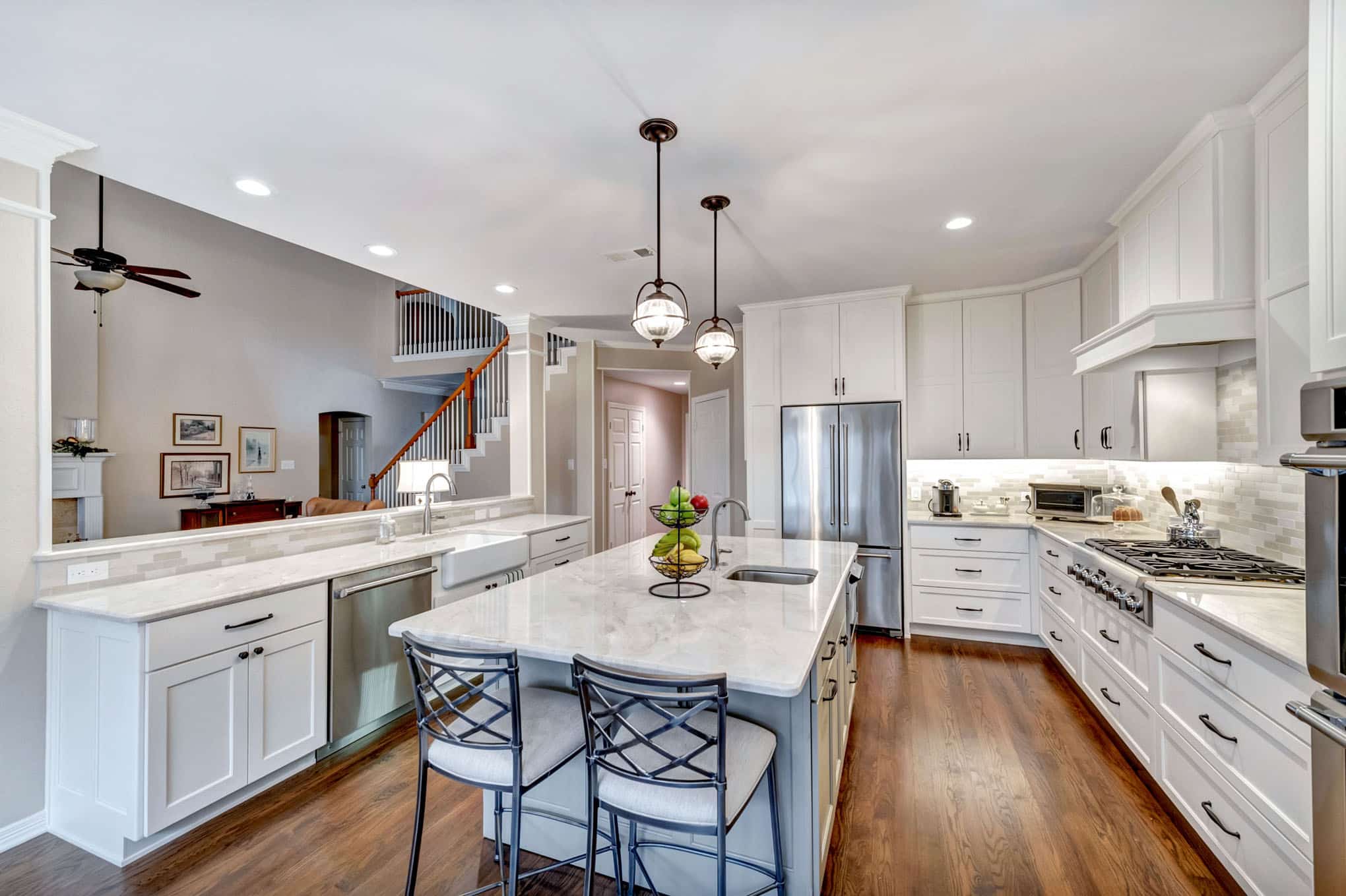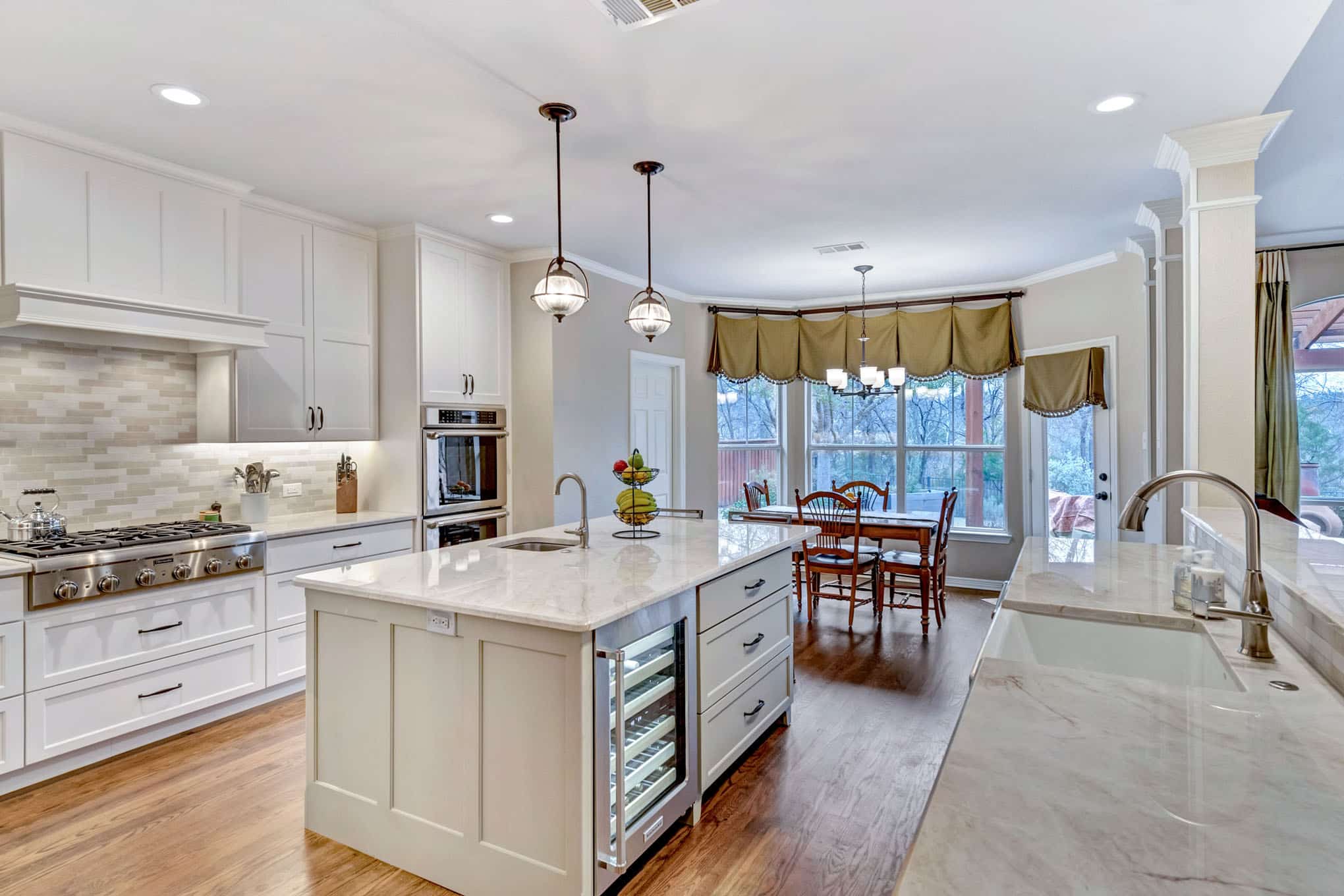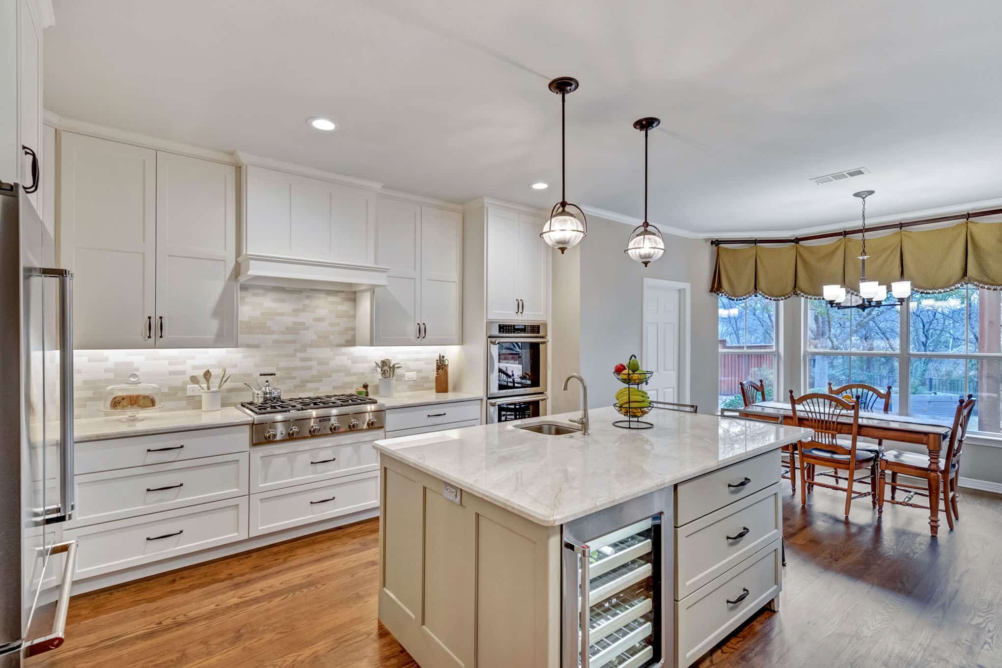 This comprehensive kitchen renovation in Frisco blends sophisticated design with practical functionality. The crisp white shaker cabinetry extends to the ceiling, maximizing storage while creating a sense of height and openness. Luxurious marble-look quartz countertops with subtle veining provide both durability and timeless beauty, while the custom island features built-in wine refrigeration and casual seating.