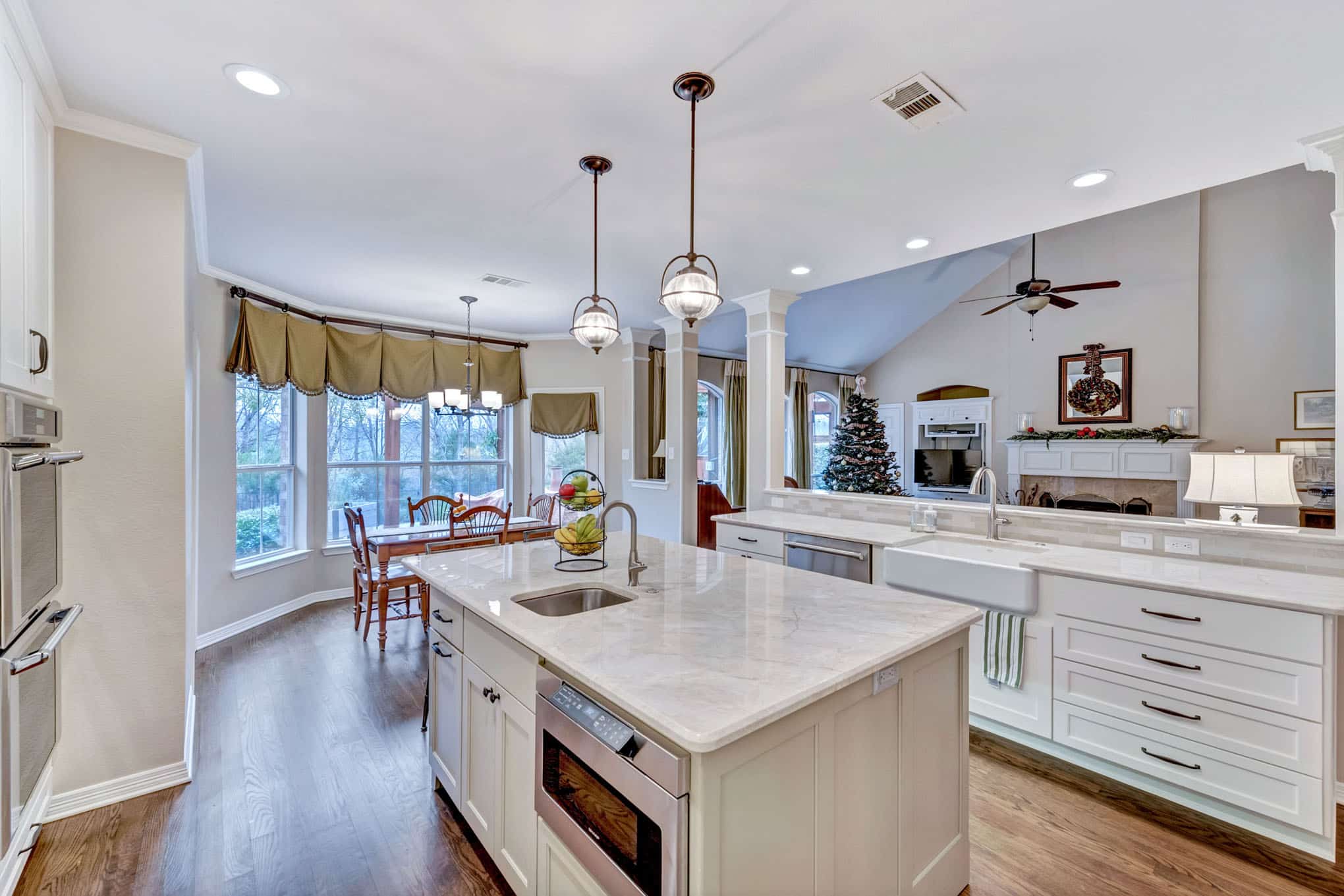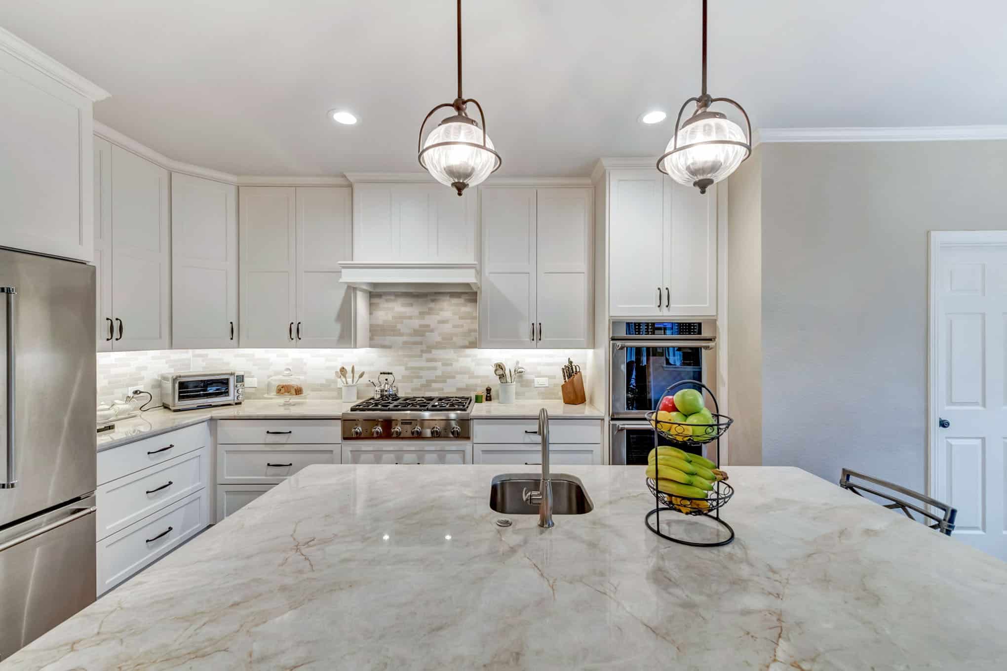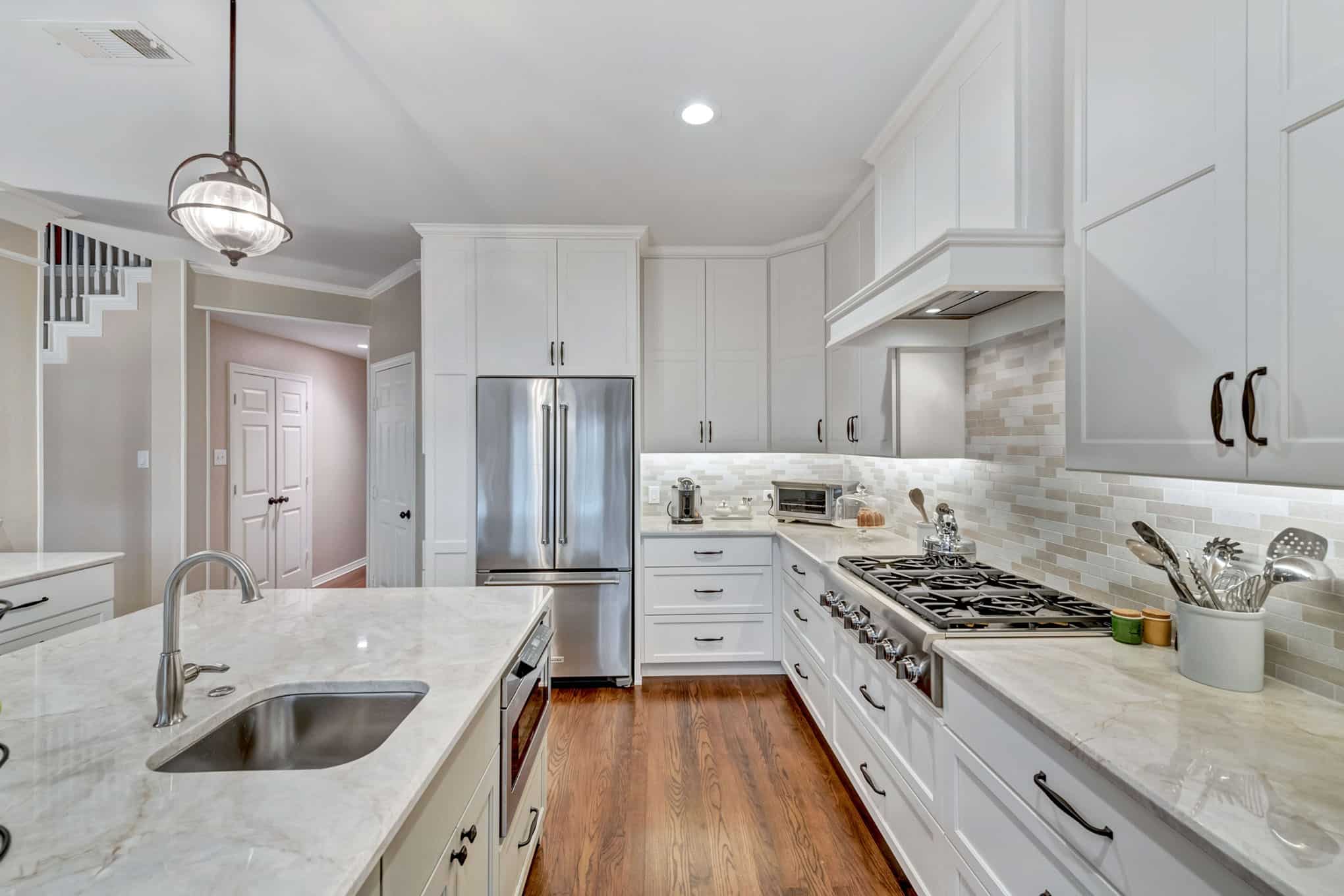 This comprehensive kitchen renovation in Frisco blends sophisticated design with practical functionality. The crisp white shaker cabinetry extends to the ceiling, maximizing storage while creating a sense of height and openness. Luxurious marble-look quartz countertops with subtle veining provide both durability and timeless beauty, while the custom island features built-in wine refrigeration and casual seating.