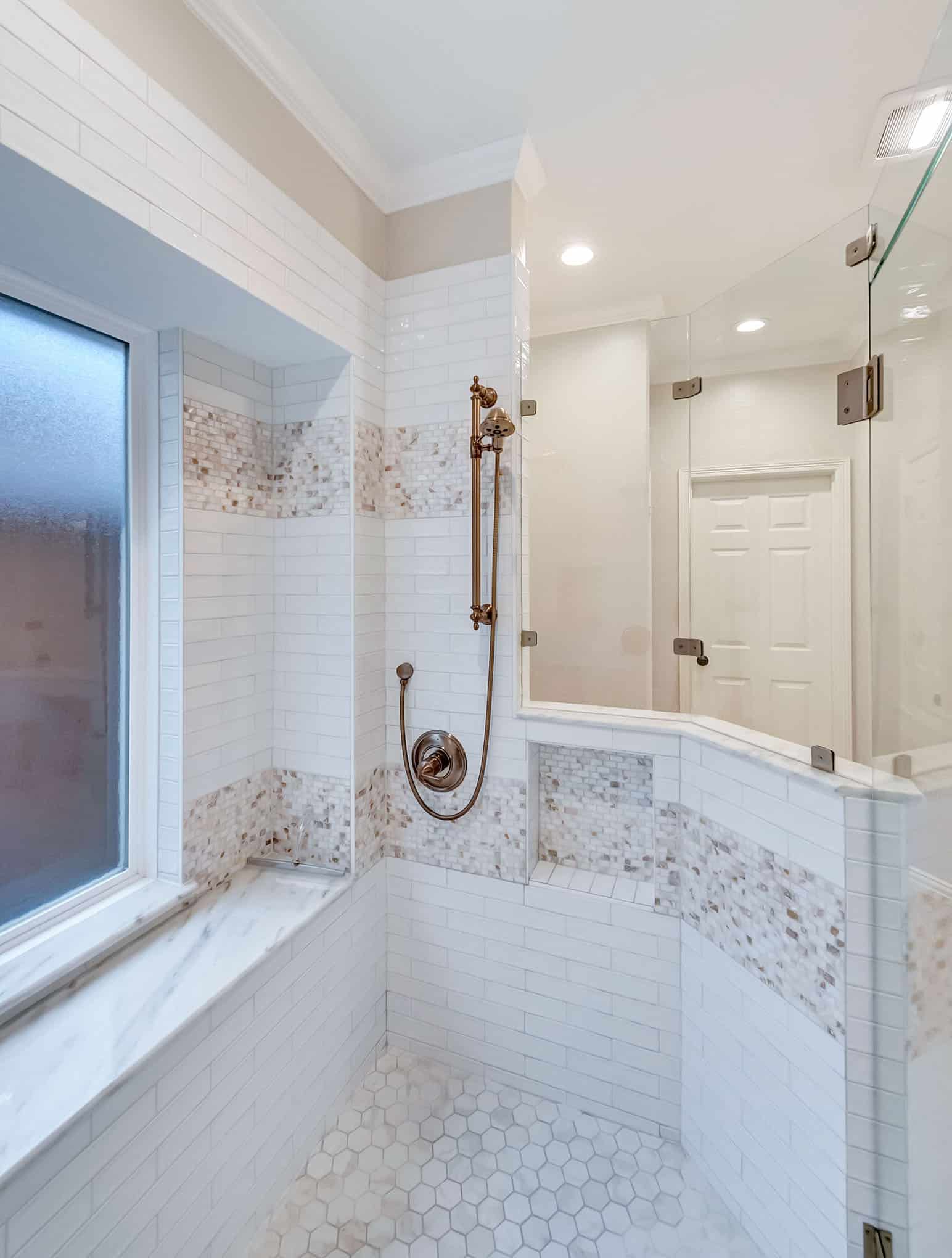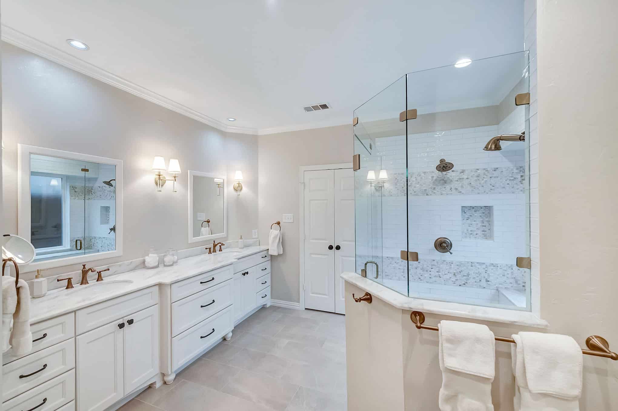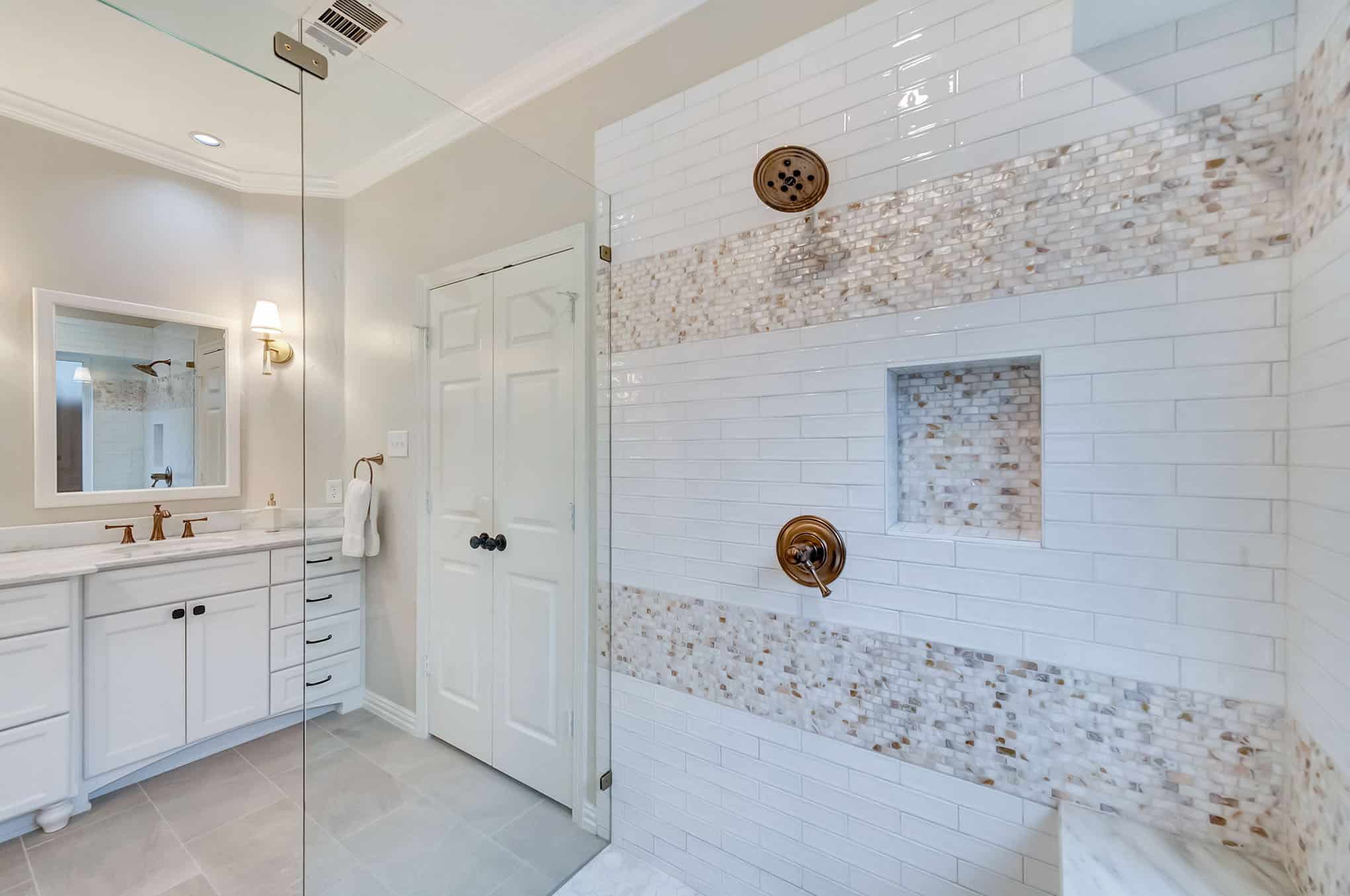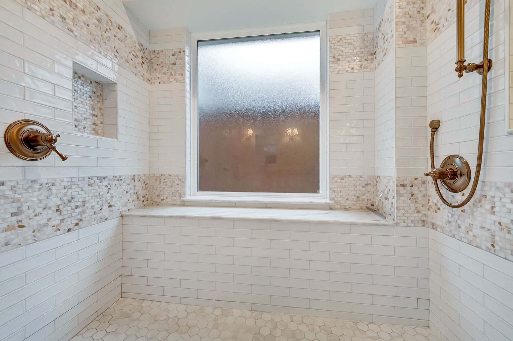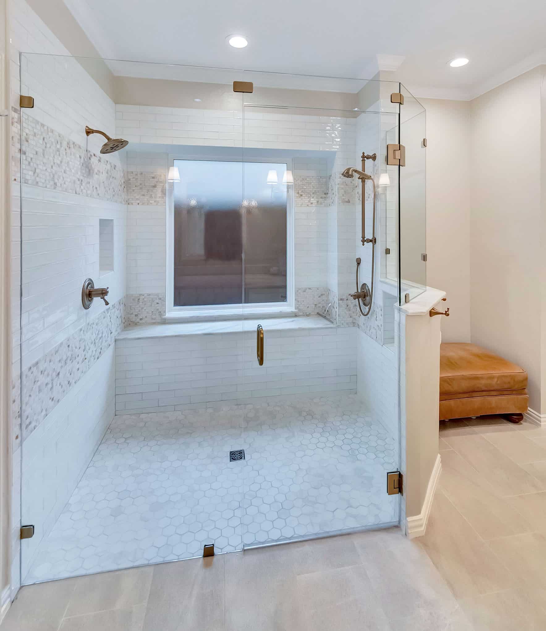 Our complete master bathroom transformation in Frisco creates a luxurious personal sanctuary with thoughtful design elements throughout. The expansive glass-enclosed shower features a stunning combination of white subway tile accented with bands of mother-of-pearl mosaic, complemented by dual bronze rainfall showerheads and a convenient bench seat. A custom window seat with frosted glass maintains natural light while ensuring privacy.
