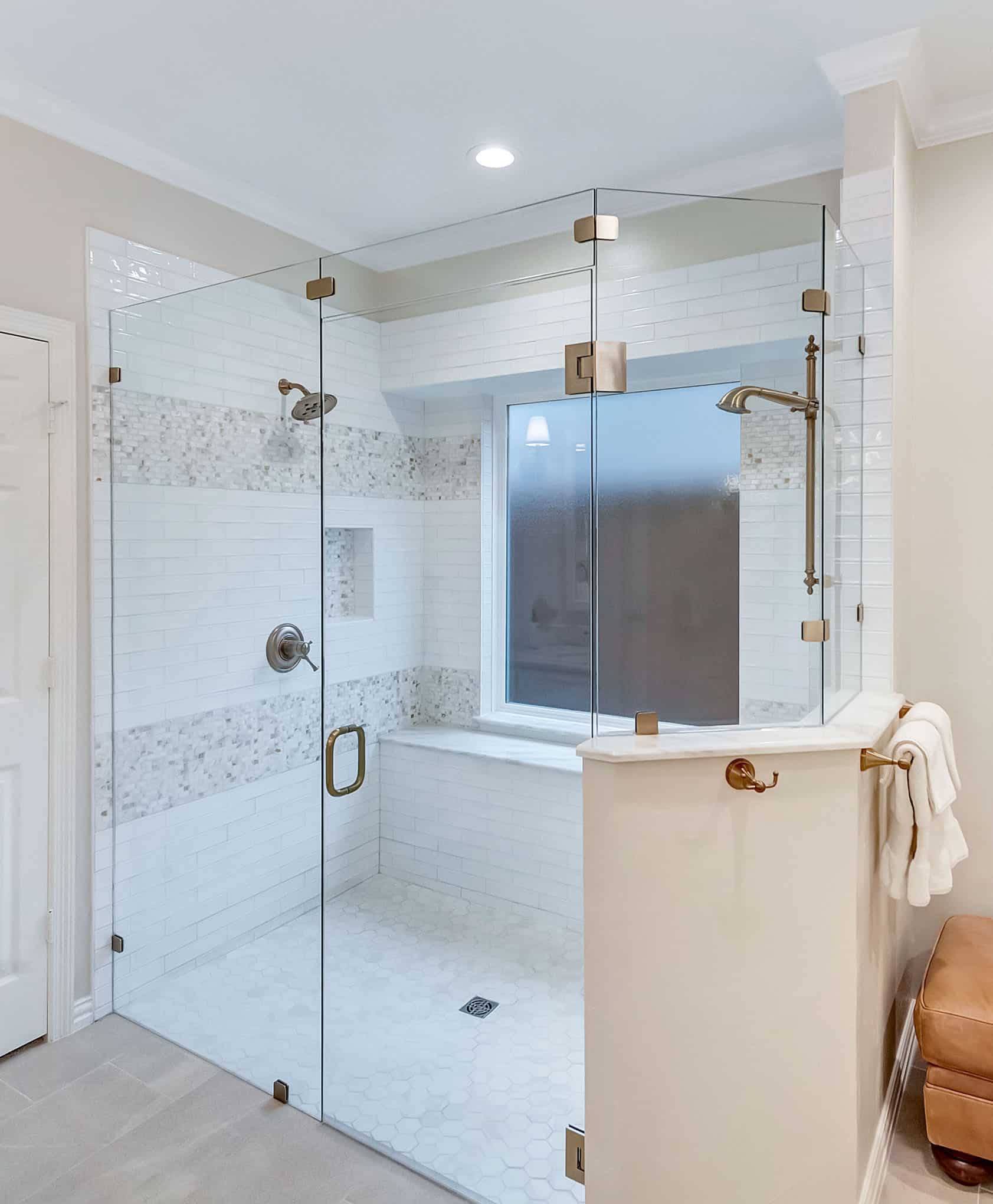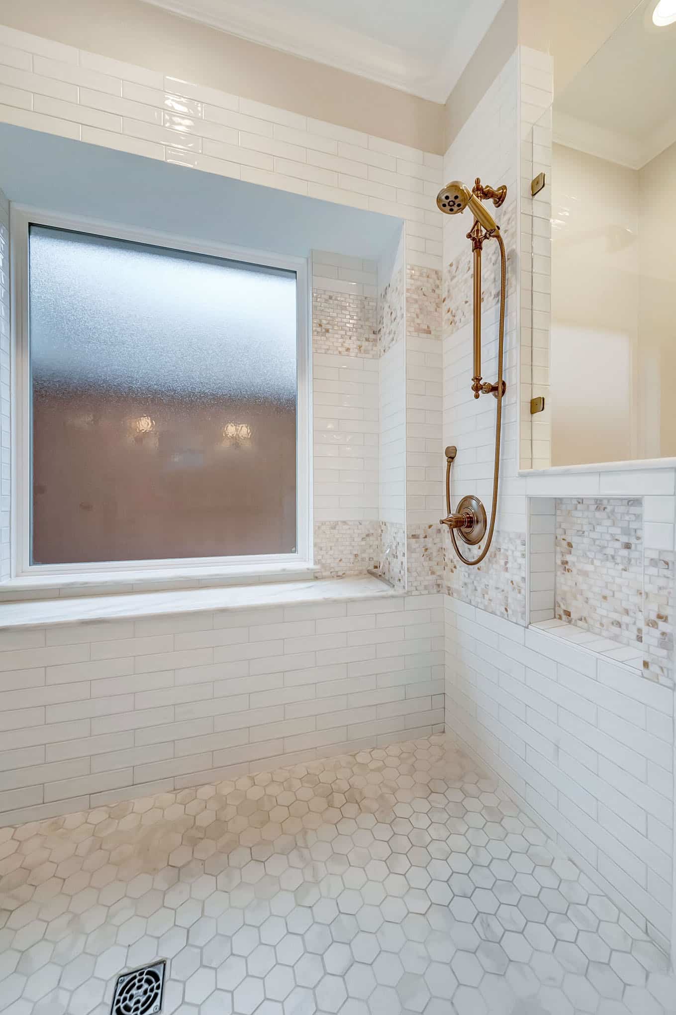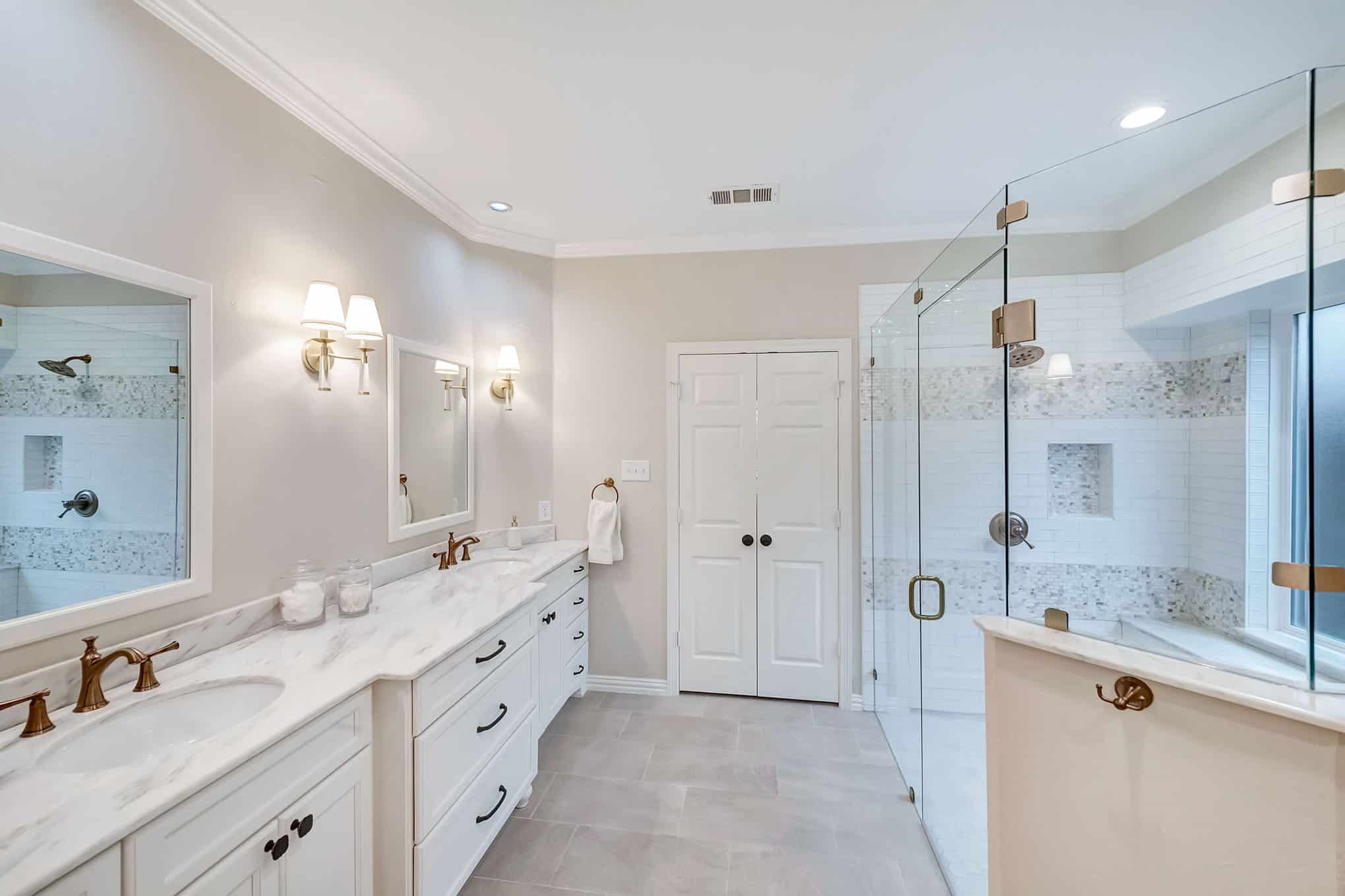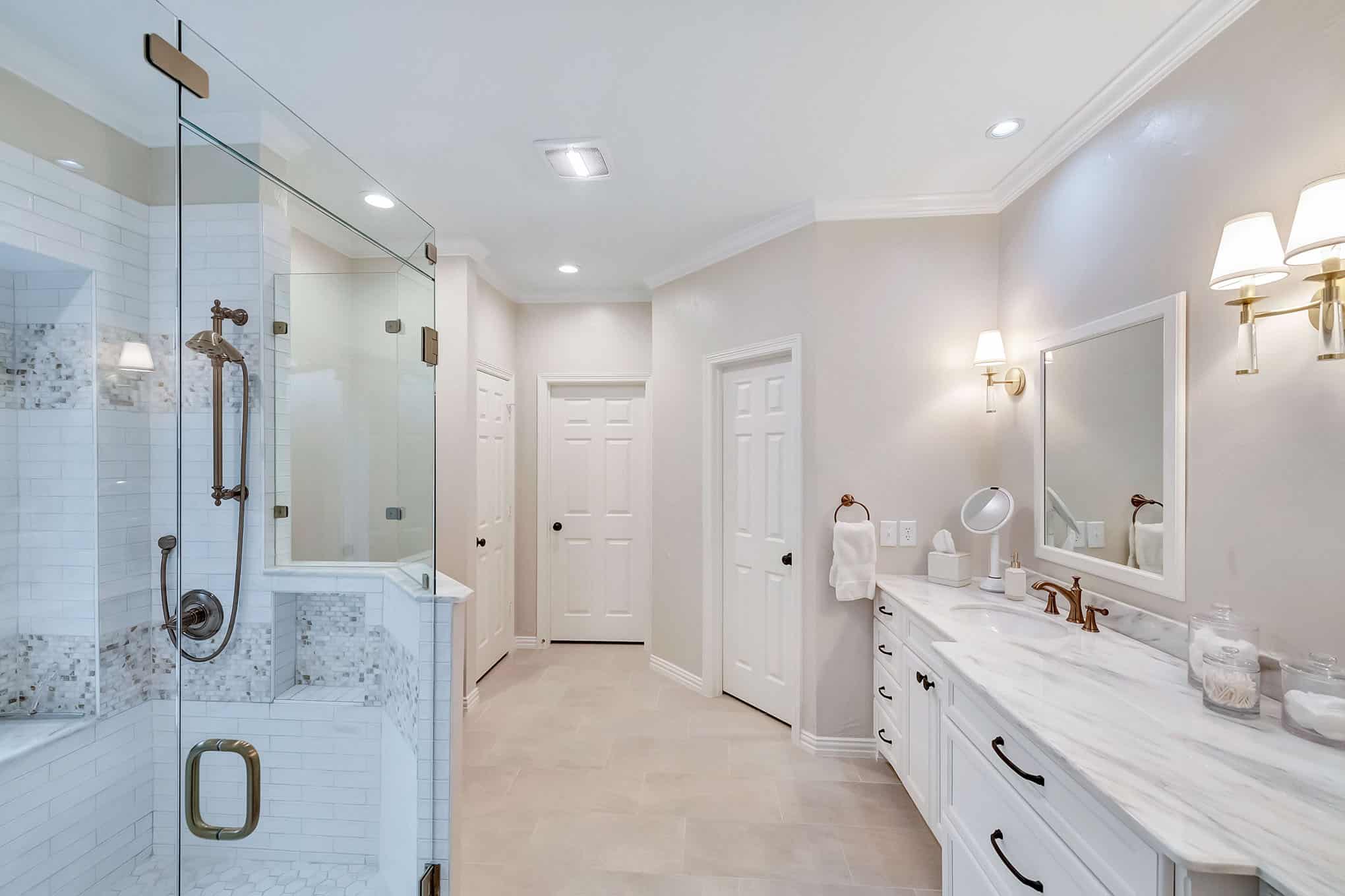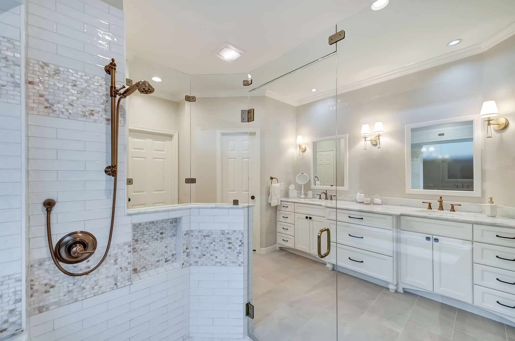 Our complete master bathroom transformation in Frisco creates a luxurious personal sanctuary with thoughtful design elements throughout. The expansive glass-enclosed shower features a stunning combination of white subway tile accented with bands of mother-of-pearl mosaic, complemented by dual bronze rainfall showerheads and a convenient bench seat. A custom window seat with frosted glass maintains natural light while ensuring privacy.