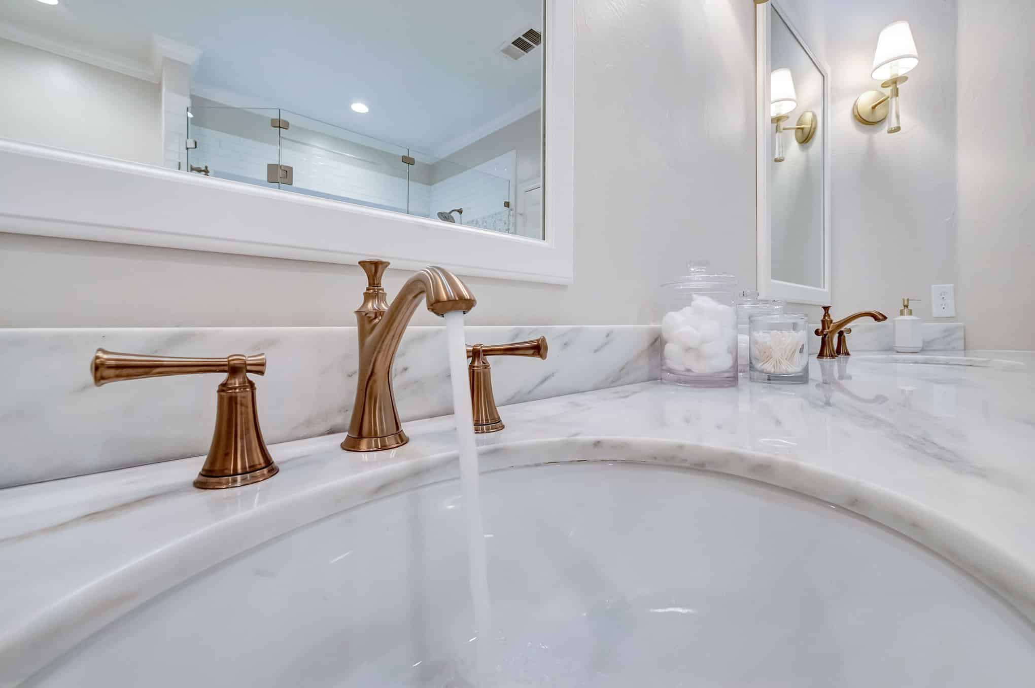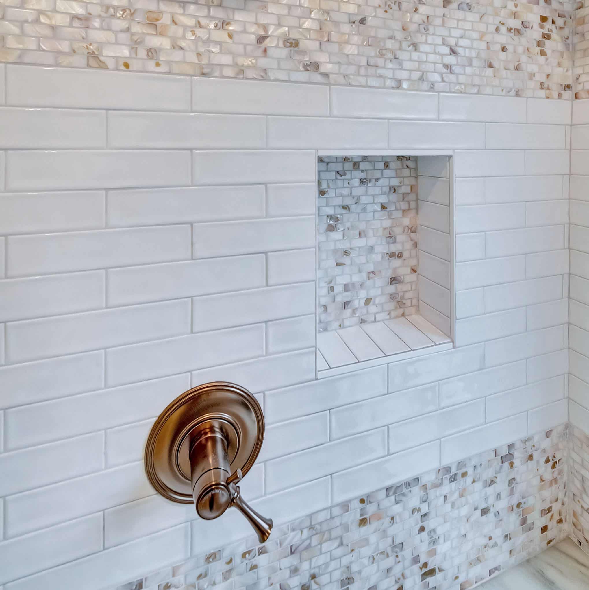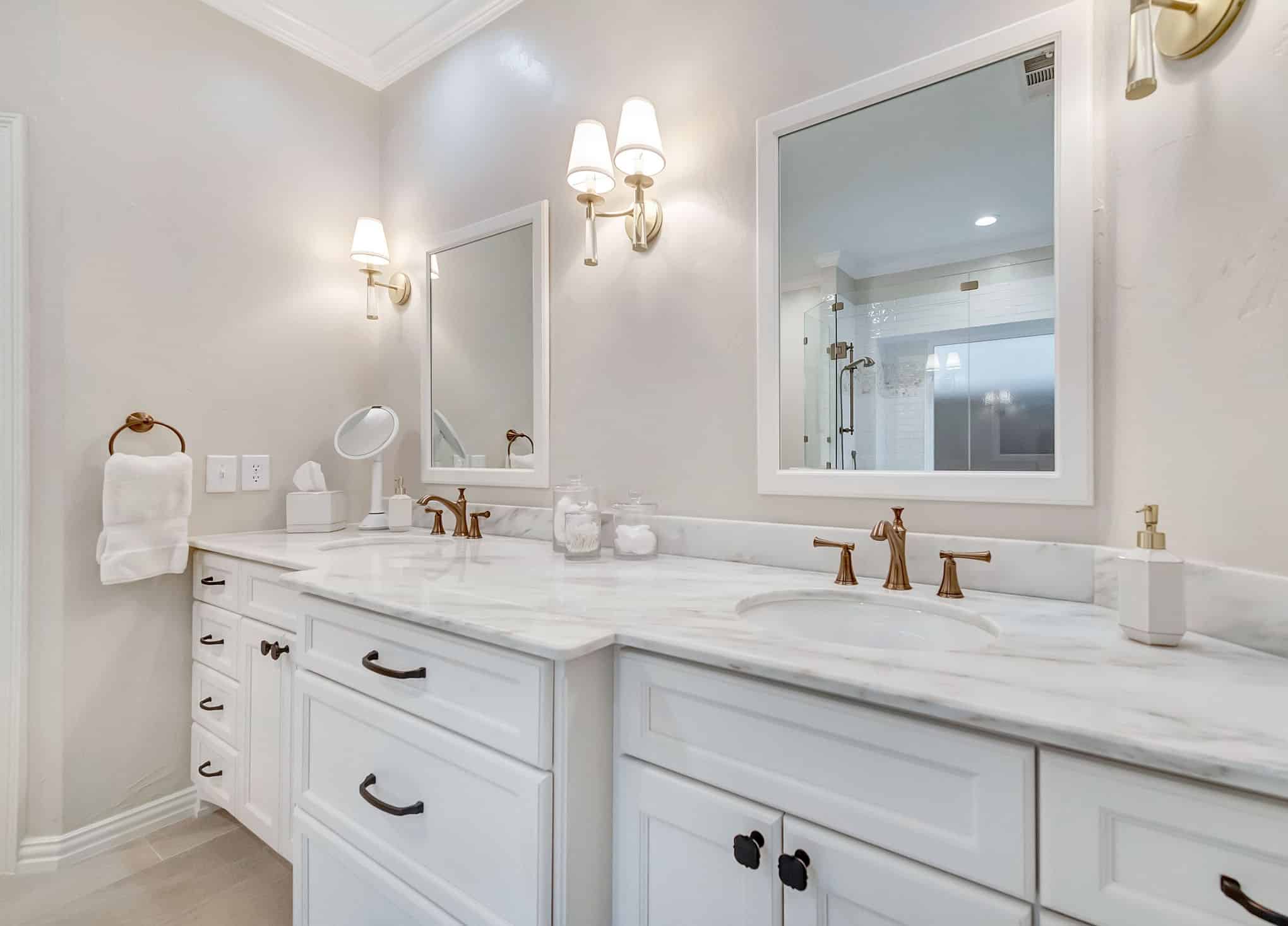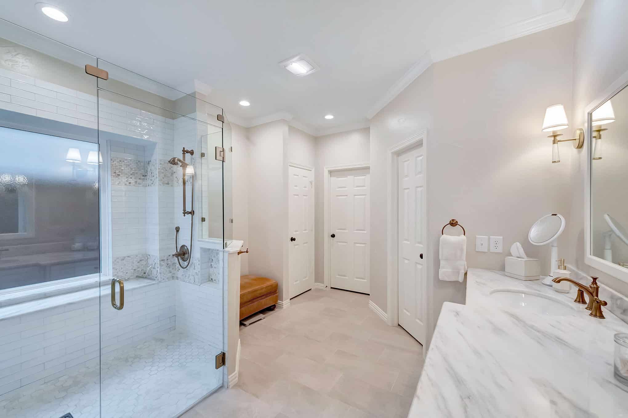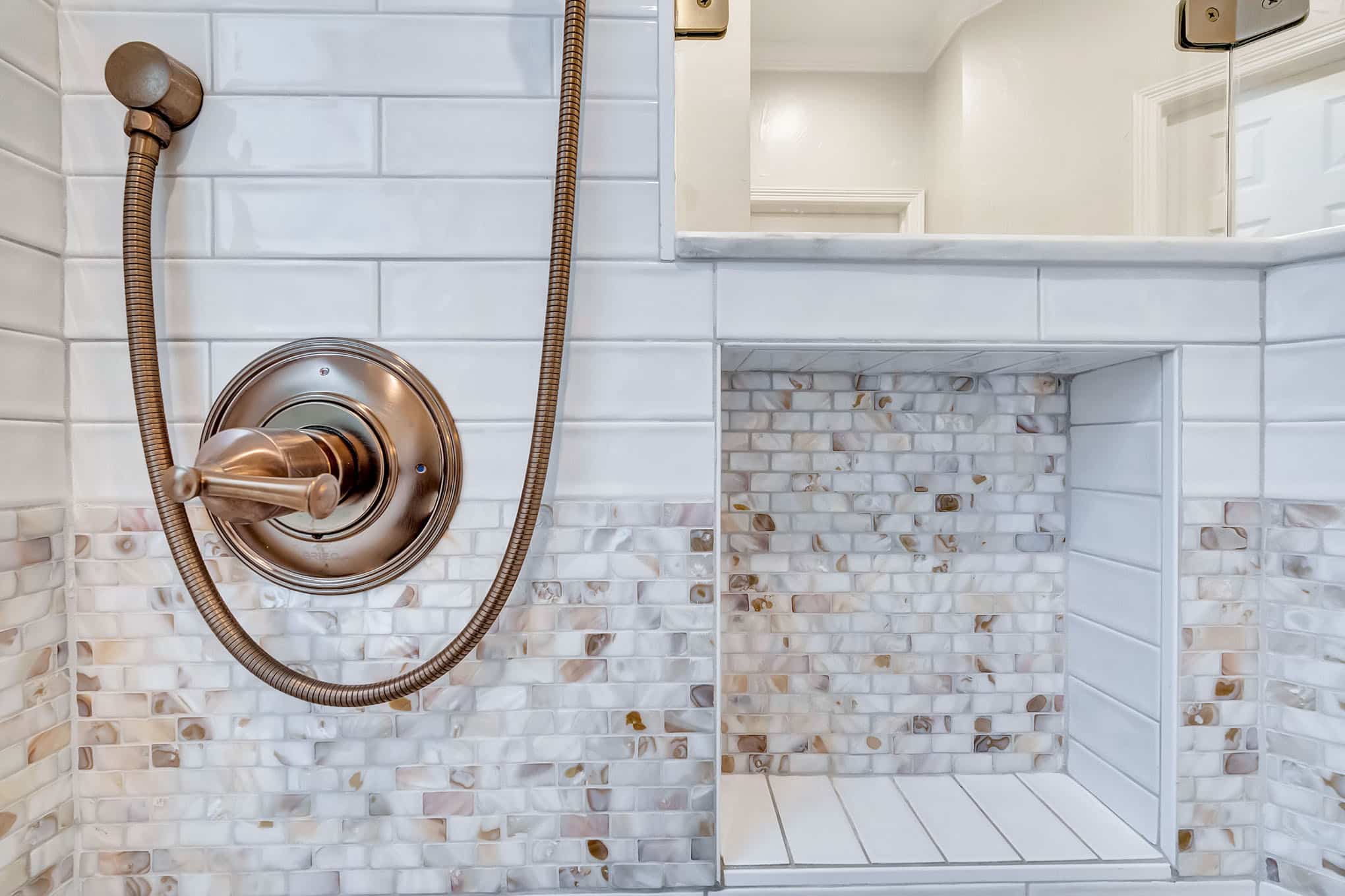 Our complete master bathroom transformation in Frisco creates a luxurious personal sanctuary with thoughtful design elements throughout. The expansive glass-enclosed shower features a stunning combination of white subway tile accented with bands of mother-of-pearl mosaic, complemented by dual bronze rainfall showerheads and a convenient bench seat. A custom window seat with frosted glass maintains natural light while ensuring privacy.