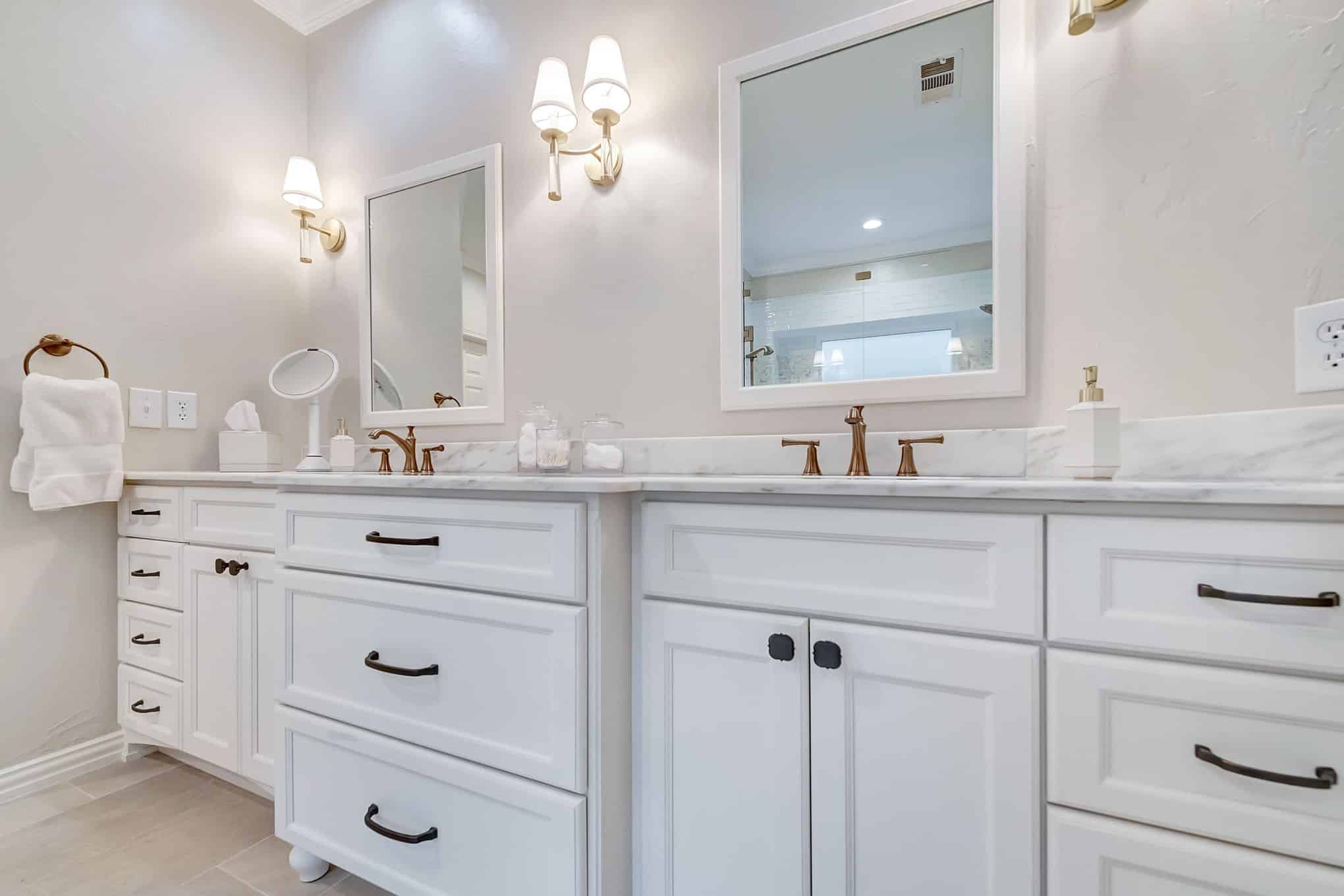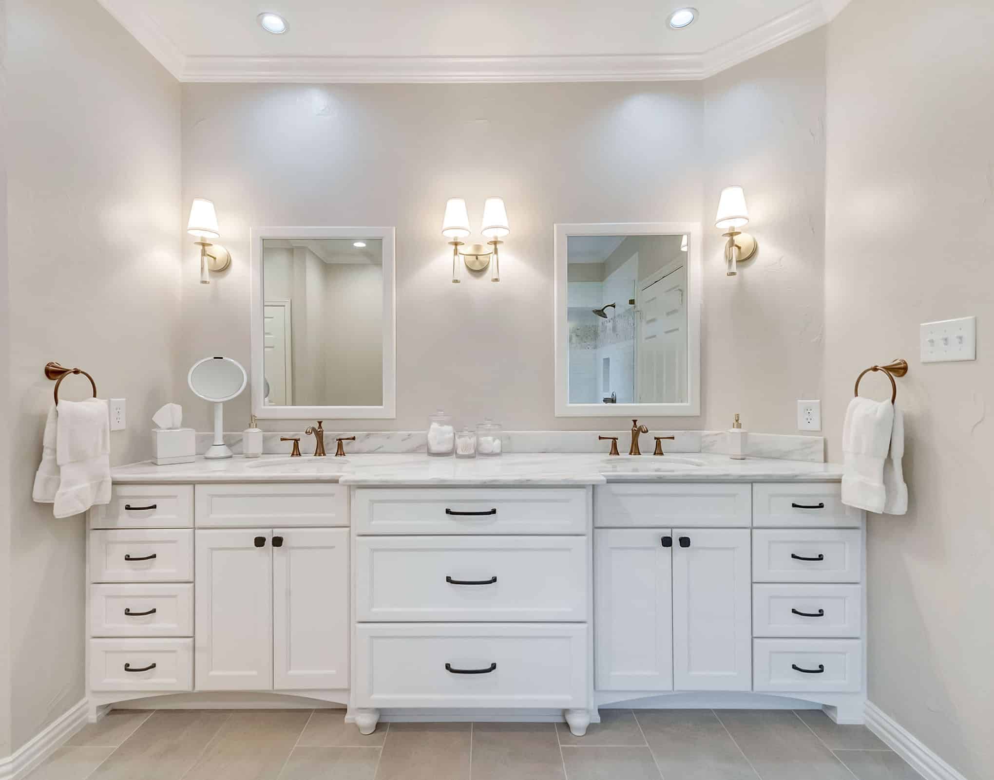 The elegant double vanity boasts crisp white cabinetry with ample storage, topped with luminous white marble countertops and bronze fixtures that echo the shower hardware. Soft neutral wall colors enhance the bathroom’s serene atmosphere, while strategically placed sconces provide perfect lighting for daily routines. The large-format cream tile flooring unifies the space and adds to the spa-like ambiance. Every detail, from the custom-built shower niche to the coordinated accessories, was carefully selected to create a cohesive, tranquil environment where homeowners can begin and end their day in comfort and style.