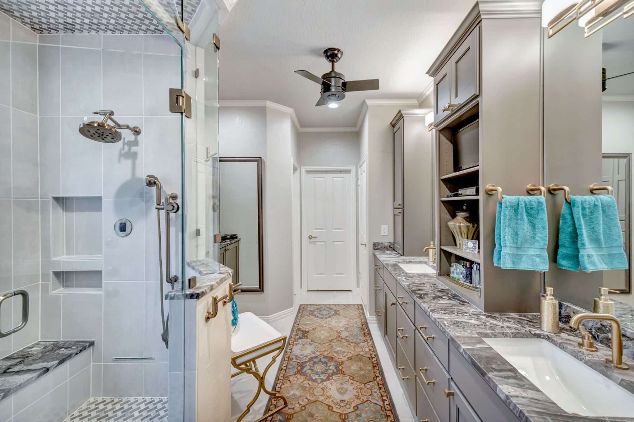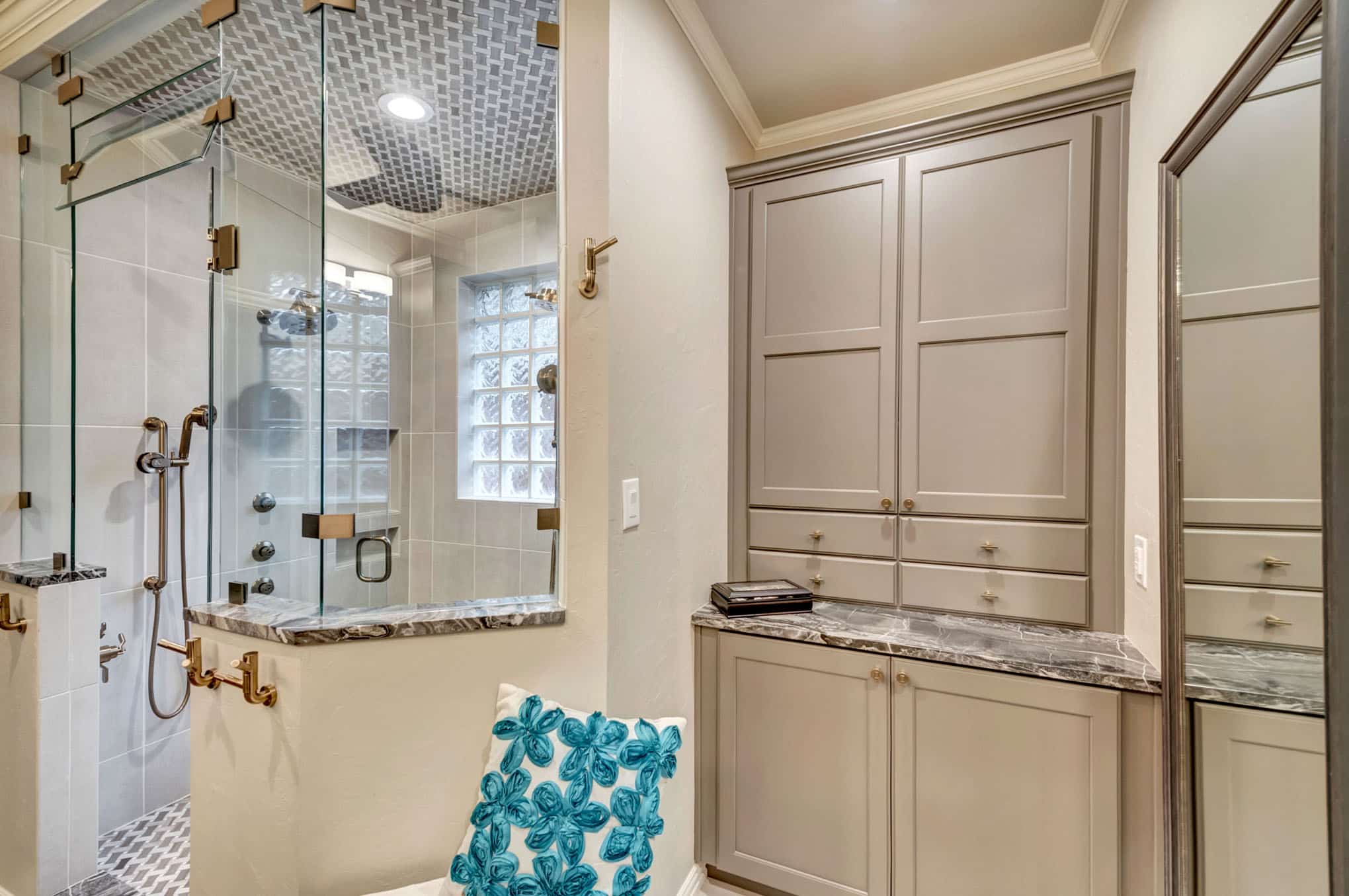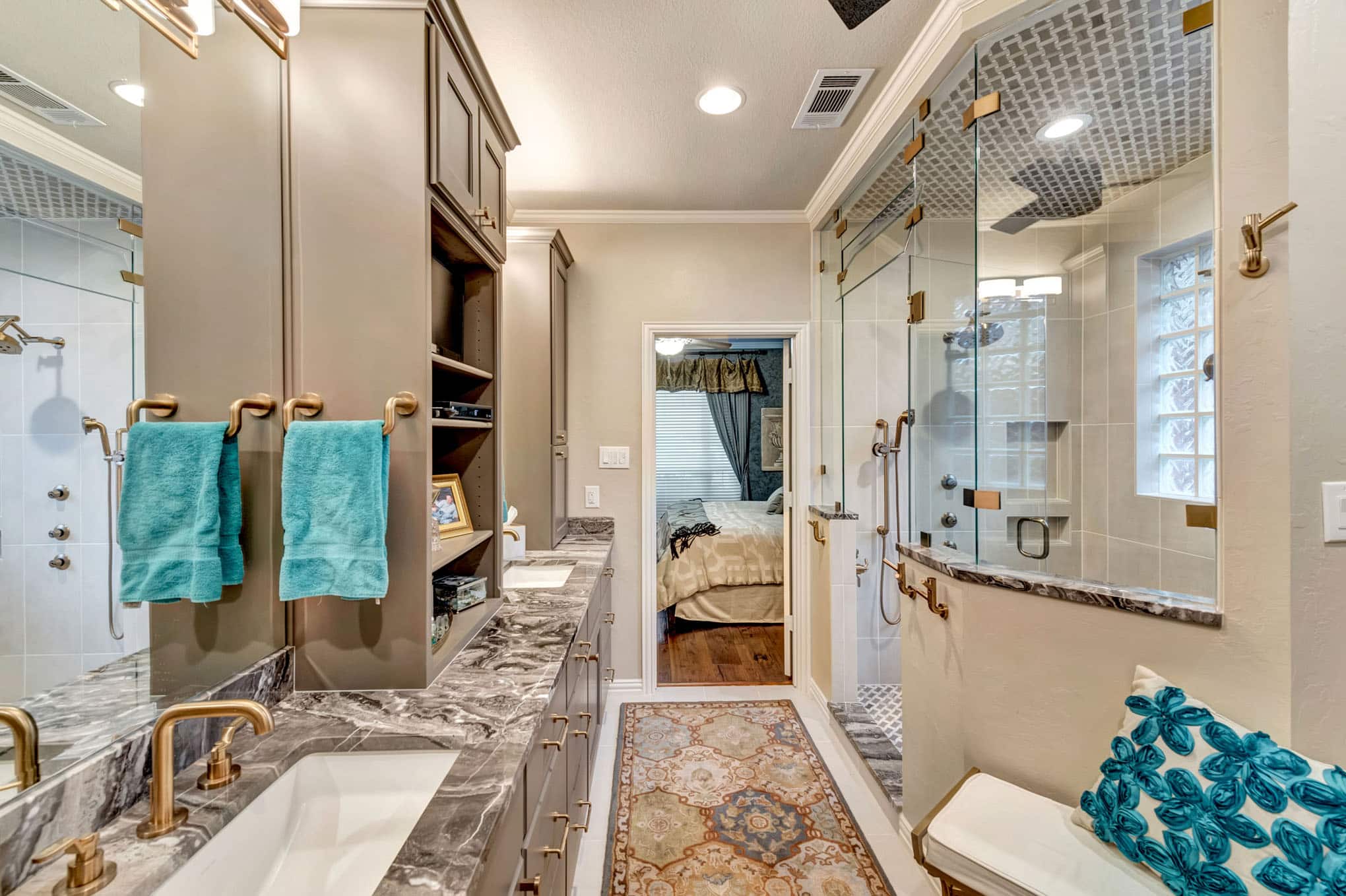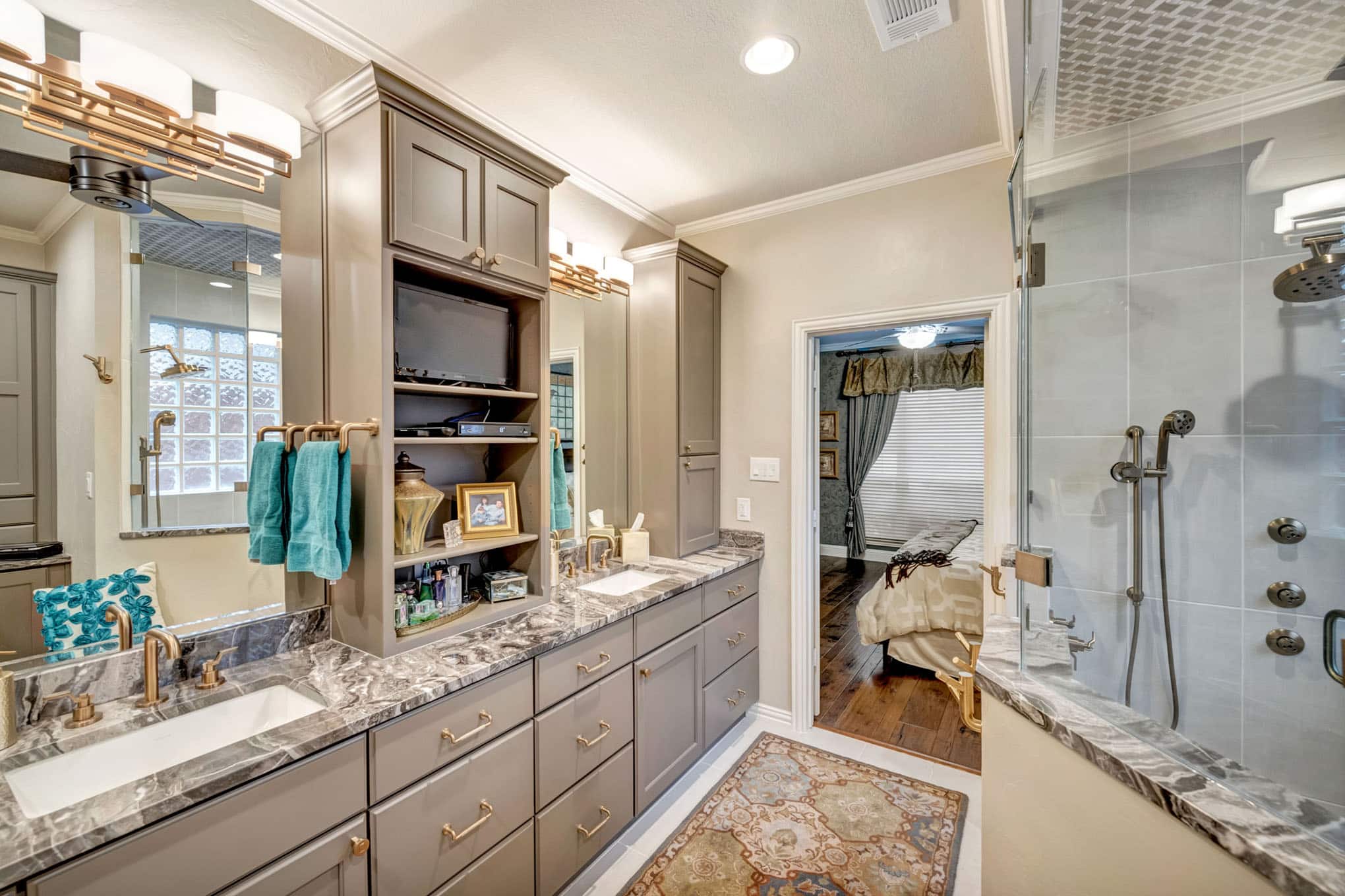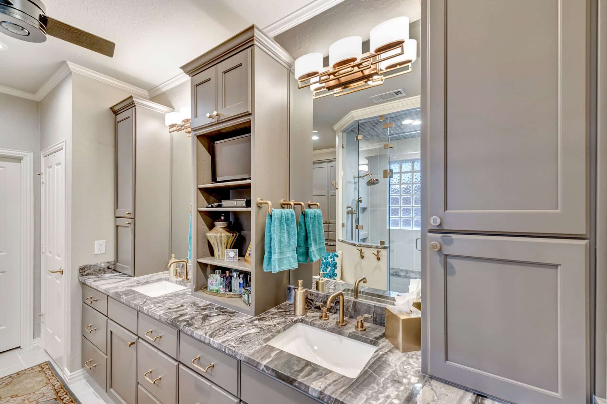This sophisticated master bathroom renovation in Richardson transforms an ordinary space into a high-end personal retreat. The sleek gray custom cabinetry provides ample storage while establishing a contemporary yet timeless aesthetic. Dramatic Fantasy Brown marble countertops with striking veining create visual interest and perfectly complement the warm brushed brass fixtures and hardware throughout the space.