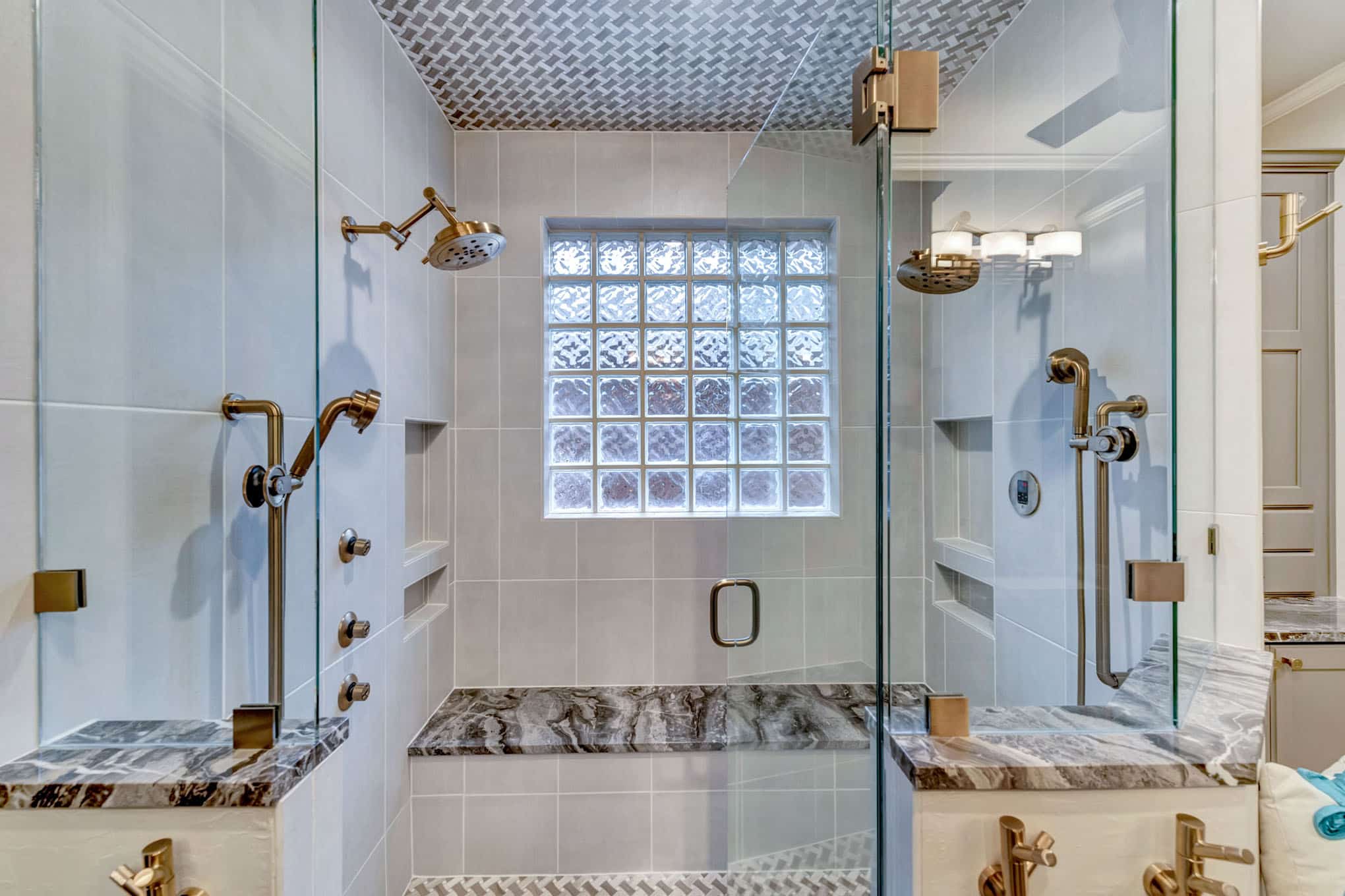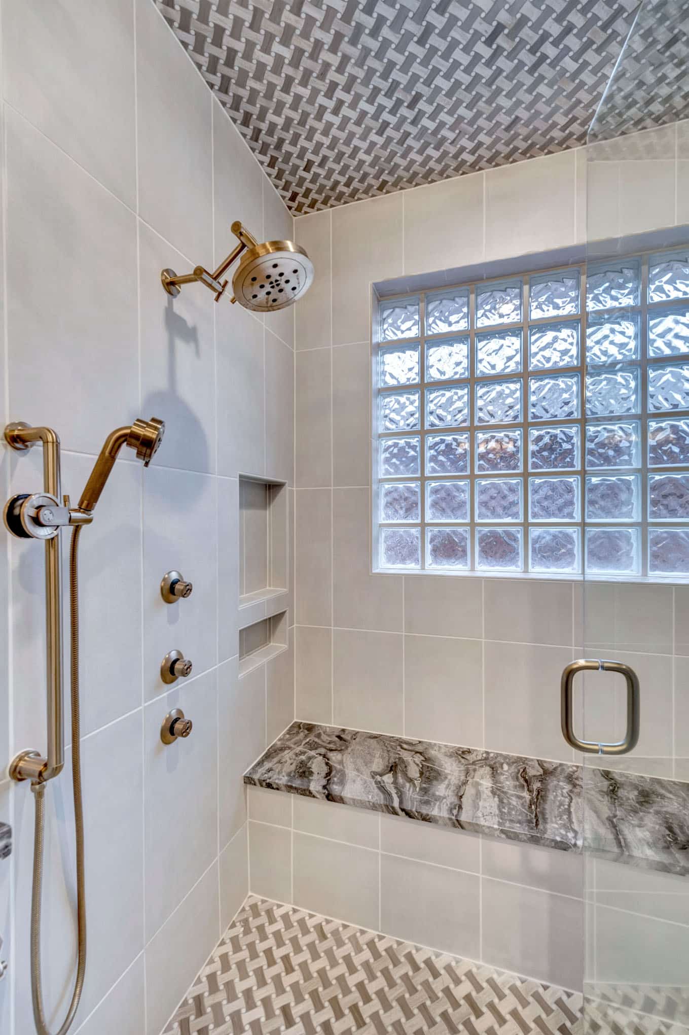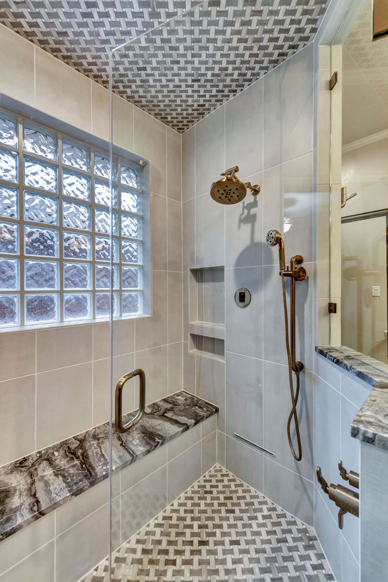 The expansive walk-in shower features multiple showering options, including rainfall and handheld fixtures with digital temperature controls, all enclosed in frameless glass. The distinctive glass block window cleverly balances privacy with natural light, while the custom basket-weave mosaic ceiling and floor add an element of unexpected luxury. Built-in shelving niches and a comfortable bench seat enhance both functionality and elegance.