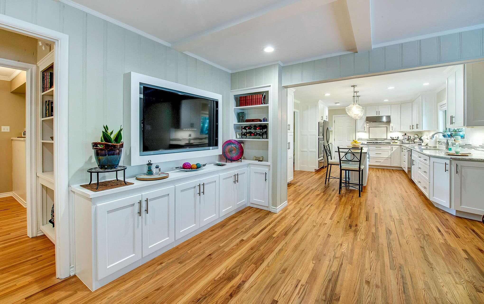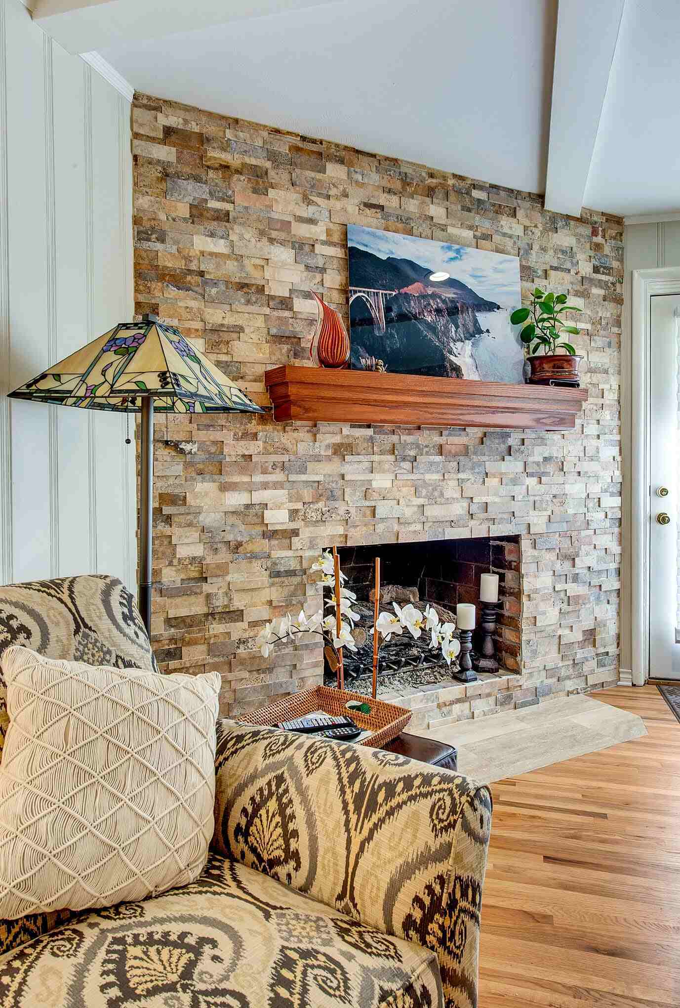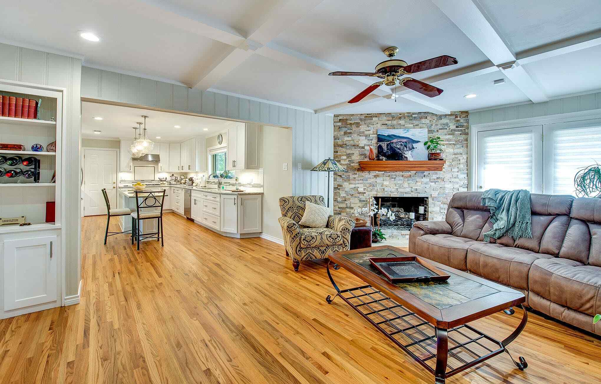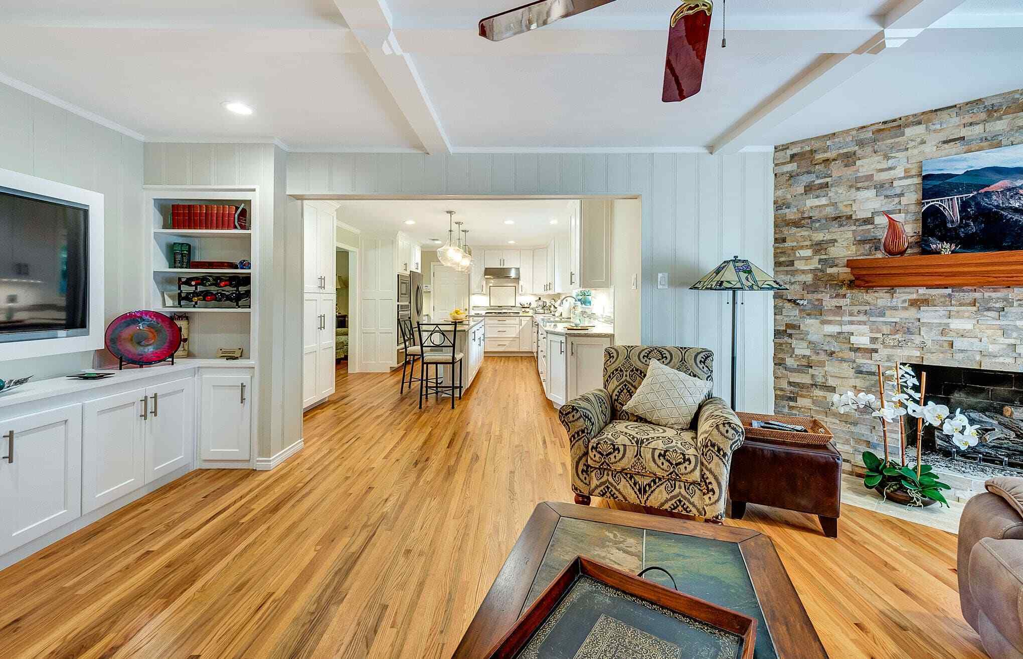 Kitchen, Living Room, Fireplace, and Laundry Room