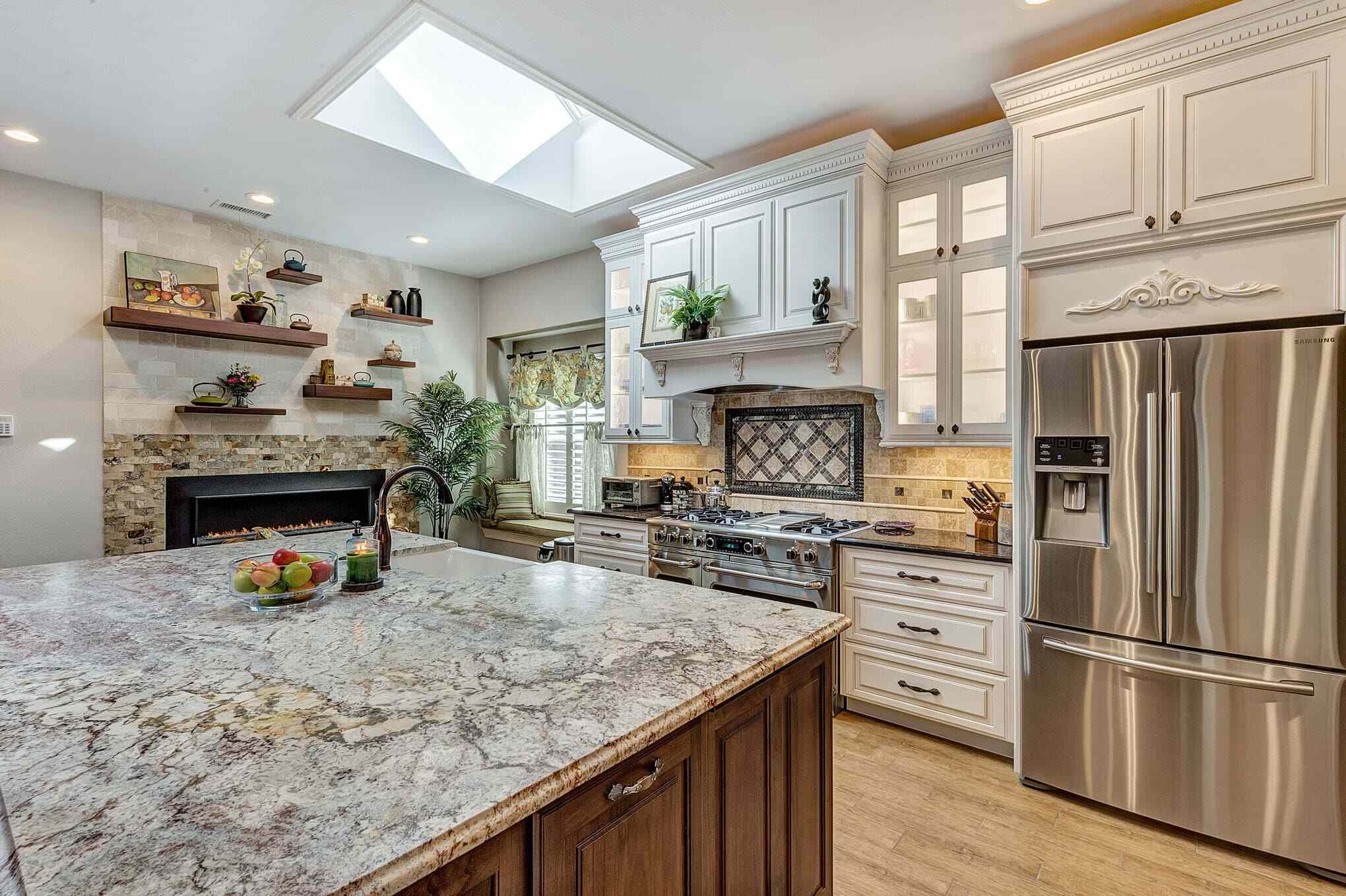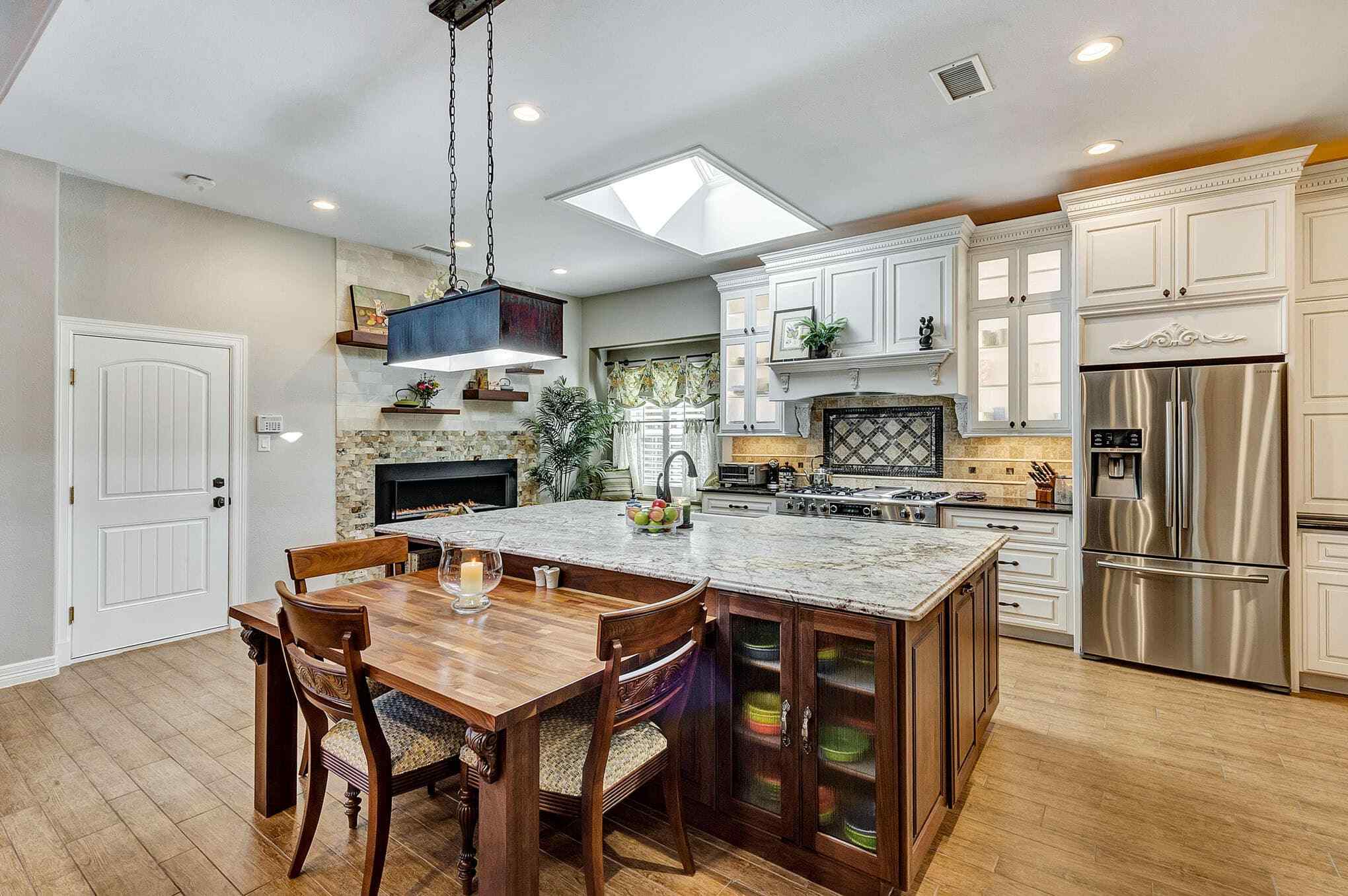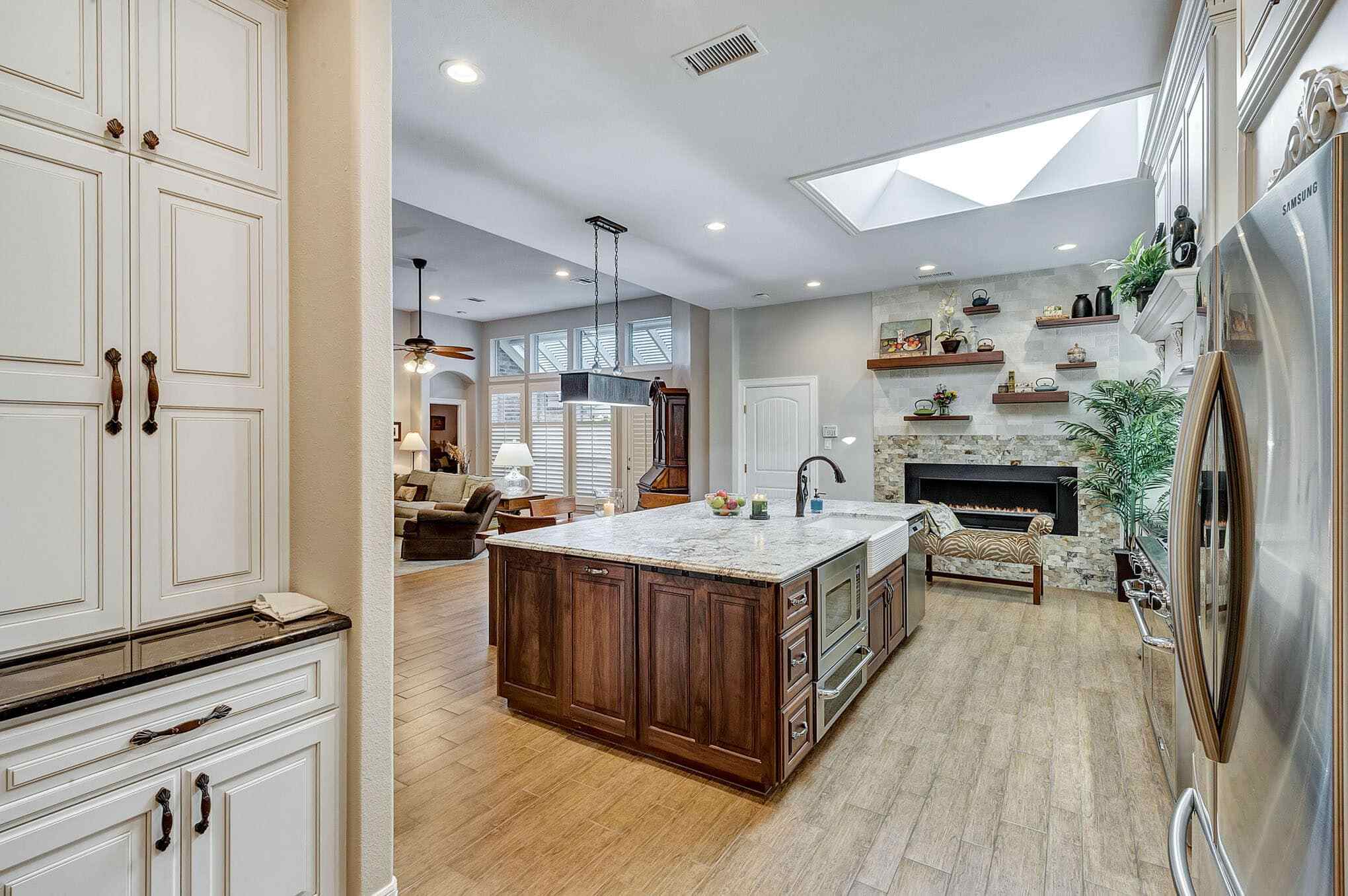 This stunning Frisco transformation creates a warm, inviting gathering space centered around a gourmet kitchen with distinctive French country elements. Antique white perimeter cabinetry with delicate glazing and crown molding contrasts beautifully with the rich walnut island and floating shelves. The showstopping granite countertops feature dramatic veining that ties together the color palette throughout the space. A professional-grade gas range with custom hood and decorative tile backsplash serves as a stunning focal point, complemented by built-in floating shelves and a custom stone fireplace that adds both ambiance and functionality.