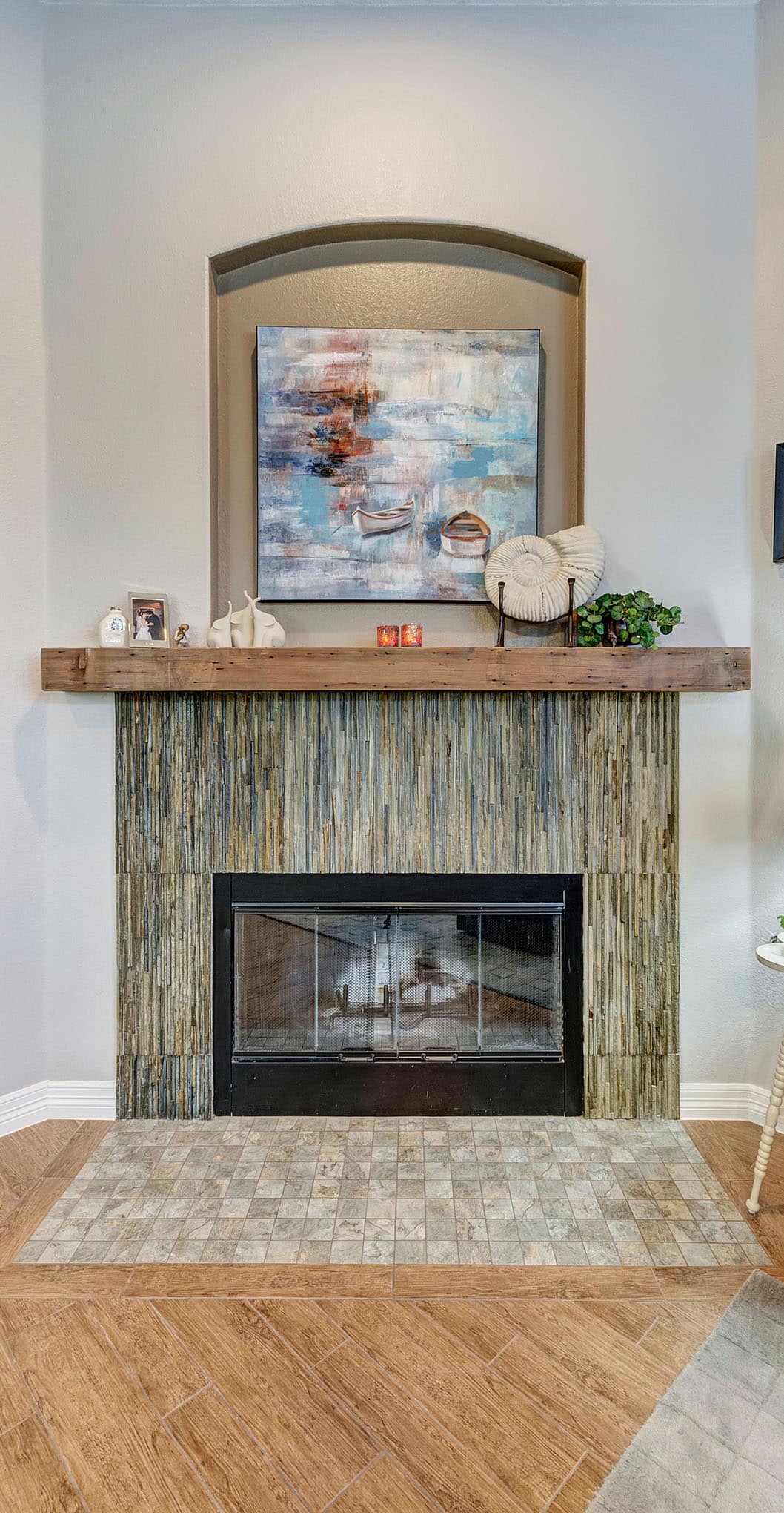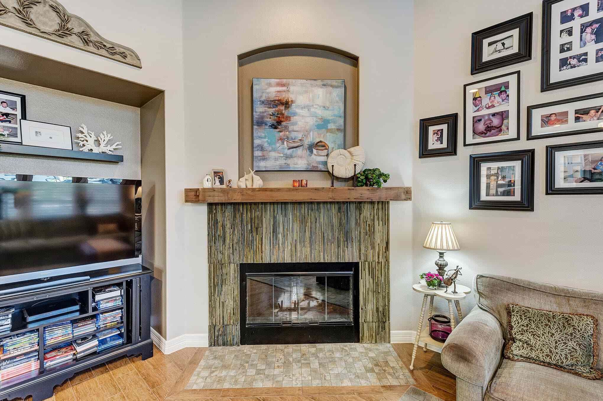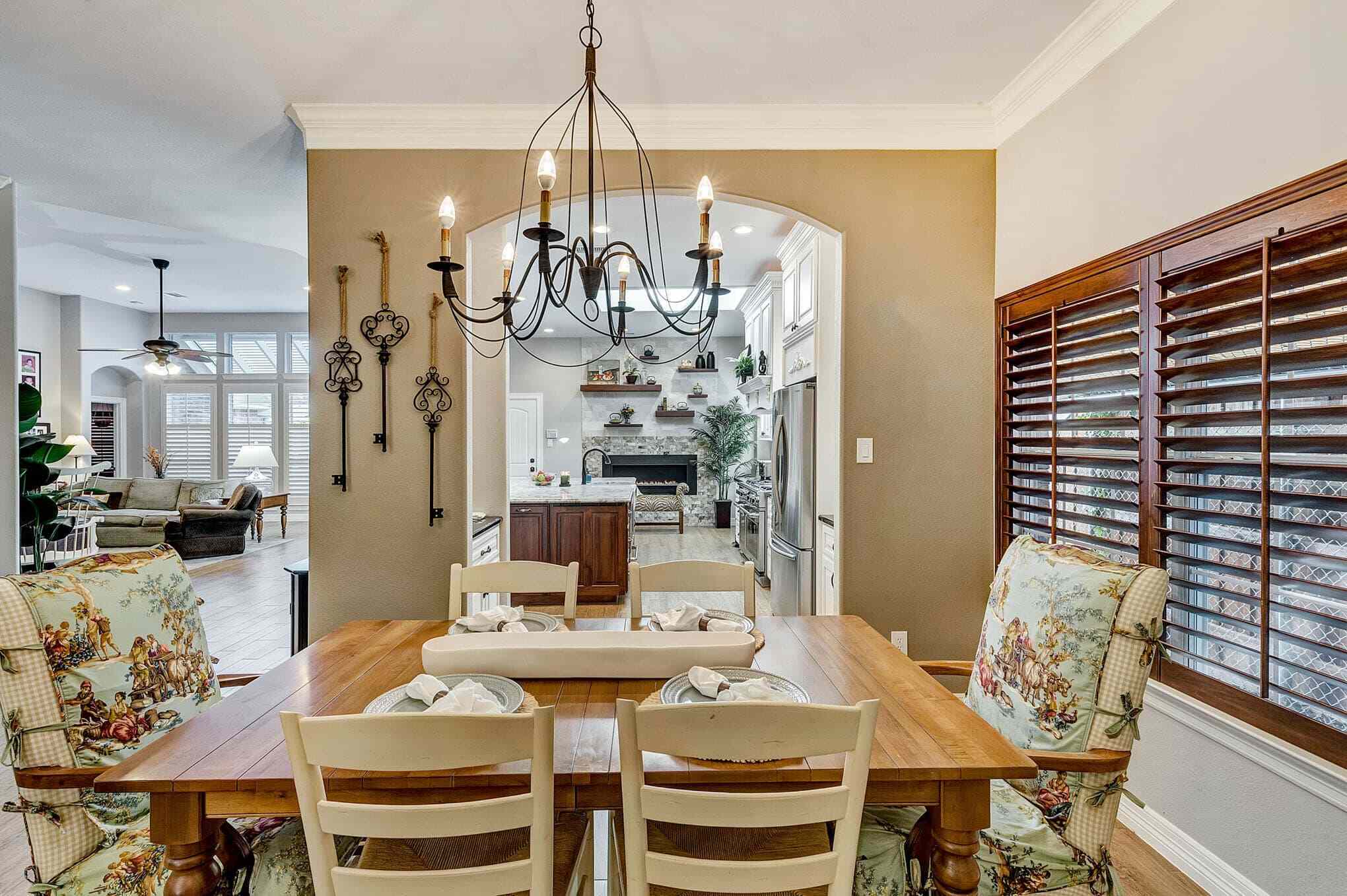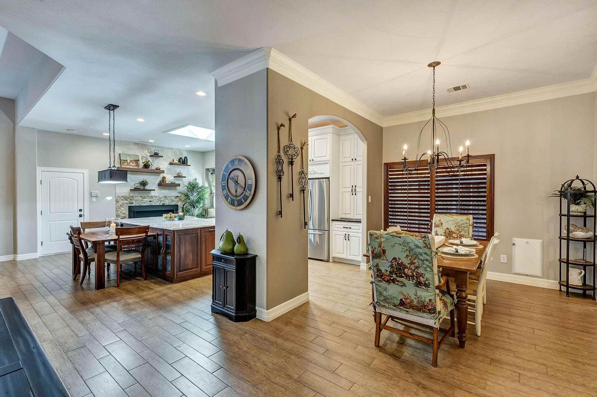This stunning Frisco transformation creates a warm, inviting gathering space centered around a gourmet kitchen with distinctive French country elements. Antique white perimeter cabinetry with delicate glazing and crown molding contrasts beautifully with the rich walnut island and floating shelves. The showstopping granite countertops feature dramatic veining that ties together the color palette throughout the space. A professional-grade gas range with custom hood and decorative tile backsplash serves as a stunning focal point, complemented by built-in floating shelves and a custom stone fireplace that adds both ambiance and functionality.