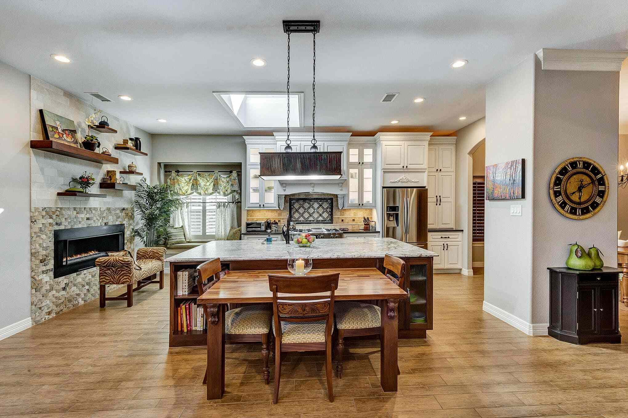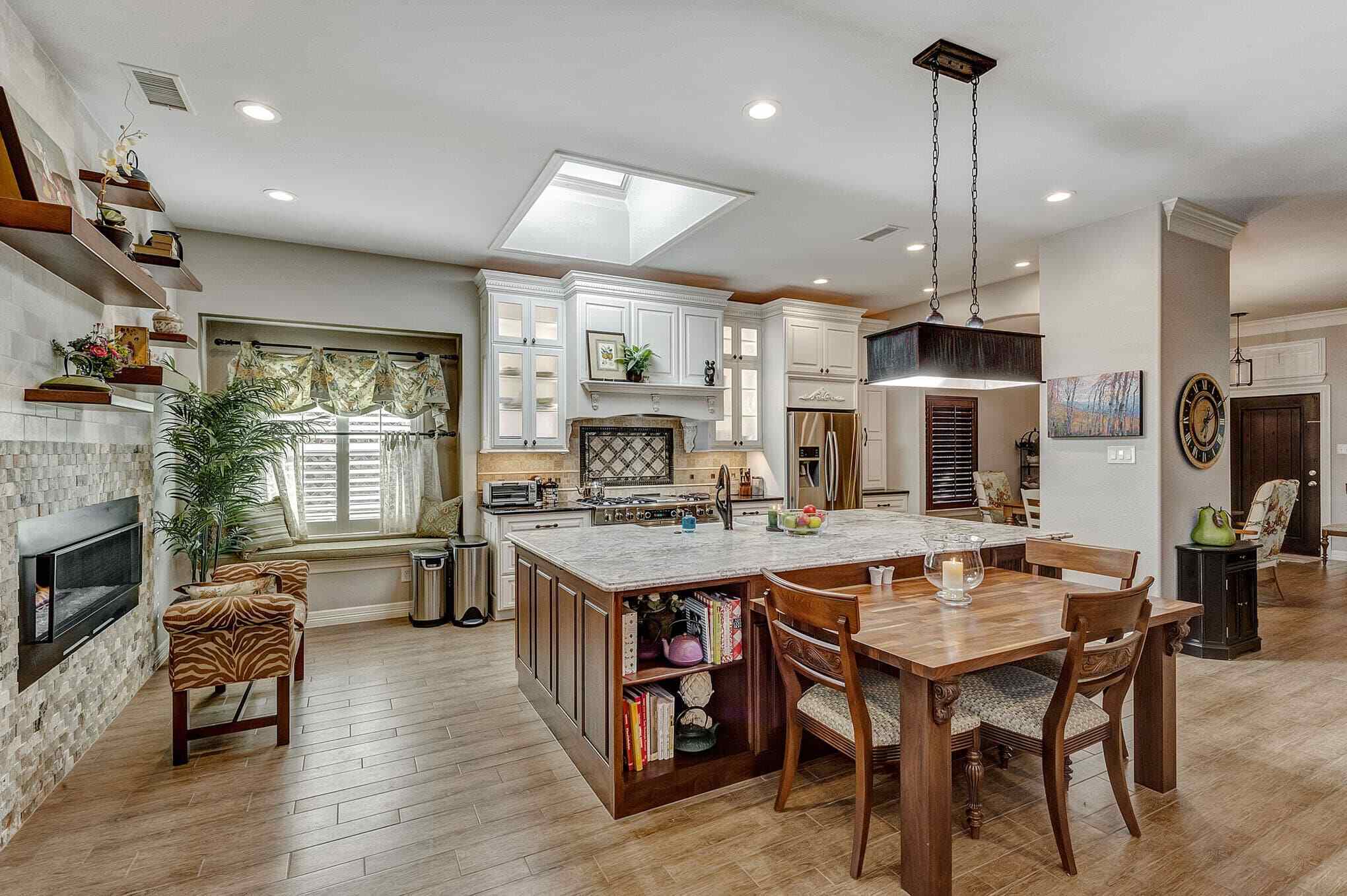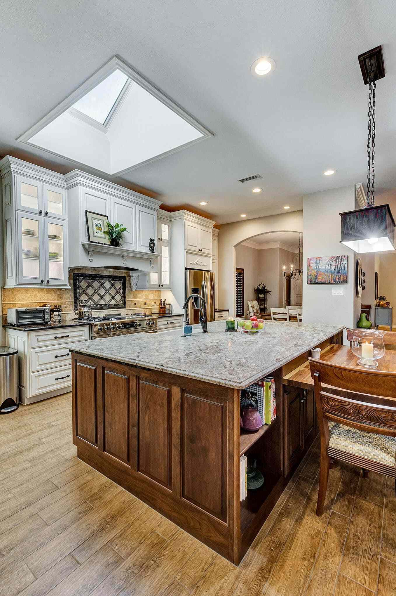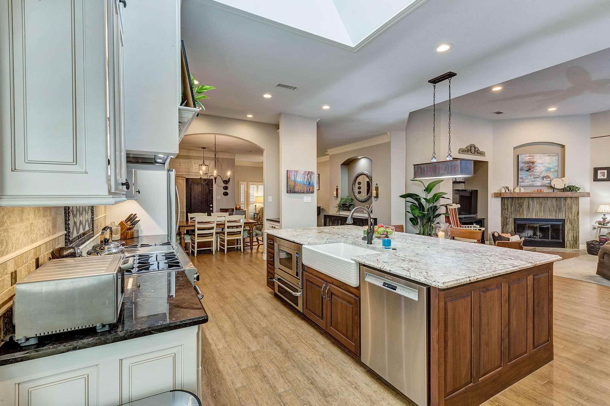 The skylight floods the space with natural light, highlighting the exquisite details like bronze cabinet hardware, pendant lighting, and the farmhouse sink. The open floor plan seamlessly connects the kitchen to the formal dining space, creating an entertainer’s dream that balances elegant sophistication with comfortable livability. This transformation perfectly demonstrates how thoughtful design can create spaces that feel both luxurious and warmly inviting.