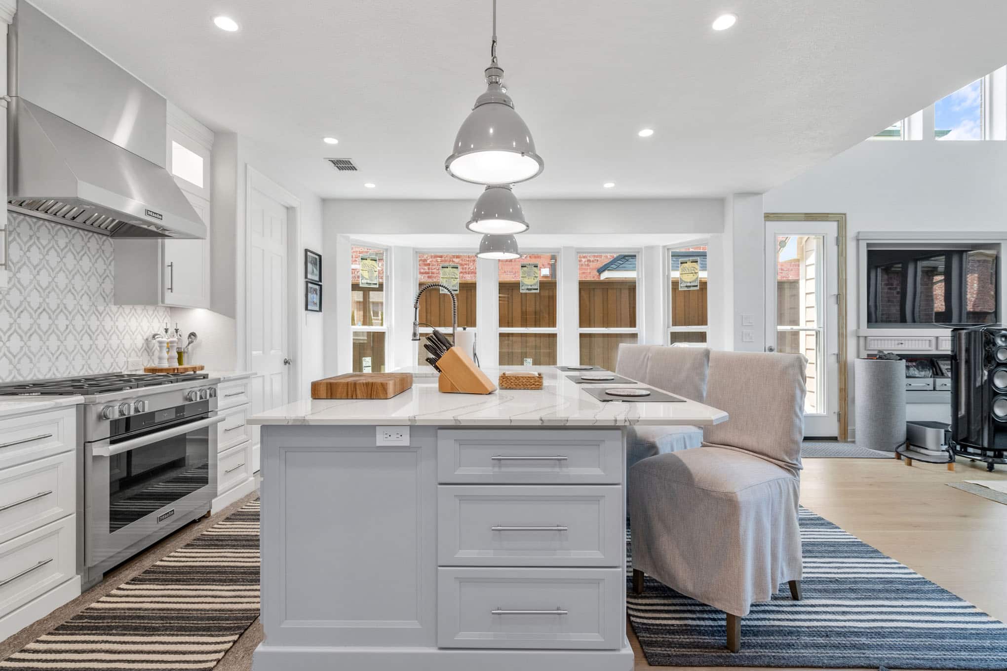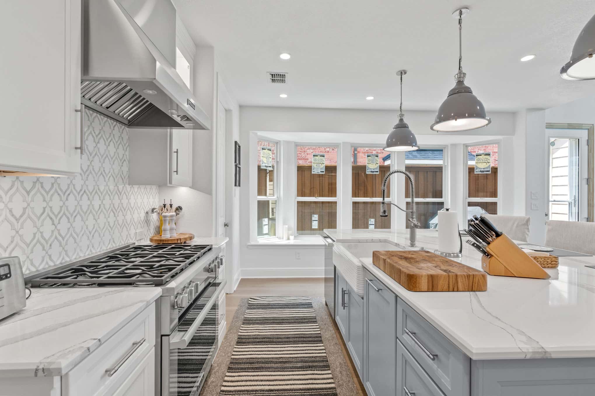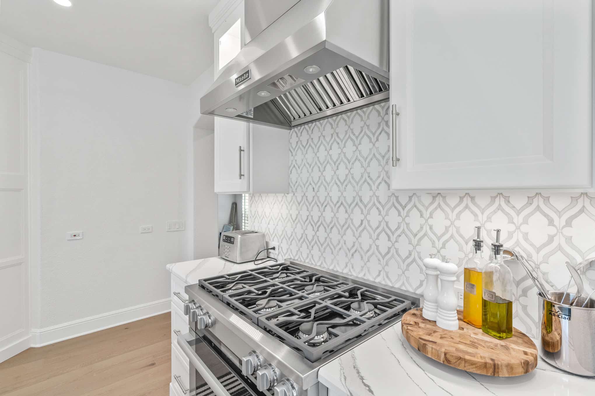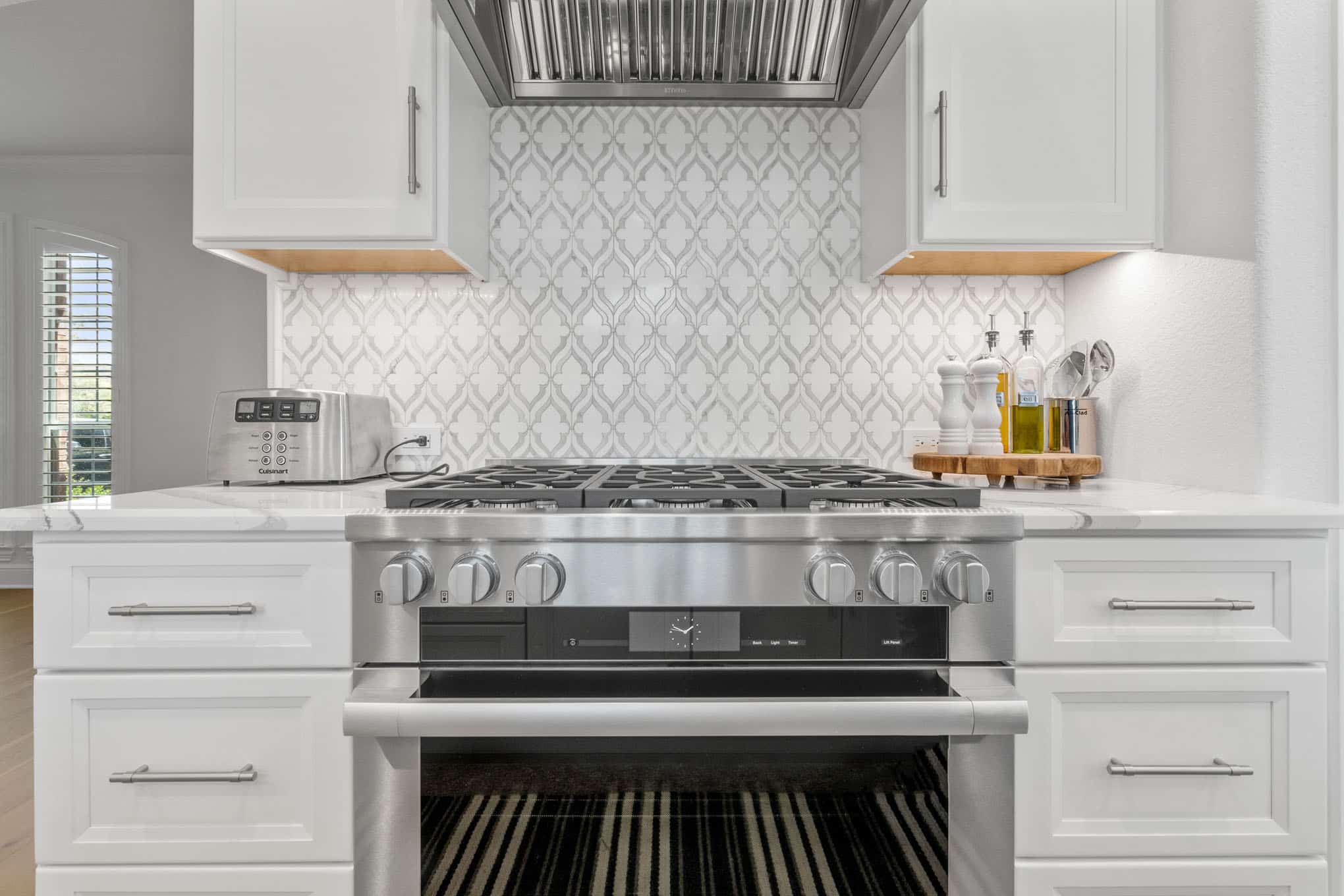 The striking arabesque pattern backsplash serves as the design’s signature element, introducing subtle texture and movement through its interplay of light and shadow, while professionally-specified pendant lighting creates pools of focused illumination exactly where needed for both task work and ambient evening glow. Thoughtful zone planning—evident in the harmonious relationship between the professional-grade gas range, farmhouse sink with restaurant-worthy articulated faucet, and temperature-controlled beverage center—creates a culinary workspace that reflects the sophisticated entertaining needs of discerning Prosper homeowners.