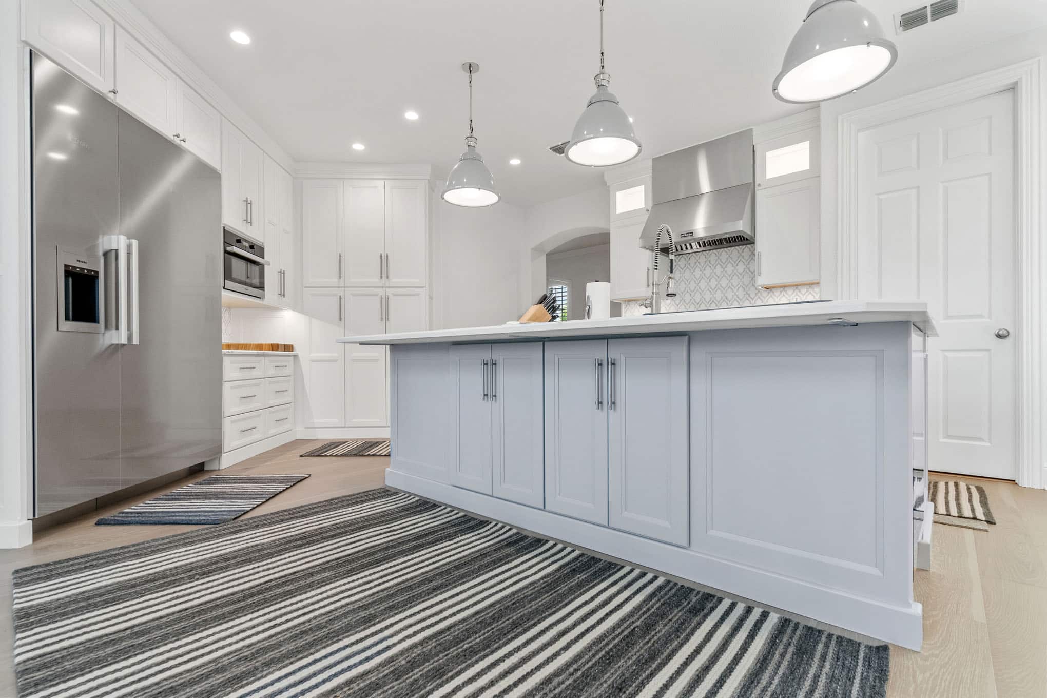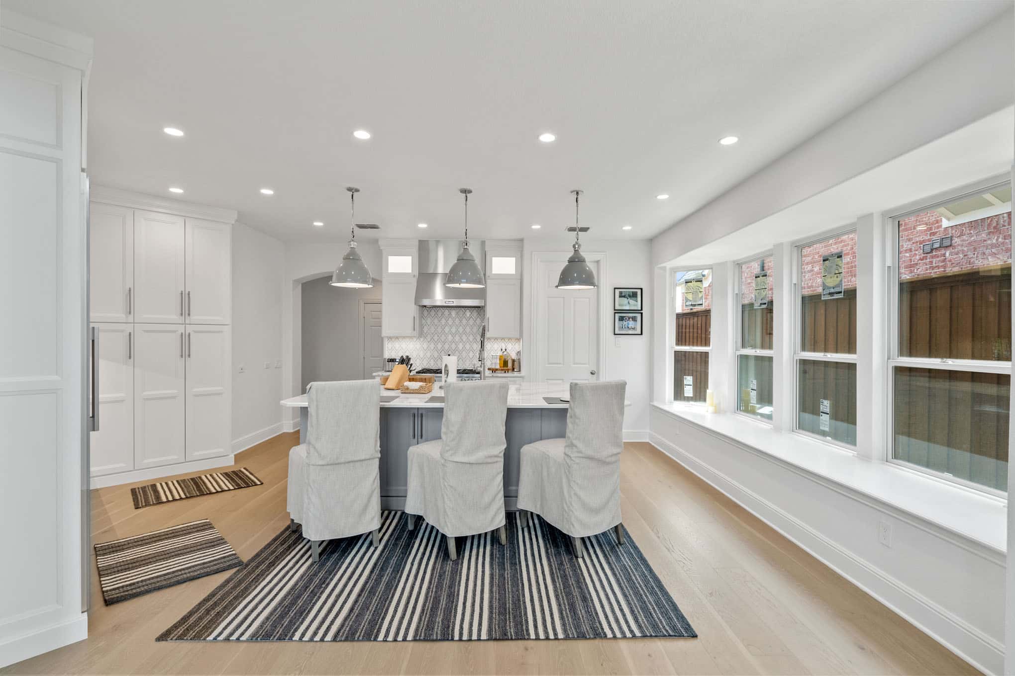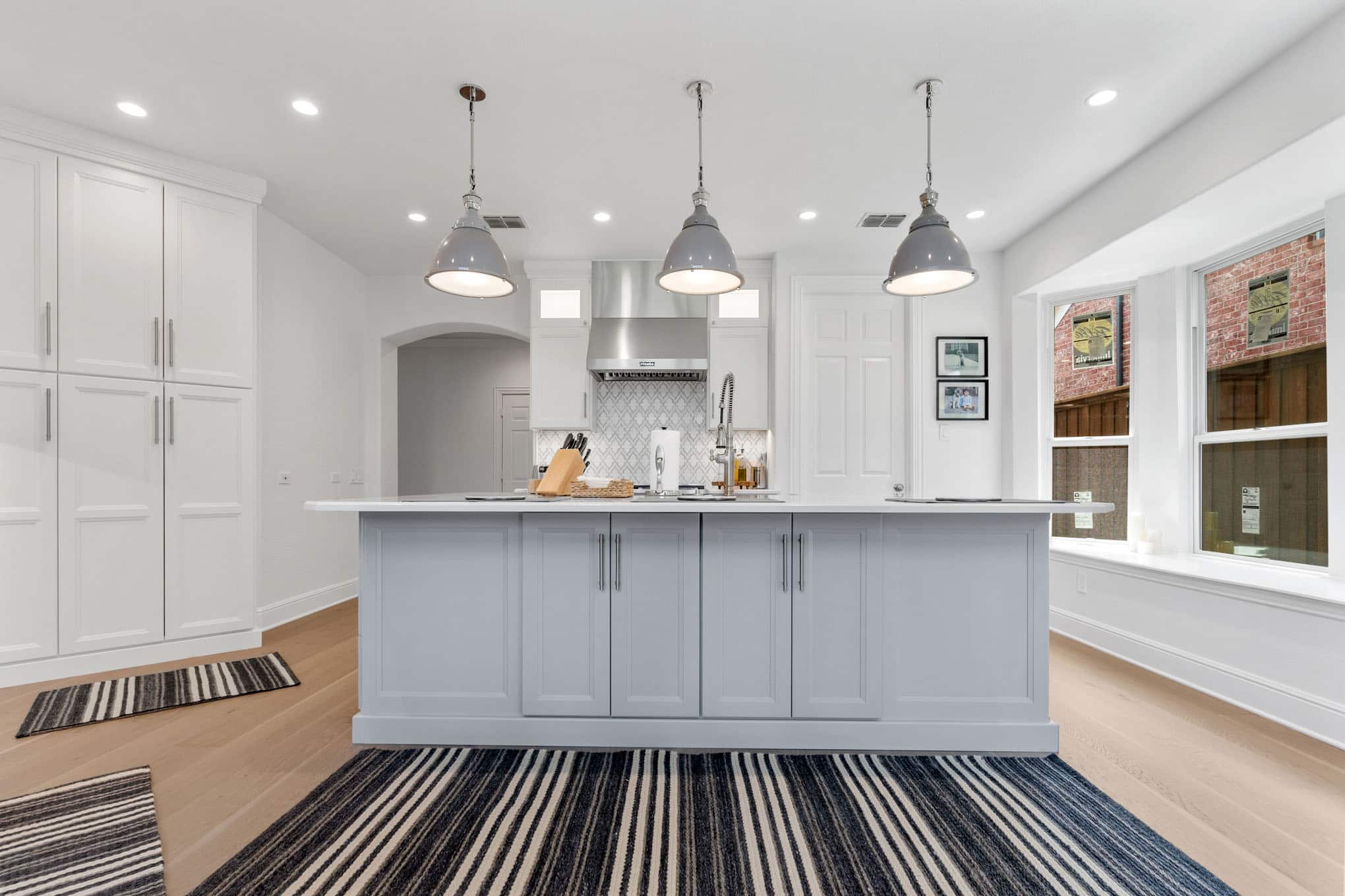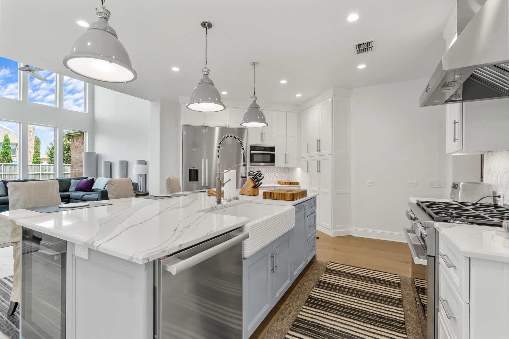 The striking arabesque pattern backsplash serves as the design’s signature element, introducing subtle texture and movement through its interplay of light and shadow, while professionally-specified pendant lighting creates pools of focused illumination exactly where needed for both task work and ambient evening glow. Thoughtful zone planning—evident in the harmonious relationship between the professional-grade gas range, farmhouse sink with restaurant-worthy articulated faucet, and temperature-controlled beverage center—creates a culinary workspace that reflects the sophisticated entertaining needs of discerning Prosper homeowners.