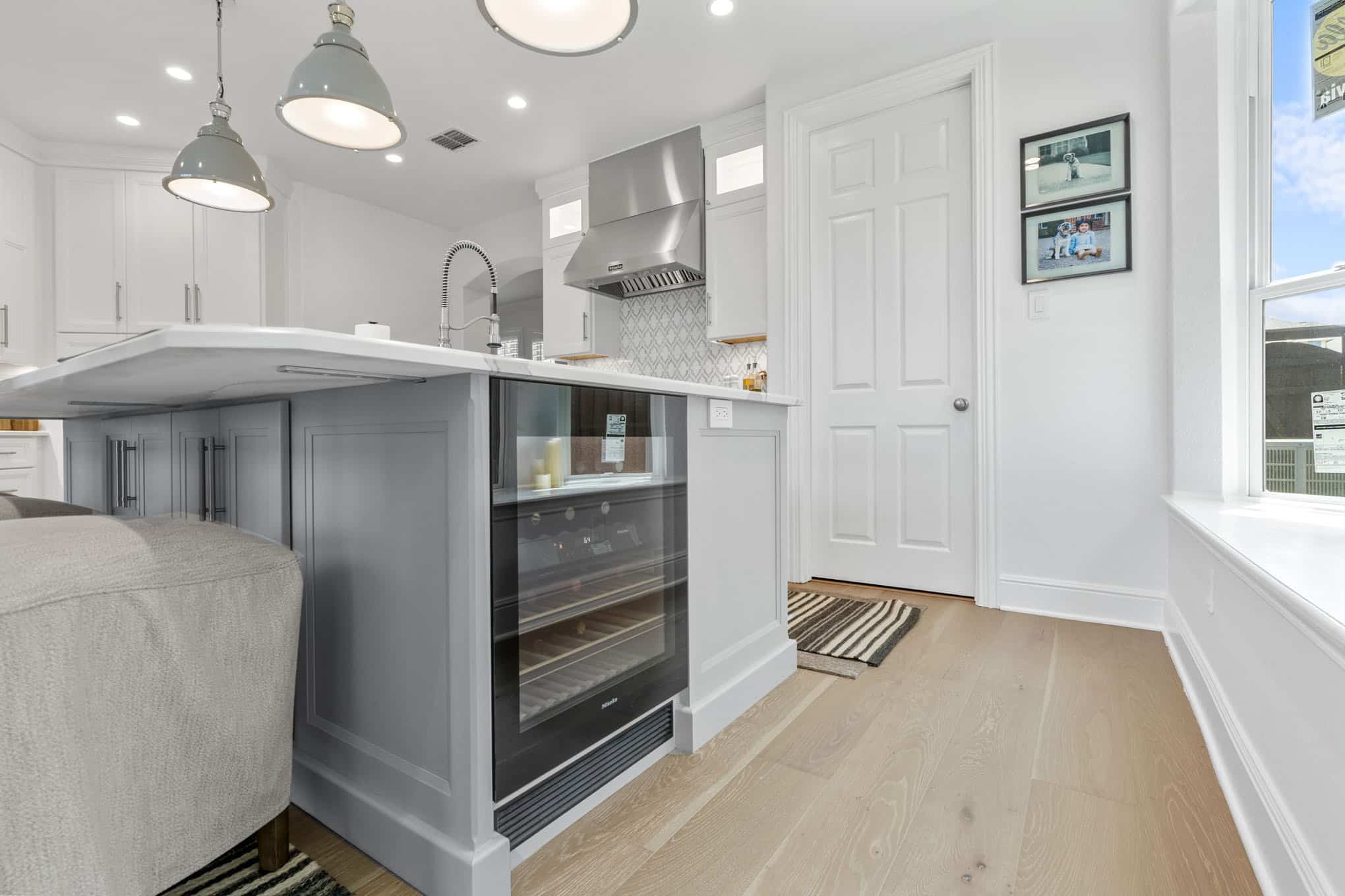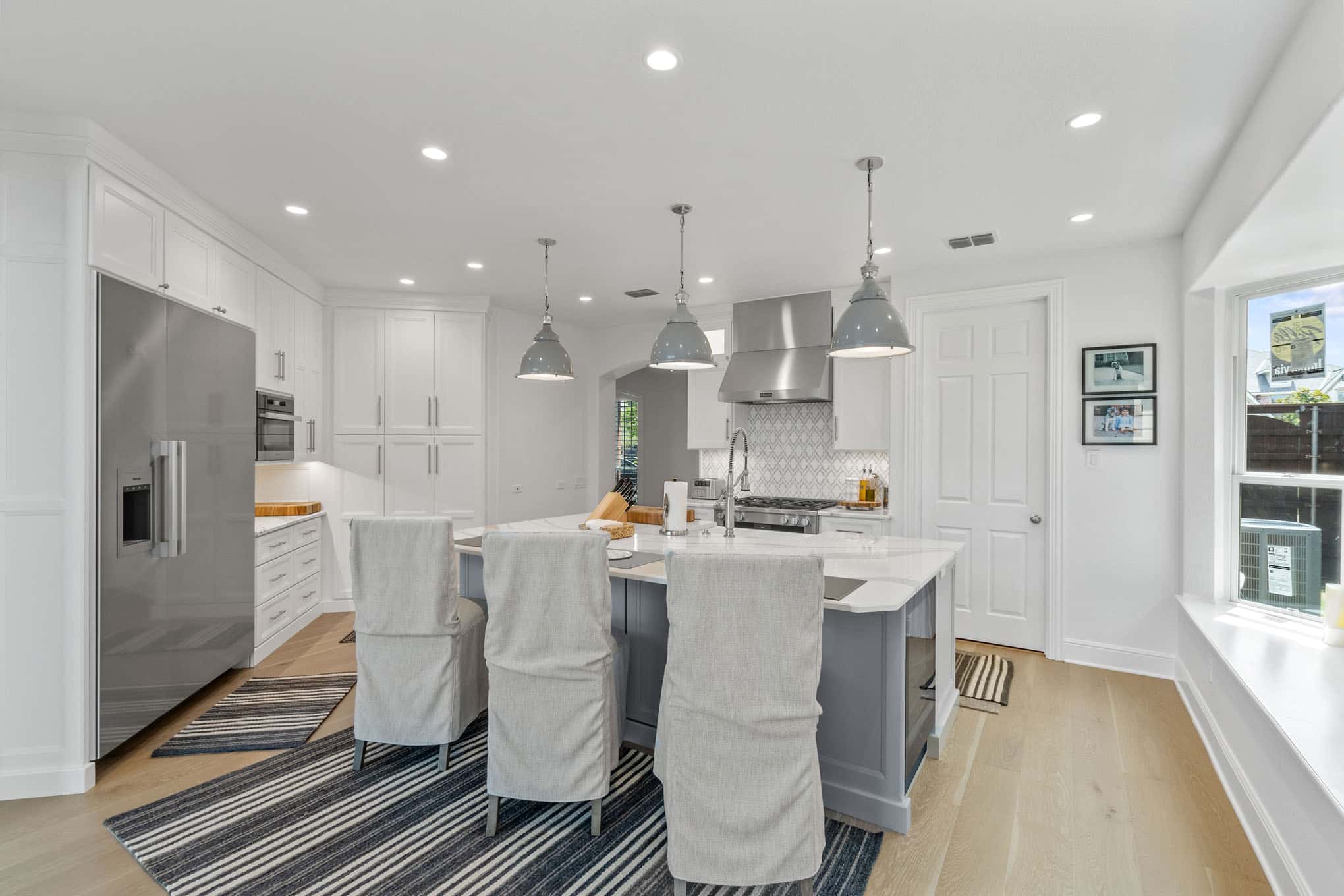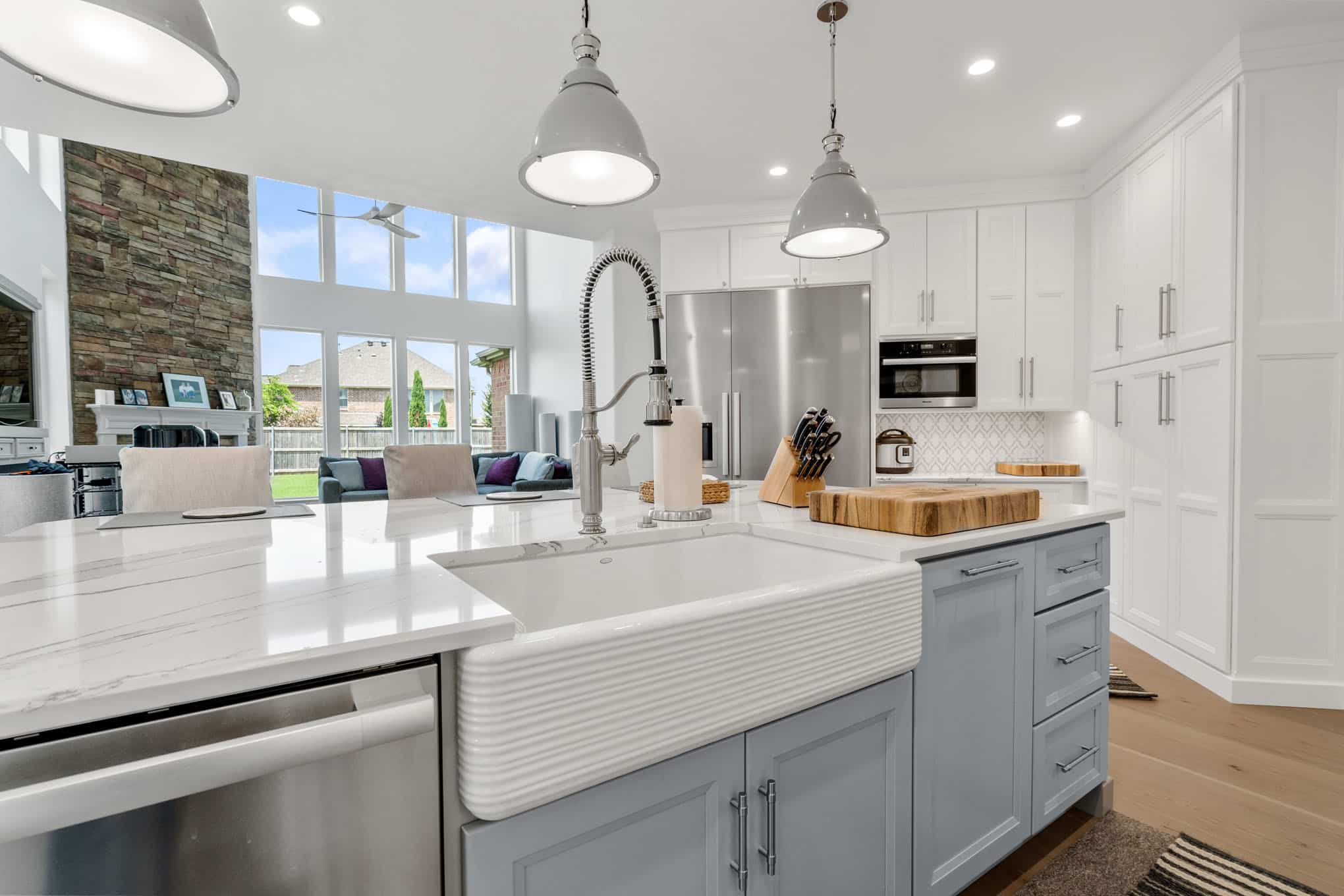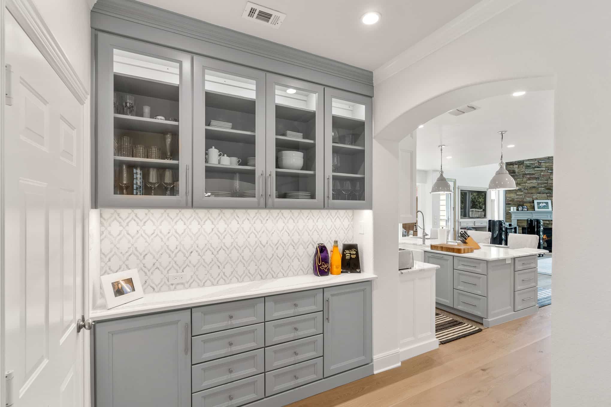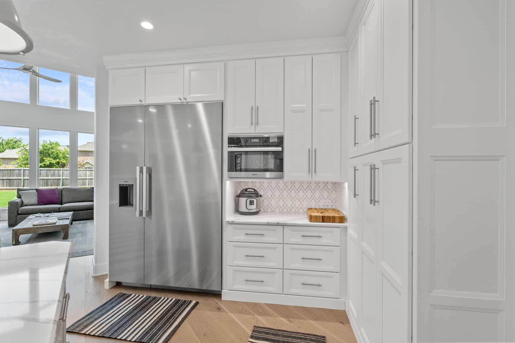 This extraordinary kitchen renovation in Prosper exemplifies the meticulous craftsmanship and innovative design thinking that has established Elite Remodeling as North Texas’ premier kitchen design authority. The space masterfully balances visual lightness with impressive functionality through its sophisticated two-tone cabinetry scheme—pristine white perimeter cabinets paired with a soft dove gray island and built-in butler’s pantry that add architectural interest without overwhelming the airy atmosphere.