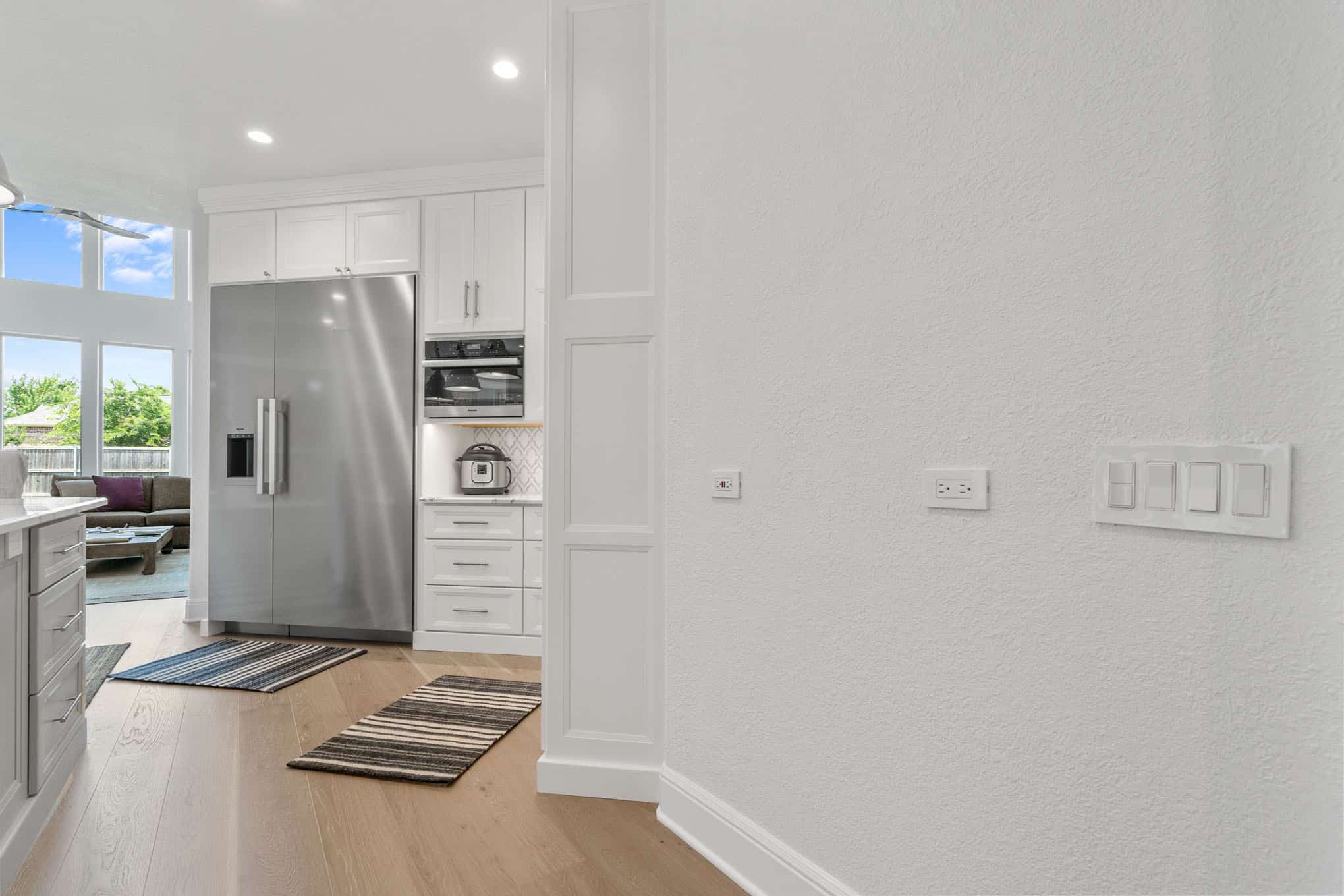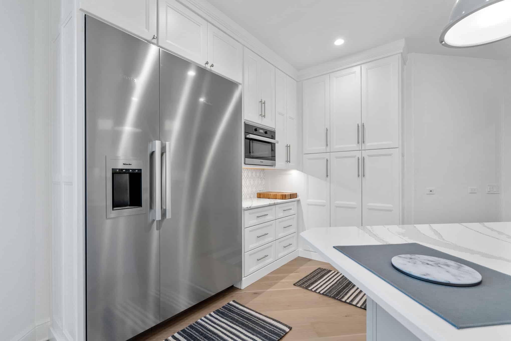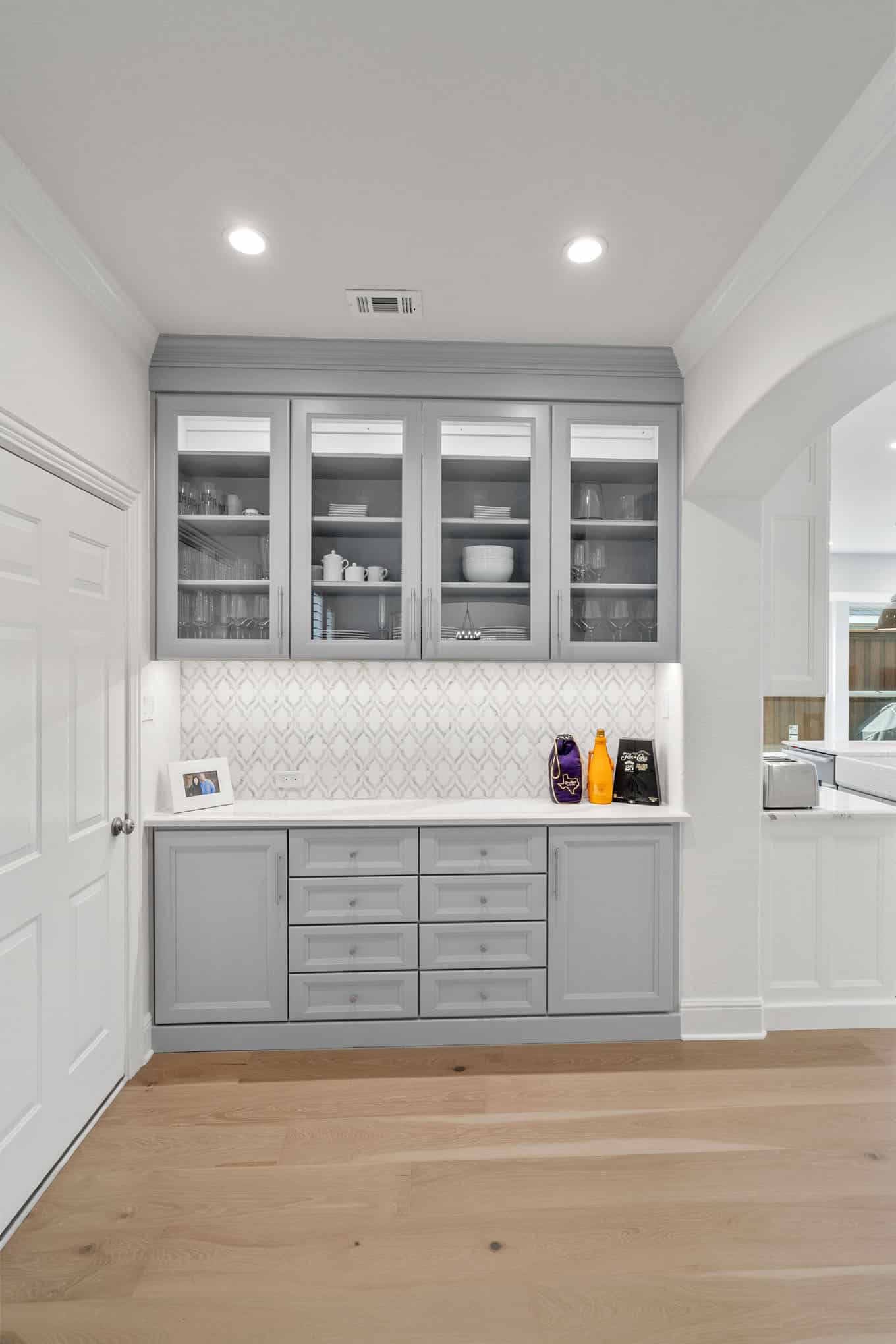 Floor-to-ceiling storage solutions, including the dedicated butler’s pantry with glass-front display cabinetry, demonstrate Elite’s expertise in marrying aesthetics with functionality—a hallmark of their award-winning design approach. The European white oak engineered flooring with its wide-plank format introduces natural warmth that contrasts beautifully with the space’s precise geometry, while offering the durability required in the active Texas lifestyle. This transformation thoughtfully supports both everyday family living and the gracious entertaining that characterizes contemporary North Texas hospitality, creating a statement kitchen that will remain timelessly relevant for decades to come.