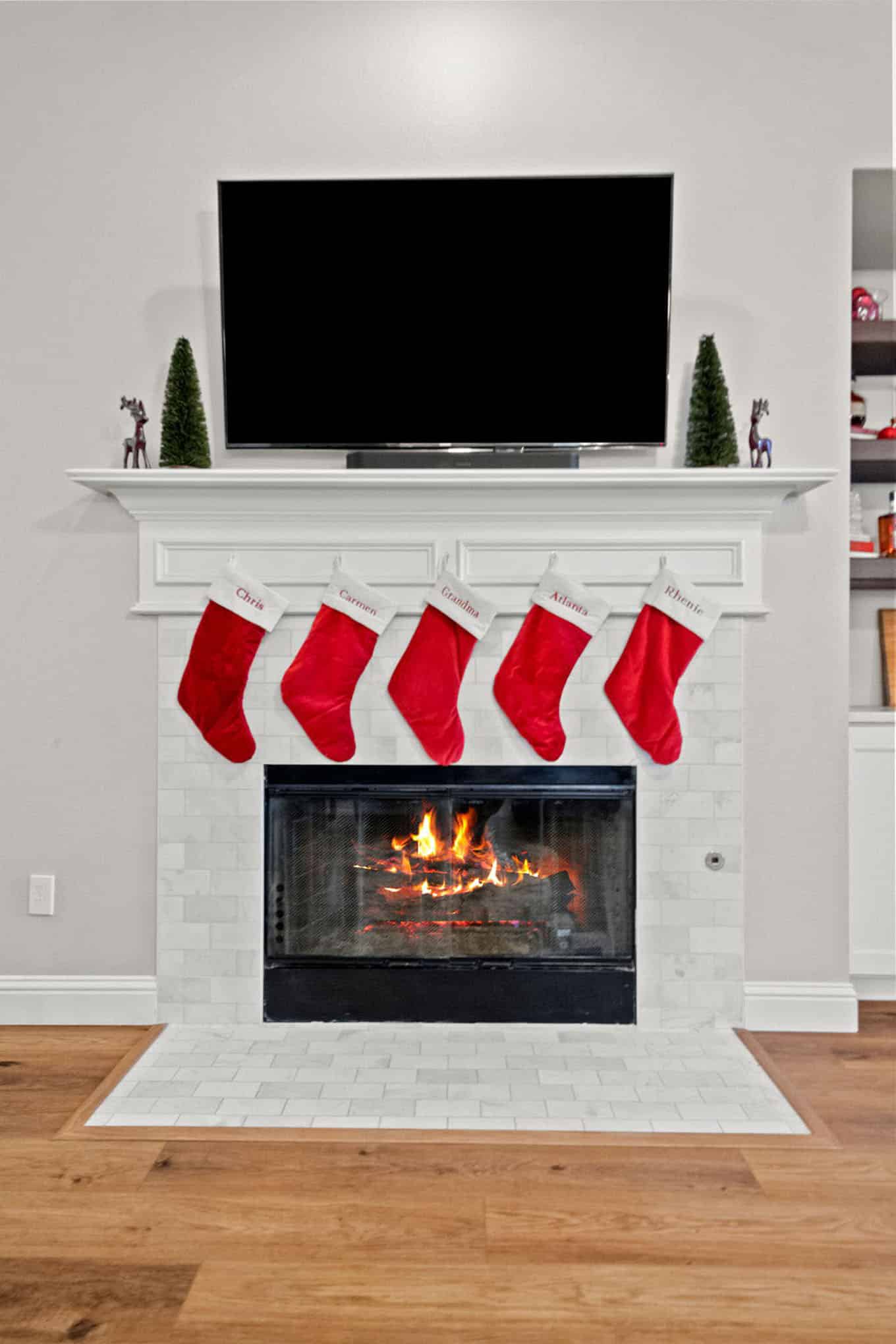 In this sophisticated dual renovation, we’ve reimagined both the heart of the home and its literal hearth with a cohesive design language that speaks to refined modern living. The stunning fireplace transformation anchors the living space with pristine white marble subway tile surround and a custom-built mantel that elegantly houses the entertainment center while providing seasonal display opportunities. The crisp architectural detailing maintains the home’s classic character while introducing contemporary functionality—evidenced by the personalized Christmas stockings that transform this feature into a festive focal point during the holidays.