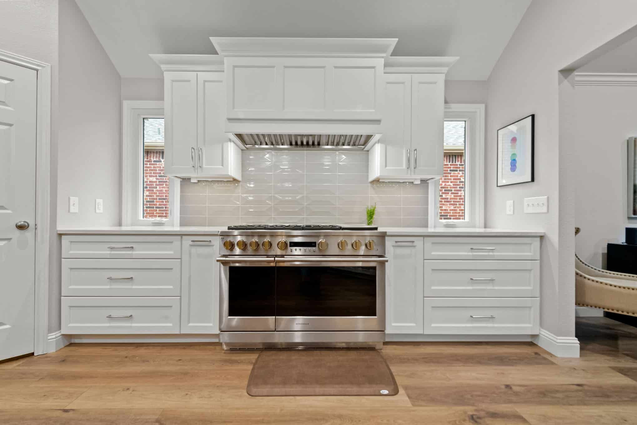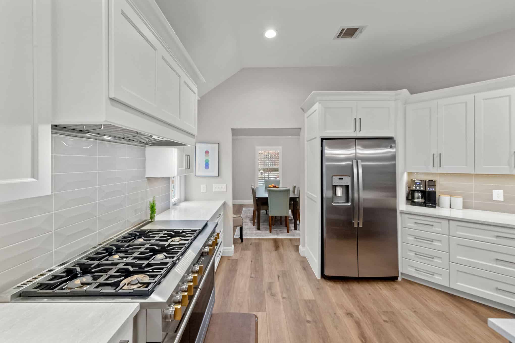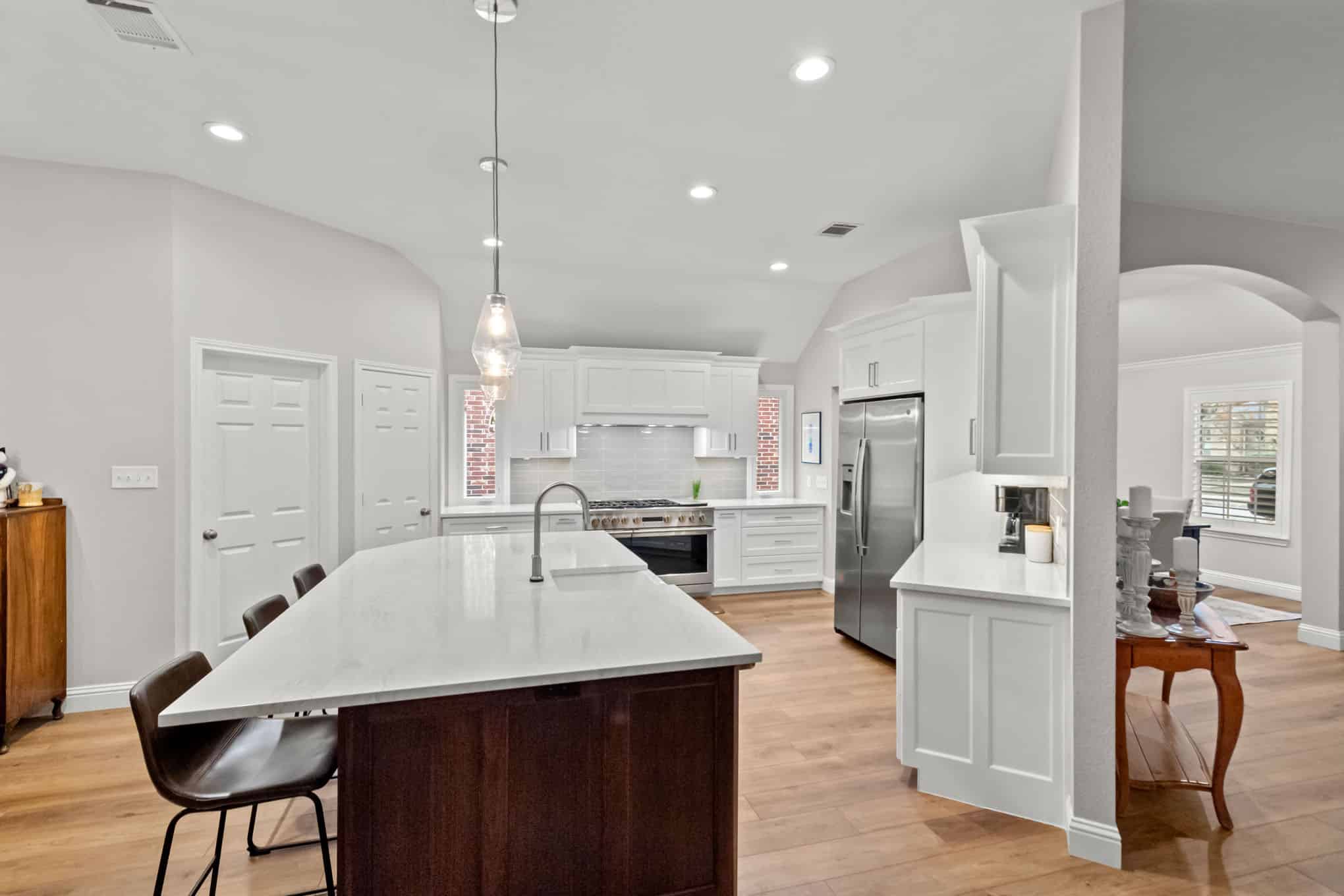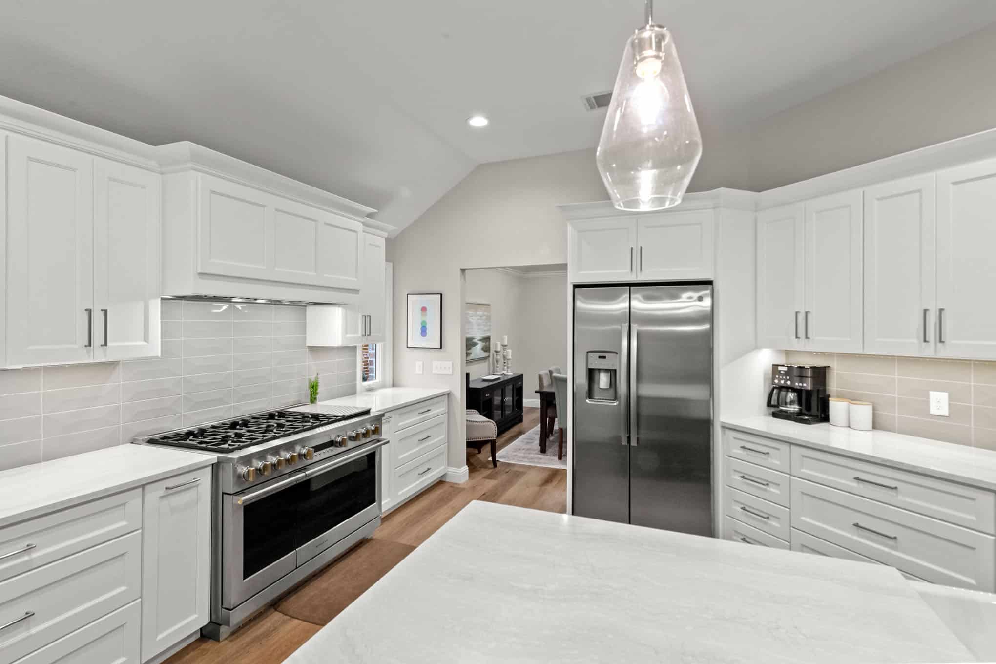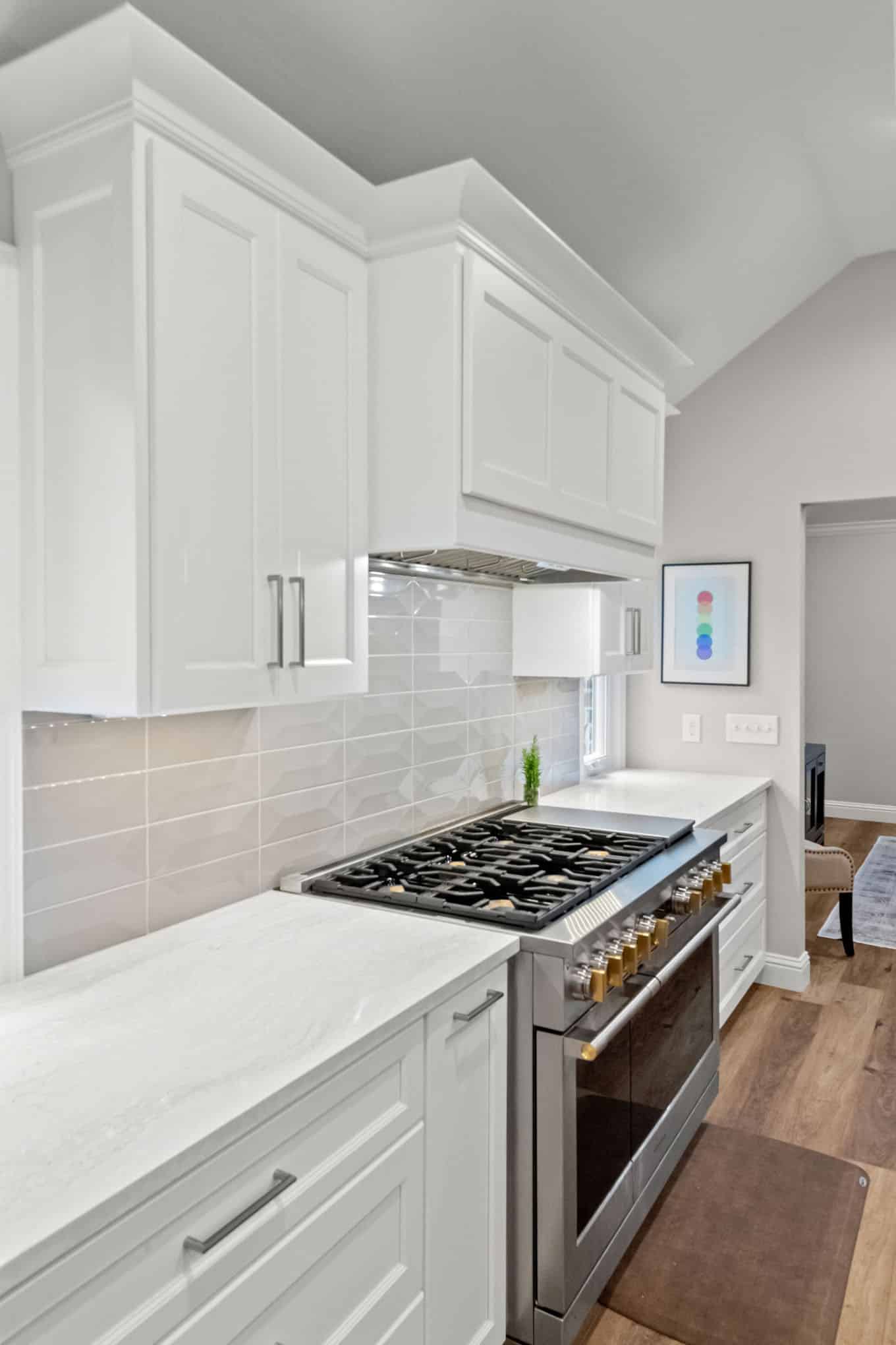 The kitchen renovation showcases our commitment to both aesthetics and culinary excellence through its thoughtful orchestration of form and function. Soaring vaulted ceilings are complemented by floor-to-ceiling custom cabinetry in luminous white, creating an expansive, airy atmosphere. The professional-grade stainless steel appliances, including a commercial-style range with brass accents, serve as both functional workhorses and design statements. Tranquil gray rectangular tile backsplash provides subtle texture while maintaining the kitchen’s serene palette, and sophisticated pendant lighting introduces gentle ambient illumination over the substantial island, which is crowned with lustrous white quartz countertops.