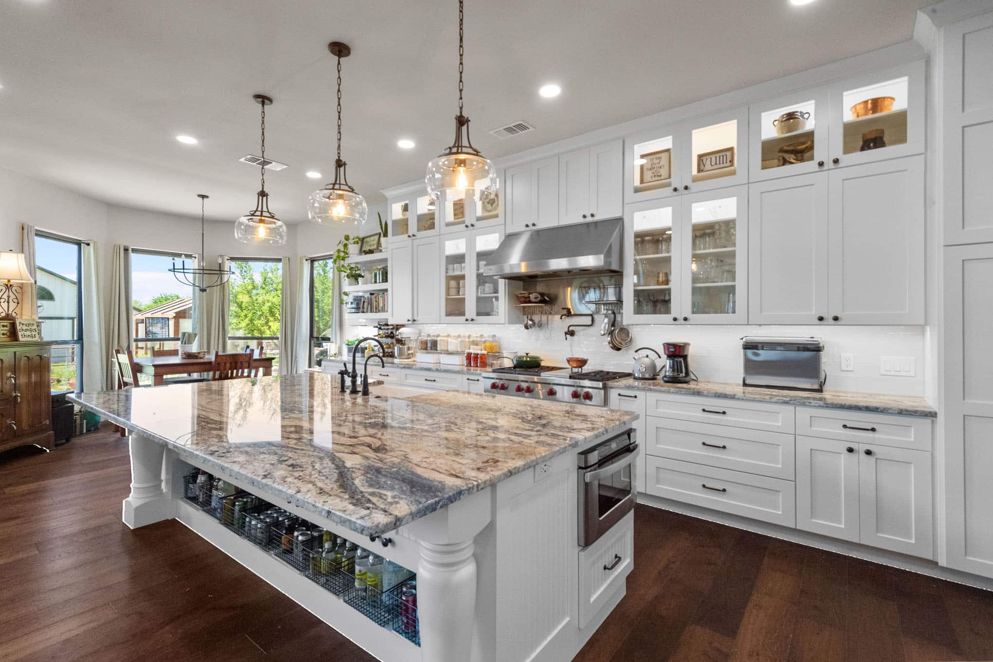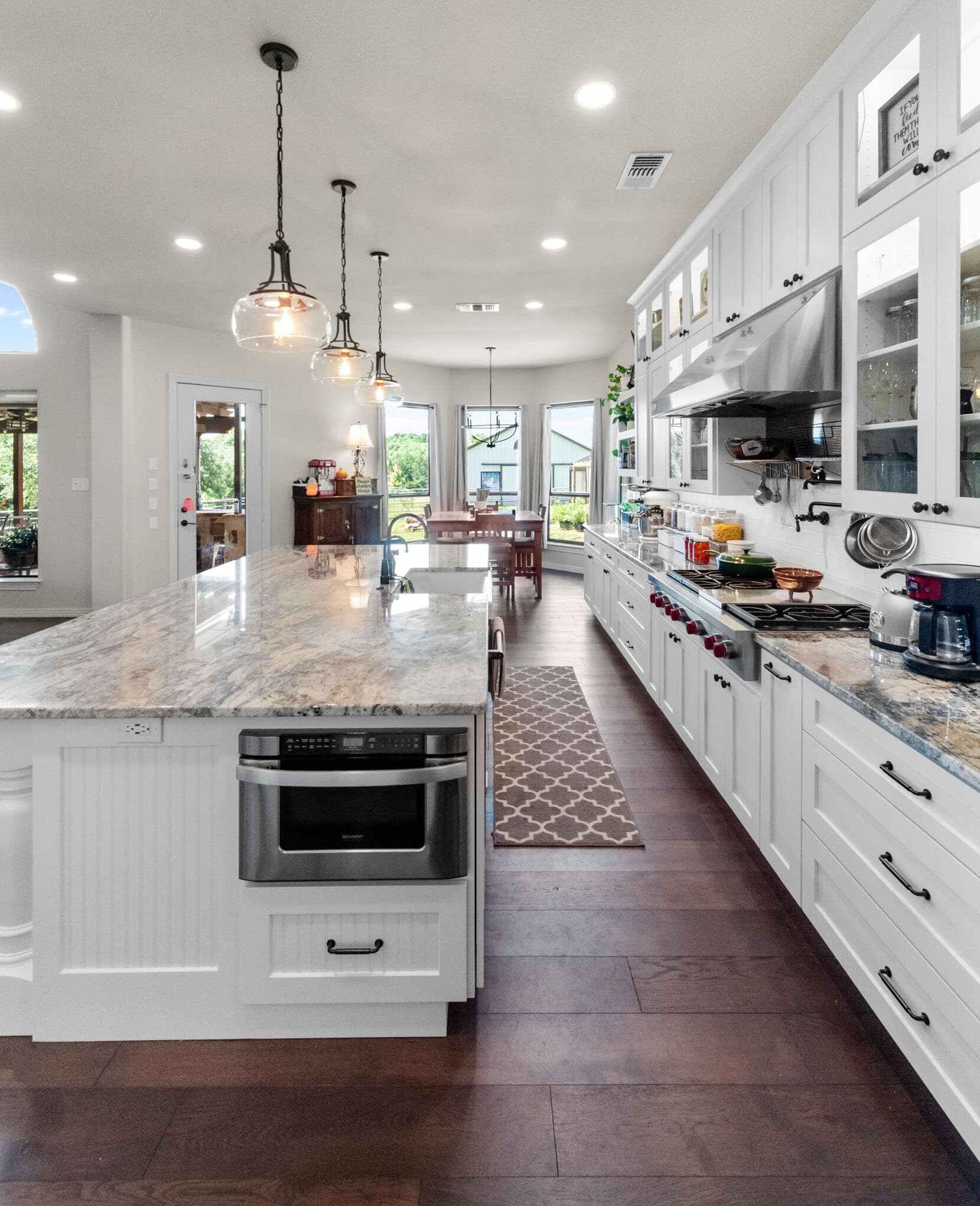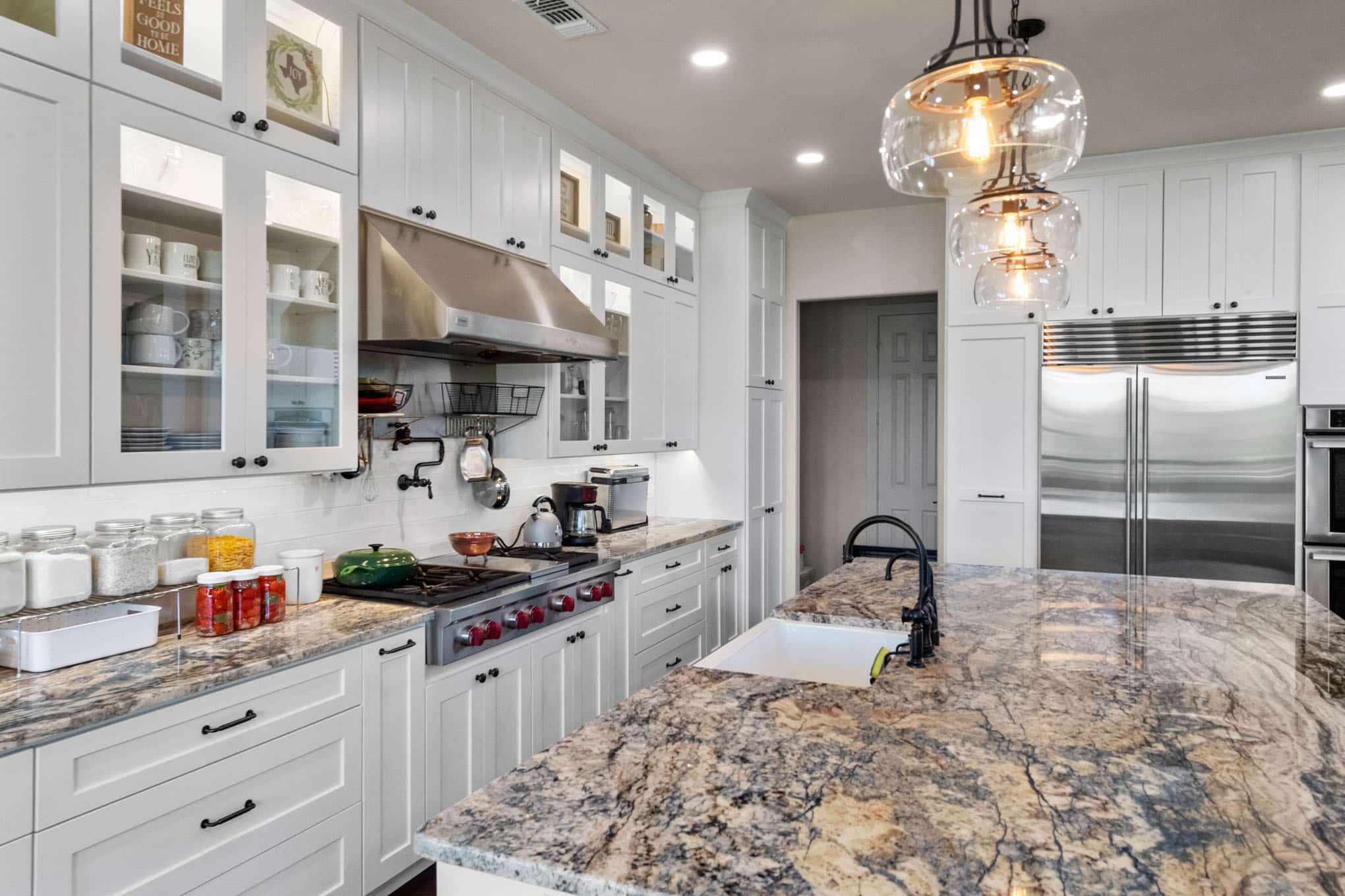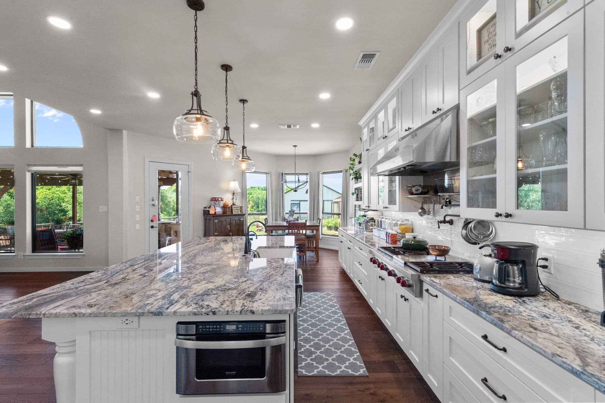 This breathtaking kitchen renovation masterfully balances grand scale with intimate functionality, creating a true culinary sanctuary that embodies the generous entertaining spirit characteristic of North Texas homes. Crisp white Shaker cabinetry extends to the ceiling, maximizing storage while providing a timeless backdrop for the dramatic veined granite countertops that serve as the space’s artistic centerpiece. These sweeping natural stone surfaces—sourced through Elite Remodeling’s extensive material partnerships—display a mesmerizing interplay of cream, taupe, and deep gray veining that adds organic movement to the pristine environment.