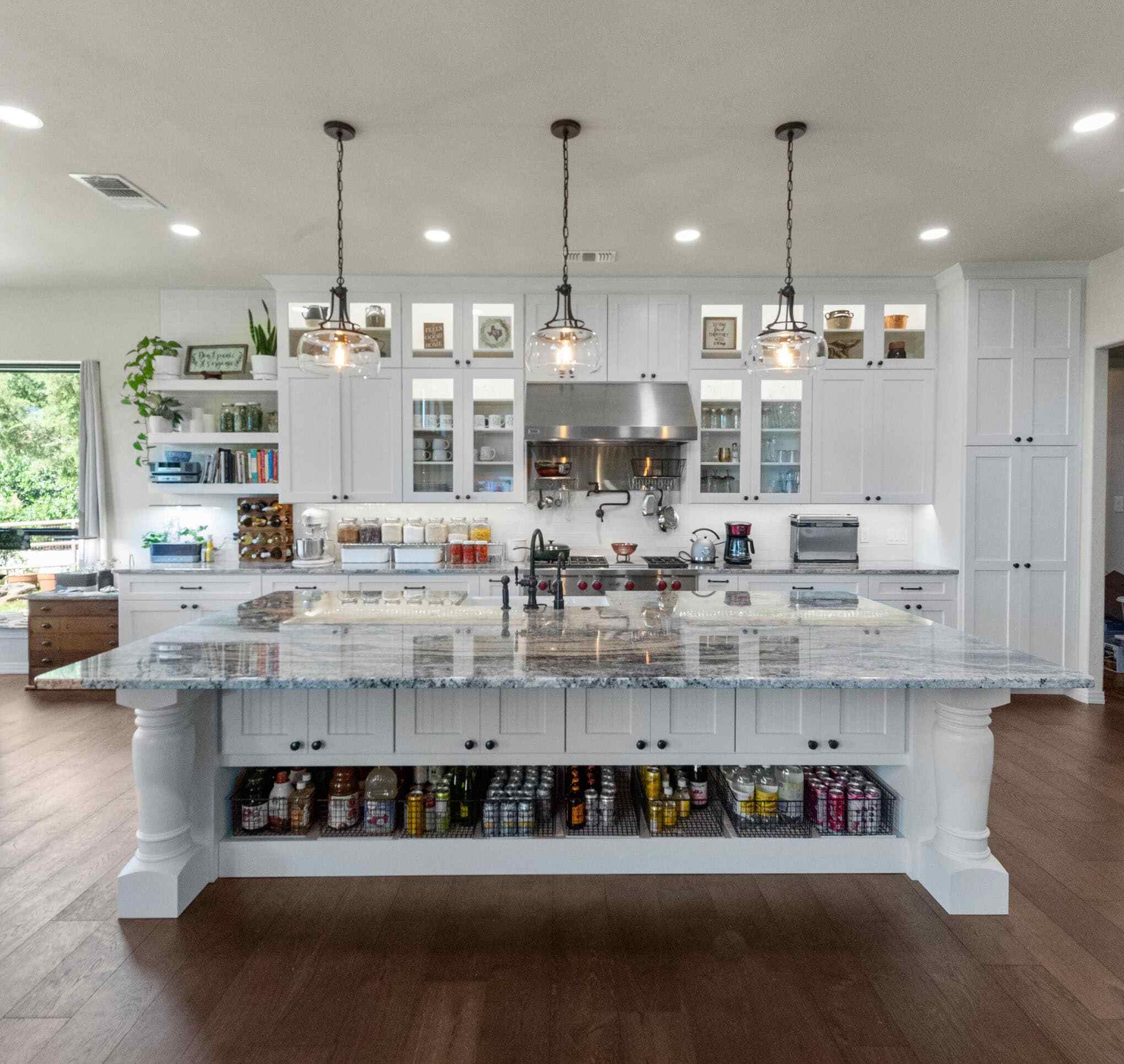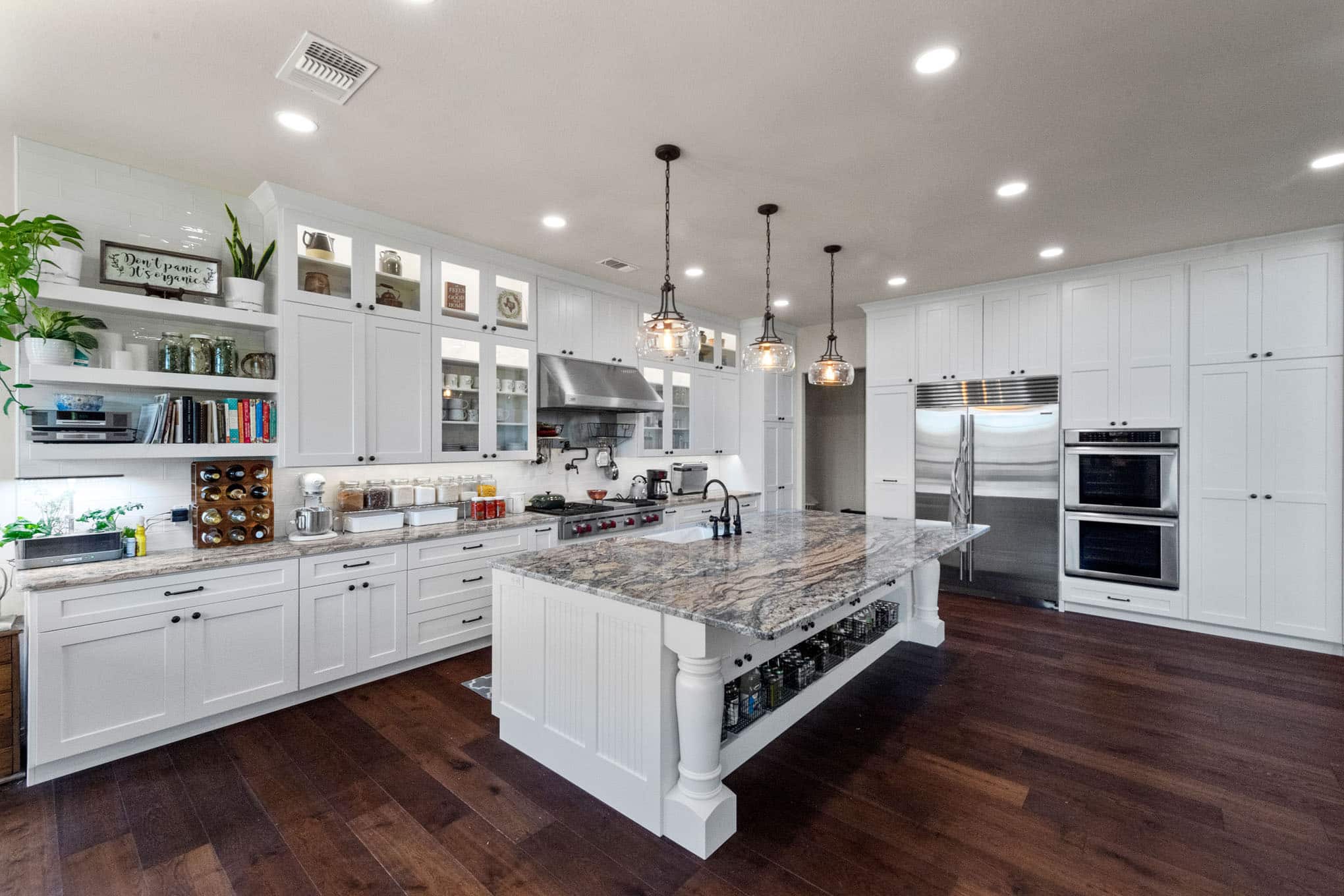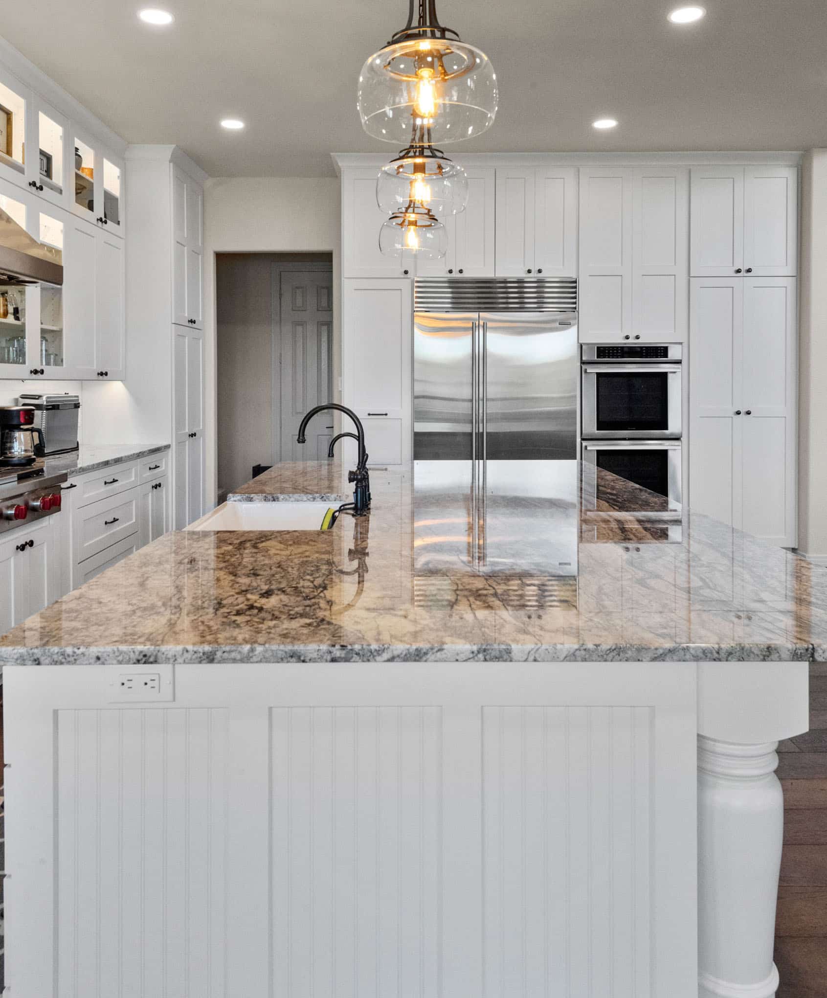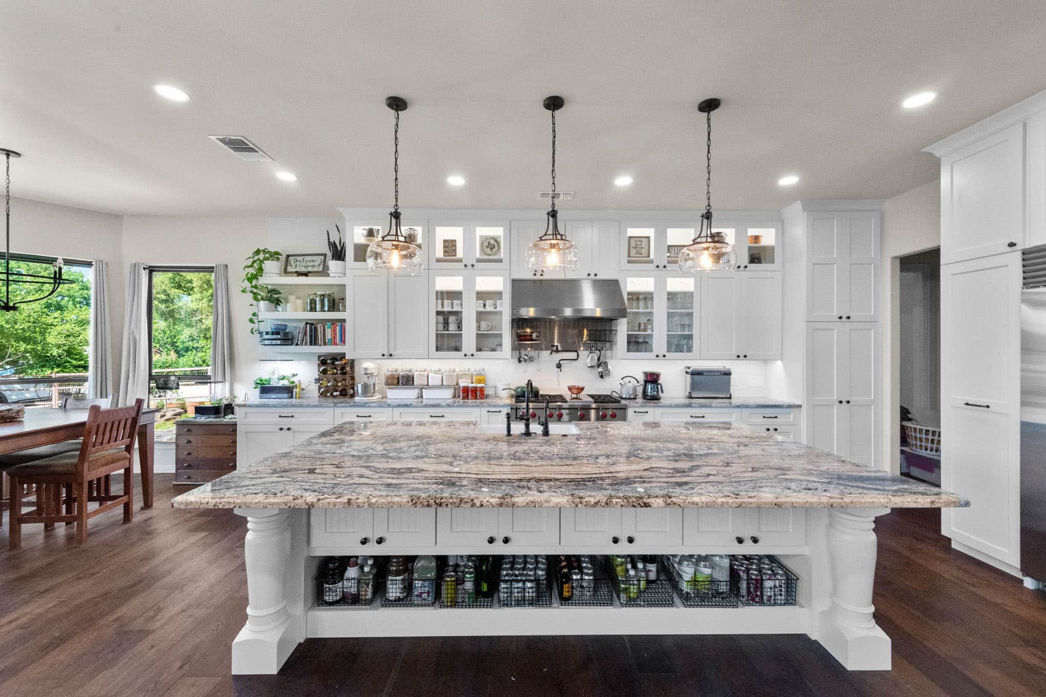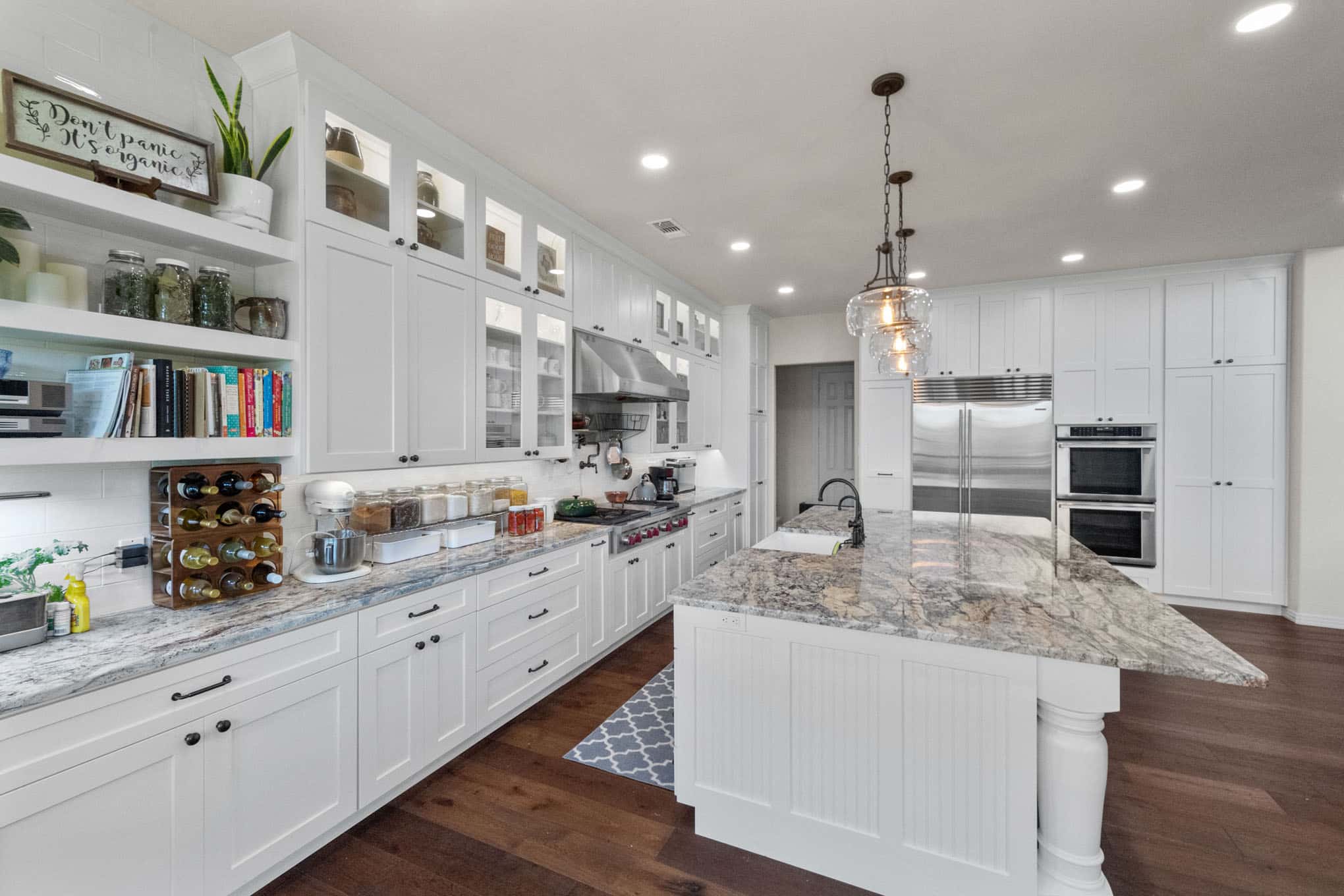 This breathtaking kitchen renovation masterfully balances grand scale with intimate functionality, creating a true culinary sanctuary that embodies the generous entertaining spirit characteristic of North Texas homes. Crisp white Shaker cabinetry extends to the ceiling, maximizing storage while providing a timeless backdrop for the dramatic veined granite countertops that serve as the space’s artistic centerpiece. These sweeping natural stone surfaces—sourced through Elite Remodeling’s extensive material partnerships—display a mesmerizing interplay of cream, taupe, and deep gray veining that adds organic movement to the pristine environment.