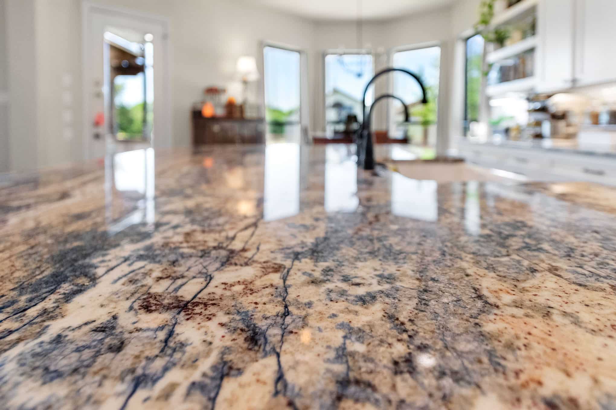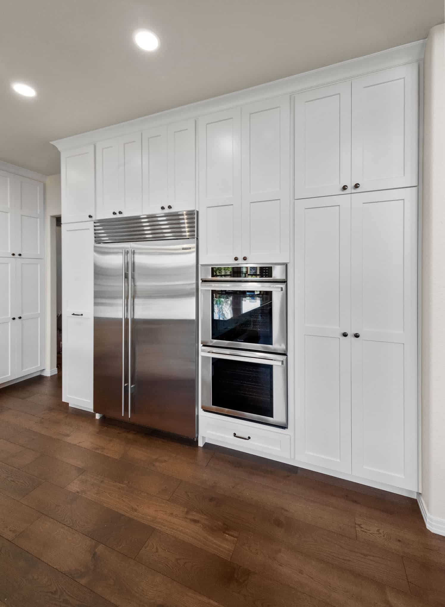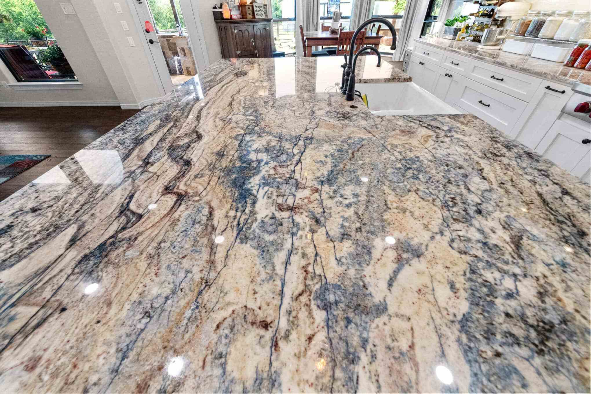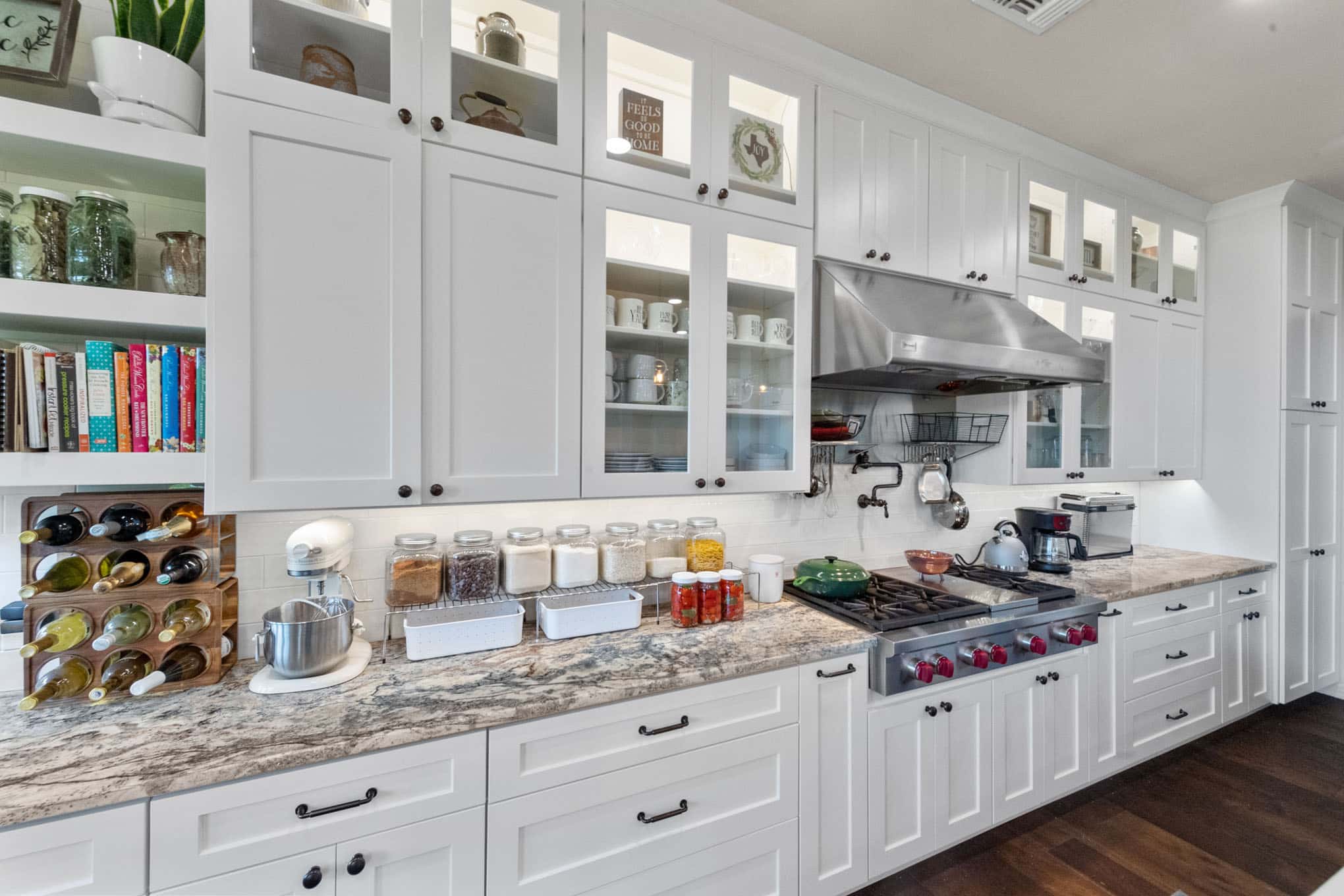 This breathtaking kitchen renovation masterfully balances grand scale with intimate functionality, creating a true culinary sanctuary that embodies the generous entertaining spirit characteristic of North Texas homes. Crisp white Shaker cabinetry extends to the ceiling, maximizing storage while providing a timeless backdrop for the dramatic veined granite countertops that serve as the space’s artistic centerpiece. These sweeping natural stone surfaces—sourced through Elite Remodeling’s extensive material partnerships—display a mesmerizing interplay of cream, taupe, and deep gray veining that adds organic movement to the pristine environment.