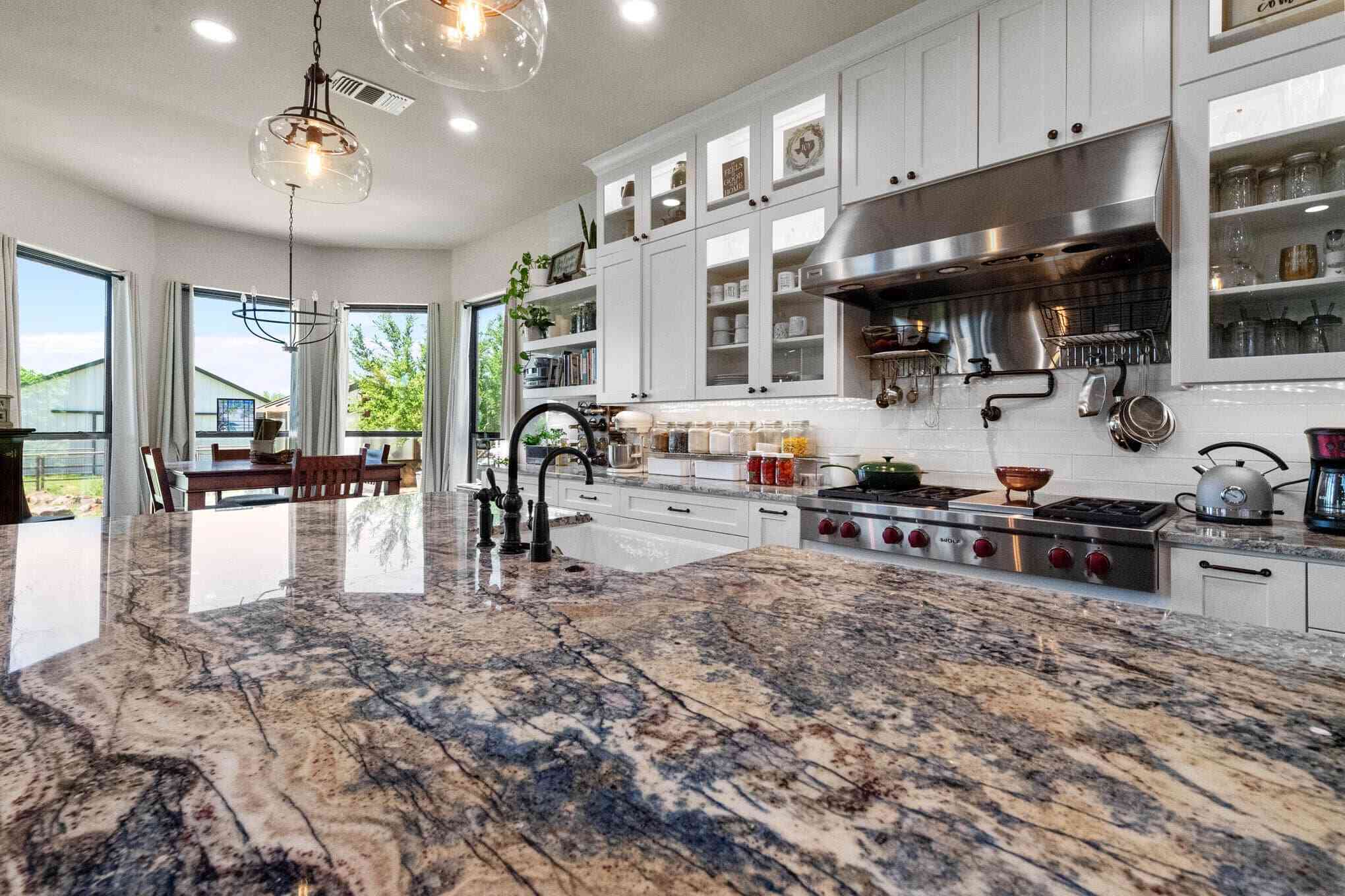 The trio of glass pendant fixtures introduces a modern artisanal element, casting a warm ambient glow that beautifully balances the abundant natural light streaming through expansive windows framing views of the property’s mature Texas landscape. The transformation honors the indoor-outdoor lifestyle that makes Dallas-Fort Worth living so distinctive, creating a kitchen that elevates everyday experiences through its thoughtful blend of professional functionality and the gracious hospitality for which Texas homes are renowned.