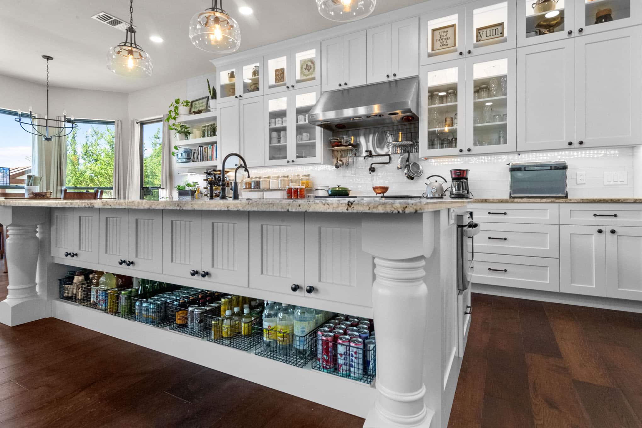 The professional-caliber commercial range with distinctive red knobs anchors the cooking zone, accommodating everything from weeknight family meals to legendary Texas-sized holiday gatherings. The restaurant-inspired stainless ventilation hood and thoughtfully positioned pot-filler reflect the growing sophistication of Frisco’s culinary scene. Open glass-fronted upper cabinets beautifully showcase curated collections, while ingenious storage solutions abound, including the innovative mesh basket system beneath the substantial island that elegantly organizes beverages and pantry essentials—perfect for keeping entertaining supplies at hand for impromptu neighborhood get-togethers.