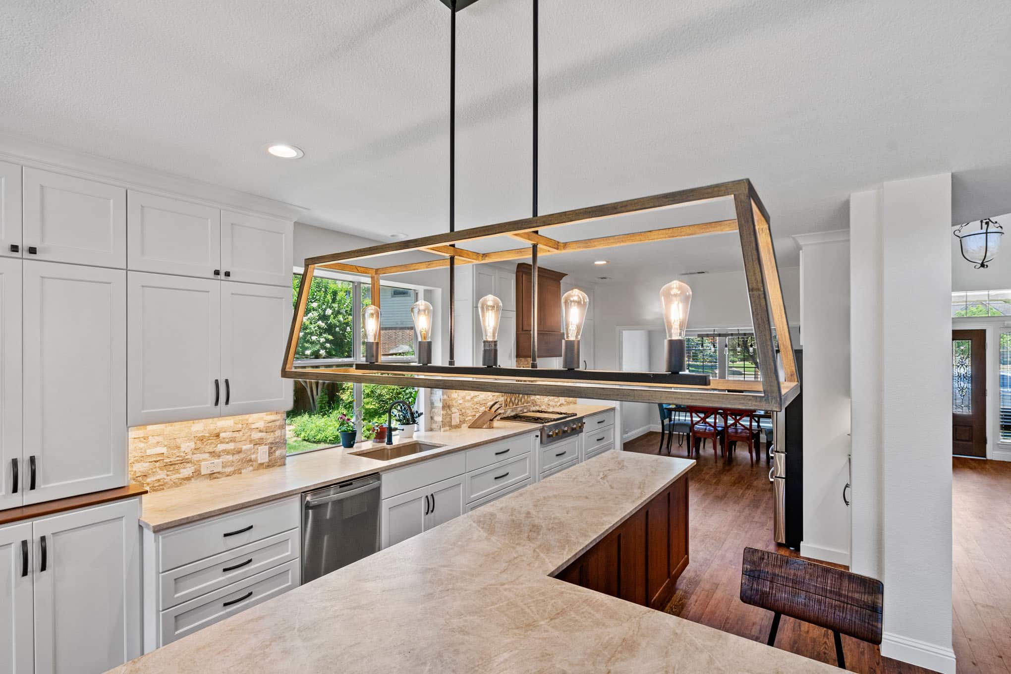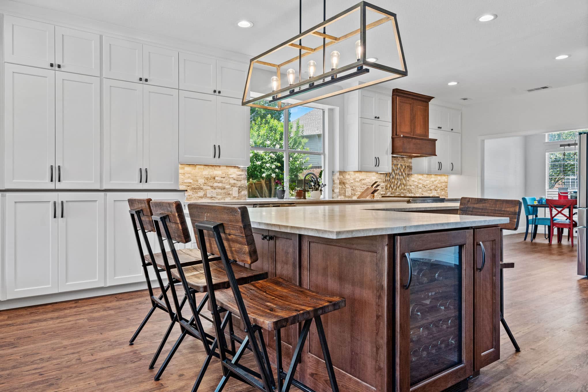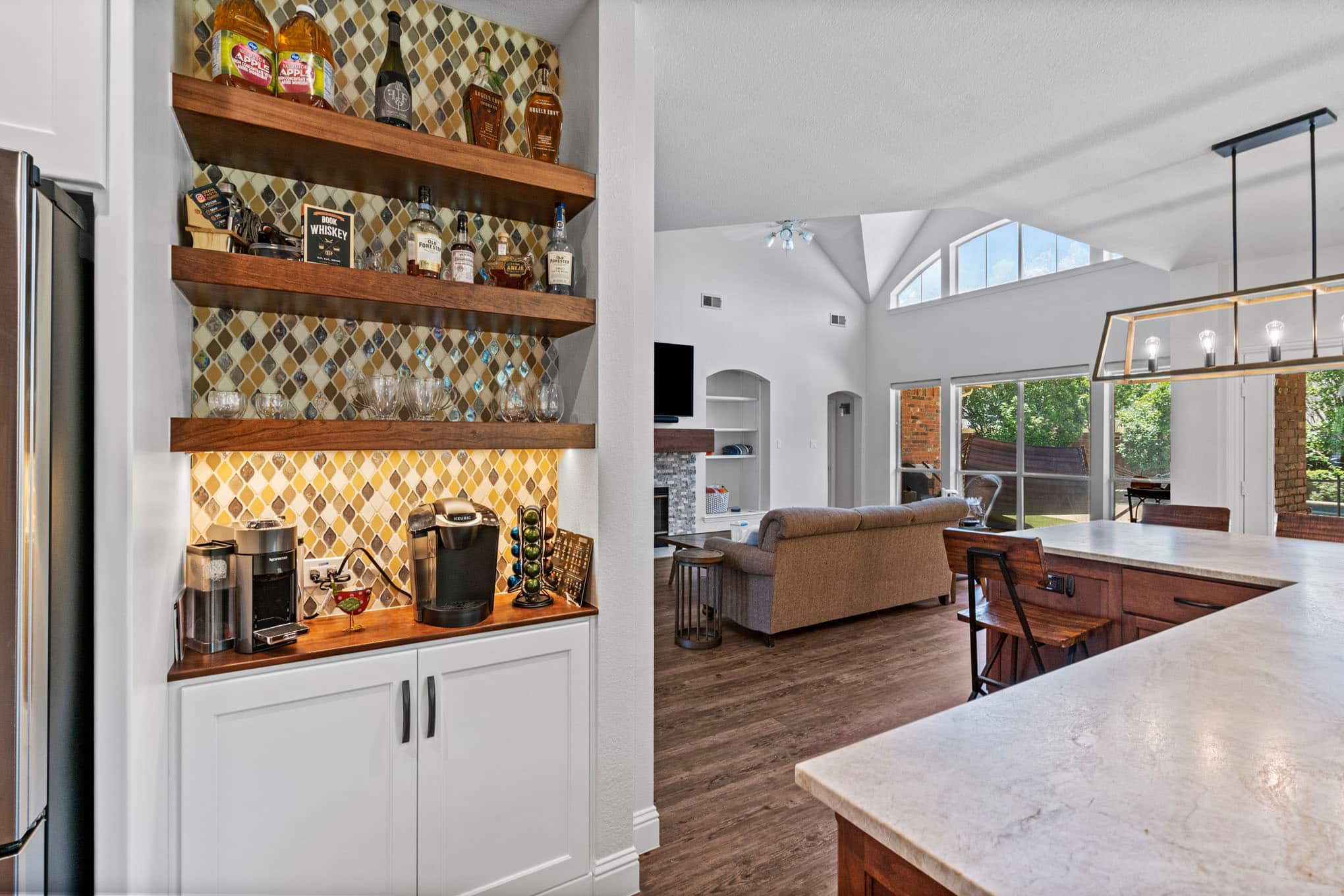The showstopping custom beverage center, complete with diamond-pattern mosaic tile backdrop and illuminated floating shelves, creates a dedicated entertaining zone that reflects the vibrant social culture of DFW communities. Natural stone elements—showcased in the split-face travertine backsplash with its subtle honey and cream tones—introduce tactile dimension while referencing the organic materiality celebrated throughout Texas design. The architectural lighting scheme, anchored by the statement geometric pendant with its mixed-metal detailing, demonstrates the layered lighting approach essential for both practical function and atmospheric ambiance.