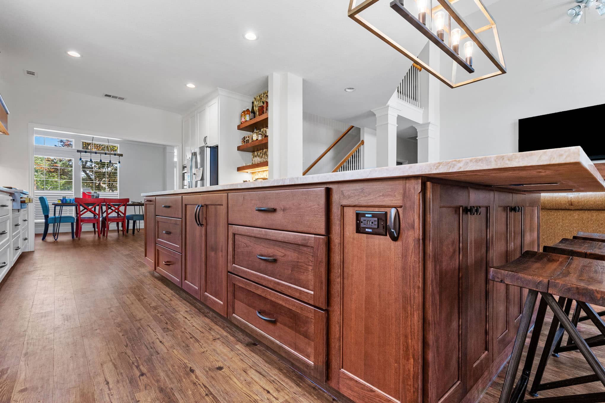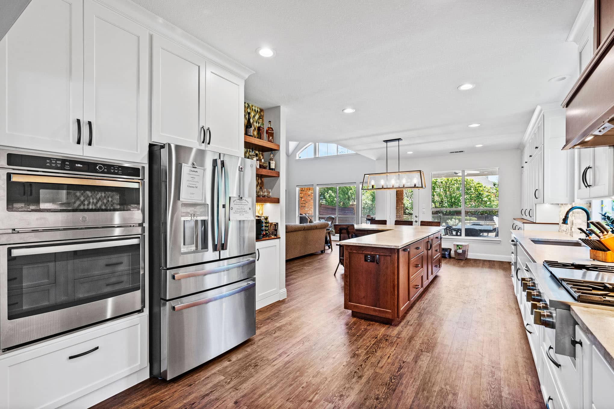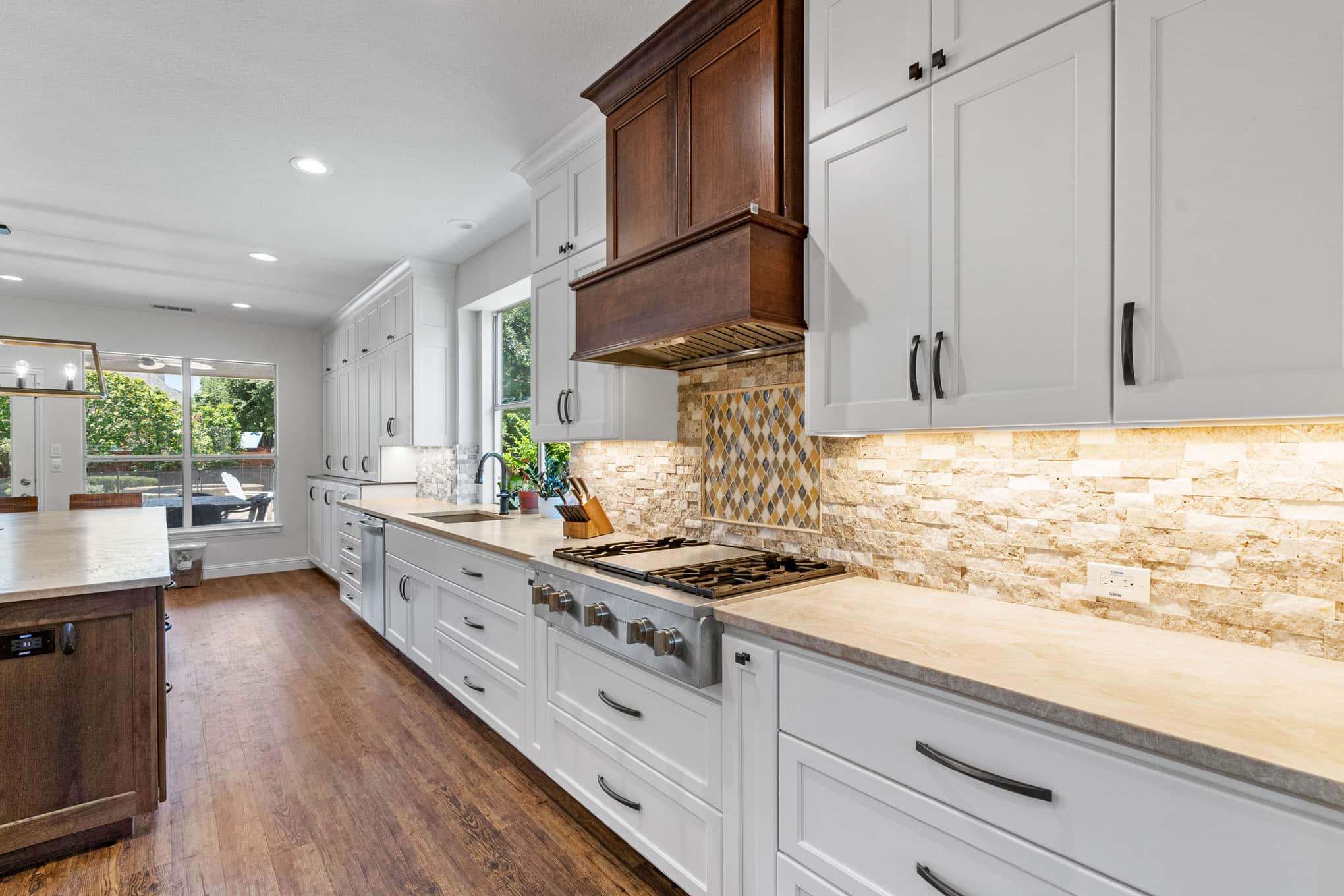 The showstopping custom beverage center, complete with diamond-pattern mosaic tile backdrop and illuminated floating shelves, creates a dedicated entertaining zone that reflects the vibrant social culture of DFW communities. Natural stone elements—showcased in the split-face travertine backsplash with its subtle honey and cream tones—introduce tactile dimension while referencing the organic materiality celebrated throughout Texas design. The architectural lighting scheme, anchored by the statement geometric pendant with its mixed-metal detailing, demonstrates the layered lighting approach essential for both practical function and atmospheric ambiance.
