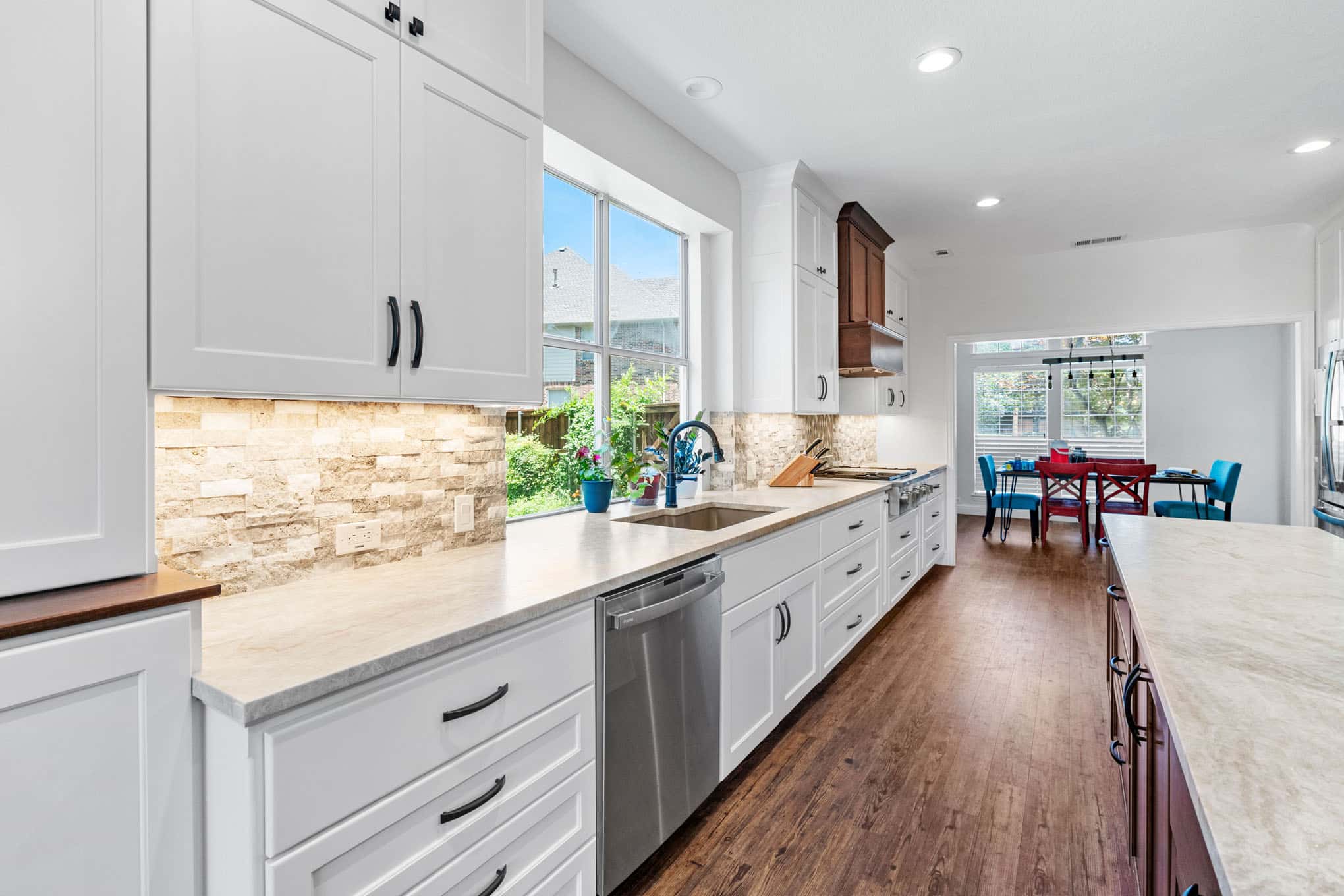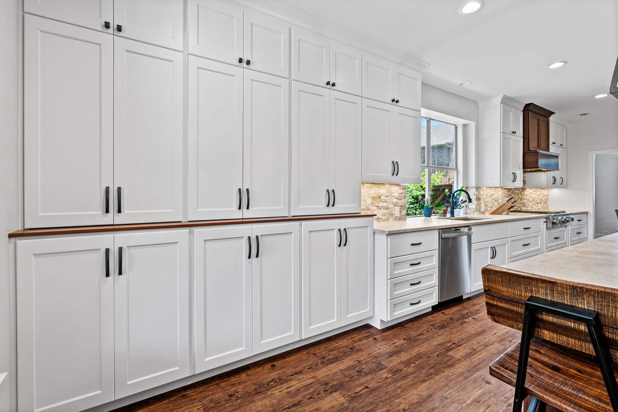 This stunning kitchen transformation effortlessly bridges sophisticated urban design with warm Texas Hill Country aesthetics, creating an entertainer’s paradise perfectly suited for today’s discerning North Texas homeowner. The thoughtfully conceived two-tone cabinet scheme—crisp white perimeter cabinetry juxtaposed against a rich walnut island—establishes visual depth while paying homage to traditional craftsmanship through its Shaker profiles and custom carpentry details. The impressive floor-to-ceiling storage wall, a hallmark of Elite Remodeling’s commitment to functional luxury, provides unparalleled organization while maintaining the clean architectural lines that define contemporary Carrollton homes.