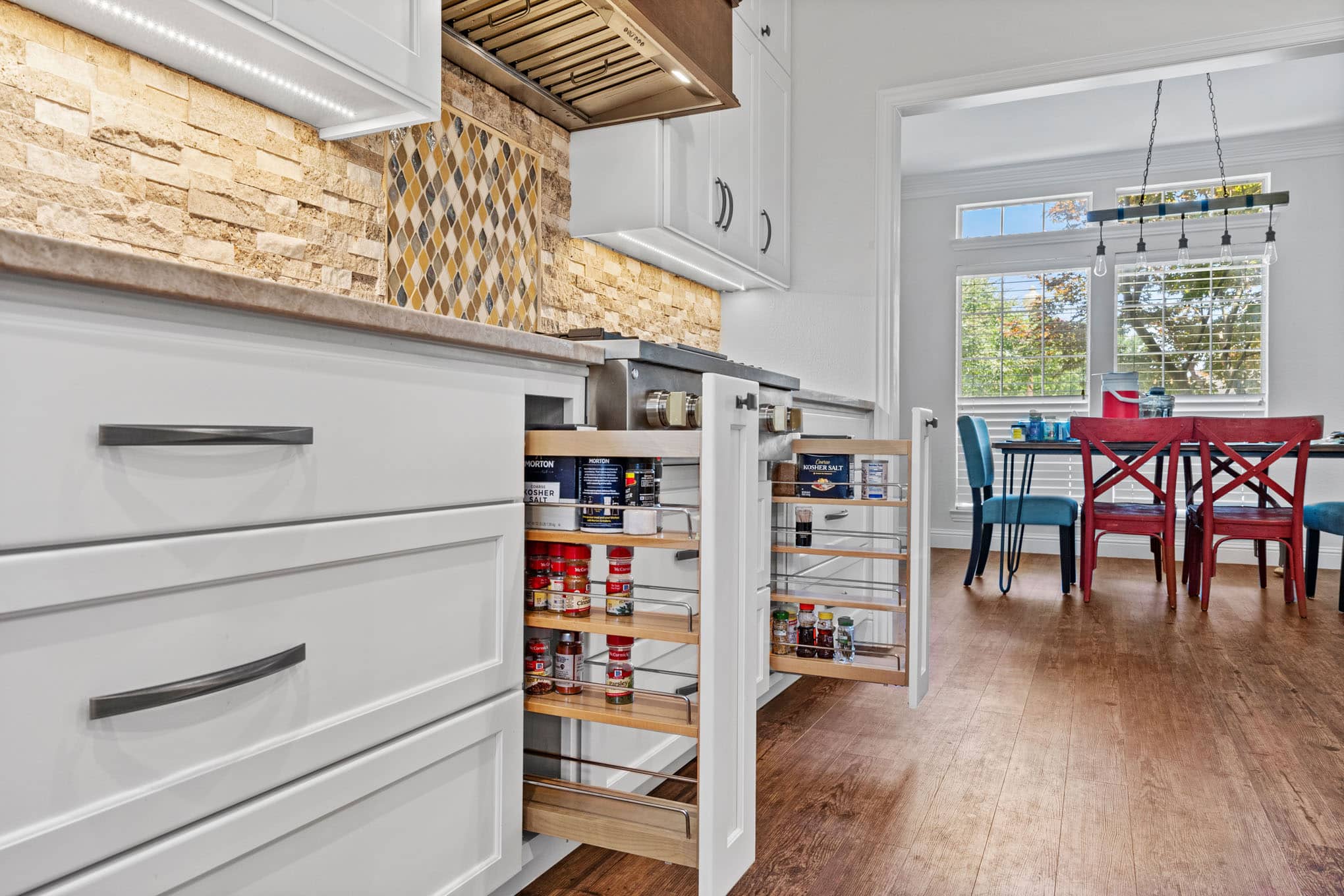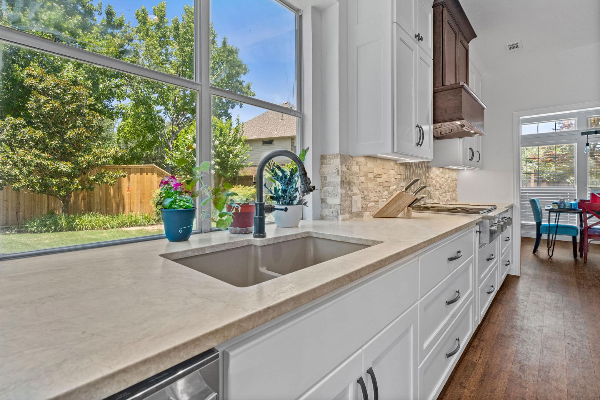 Thoughtful details elevate the space beyond the ordinary: concealed pull-out spice cabinets flanking the professional-grade range, furniture-grade island with integrated climate-controlled wine storage, and the seamless indoor-outdoor connection through generous windows framing meticulously maintained Texas landscaping. This renovation exemplifies how intelligent design can honor regional aesthetics while embracing modern functionality—a philosophy that continues to distinguish Elite Remodeling’s award-winning work throughout the North Dallas corridor.