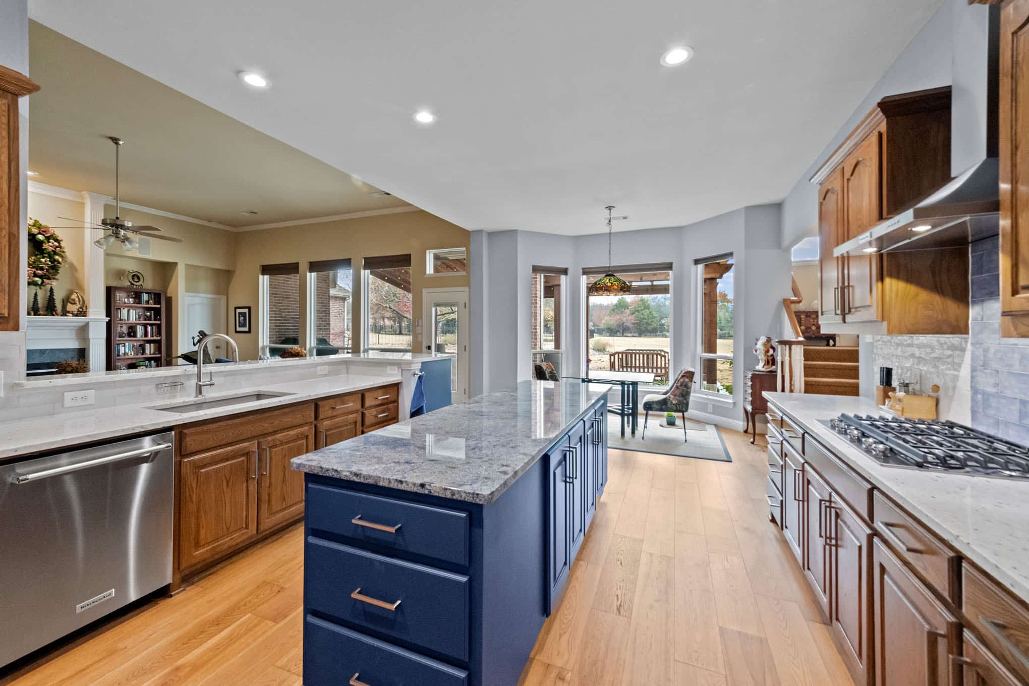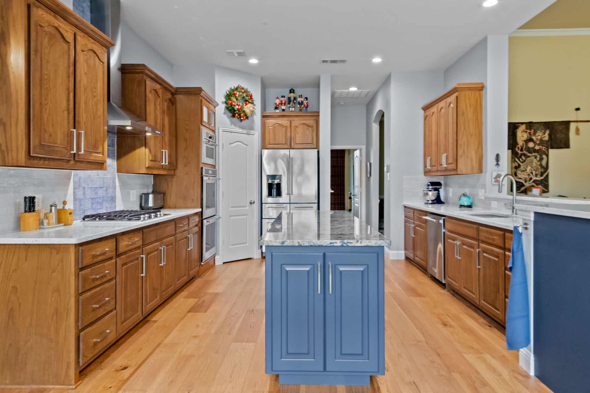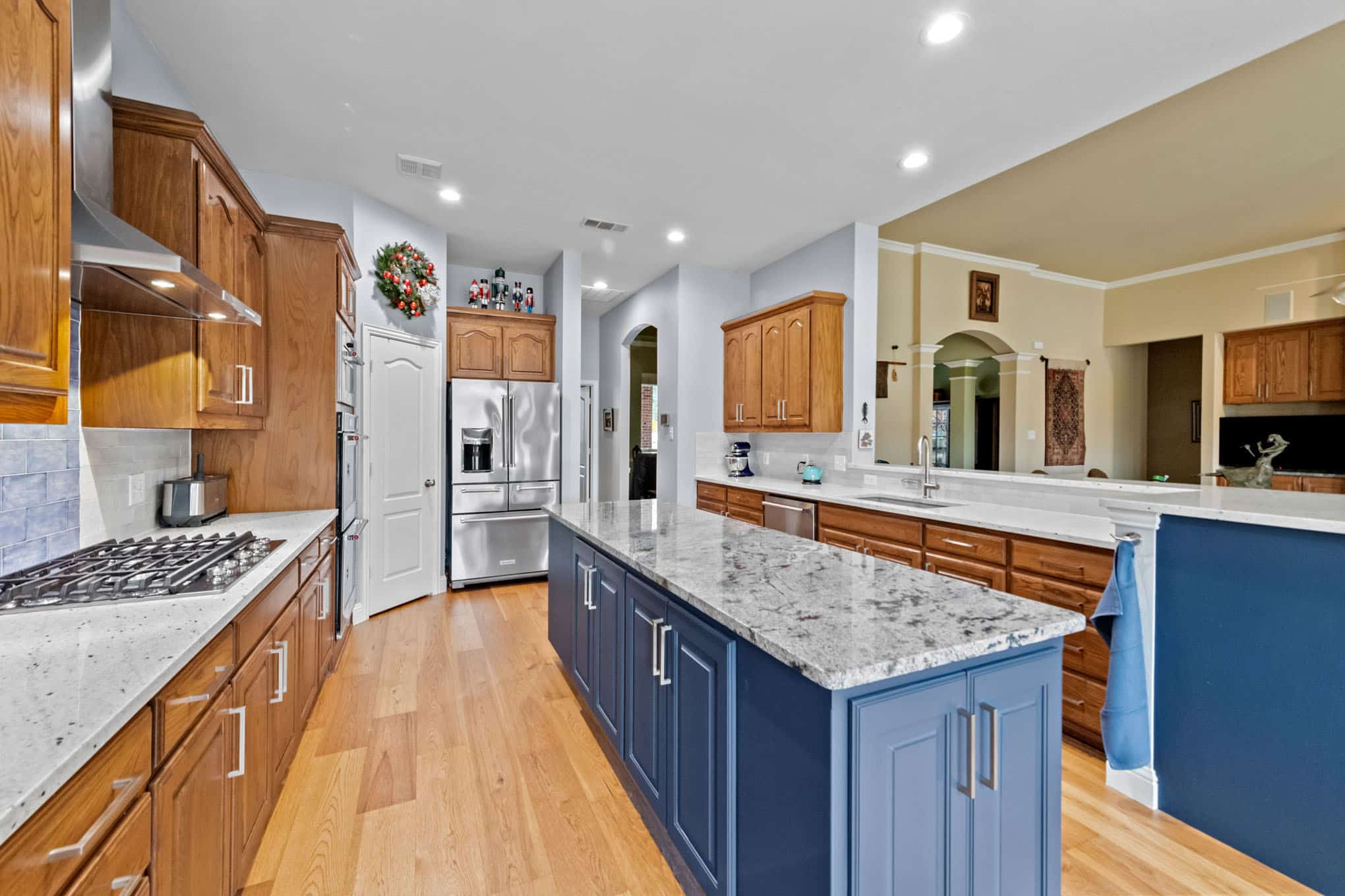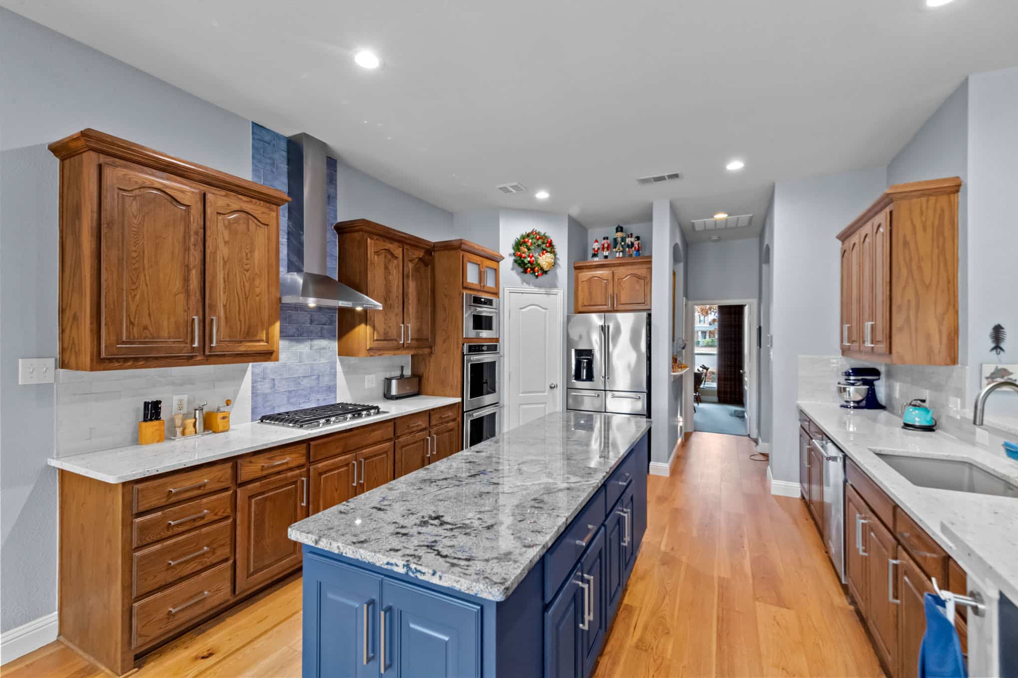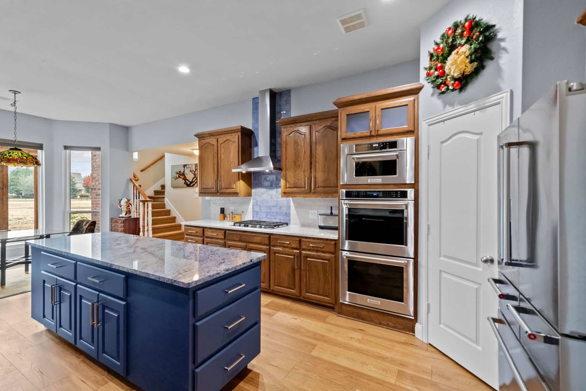 In this elegant Parker residence, Elite Remodeling has orchestrated a masterful transformation that honors traditional warmth while introducing sophisticated contemporary elements. The renovation artfully balances rich, natural wood cabinetry with striking navy blue island accents, creating a kitchen and bathroom retreat that embodies refined Texas living at its finest.