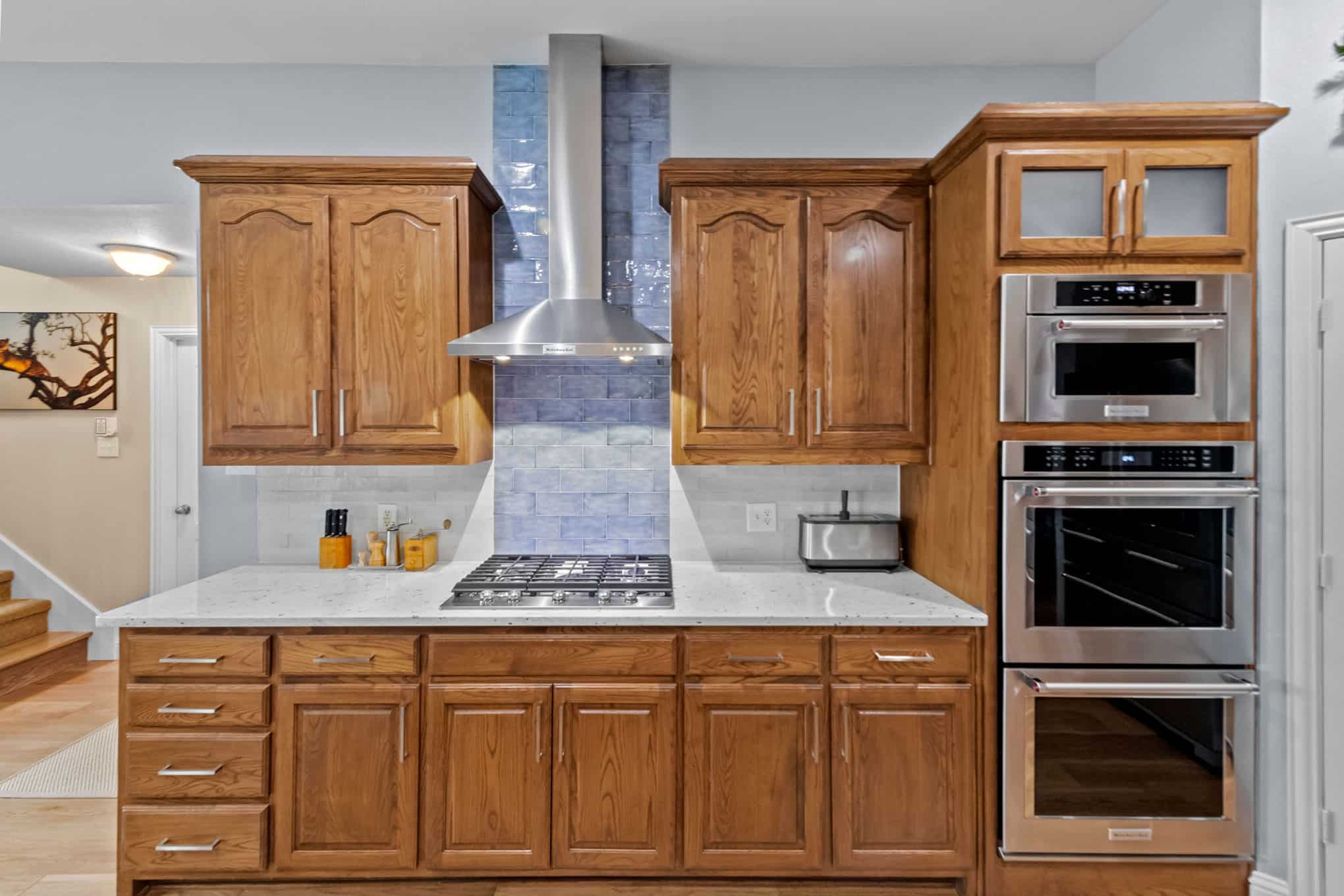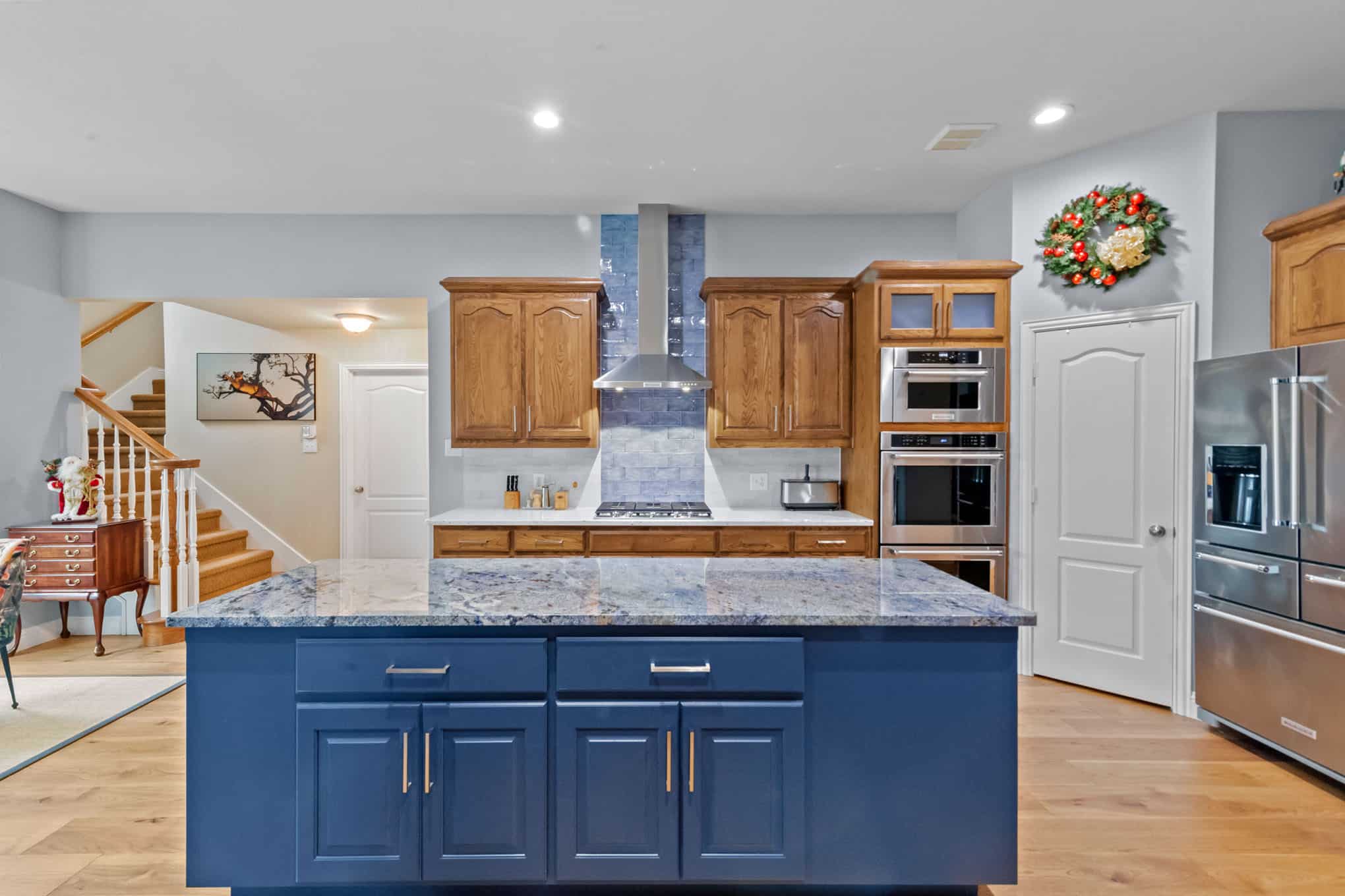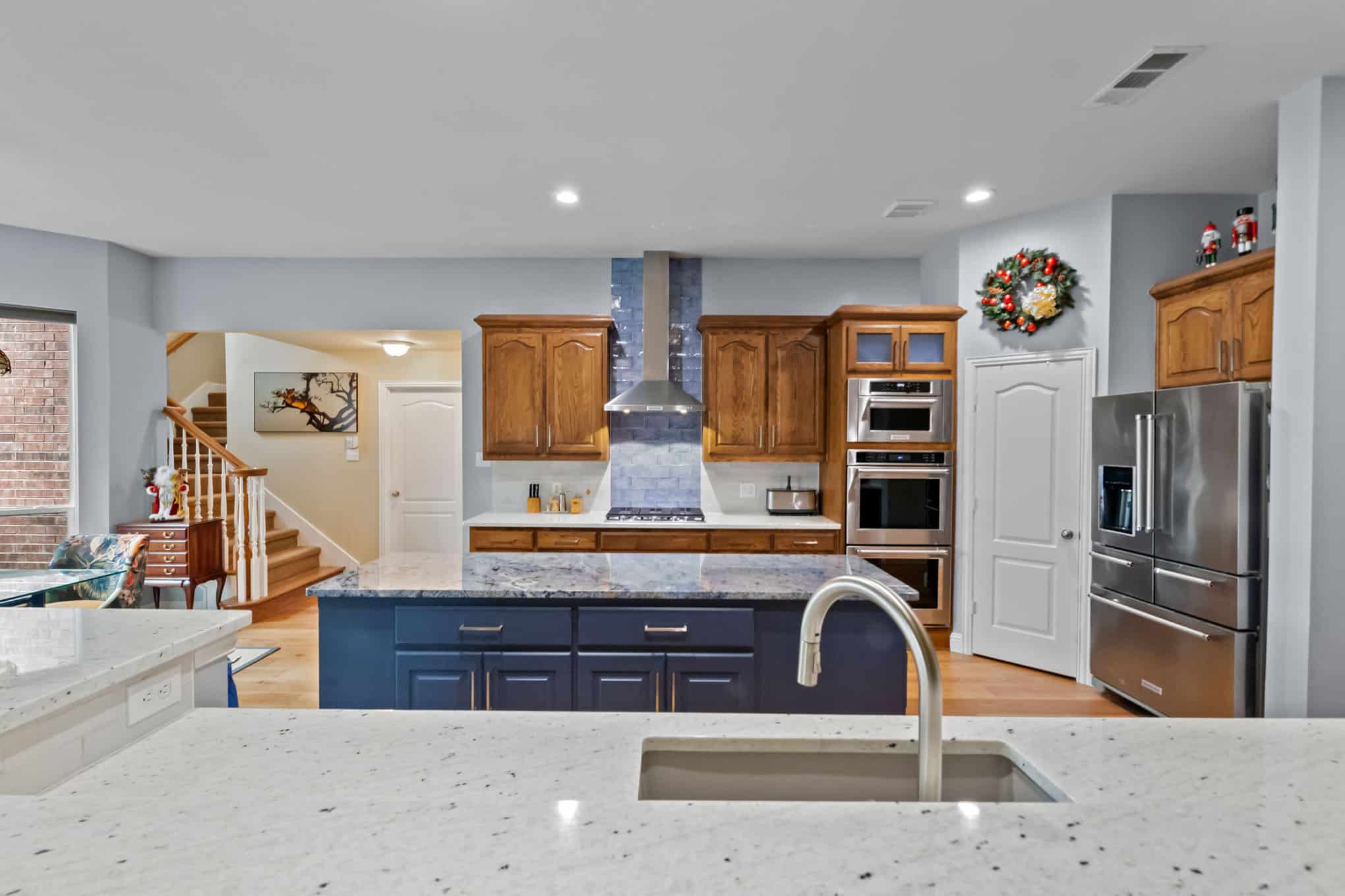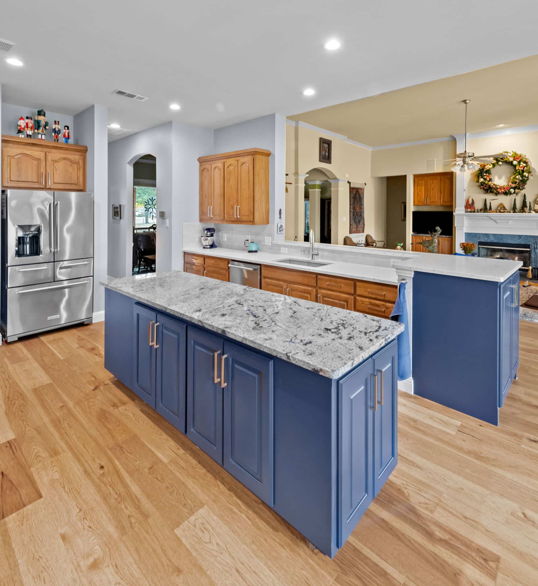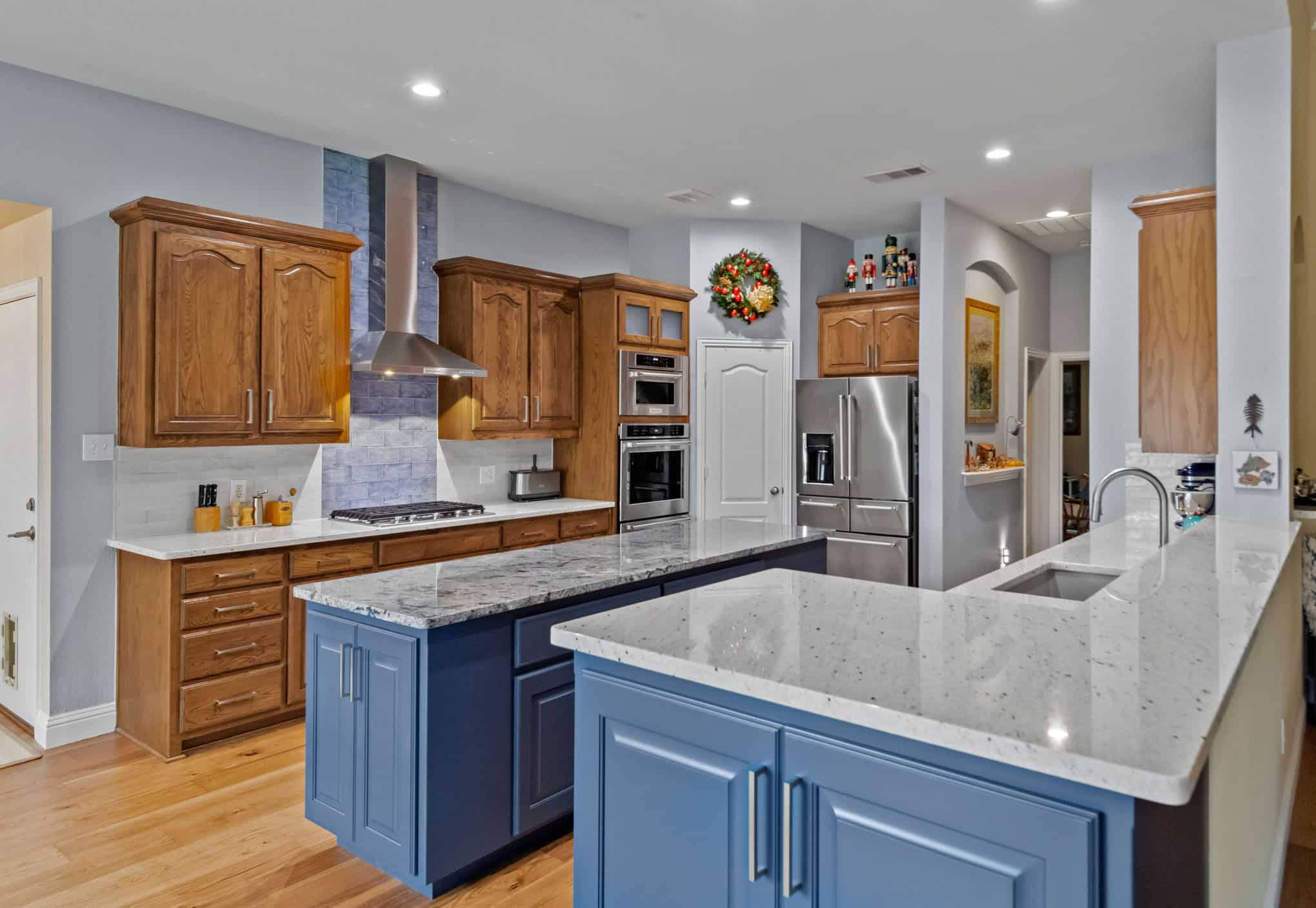The design team at Elite Remodeling’s Frisco showroom has crafted a space where luxury meets functionality in perfect harmony. Gleaming white quartz countertops provide an exquisite contrast against warm oak cabinetry, while the statement navy blue islands anchor the kitchen with bold sophistication. The premium stainless appliances, designer faucets, and meticulously selected hardware elevate the space to a professional culinary standard that still feels welcoming for family gatherings.