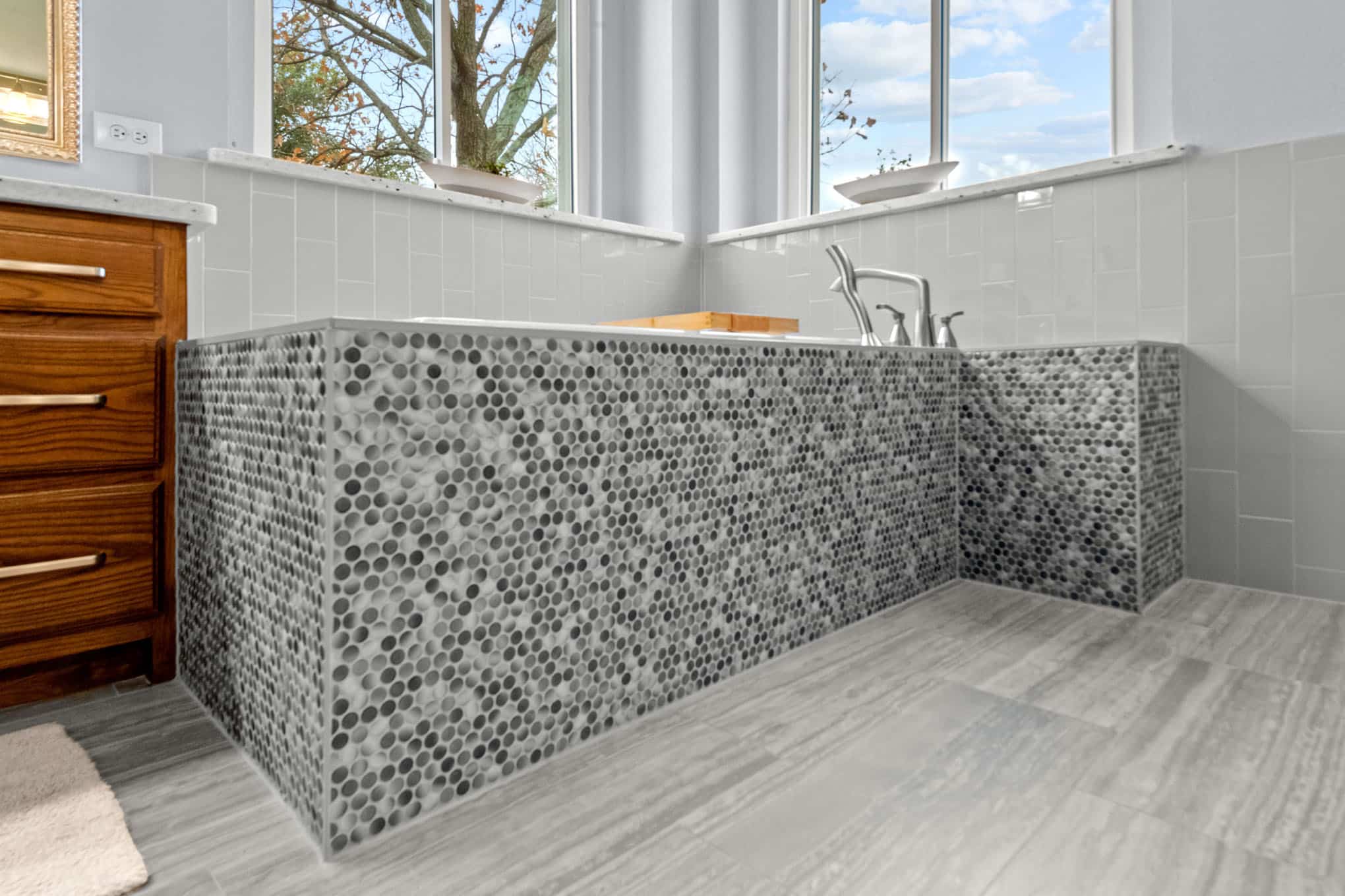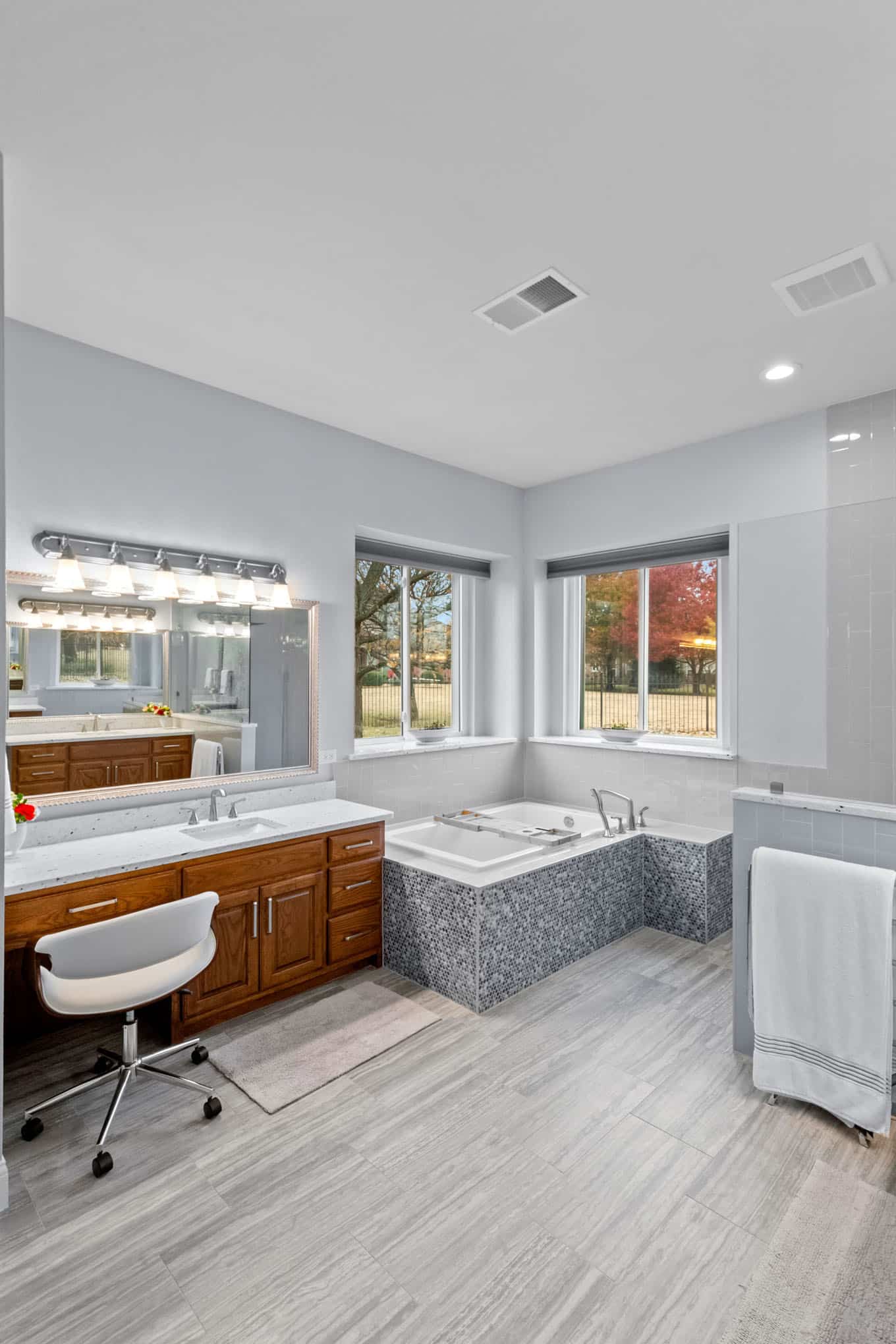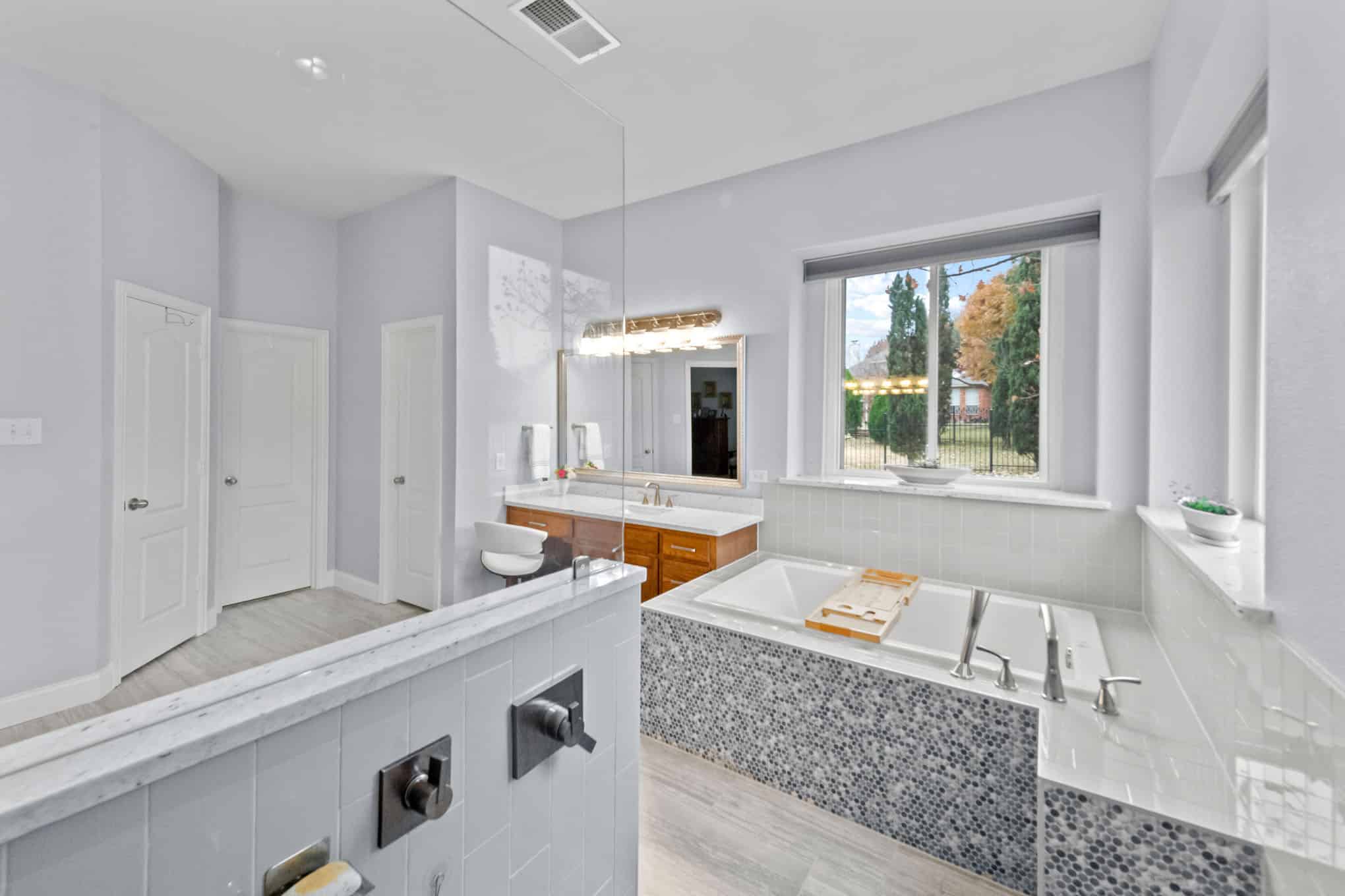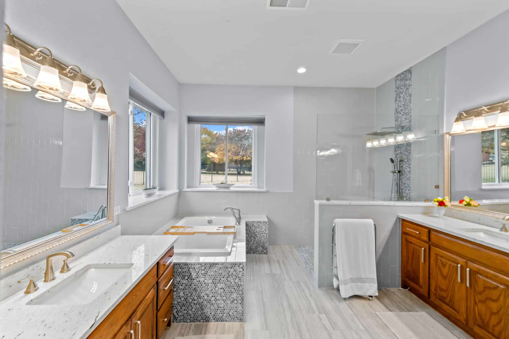 In the master bathroom, the design language continues with a serene palette of cool grays and whites. The stunning penny tile mosaic that wraps the soaking tub creates a captivating focal point, while the walk-in shower with its vertical accent stripe demonstrates the designers’ attention to detail. Strategic window placement allows natural light to cascade across the space, highlighting the premium materials and craftsmanship that distinguish North Texas luxury renovations.