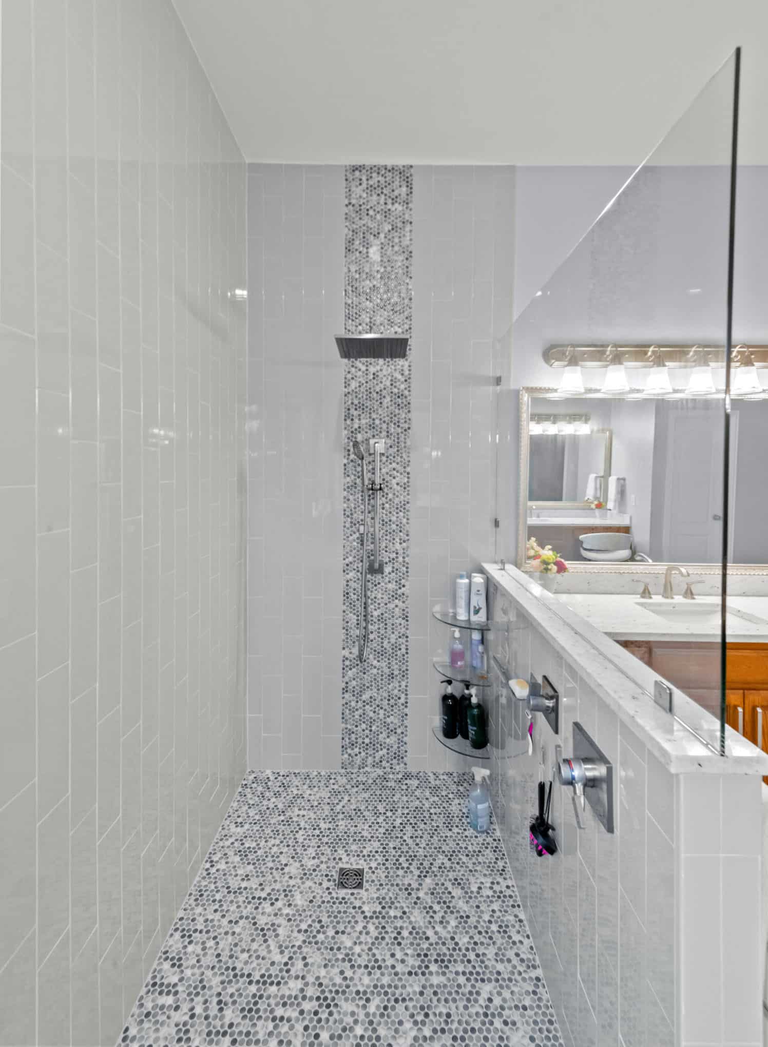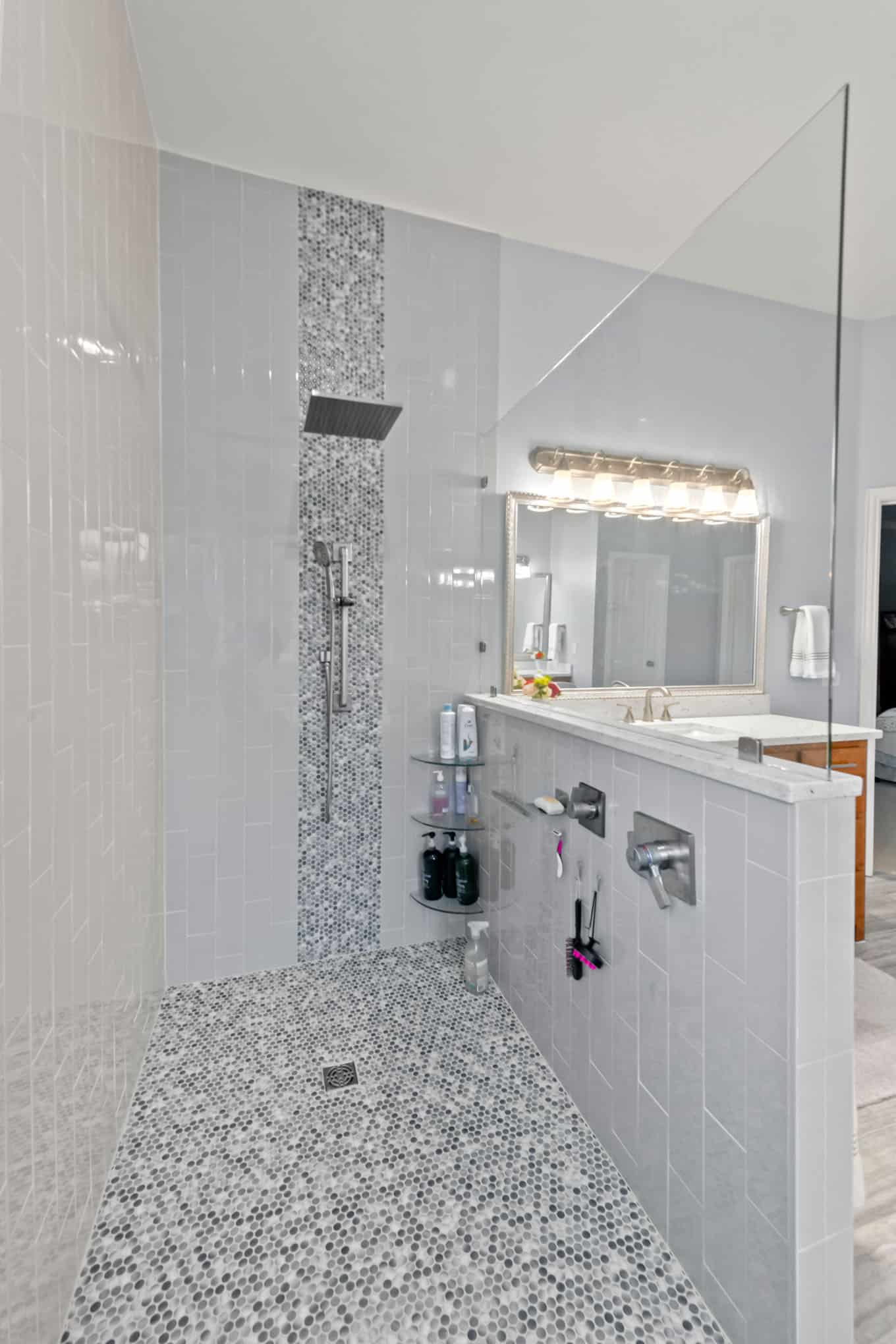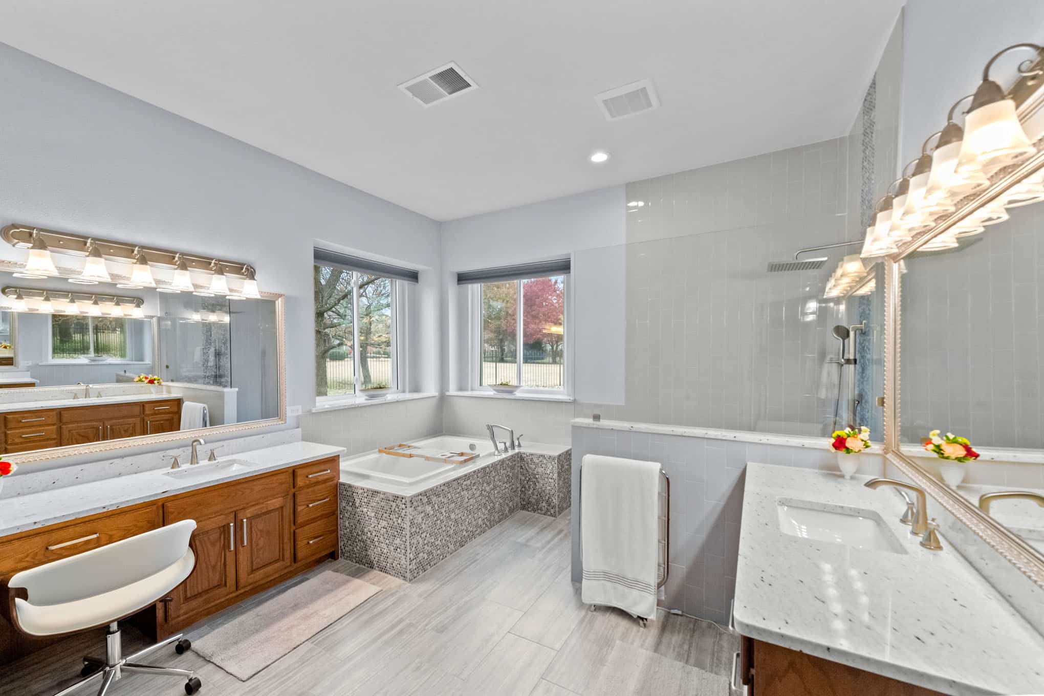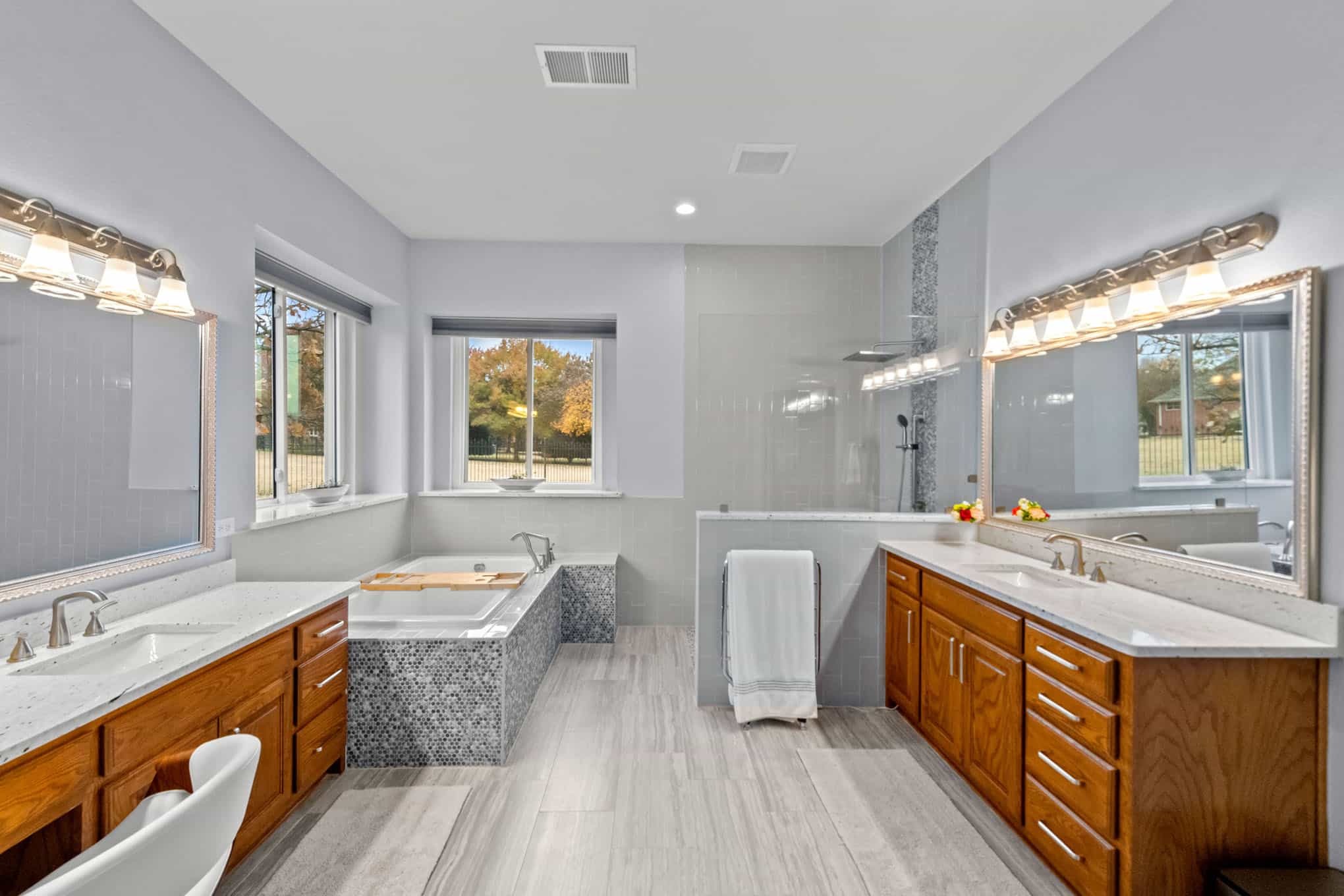 In the master bathroom, the design language continues with a serene palette of cool grays and whites. The stunning penny tile mosaic that wraps the soaking tub creates a captivating focal point, while the walk-in shower with its vertical accent stripe demonstrates the designers’ attention to detail. Strategic window placement allows natural light to cascade across the space, highlighting the premium materials and craftsmanship that distinguish North Texas luxury renovations.