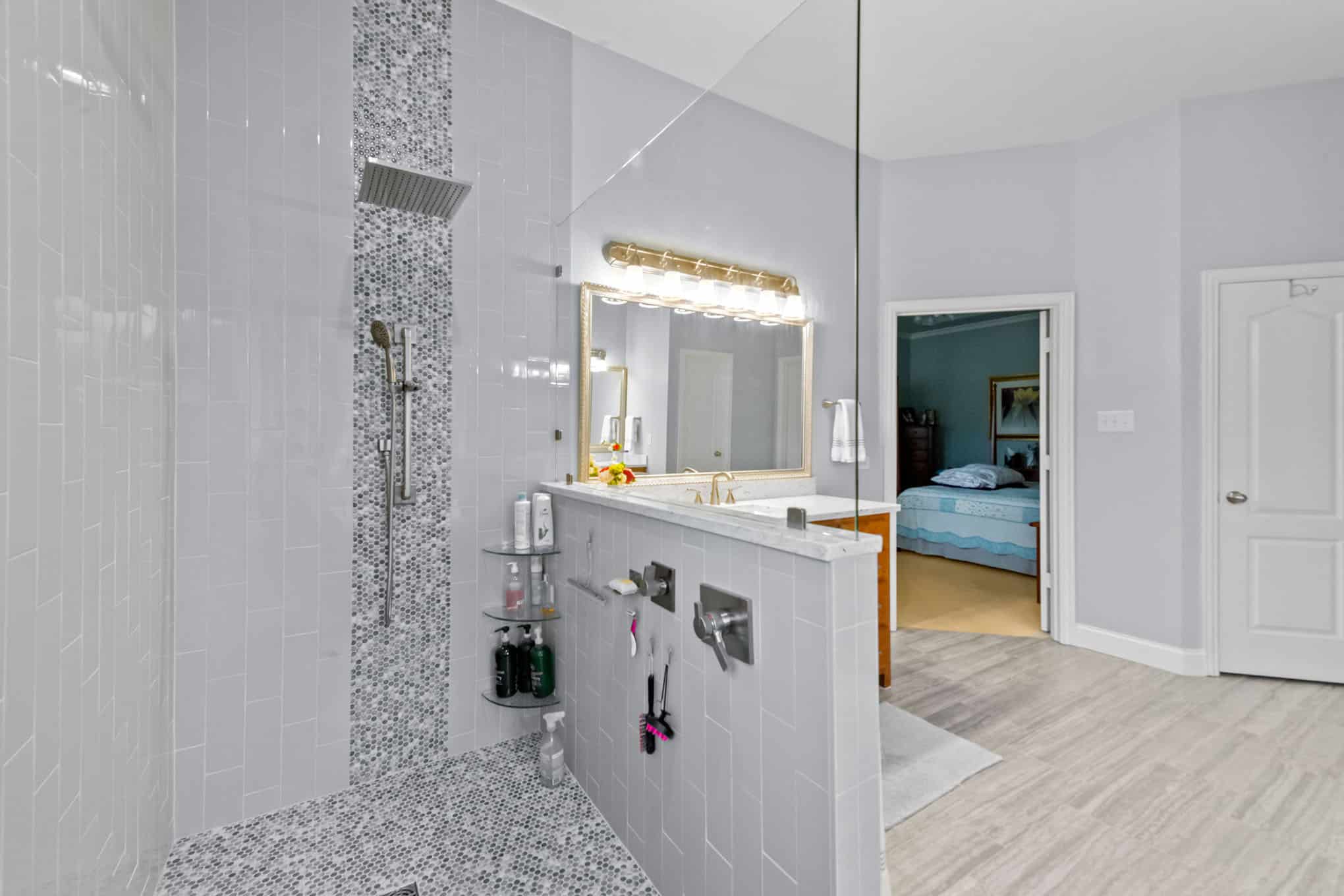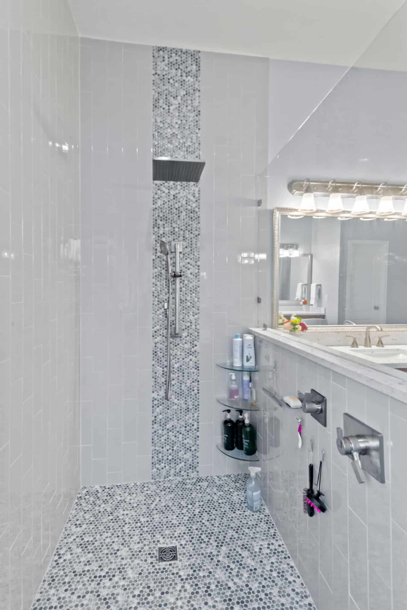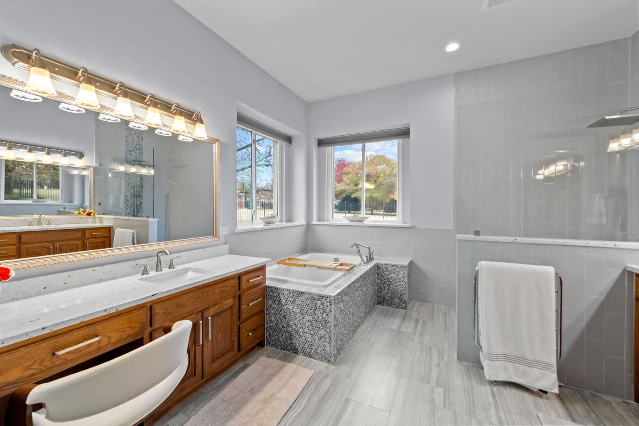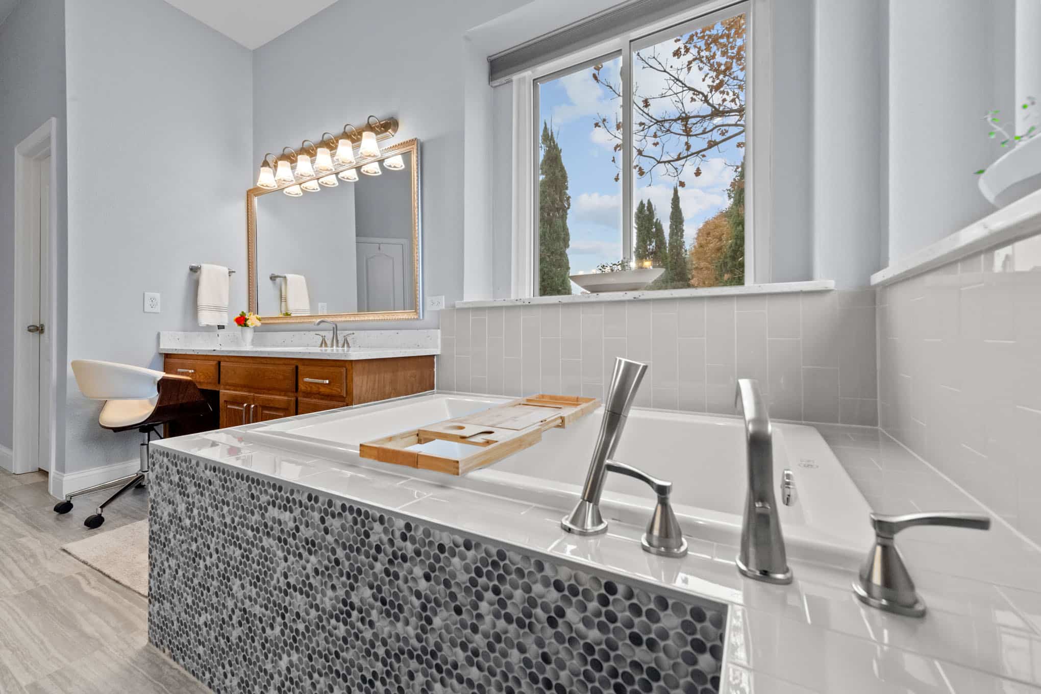 In the master bathroom, the design language continues with a serene palette of cool grays and whites. The stunning penny tile mosaic that wraps the soaking tub creates a captivating focal point, while the walk-in shower with its vertical accent stripe demonstrates the designers’ attention to detail. Strategic window placement allows natural light to cascade across the space, highlighting the premium materials and craftsmanship that distinguish North Texas luxury renovations.