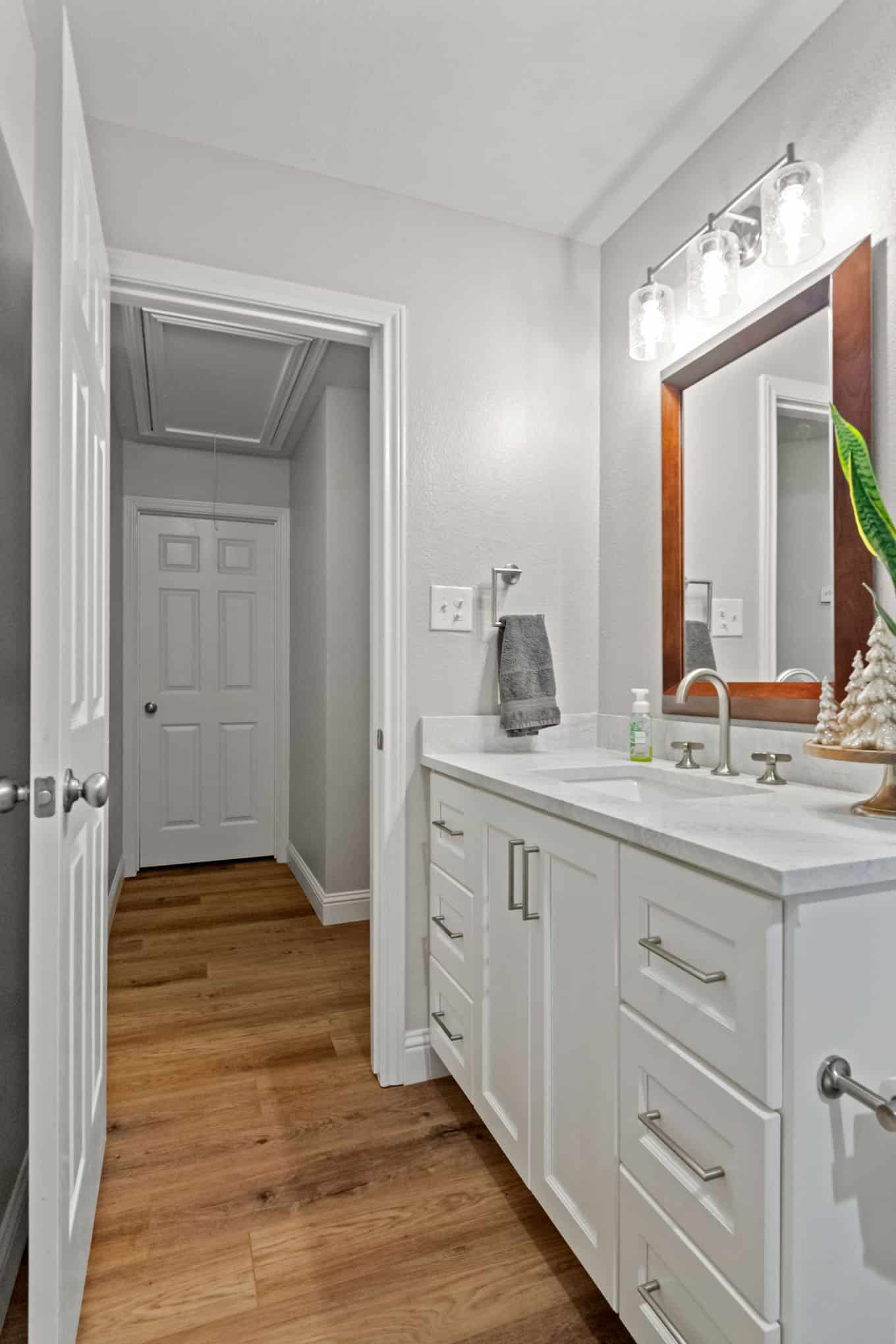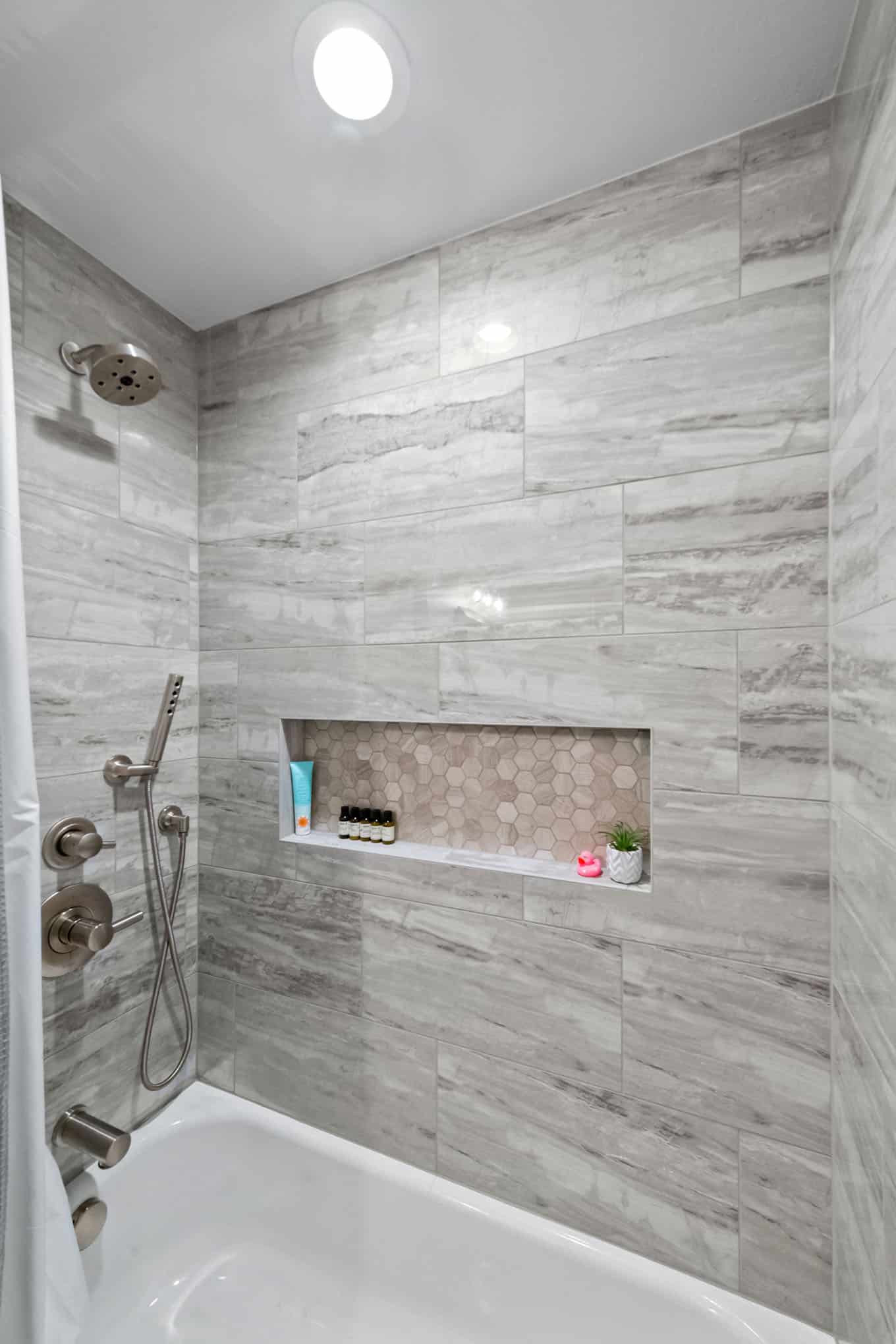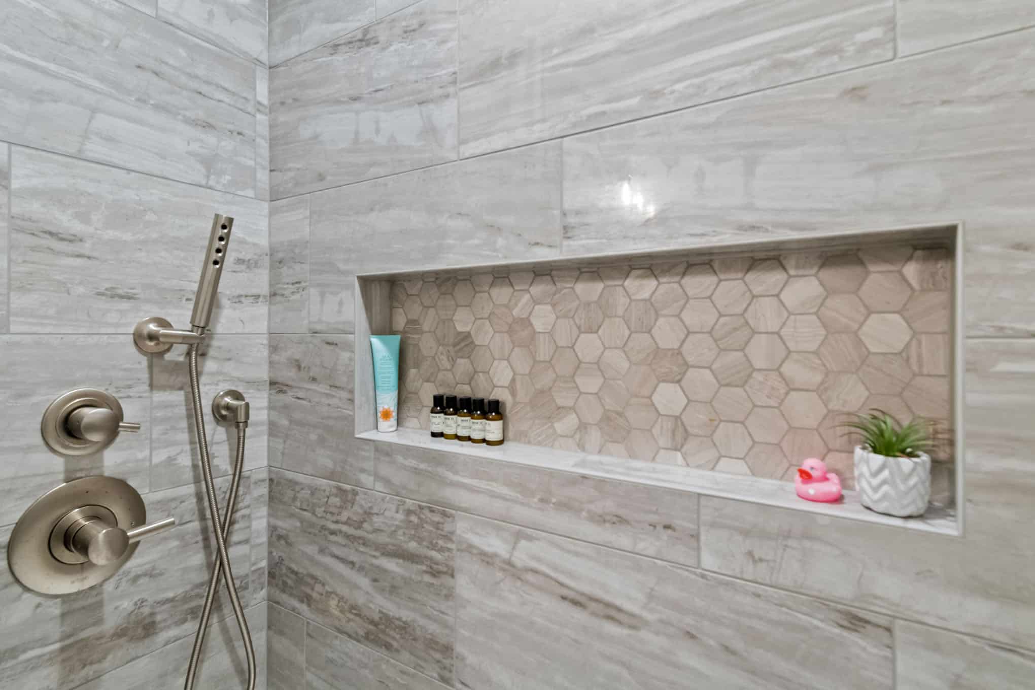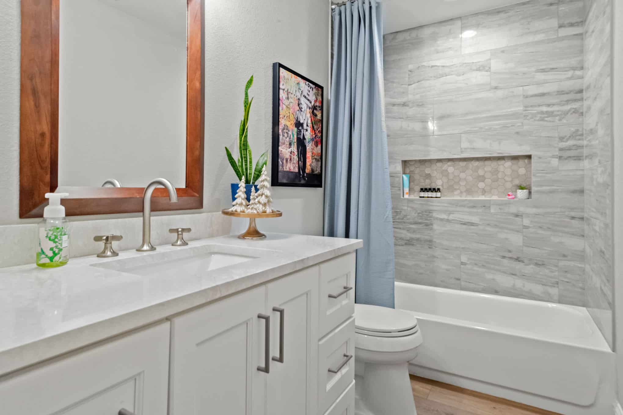 The renovated bathroom continues the design narrative with its spa-like ambiance, featuring a contemporary shower with a thoughtfully designed hexagonal mosaic niche – a subtle yet impactful detail that exemplifies Elite Remodeling’s attention to the elements that elevate a space from ordinary to extraordinary. The floating vanity with its brushed metal hardware brings a touch of modern luxury without sacrificing the home’s inherent warmth.