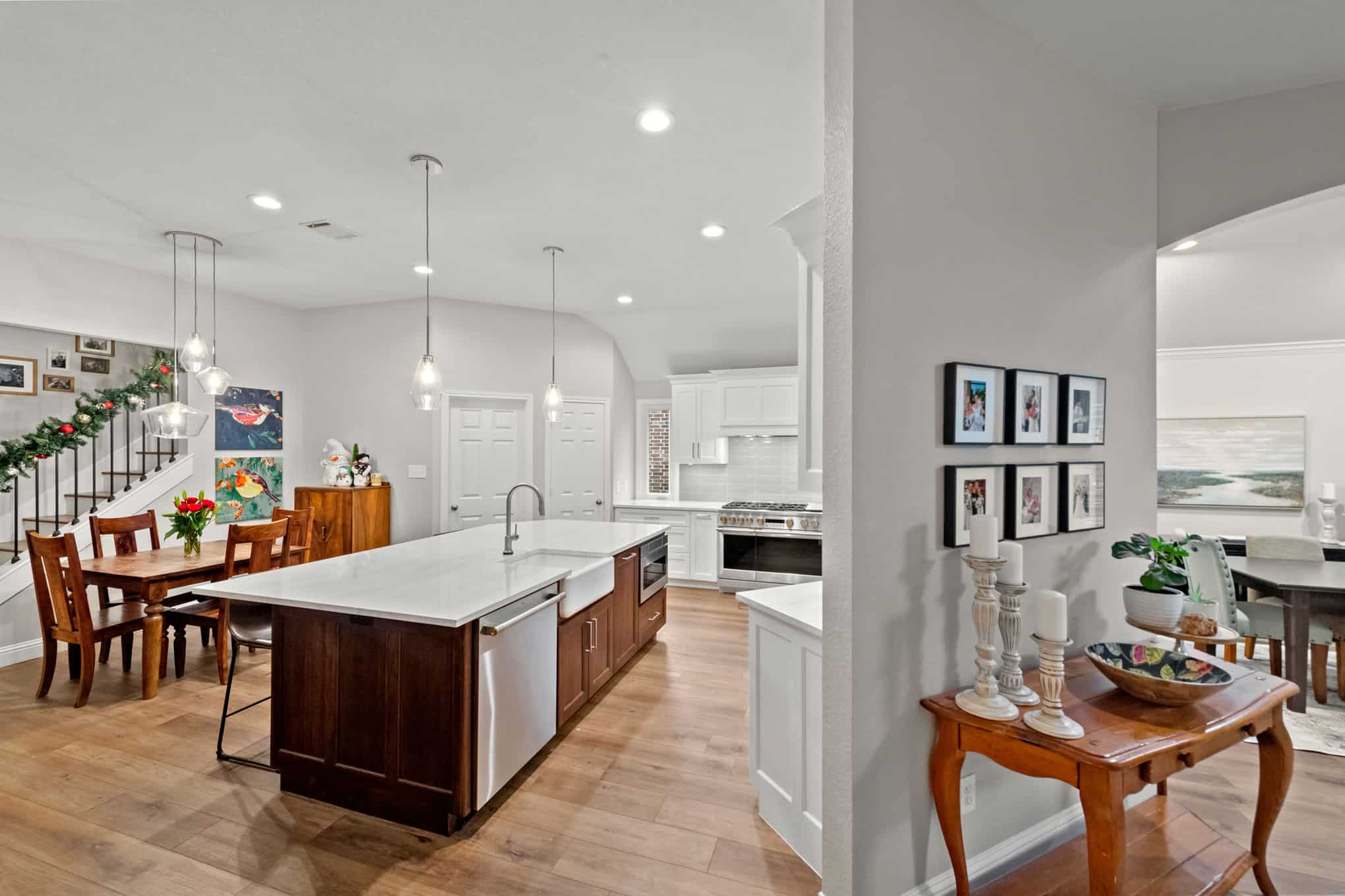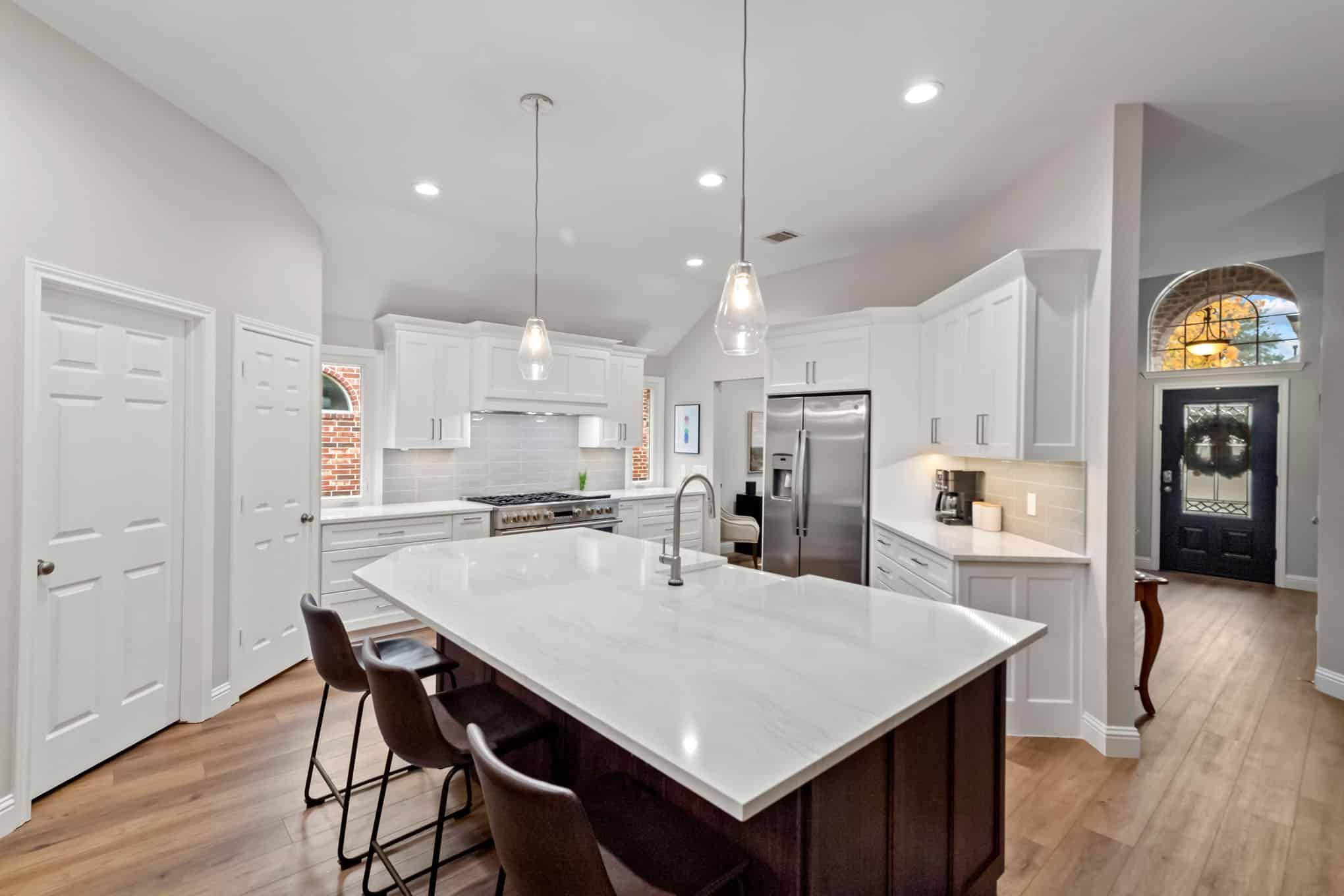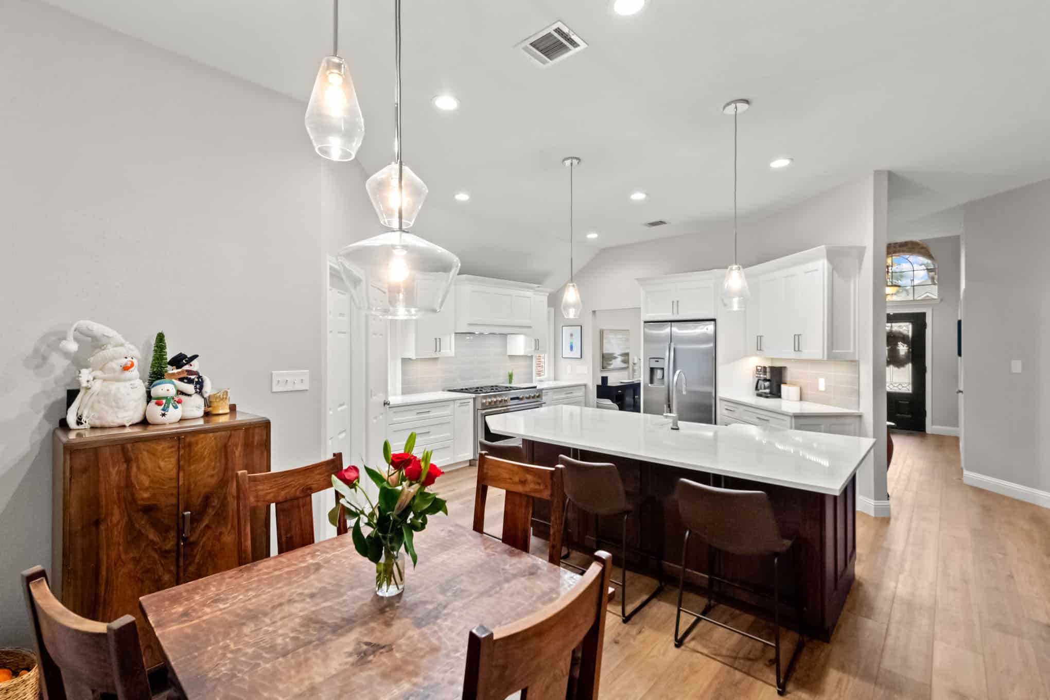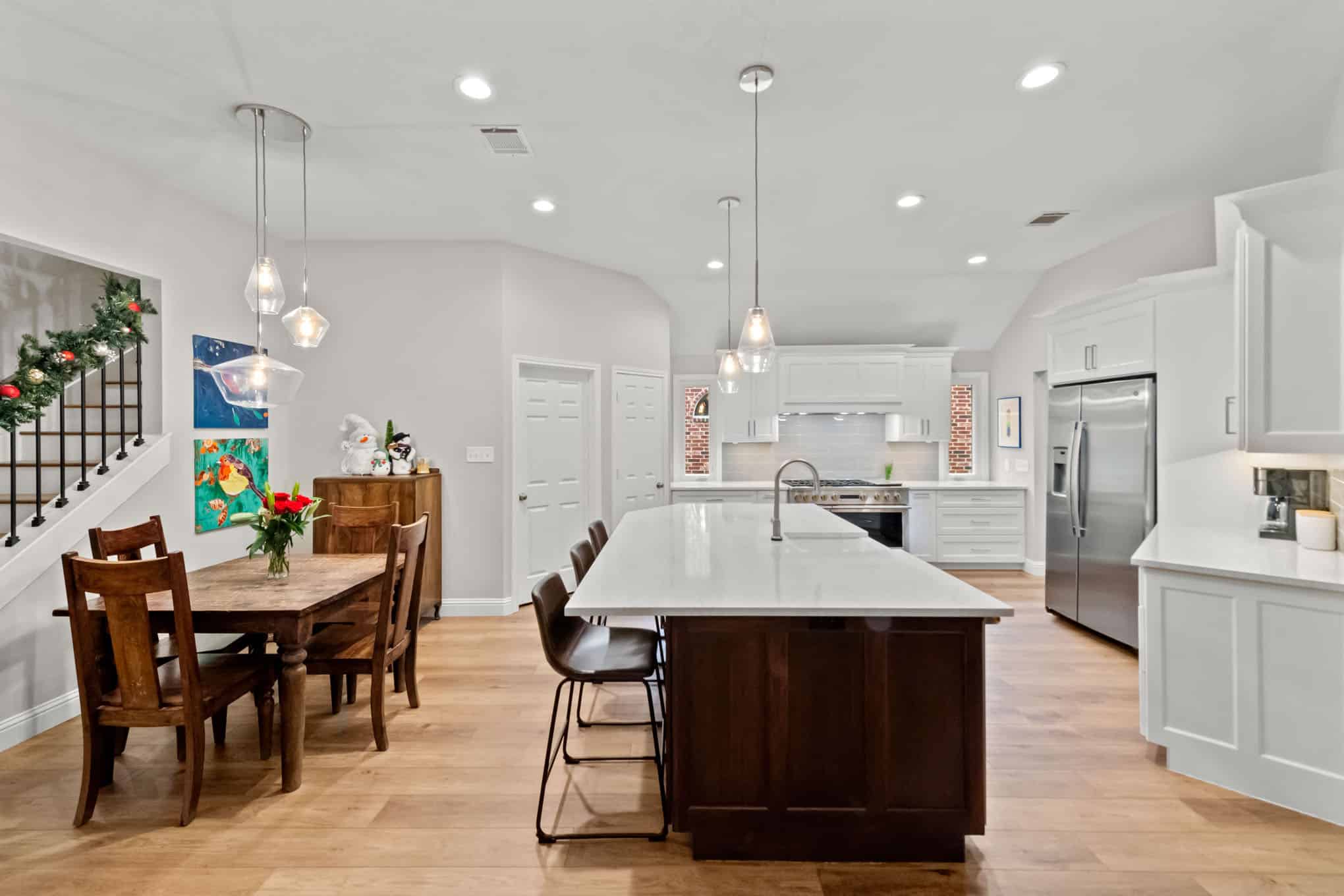 Elite Remodeling’s careful material selection shines throughout the space with the subtle gray subway tile backsplash providing textural interest while maintaining the serene palette. The consistent light oak flooring creates a seamless flow between the kitchen and adjacent spaces, a hallmark consideration for the open-concept preferences of discerning Frisco homeowners.