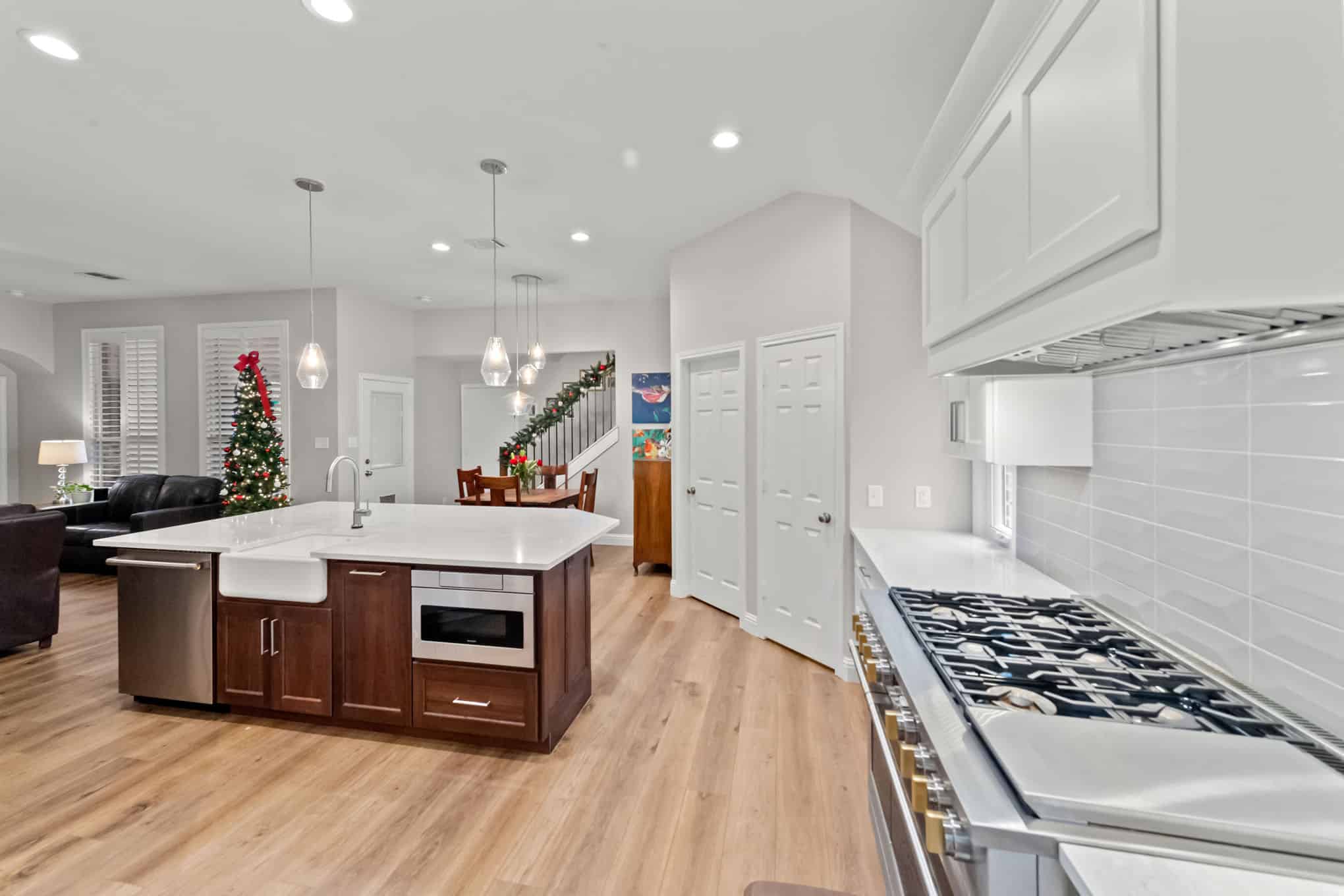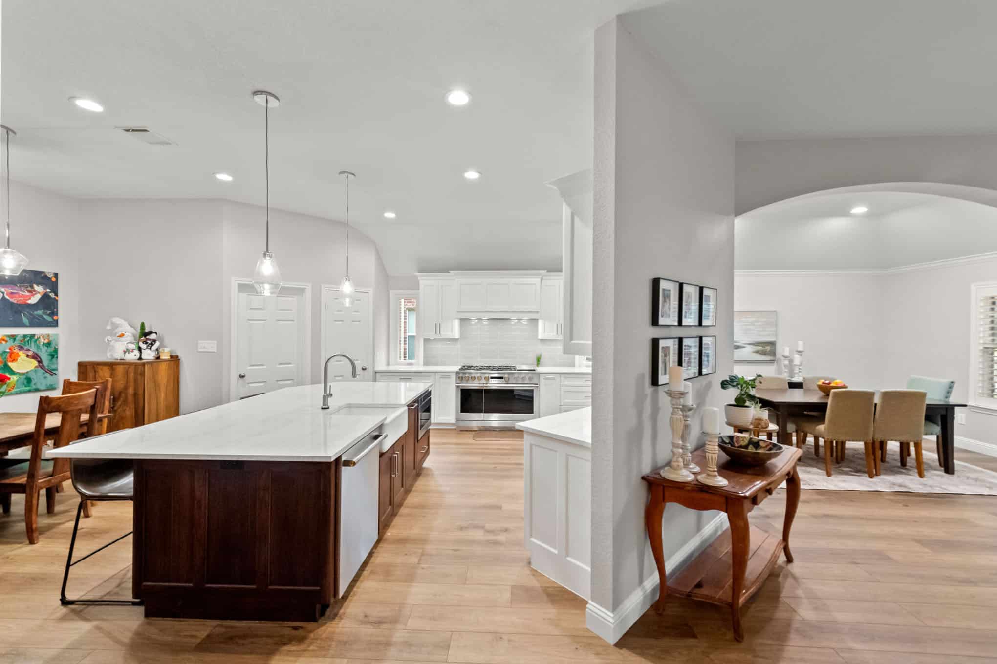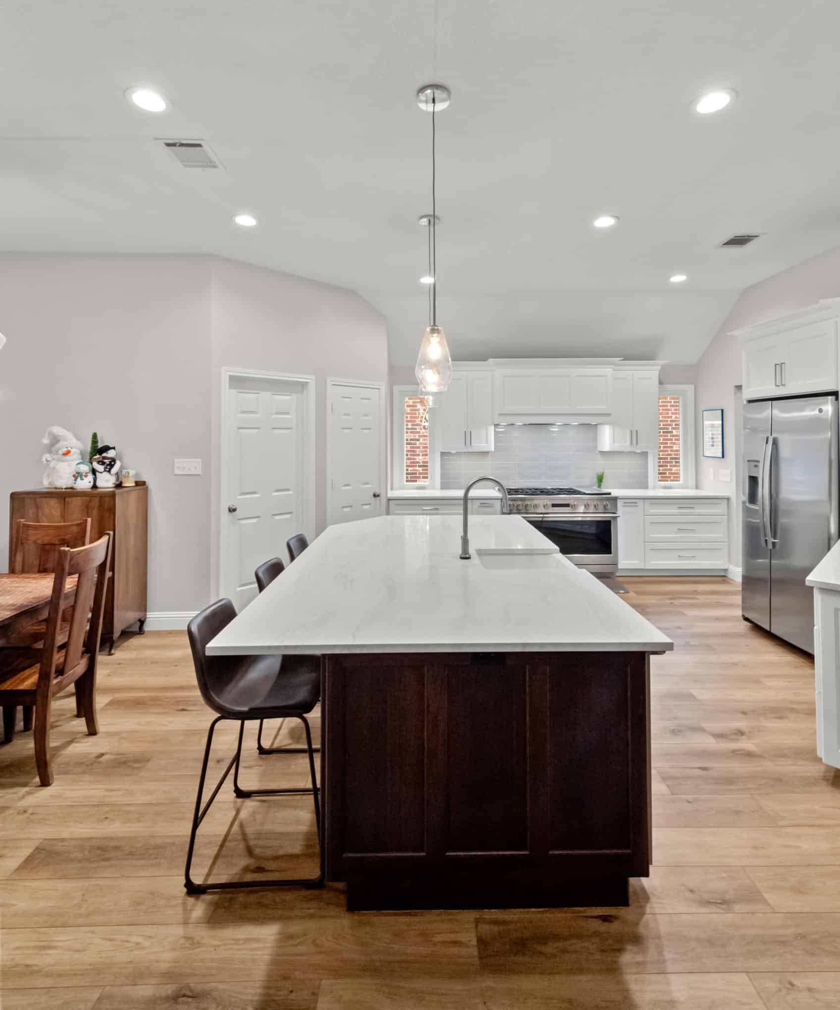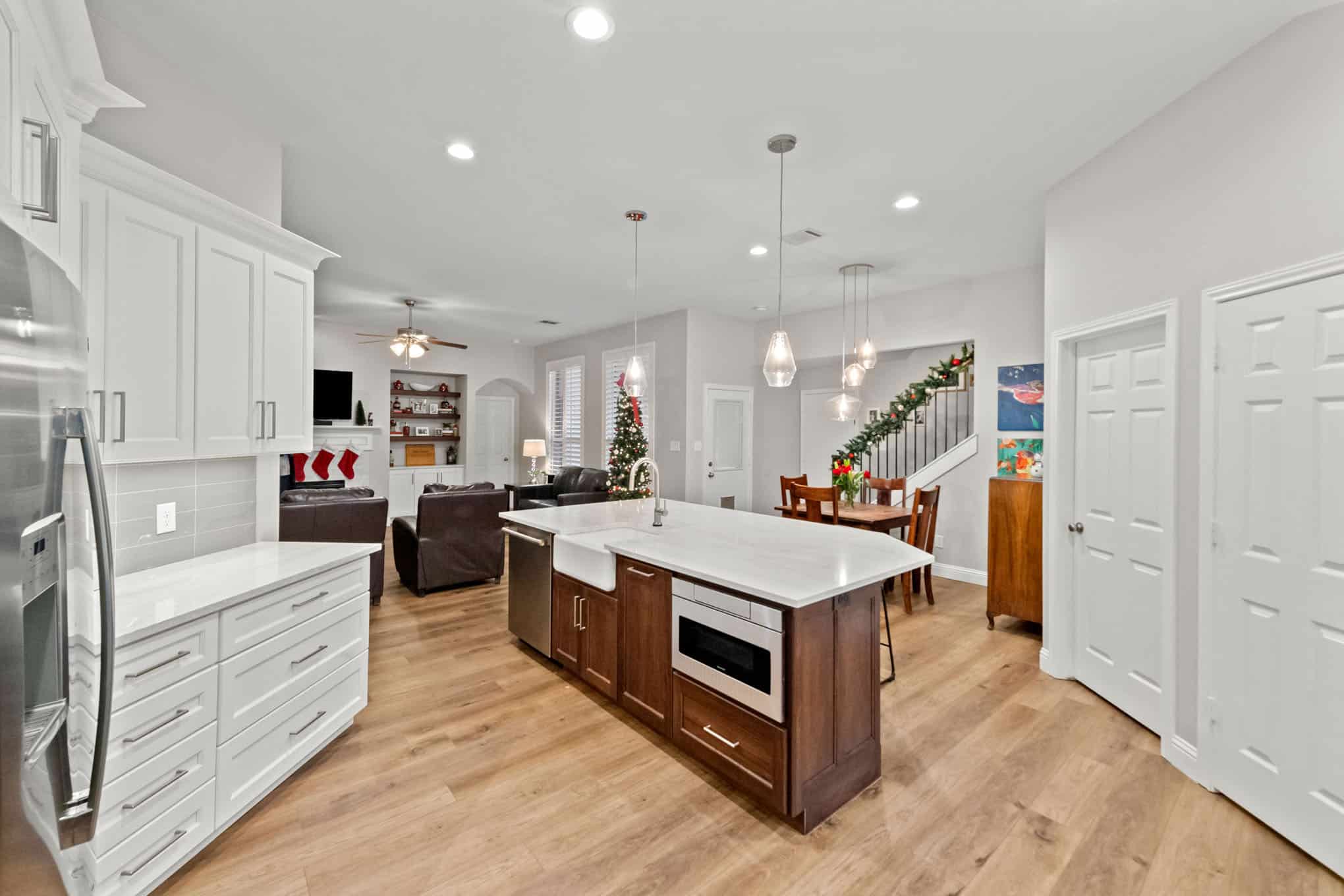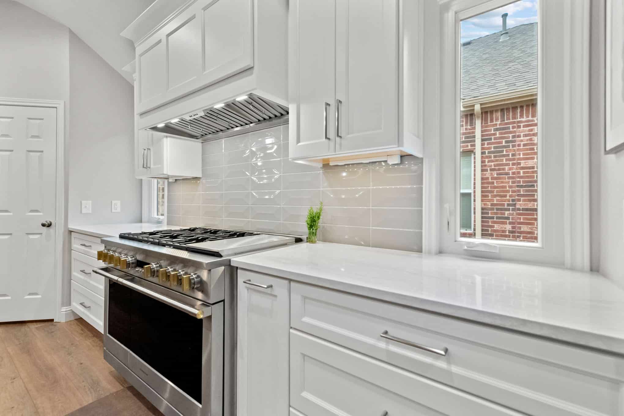 Elite Remodeling’s careful material selection shines throughout the space with the subtle gray subway tile backsplash providing textural interest while maintaining the serene palette. The consistent light oak flooring creates a seamless flow between the kitchen and adjacent spaces, a hallmark consideration for the open-concept preferences of discerning Frisco homeowners.