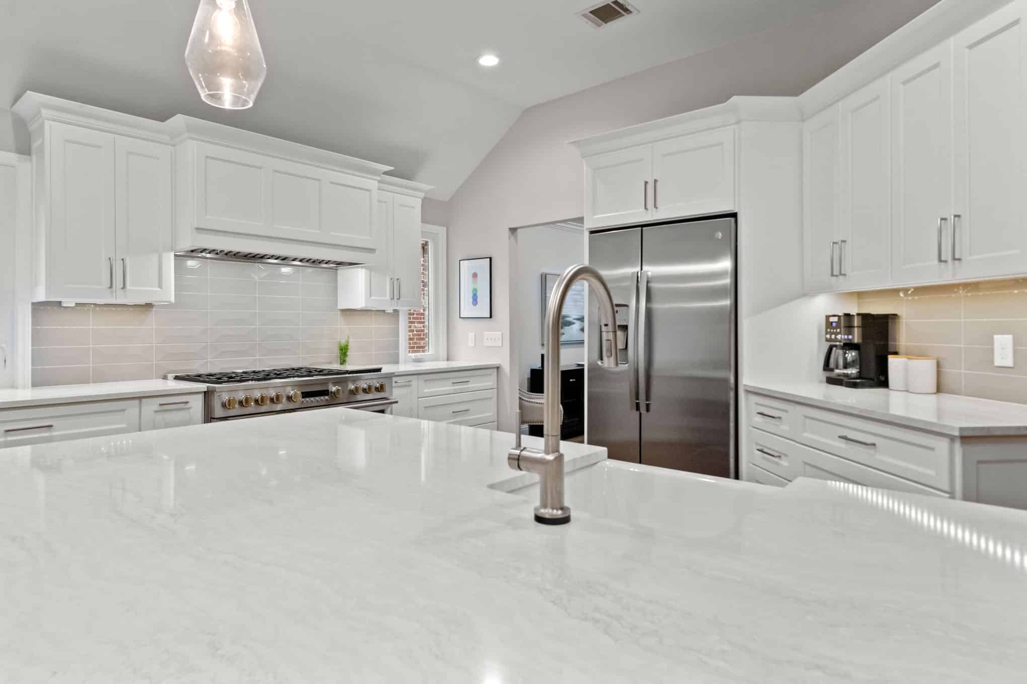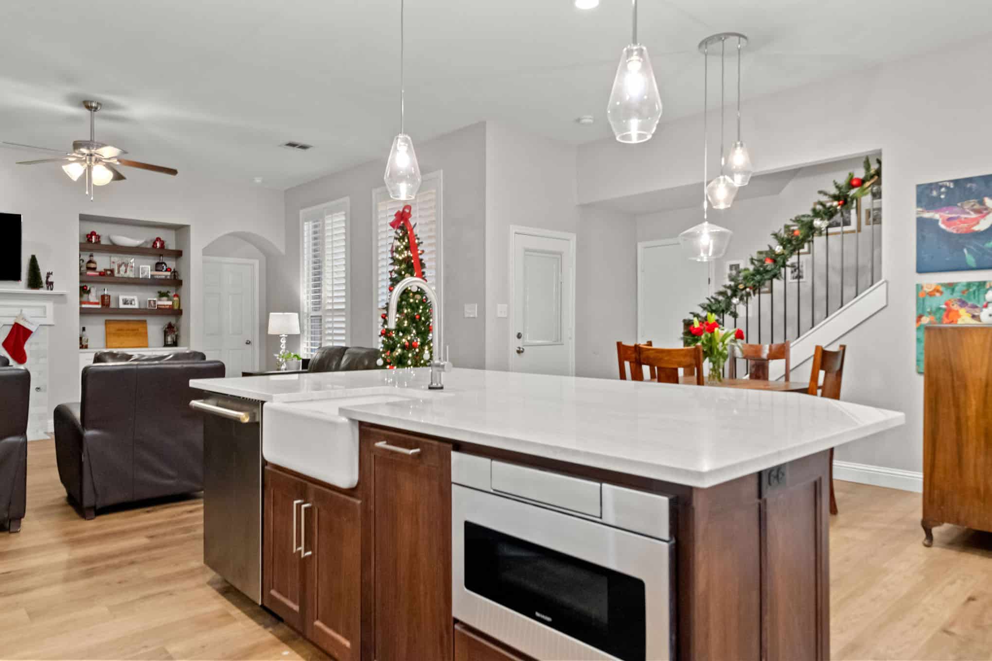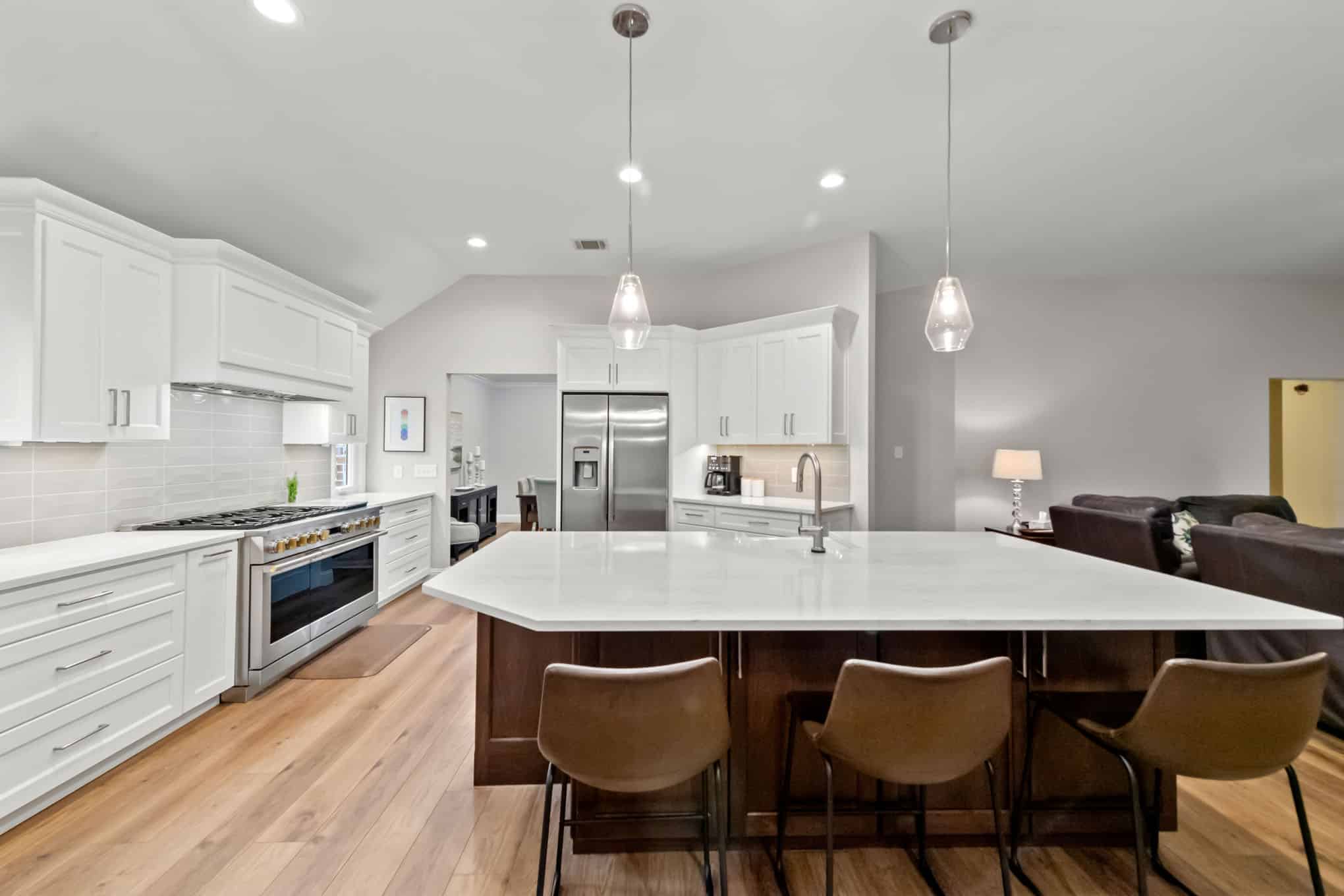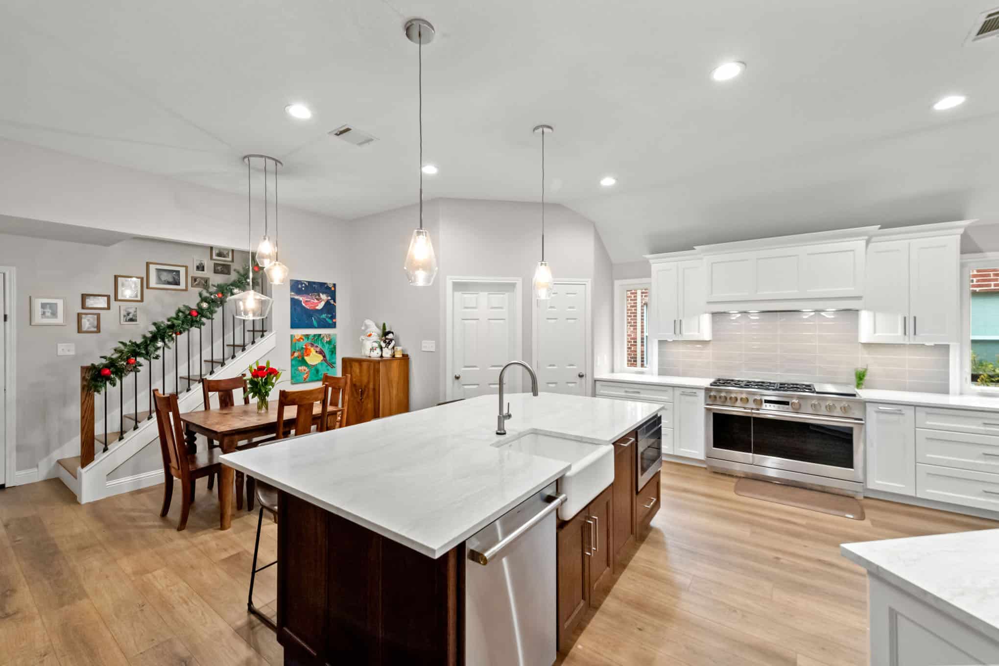 Elite Remodeling’s careful material selection shines throughout the space with the subtle gray subway tile backsplash providing textural interest while maintaining the serene palette. The consistent light oak flooring creates a seamless flow between the kitchen and adjacent spaces, a hallmark consideration for the open-concept preferences of discerning Frisco homeowners.