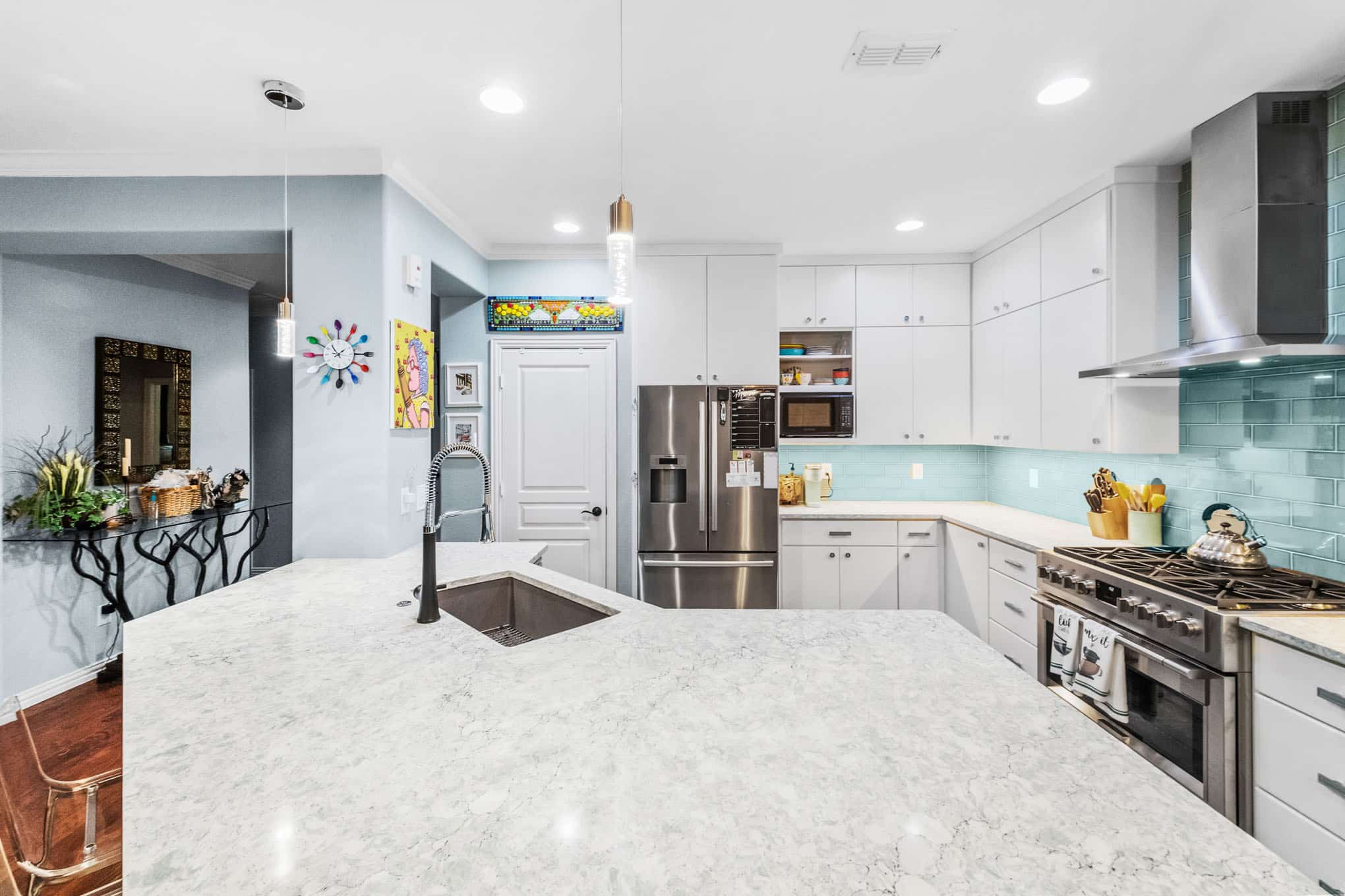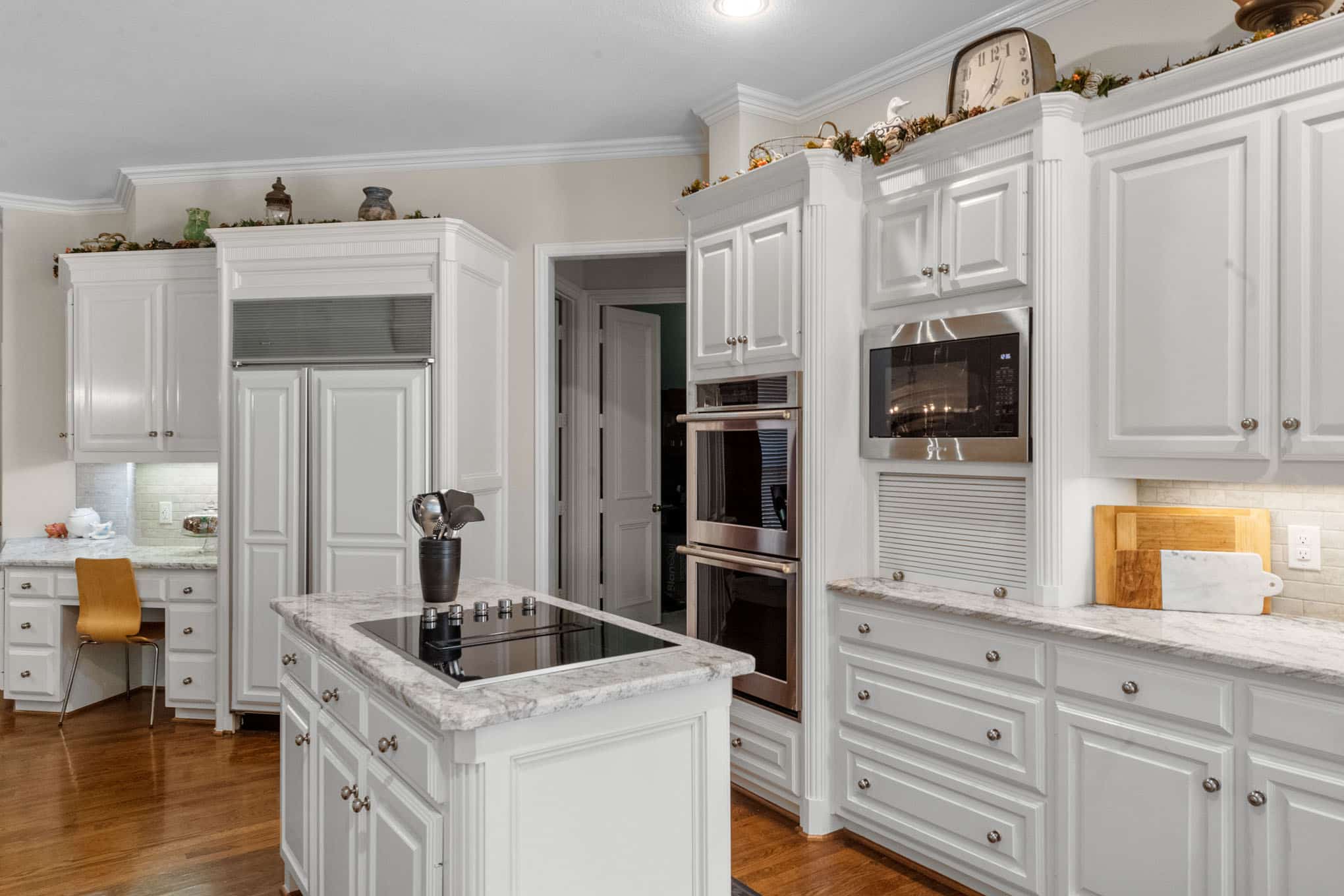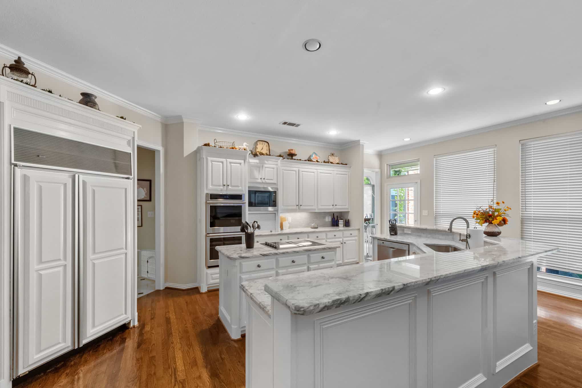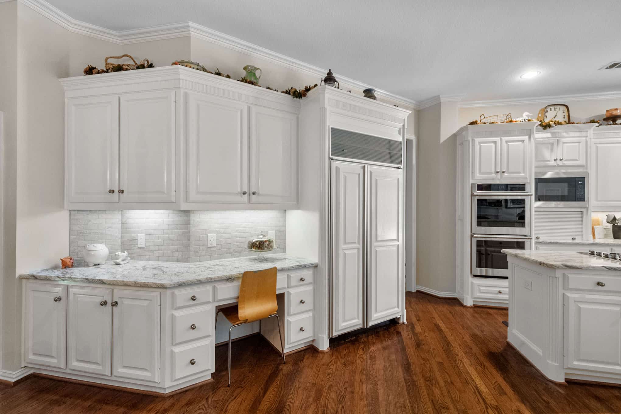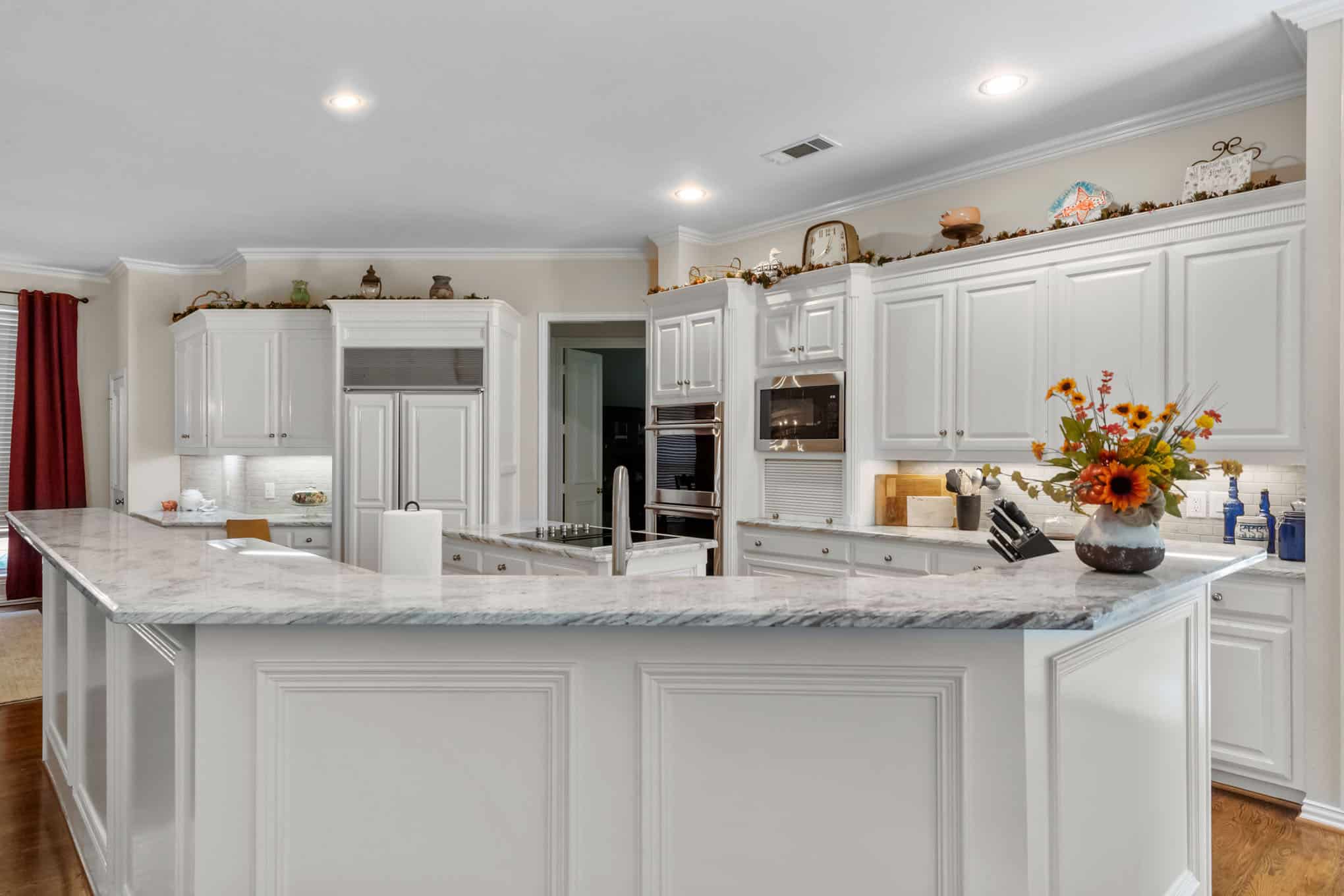 This sophisticated kitchen renovation embodies the gracious entertaining tradition so valued in North Texas homes, where gathering spaces must be as functional as they are beautiful. The design team at Elite Remodeling created an elegant yet approachable culinary environment centered around a classic white cabinet system with refined architectural detailing, including decorative fluting and substantial crown molding that draws the eye upward to maximize the sense of volume. The dramatic Carrara-inspired marble countertops introduce subtle veining that adds organic movement and visual interest without overwhelming the serene palette.