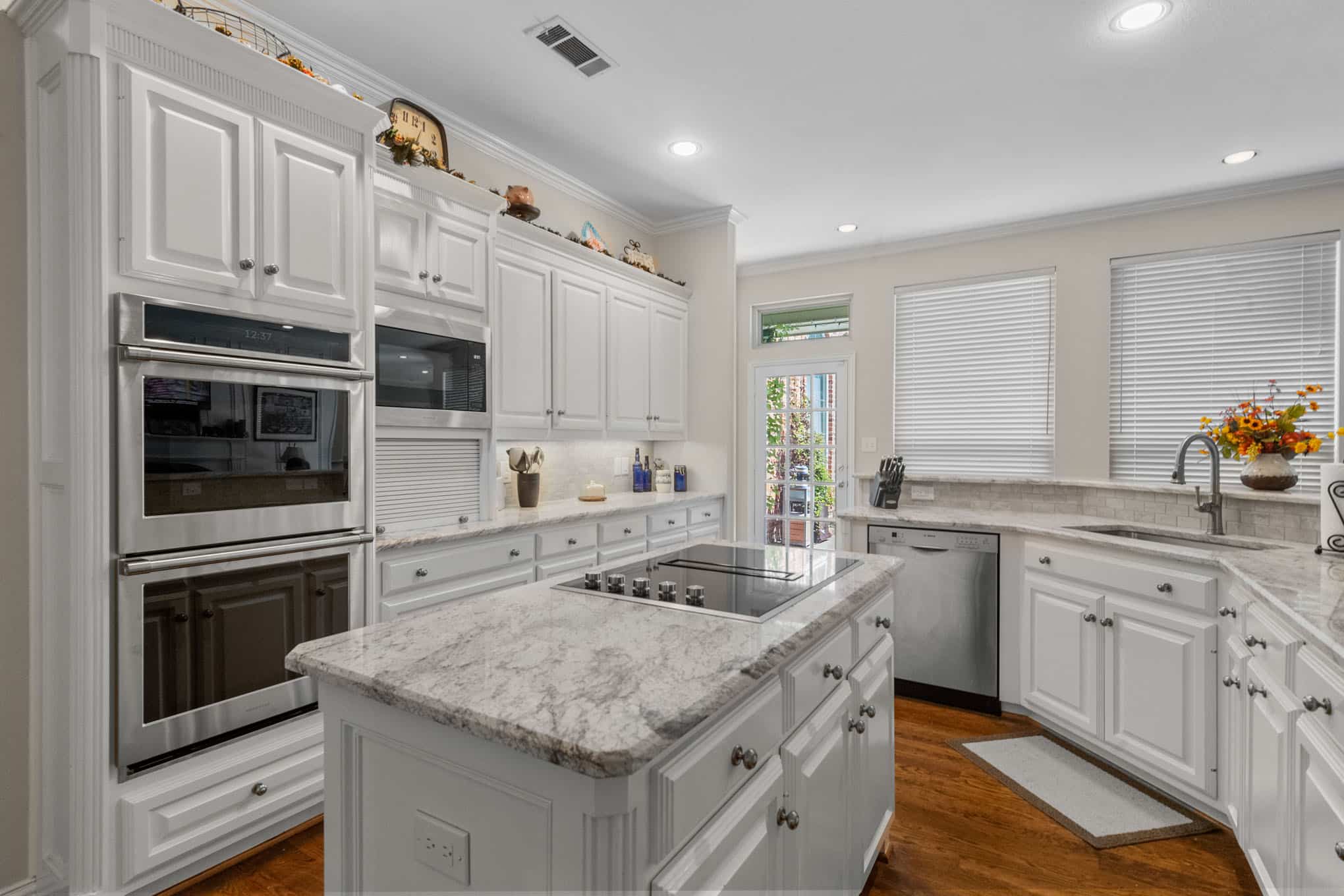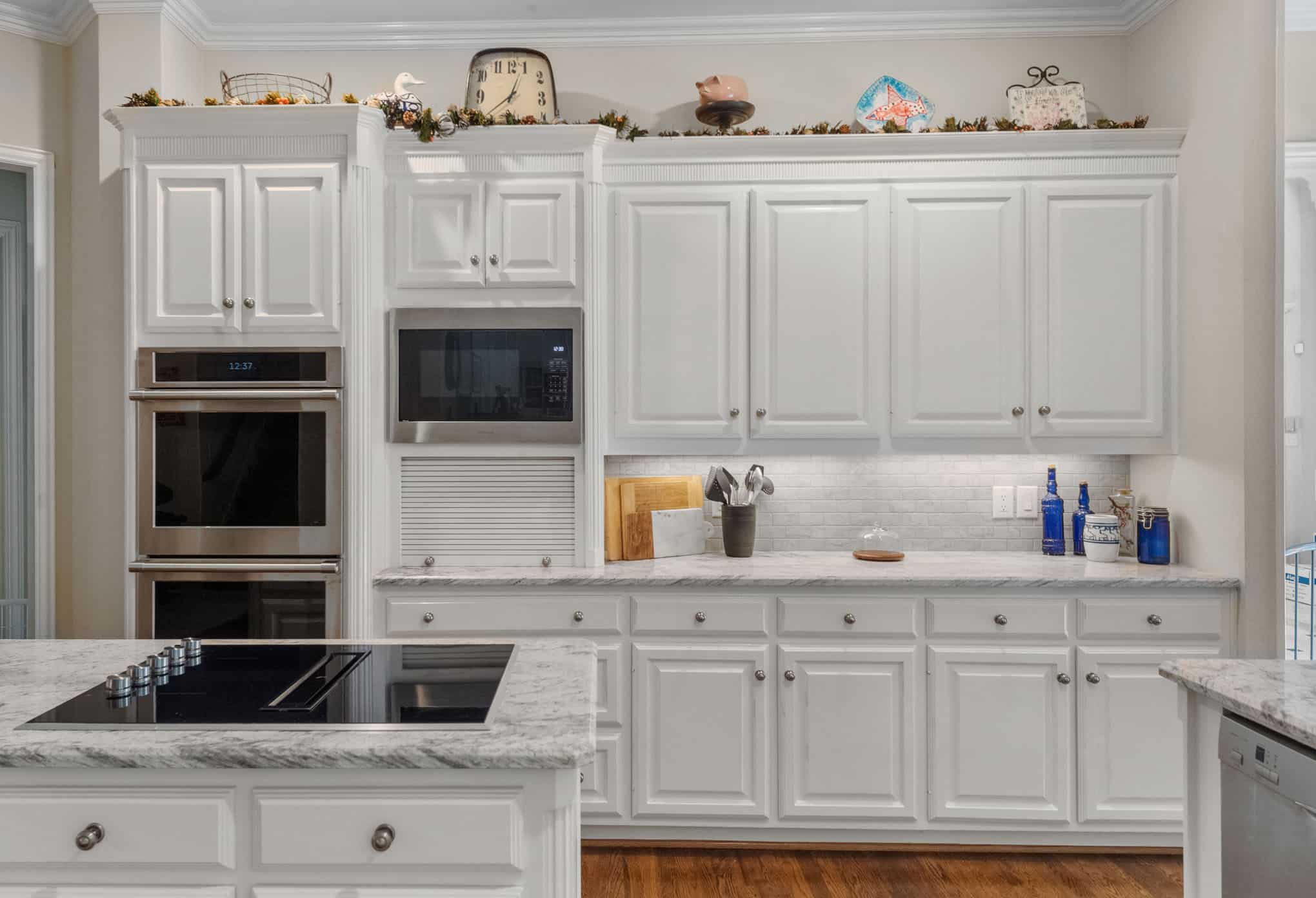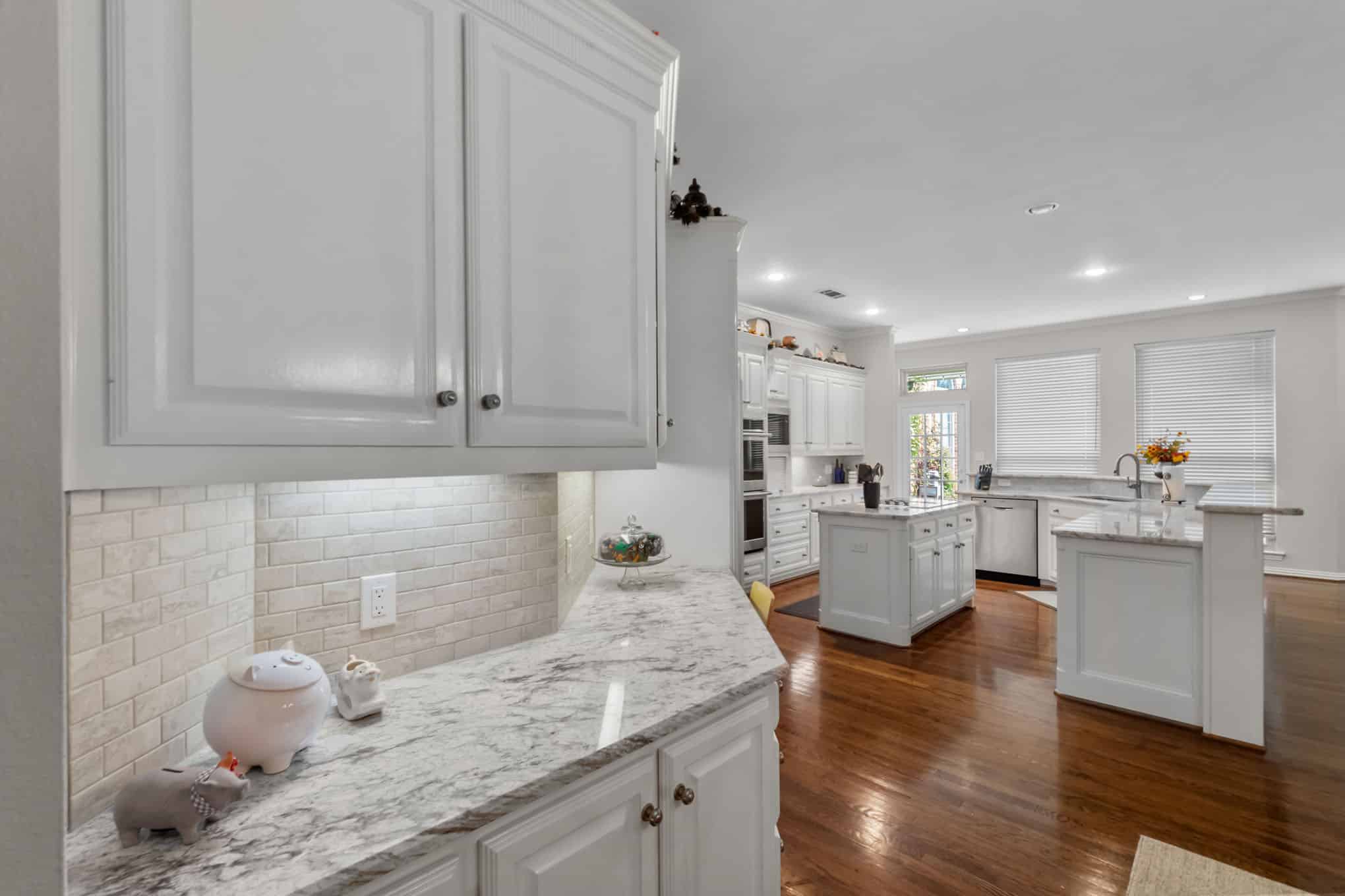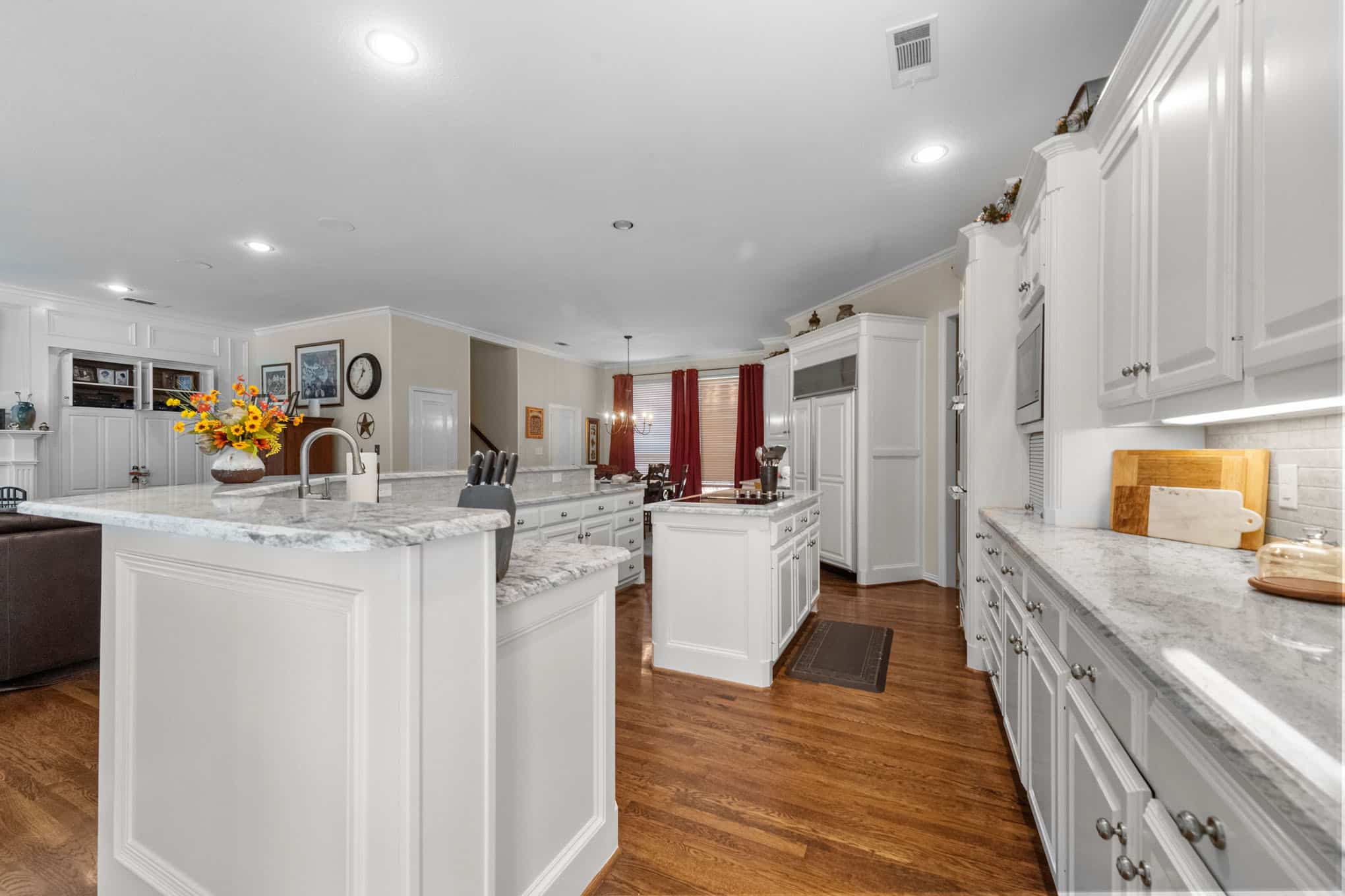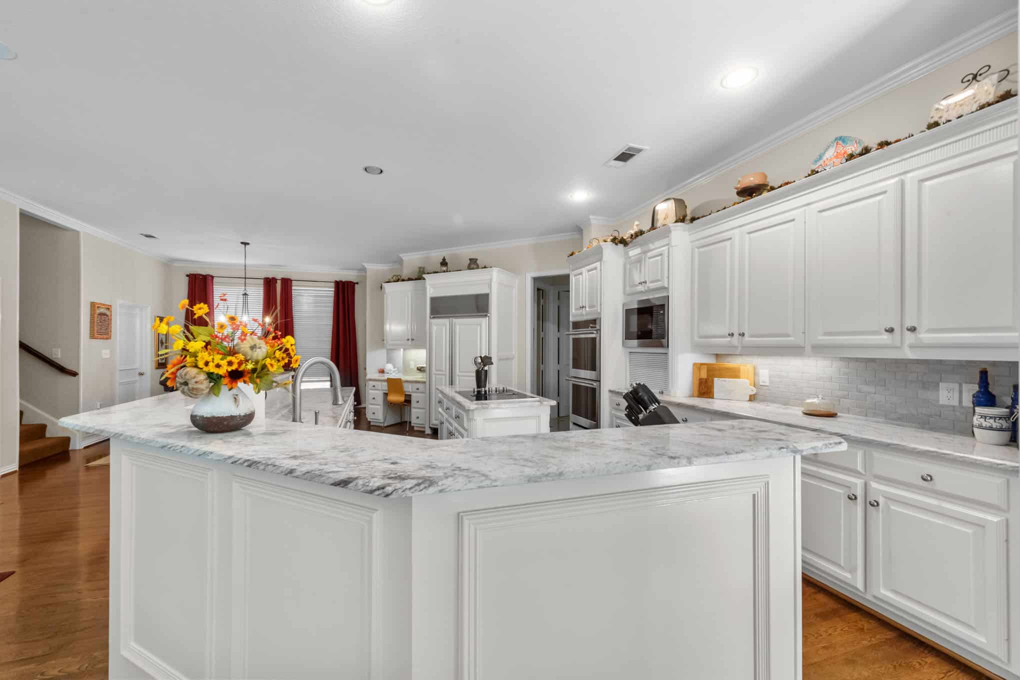 This sophisticated kitchen renovation embodies the gracious entertaining tradition so valued in North Texas homes, where gathering spaces must be as functional as they are beautiful. The design team at Elite Remodeling created an elegant yet approachable culinary environment centered around a classic white cabinet system with refined architectural detailing, including decorative fluting and substantial crown molding that draws the eye upward to maximize the sense of volume. The dramatic Carrara-inspired marble countertops introduce subtle veining that adds organic movement and visual interest without overwhelming the serene palette.