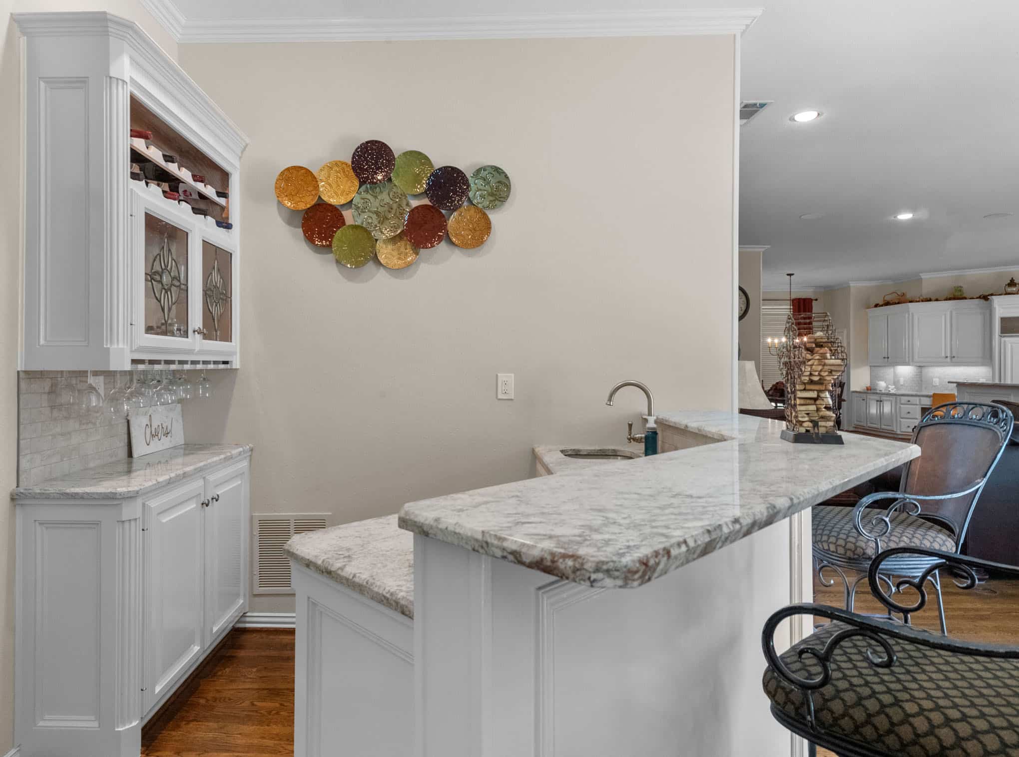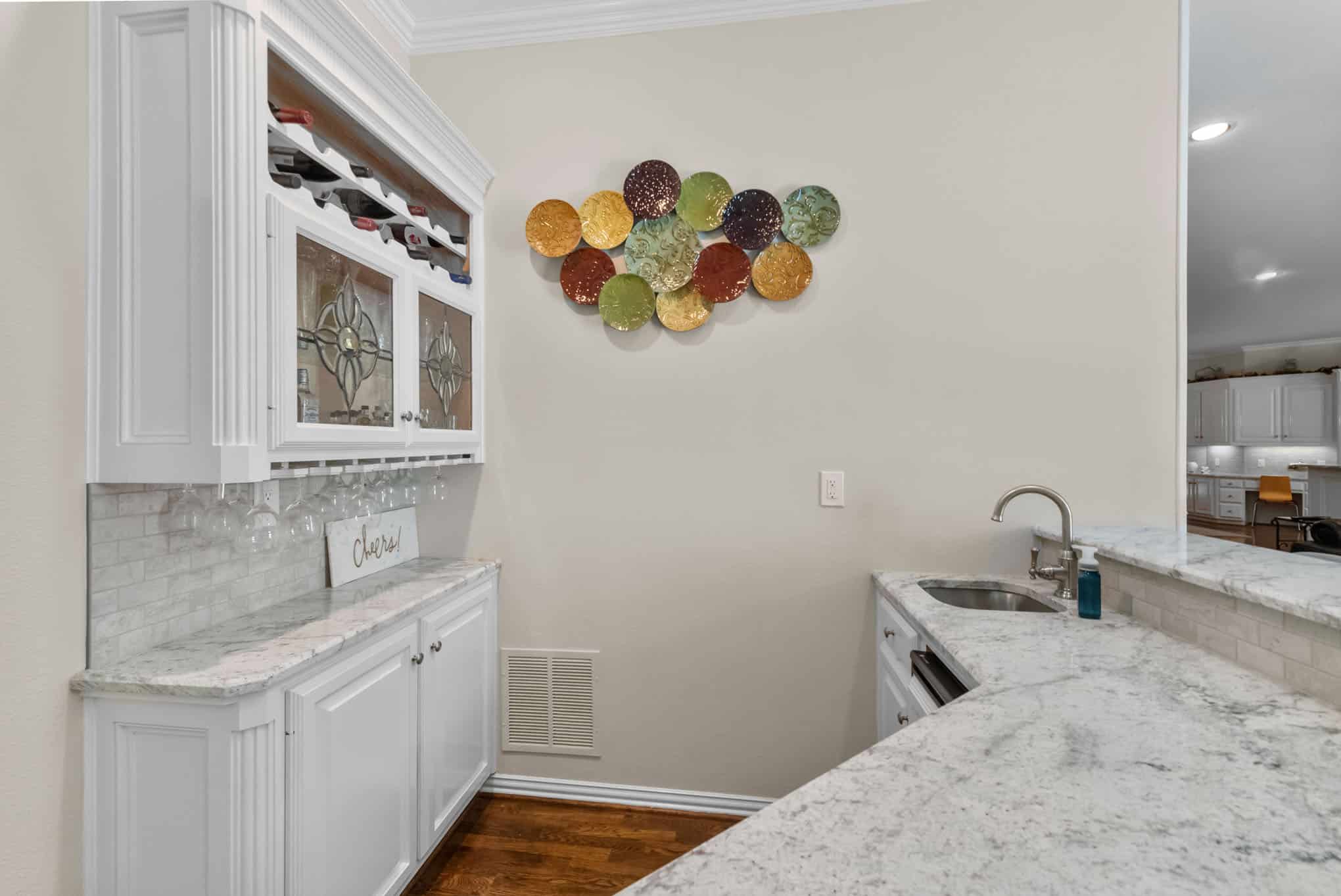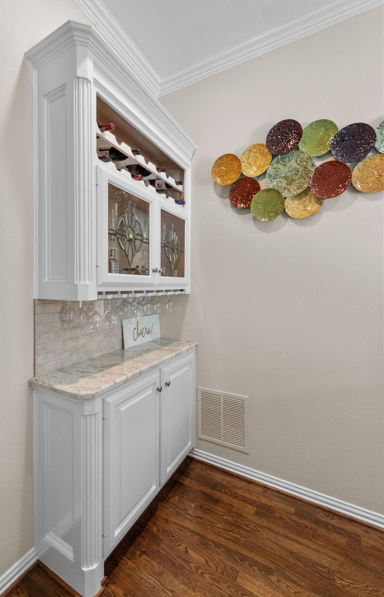 The warm richness of the hand-selected oak flooring grounds the bright cabinetry, while artful touches like the handcrafted decorative plate collection in autumnal hues introduces the earthy color palette so beloved in traditional Southern décor. The finished space balances timeless design principles with practical functionality, creating a kitchen that will remain both relevant and cherished for decades—precisely the investment-minded approach that discerning North Dallas homeowners value.