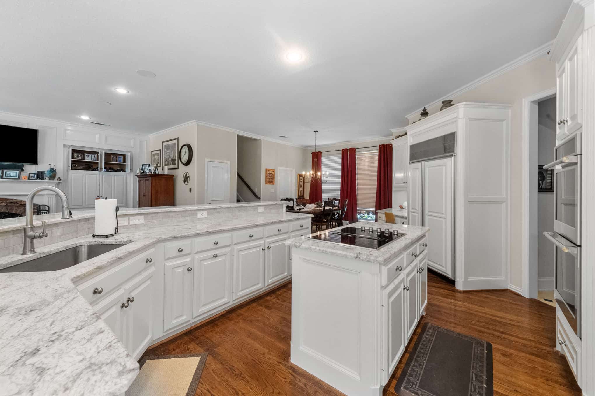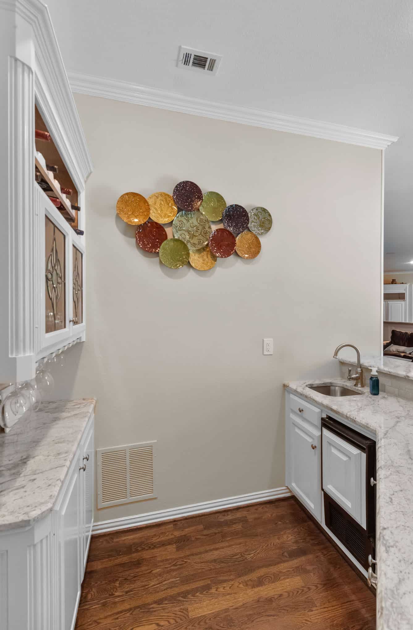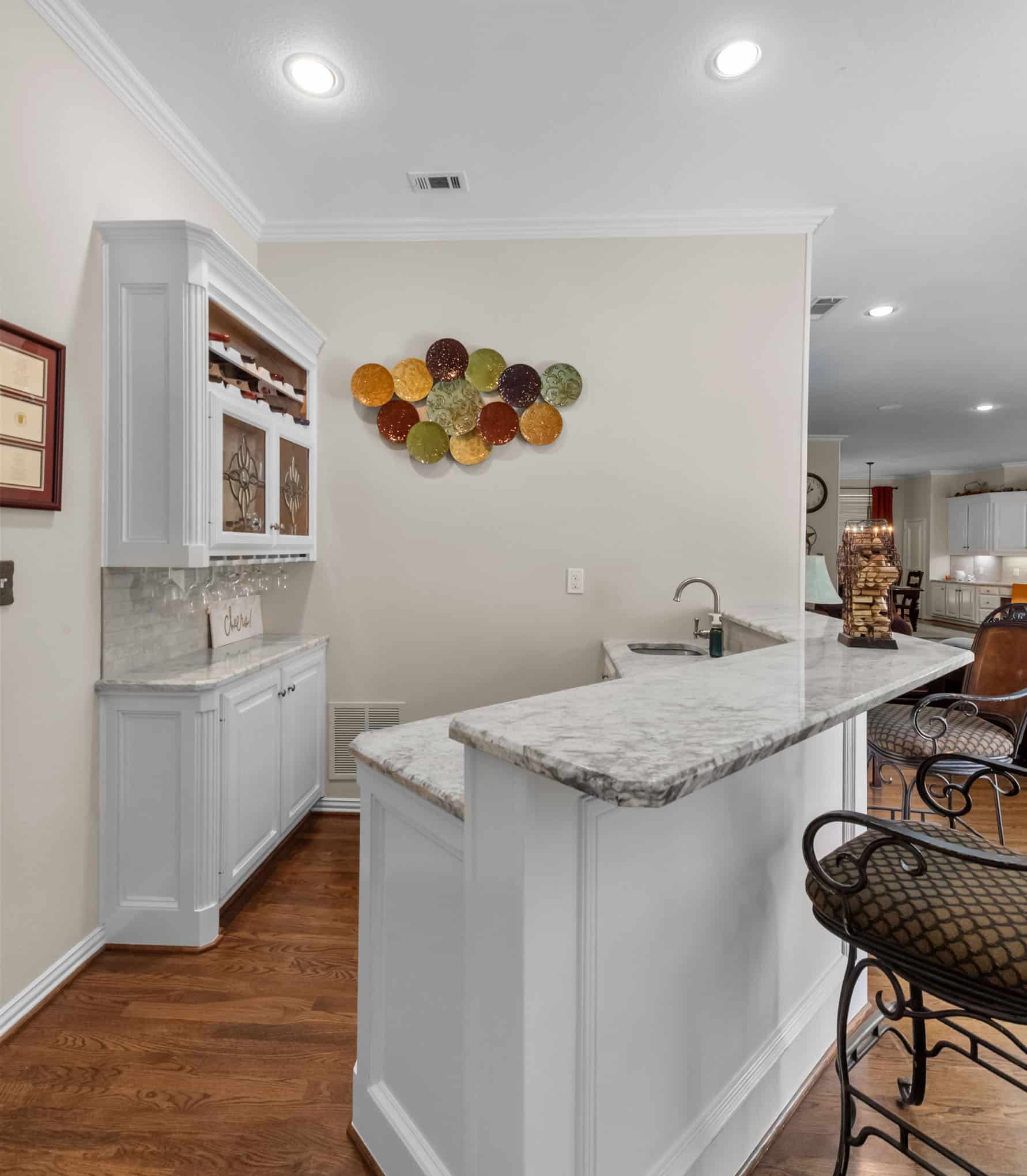 The warm richness of the hand-selected oak flooring grounds the bright cabinetry, while artful touches like the handcrafted decorative plate collection in autumnal hues introduces the earthy color palette so beloved in traditional Southern décor. The finished space balances timeless design principles with practical functionality, creating a kitchen that will remain both relevant and cherished for decades—precisely the investment-minded approach that discerning North Dallas homeowners value.