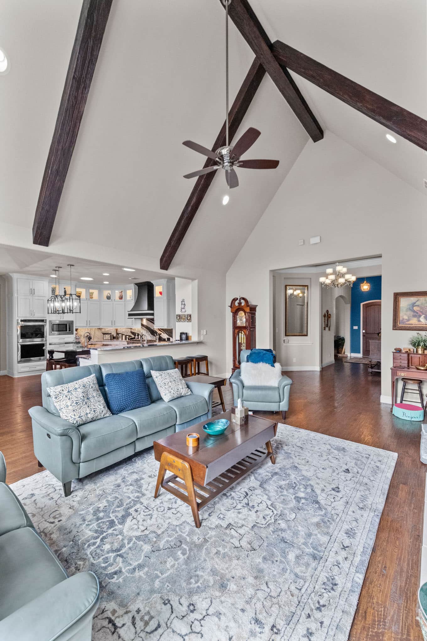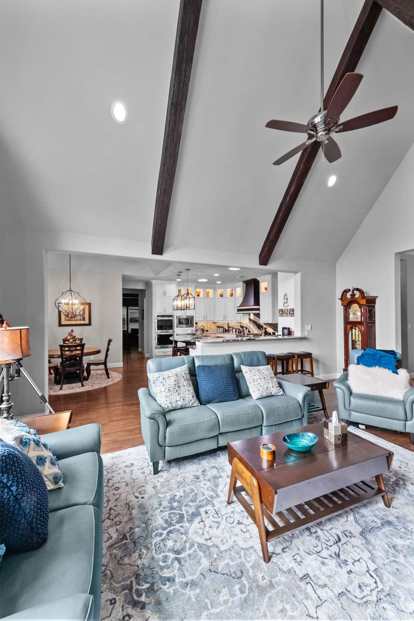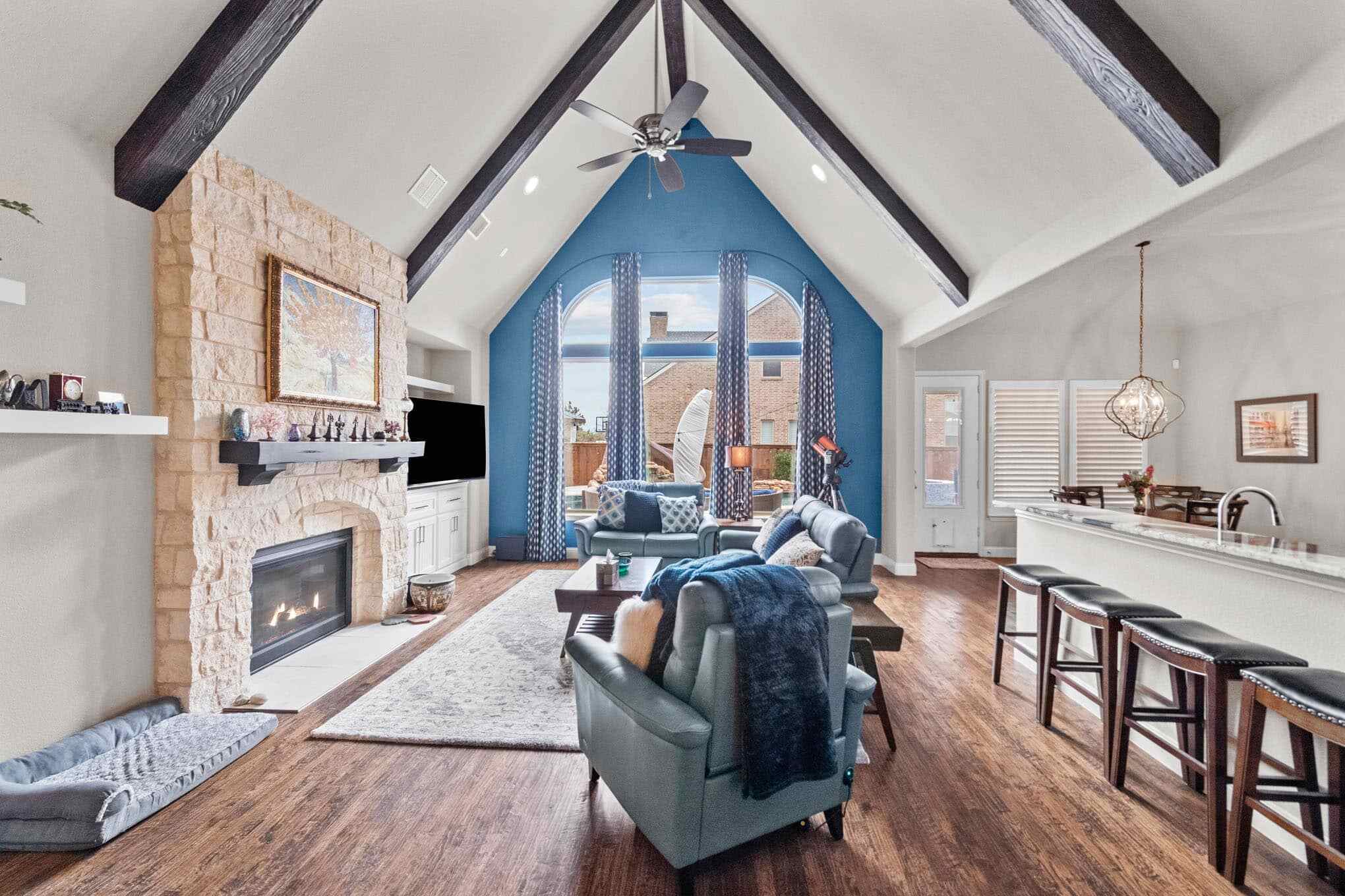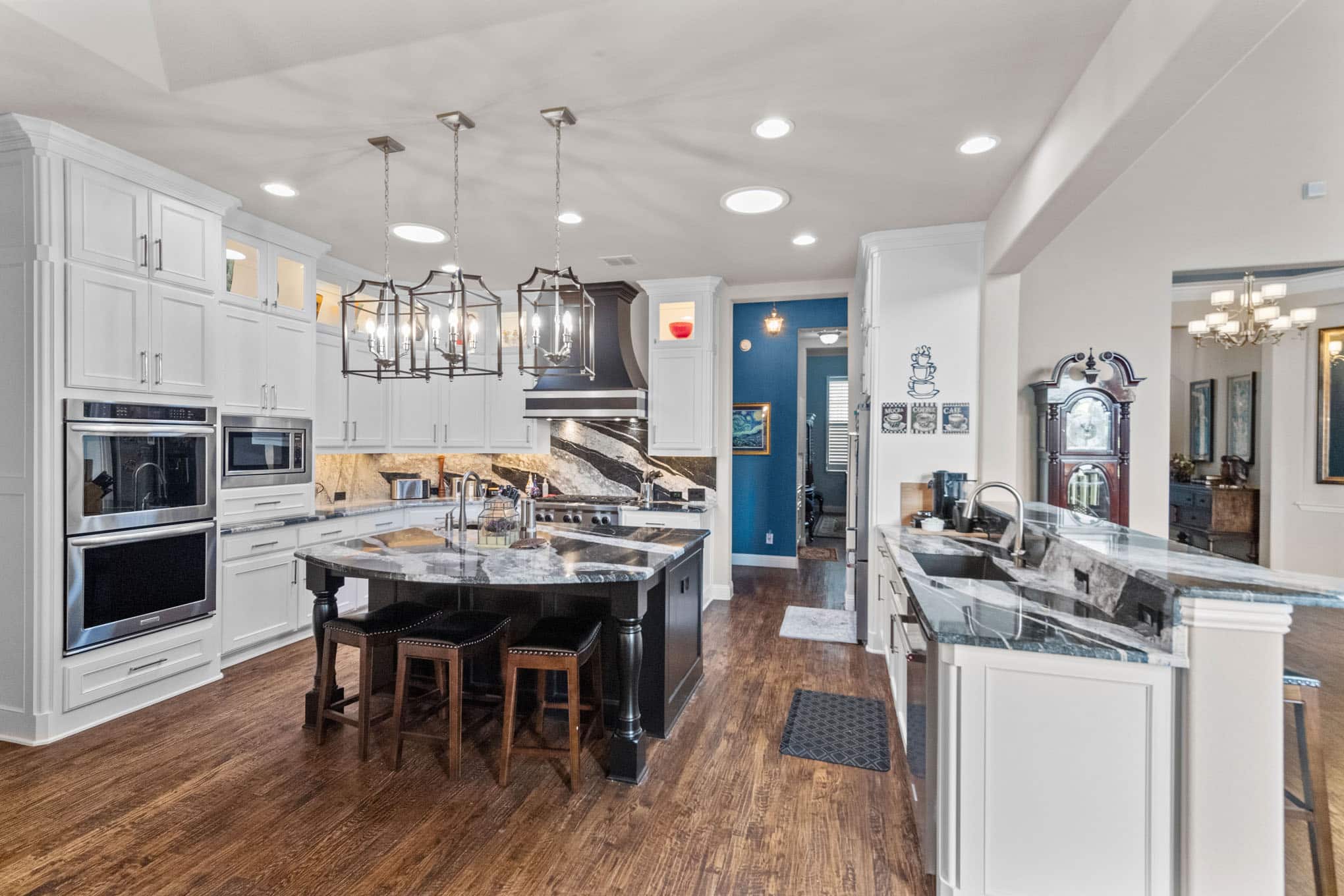 Strategic lighting includes elegant lantern-style pendants over the substantial center island, which features refined turned legs and comfortable counter seating. The adjoining living area continues the sophisticated aesthetic with a soaring cathedral ceiling adorned with dark wood beams, a stunning limestone fireplace, and a cool blue accent wall that adds depth without disrupting the cohesive design.