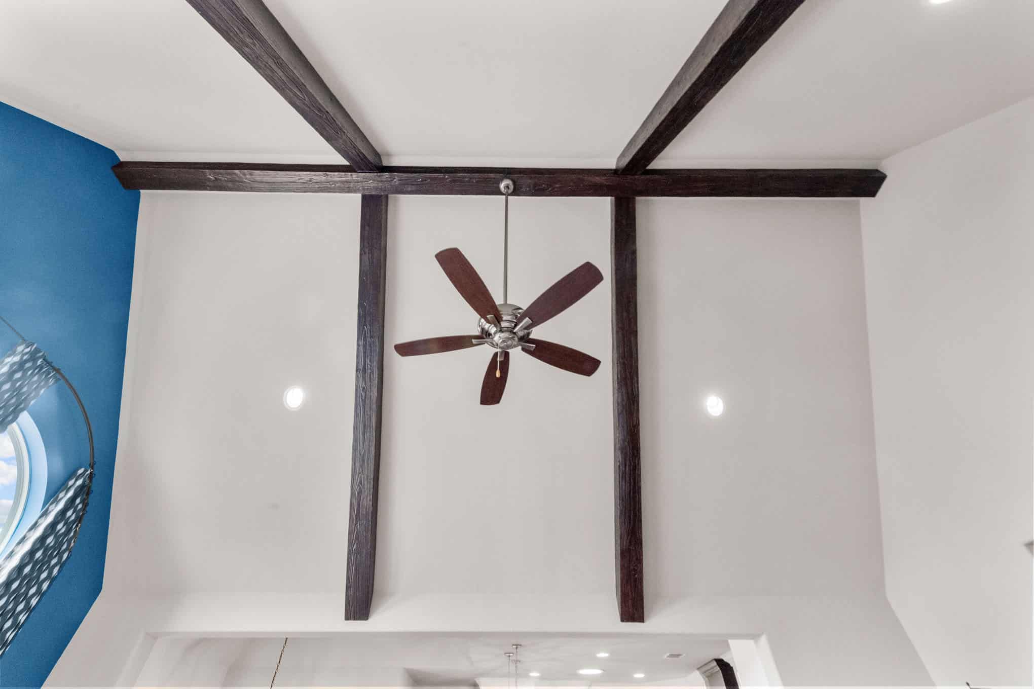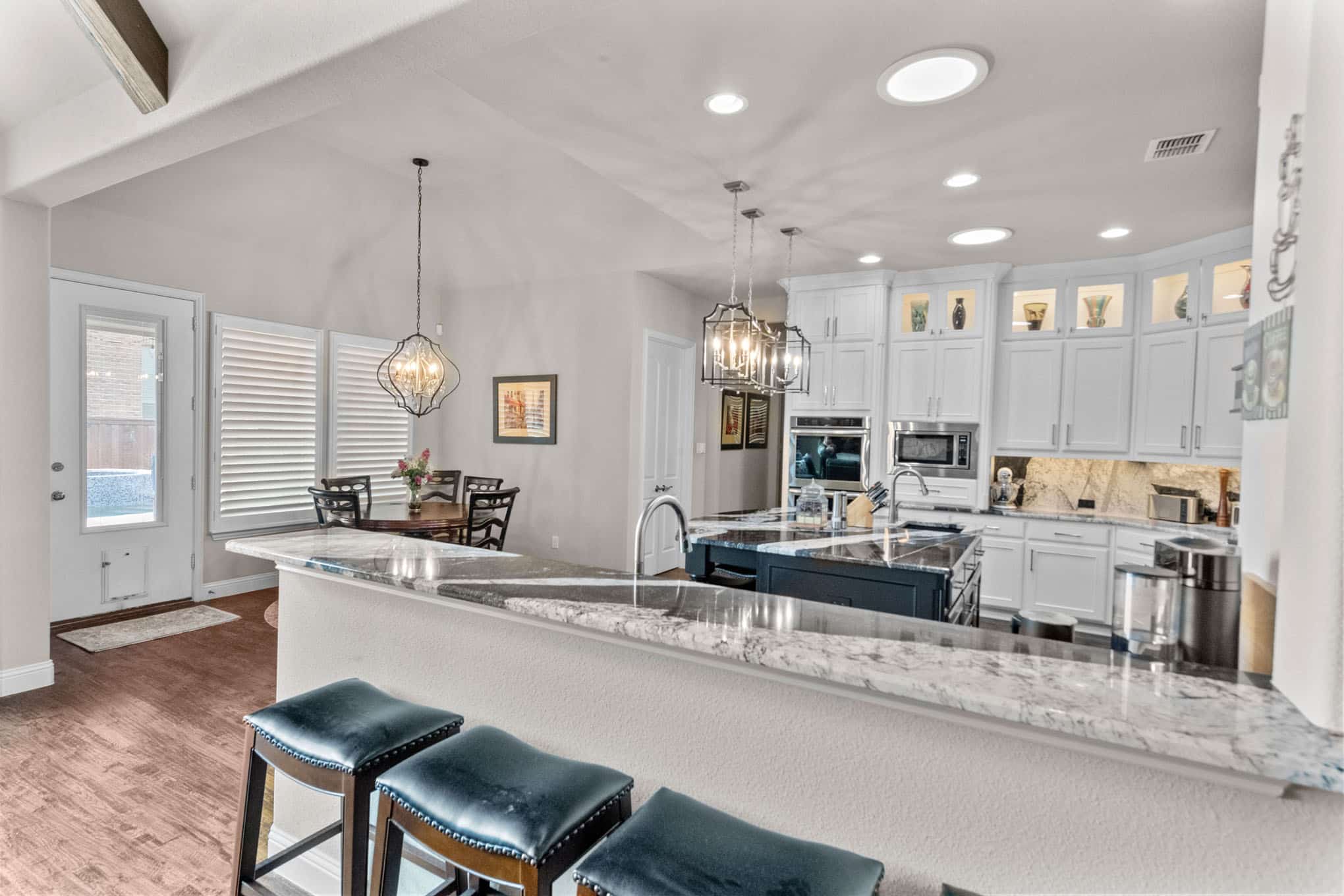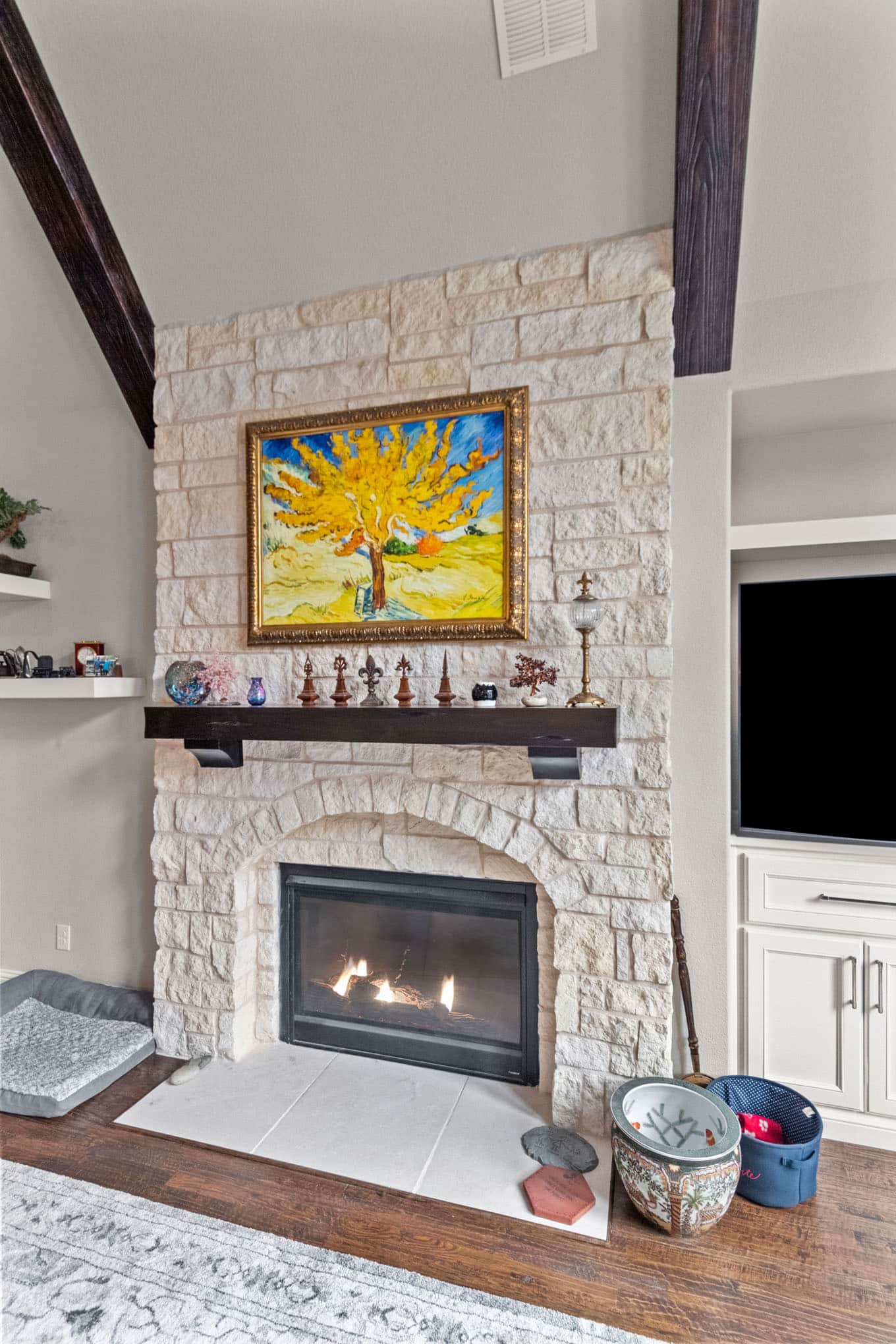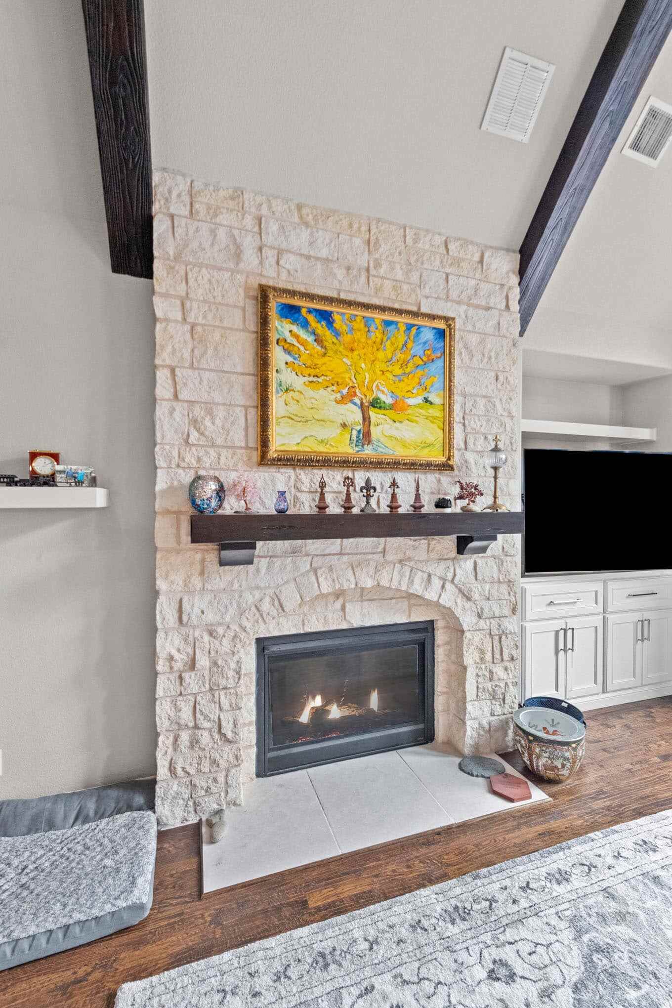 Strategic lighting includes elegant lantern-style pendants over the substantial center island, which features refined turned legs and comfortable counter seating. The adjoining living area continues the sophisticated aesthetic with a soaring cathedral ceiling adorned with dark wood beams, a stunning limestone fireplace, and a cool blue accent wall that adds depth without disrupting the cohesive design.