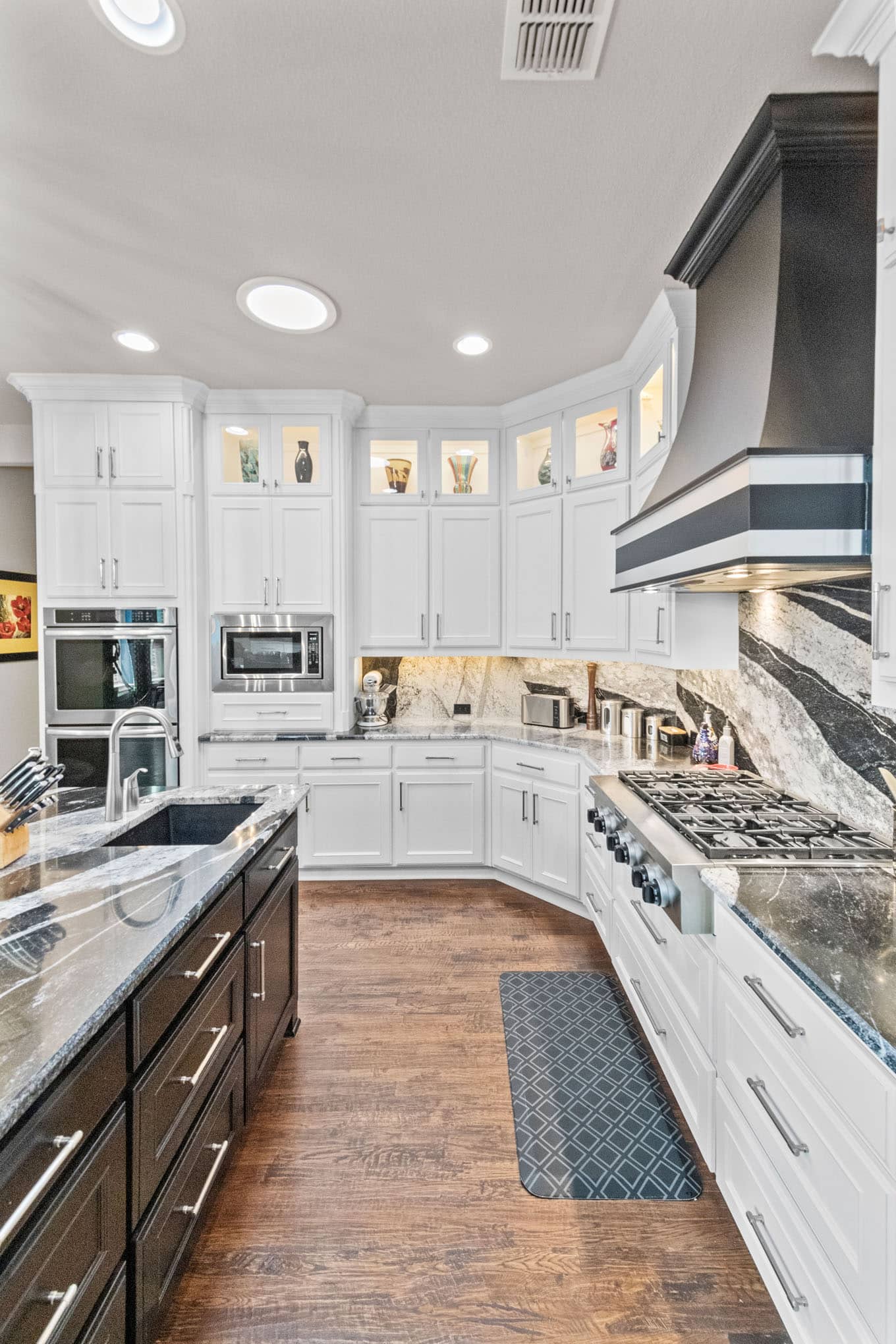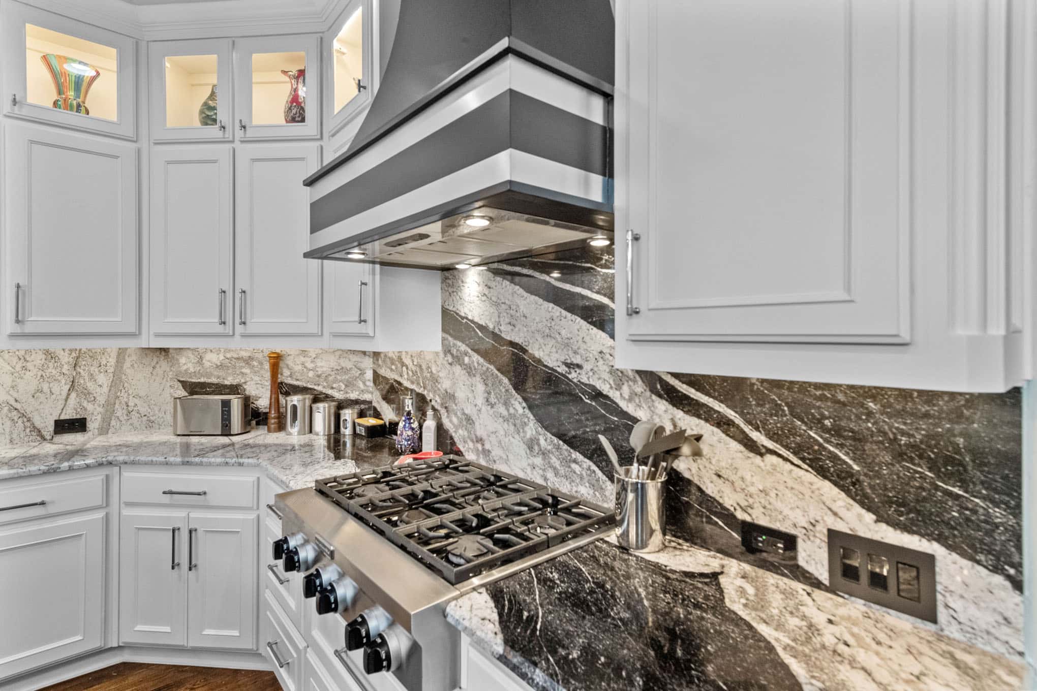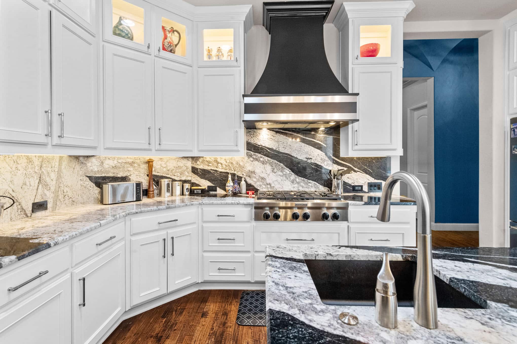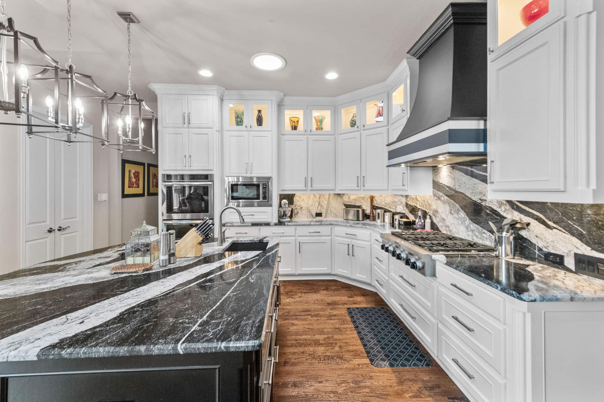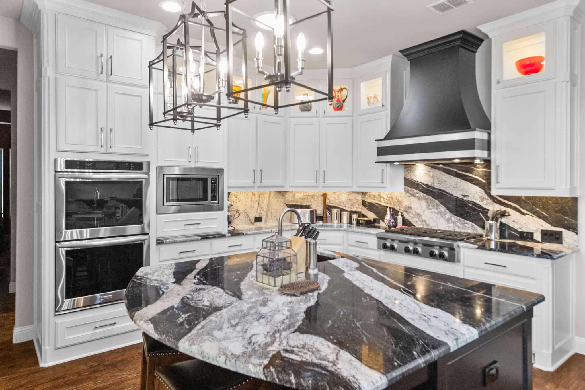 This striking kitchen renovation in Frisco makes a bold statement with its dramatic black and white color palette. Crisp white cabinetry with clean lines creates a bright, airy foundation, while the spectacular black granite countertops and backsplash with dramatic veining serve as the showstopping focal point. The custom black range hood with polished chrome accents bridges these contrasting elements beautifully.
