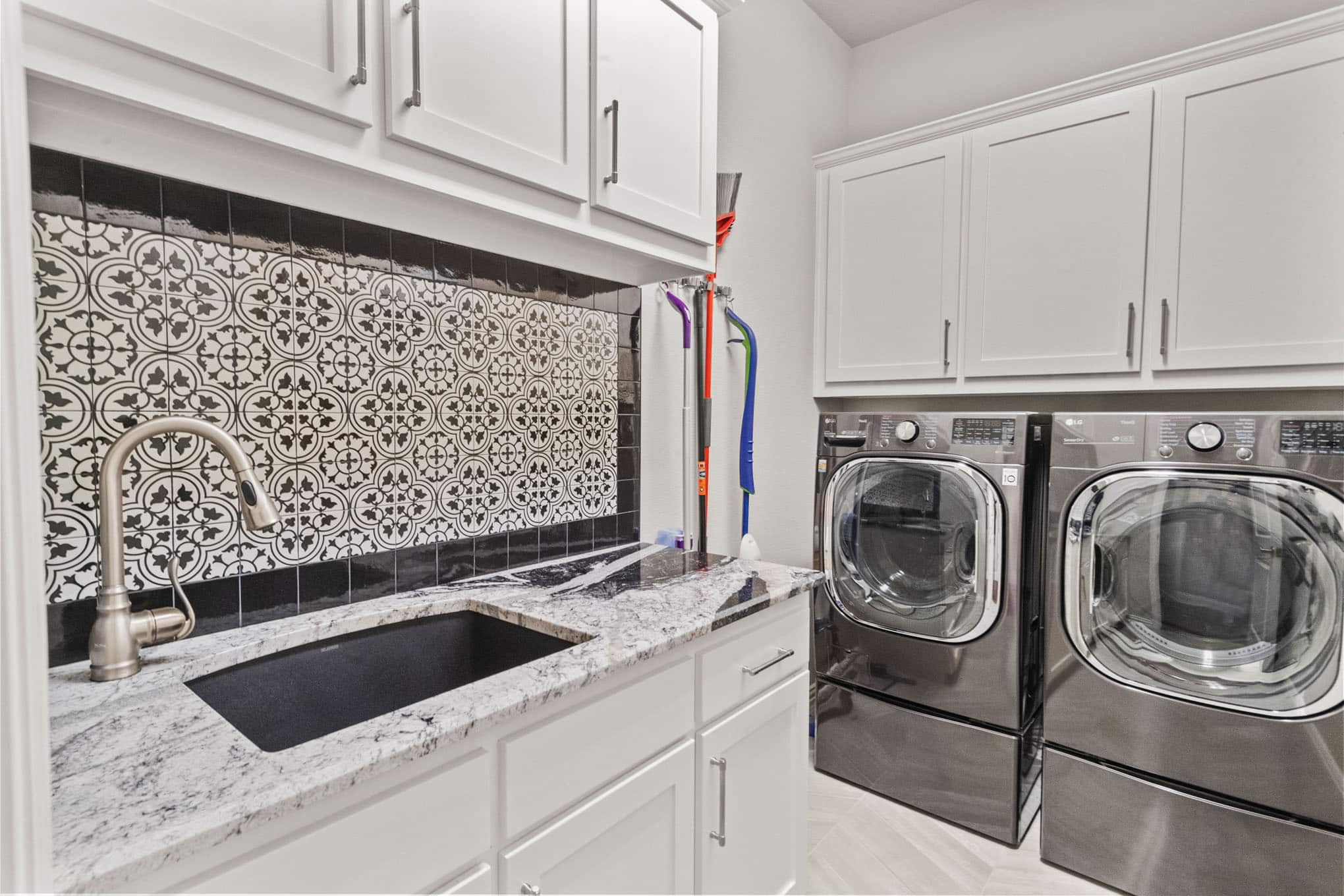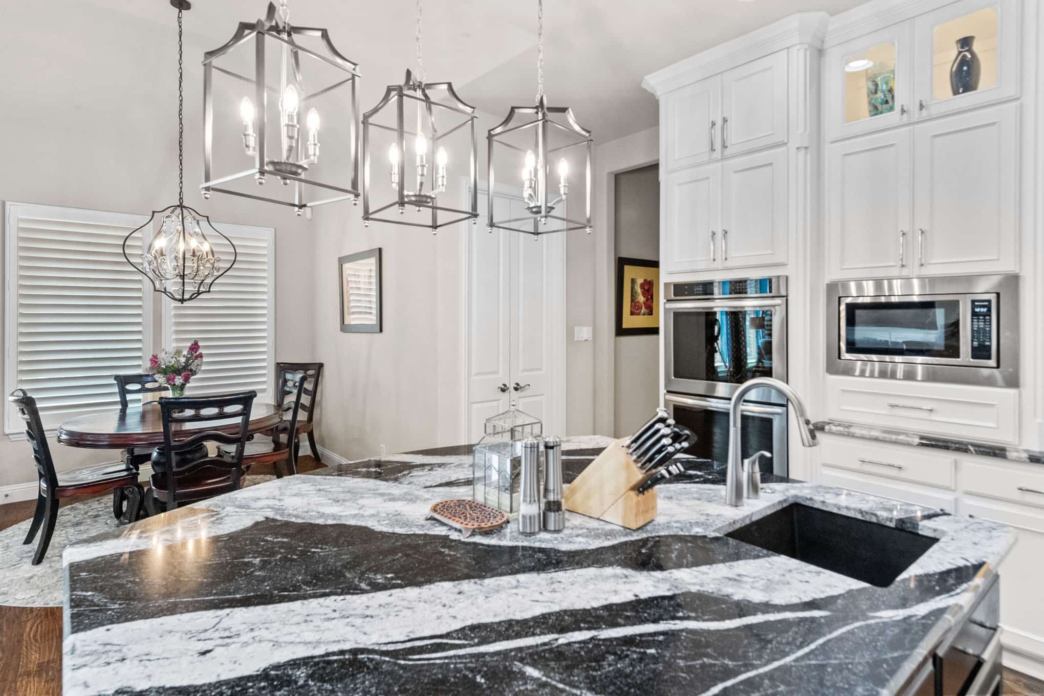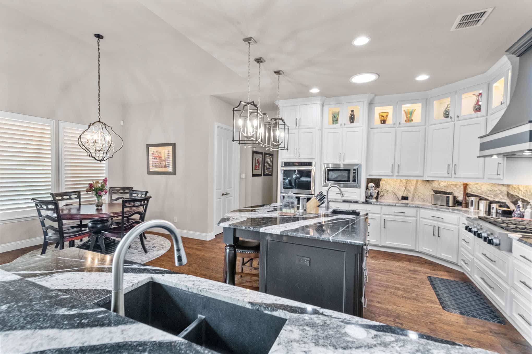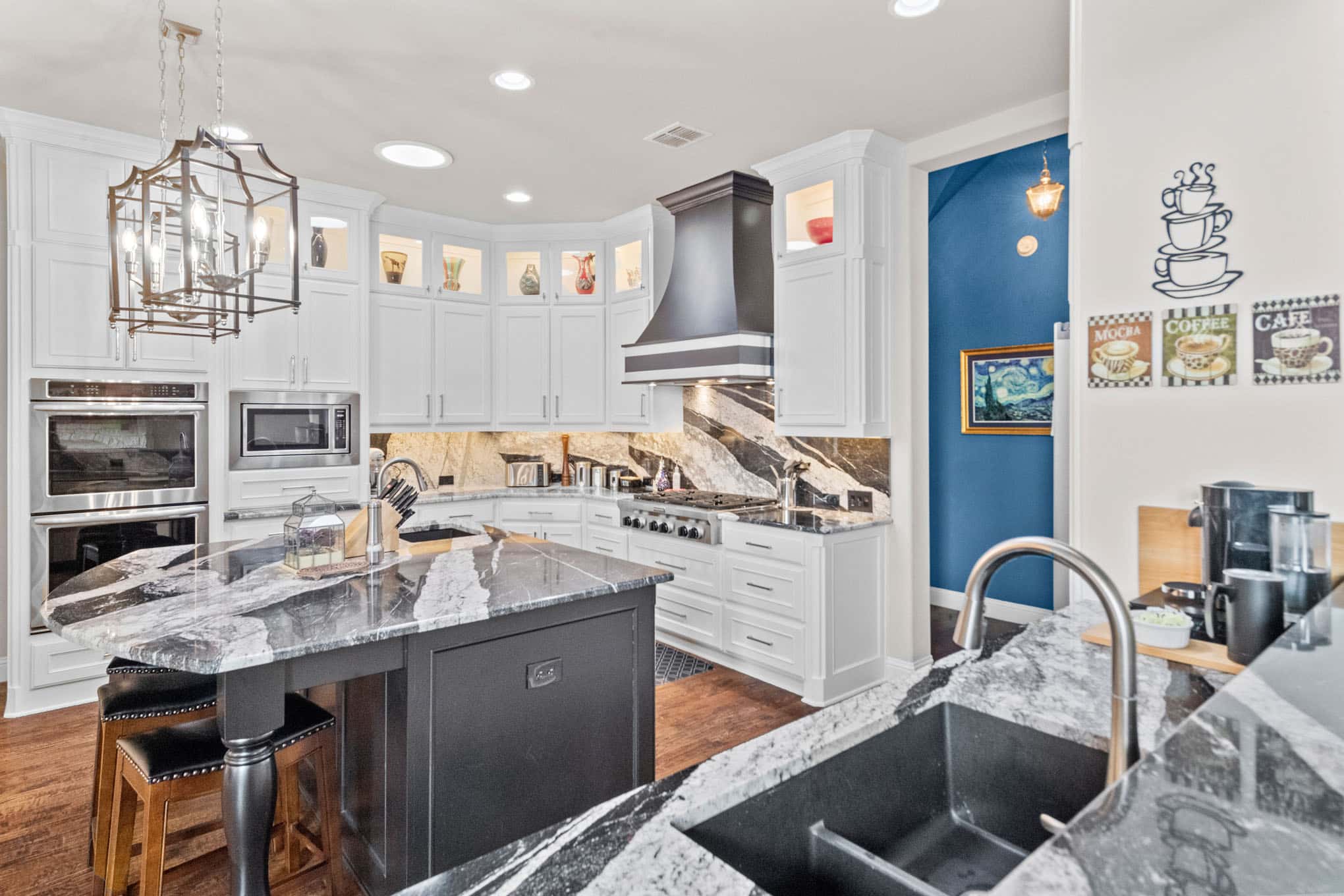 This striking kitchen renovation in Frisco makes a bold statement with its dramatic black and white color palette. Crisp white cabinetry with clean lines creates a bright, airy foundation, while the spectacular black granite countertops and backsplash with dramatic veining serve as the showstopping focal point. The custom black range hood with polished chrome accents bridges these contrasting elements beautifully.